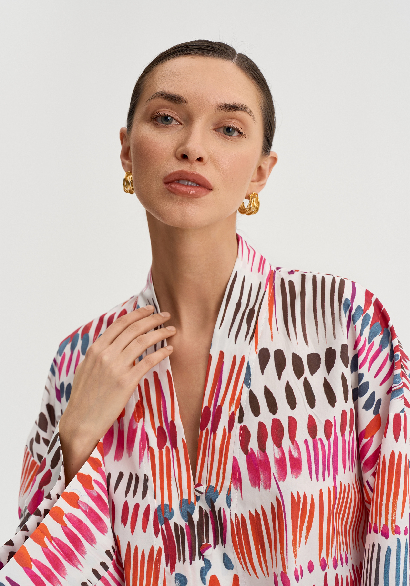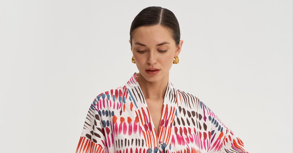 Свободный силуэт со спущенной линией плеча создаёт лёгкую и расслабленную посадку. Широкие рукава с манжетами добавляют мягкий объём.