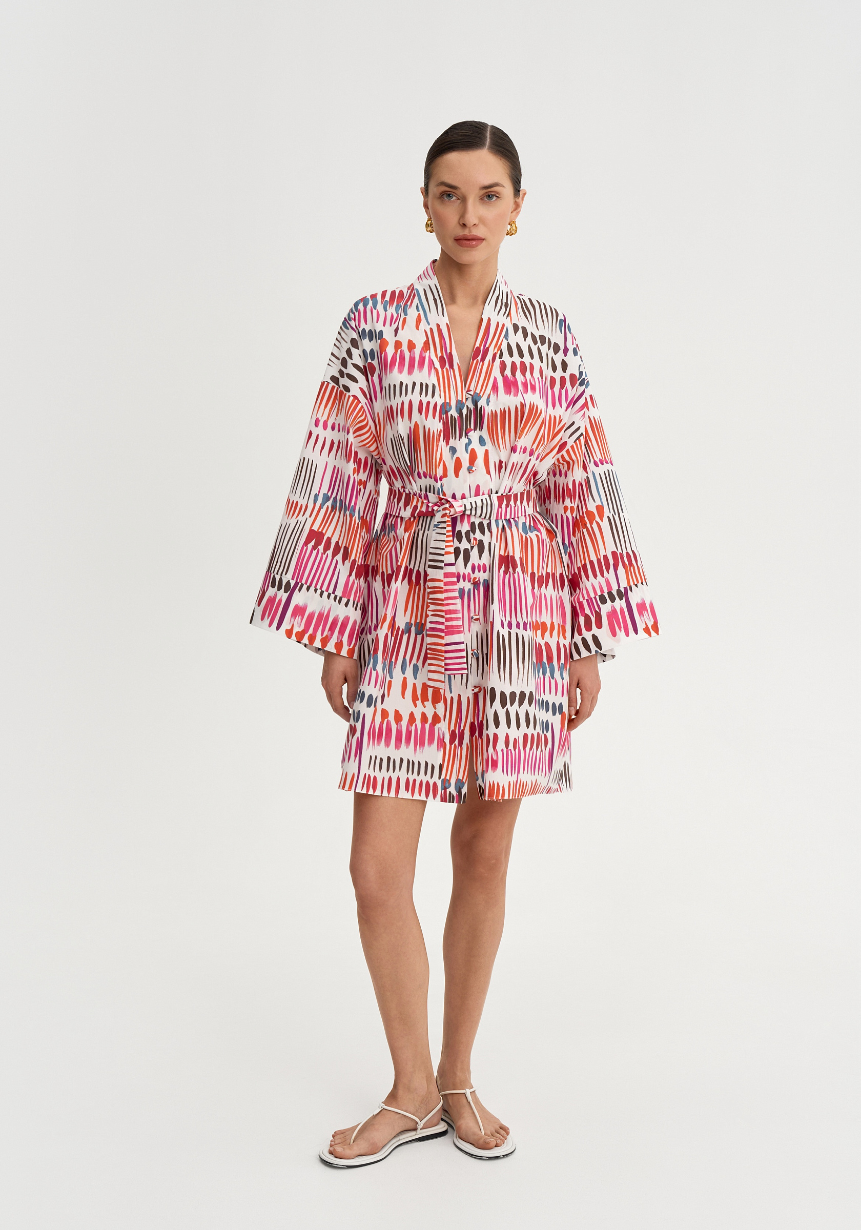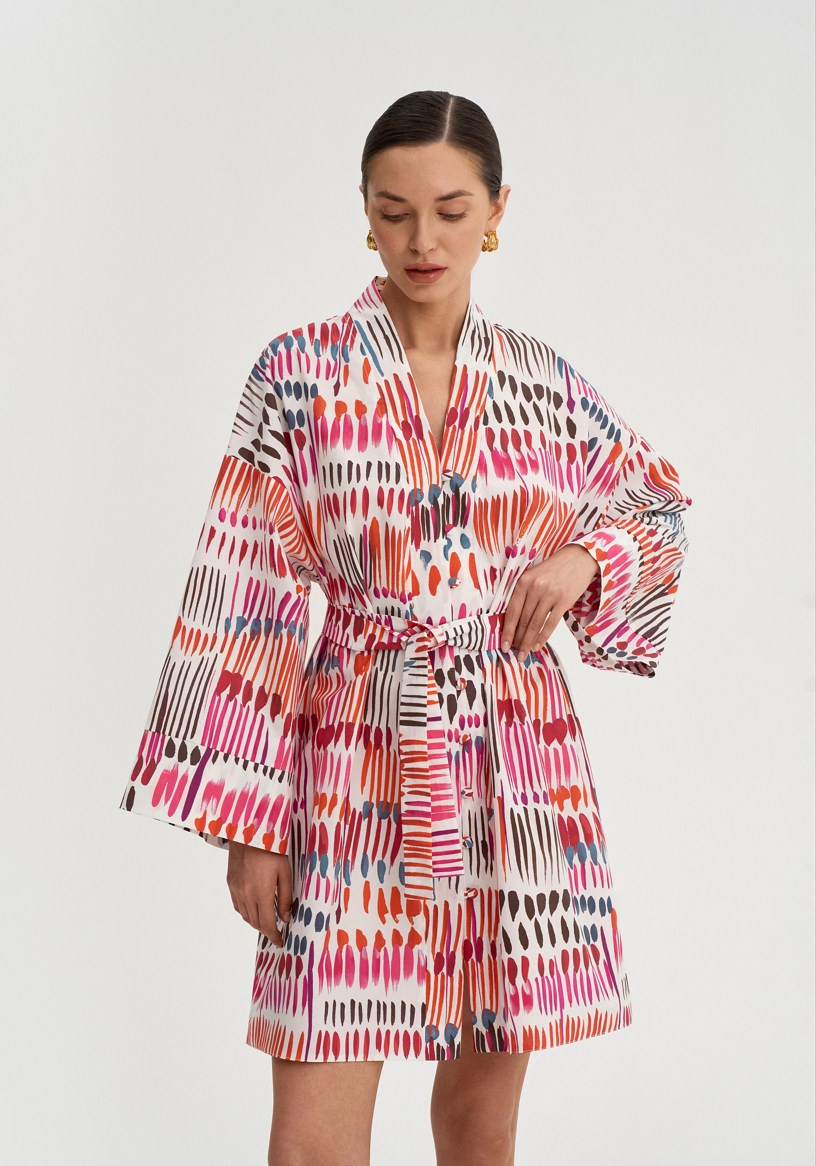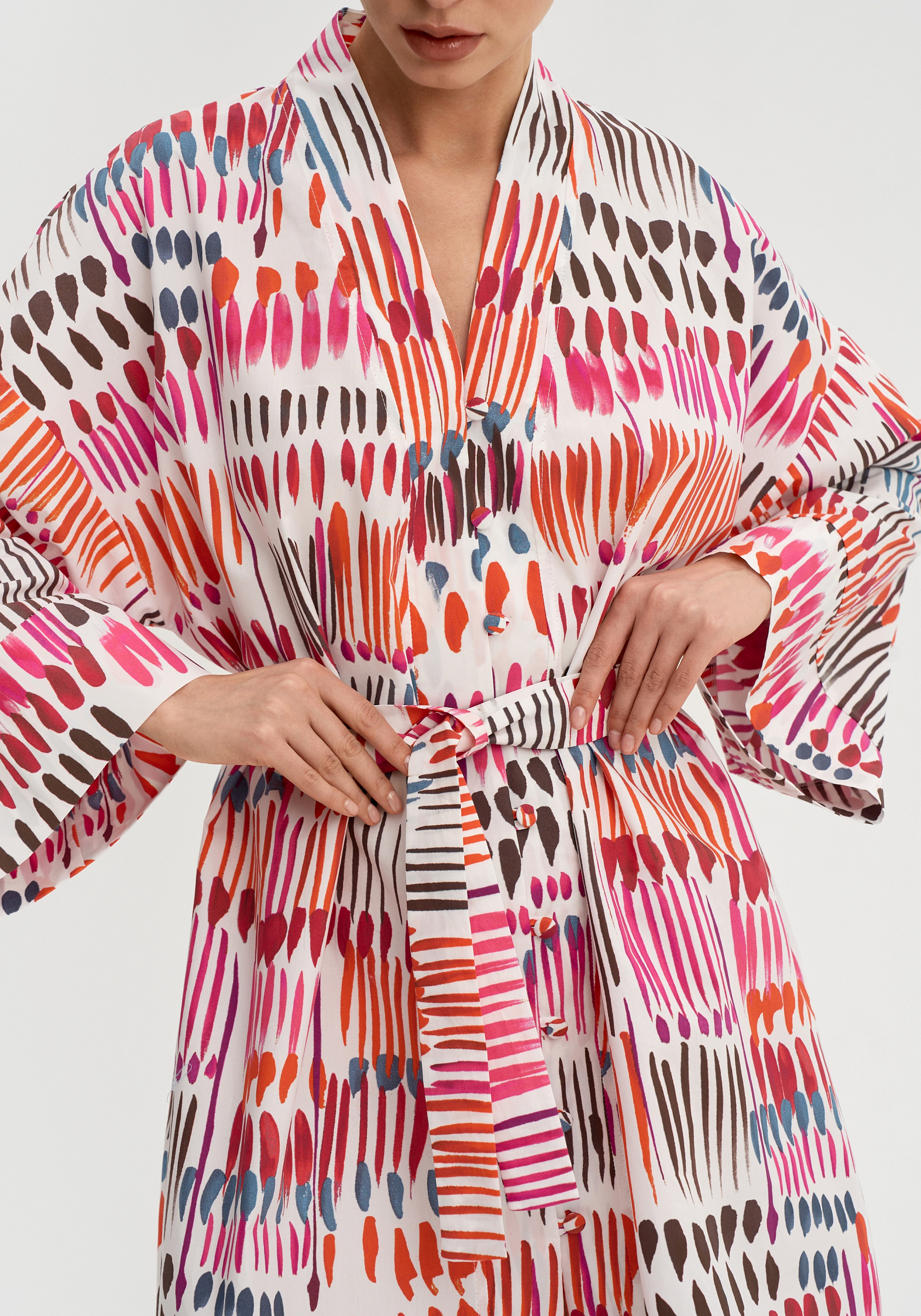 Модель застёгивается на обтяжные пуговицы и дополняется поясом, который позволяет подчеркнуть талию. Итальянский хлопок остаётся лёгким и комфортным в тёплый сезон.