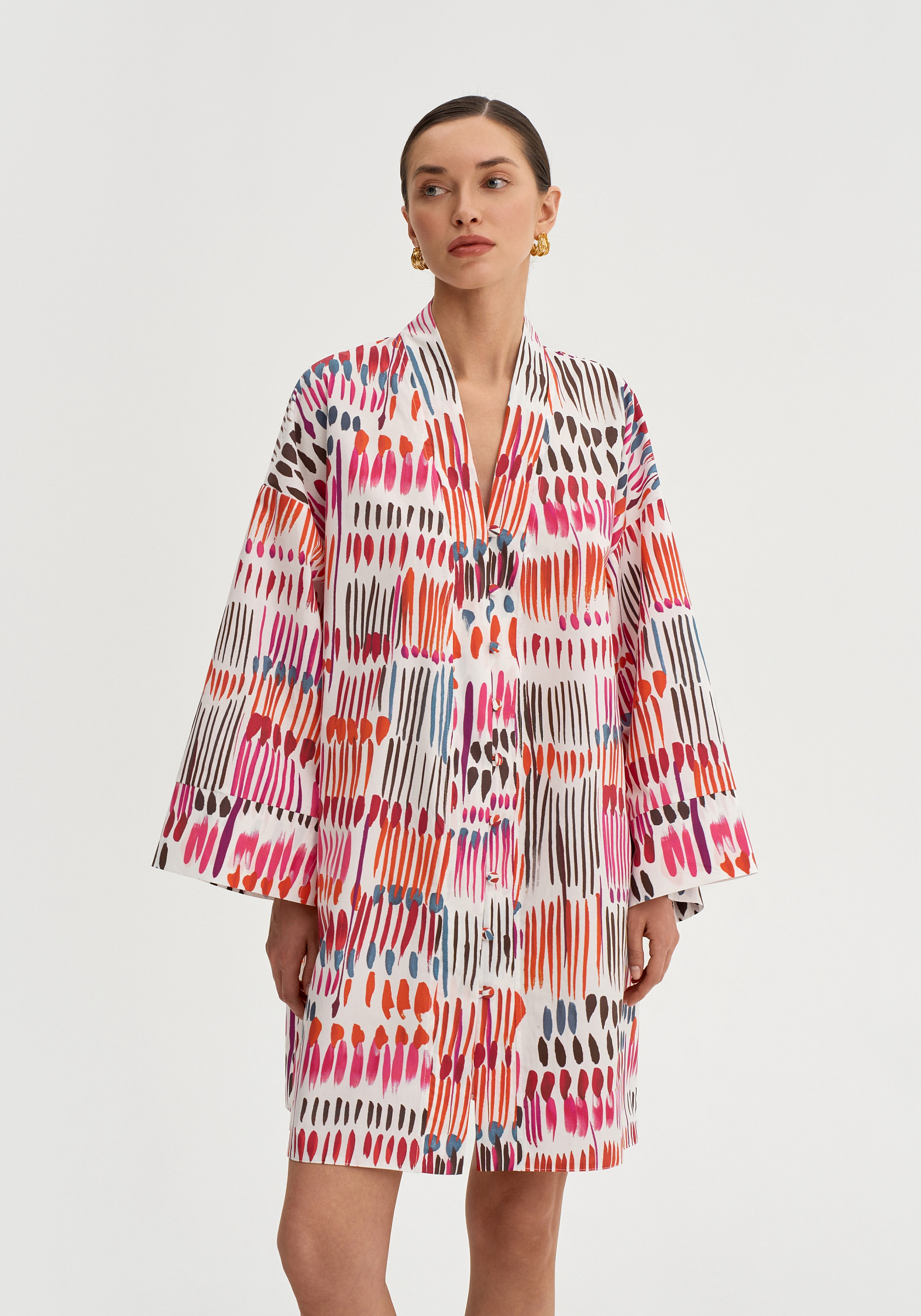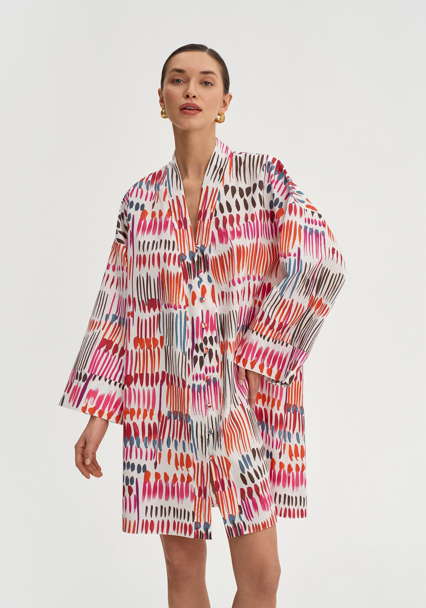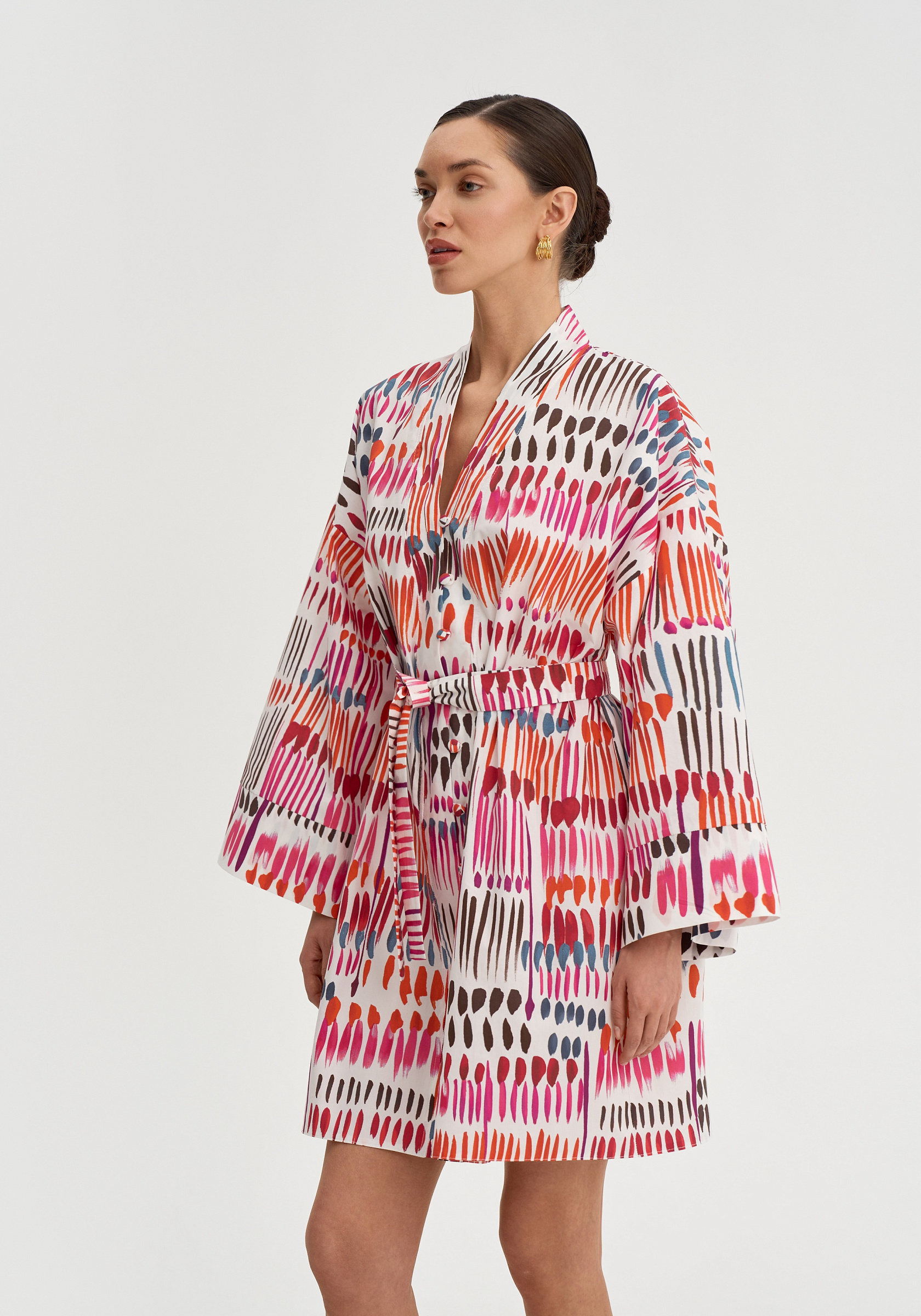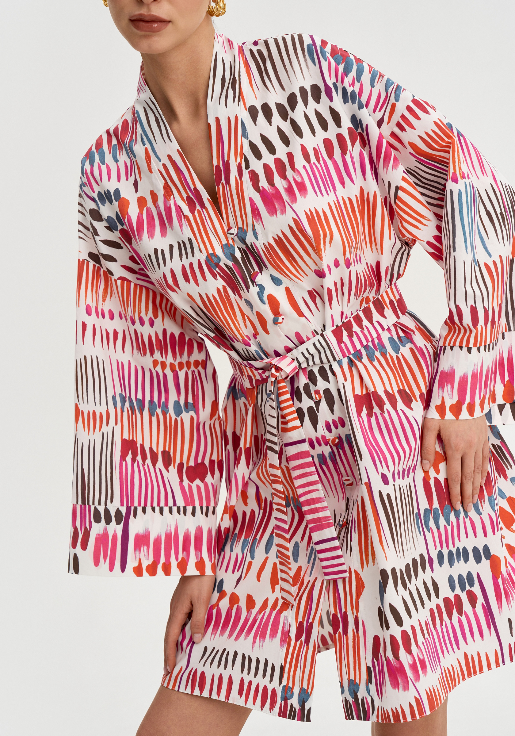 Модель застёгивается на обтяжные пуговицы и дополняется поясом, который позволяет подчеркнуть талию. Итальянский хлопок остаётся лёгким и комфортным в тёплый сезон.