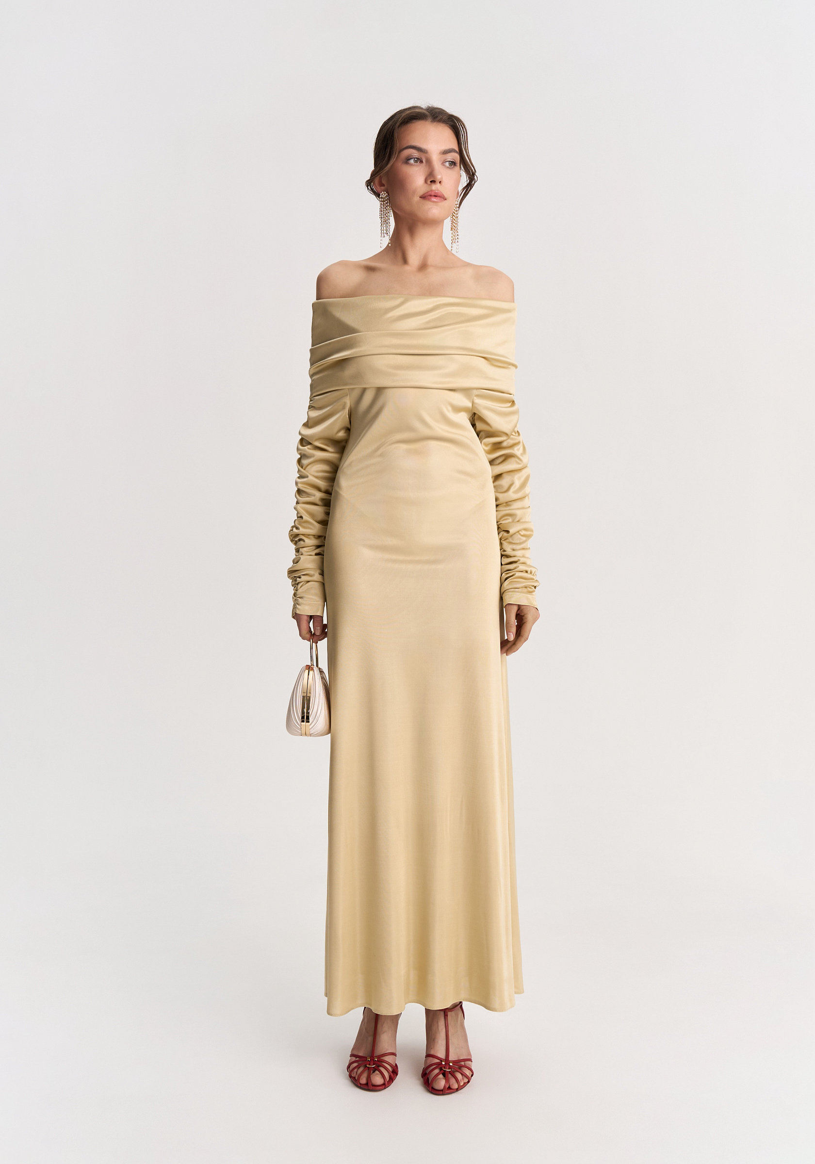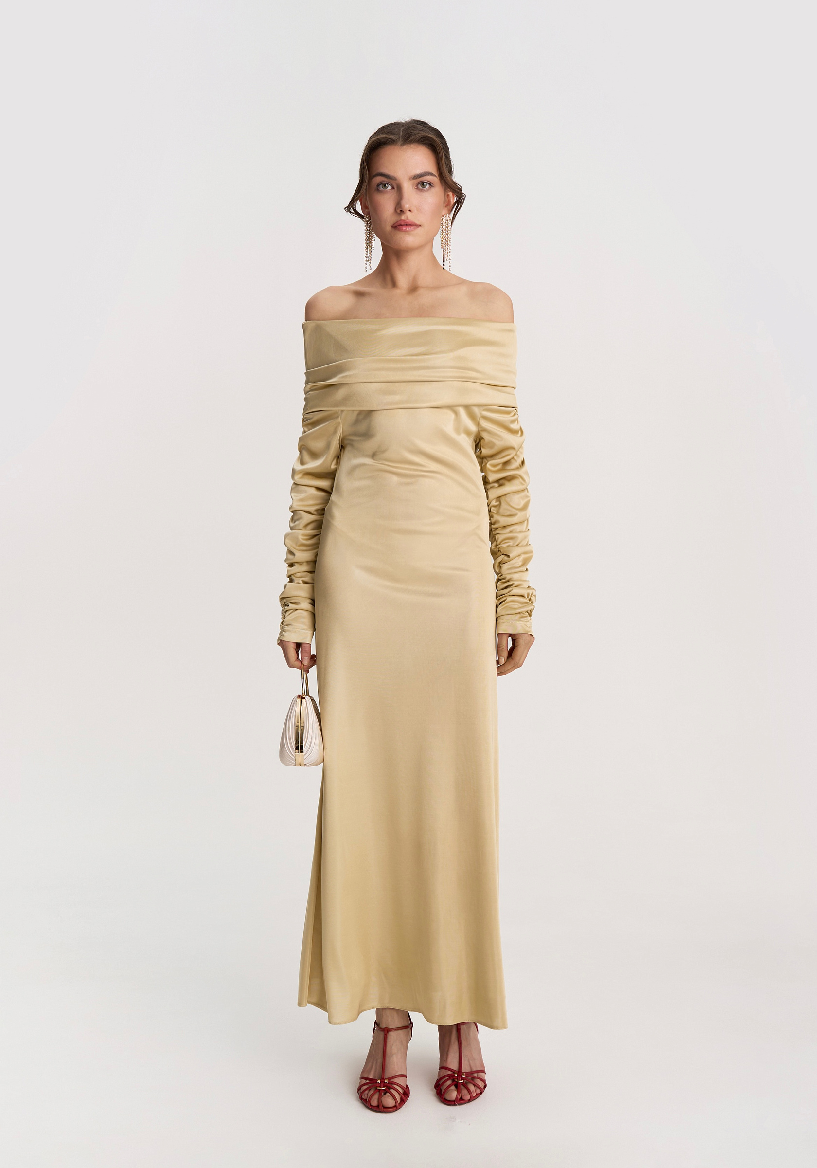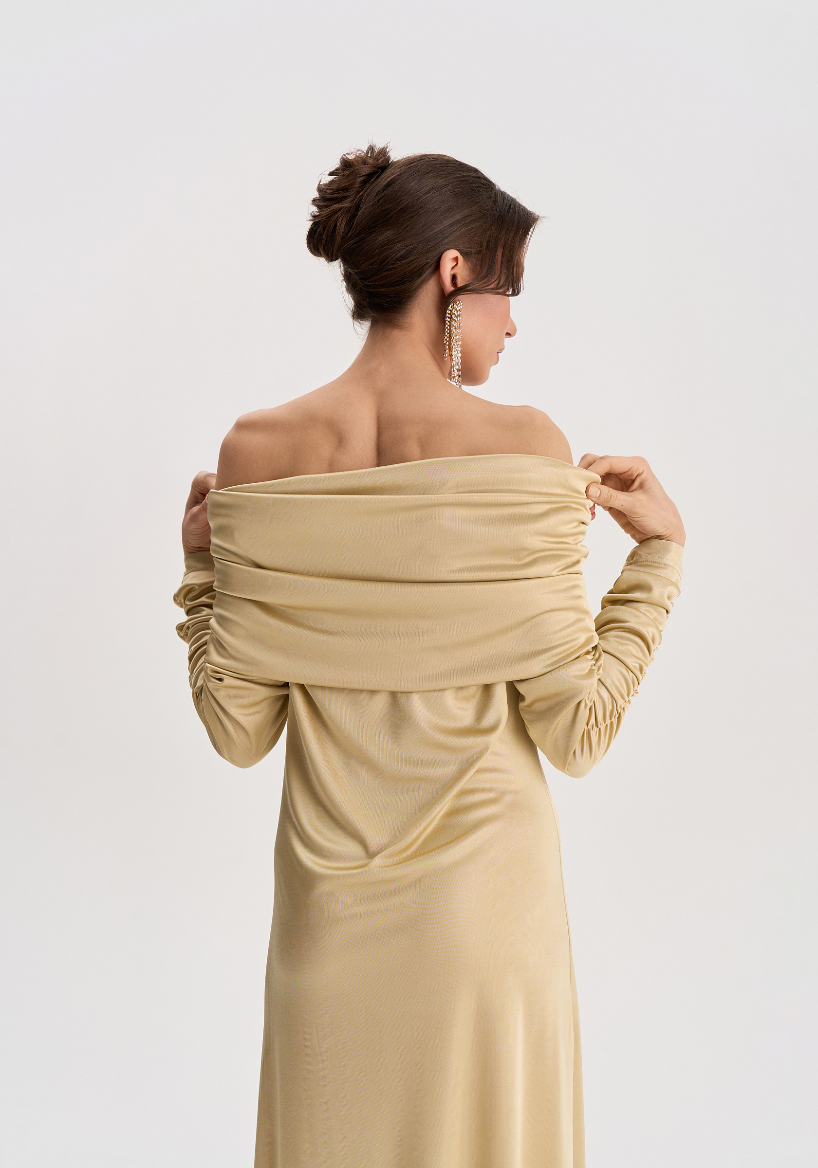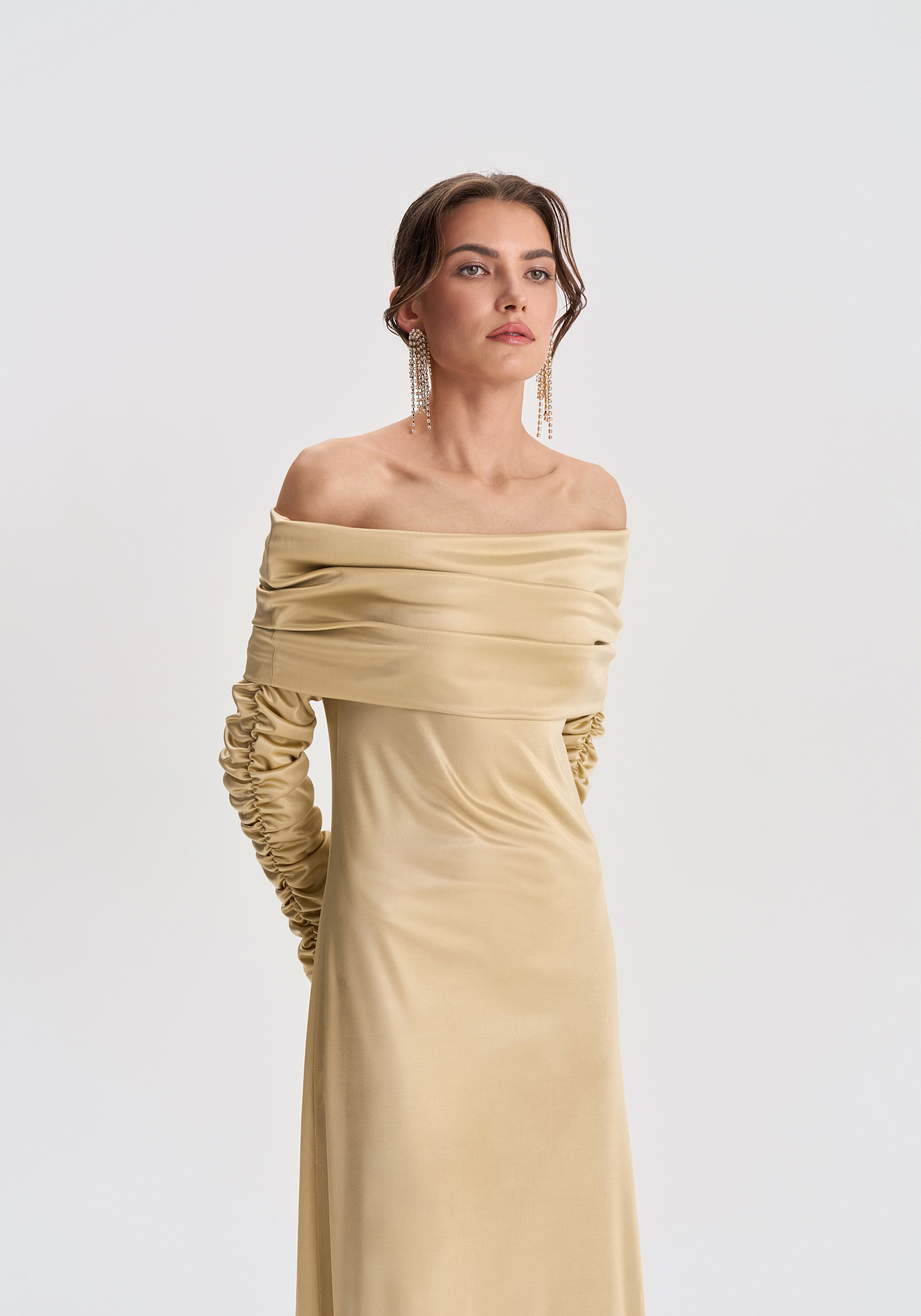 Платье с открытыми плечами и длинным рукавом с драпировкой выполнено из 100% вискозы и создаёт чистый, вытянутый силуэт, мягко подчеркивая линию тела. Ткань обладает естественным шелковистым блеском. Длина макси усиливает элегантность модели, делая её уместной и для вечерних выходов, и для особых дневных событий.Параметры изделия