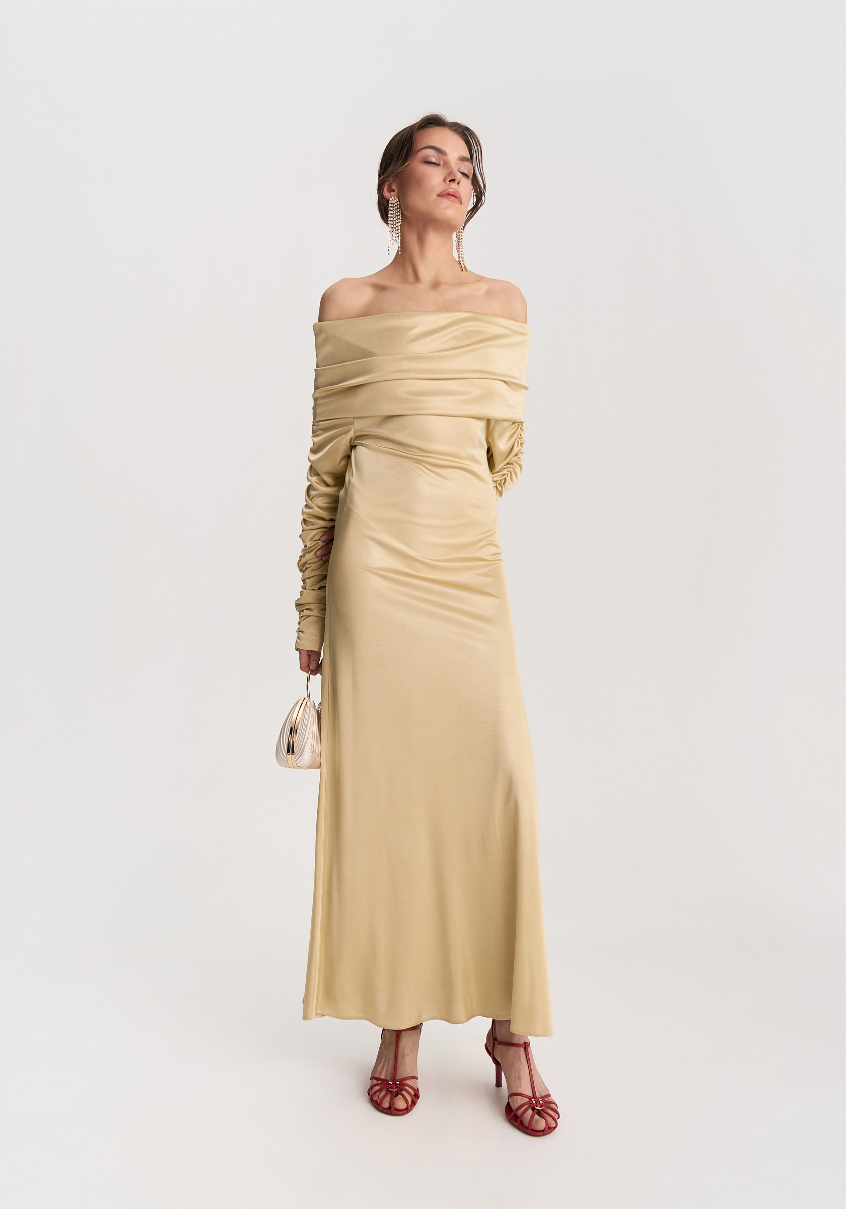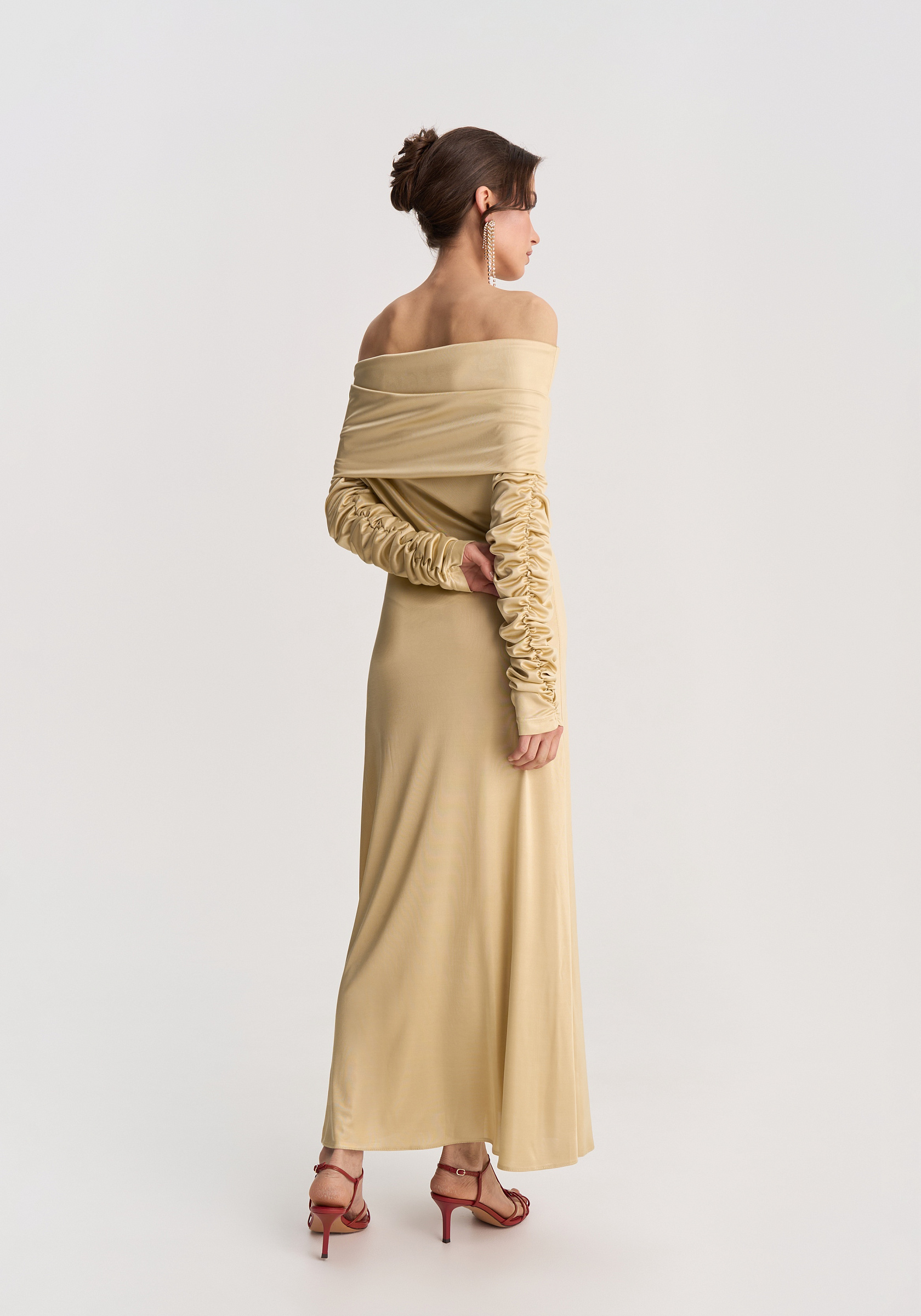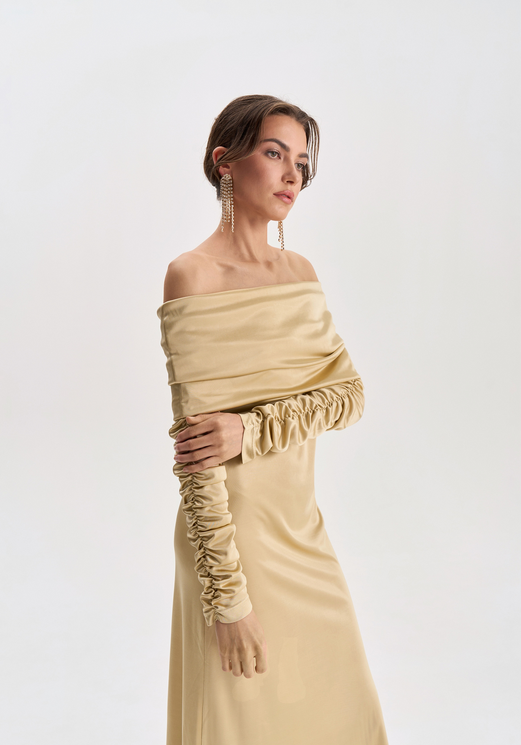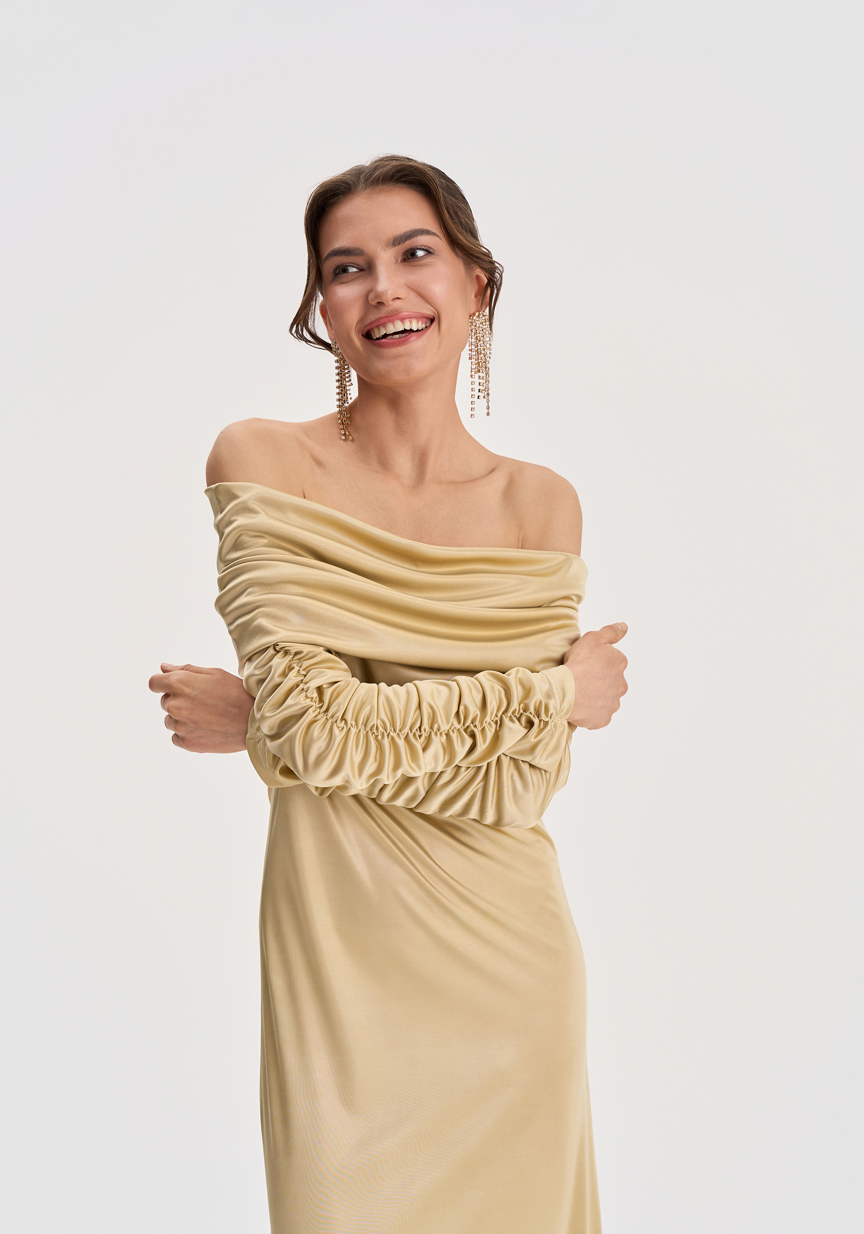 Платье с открытыми плечами и длинным рукавом с драпировкой выполнено из 100% вискозы и создаёт чистый, вытянутый силуэт, мягко подчеркивая линию тела. Ткань обладает естественным шелковистым блеском. Длина макси усиливает элегантность модели, делая её уместной и для вечерних выходов, и для особых дневных событий.Параметры изделия