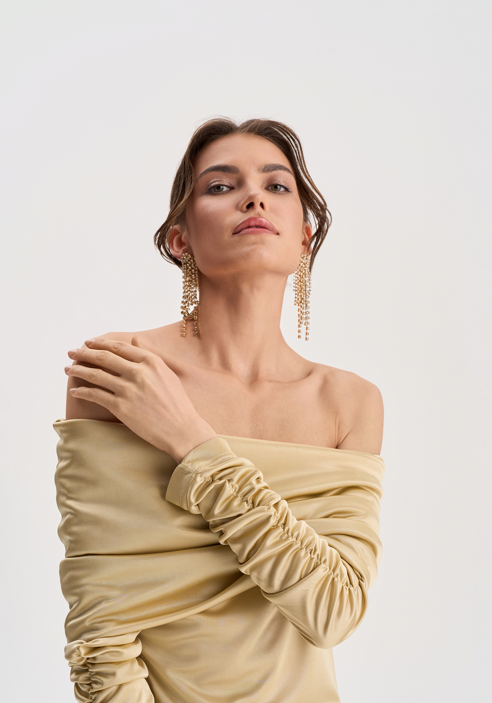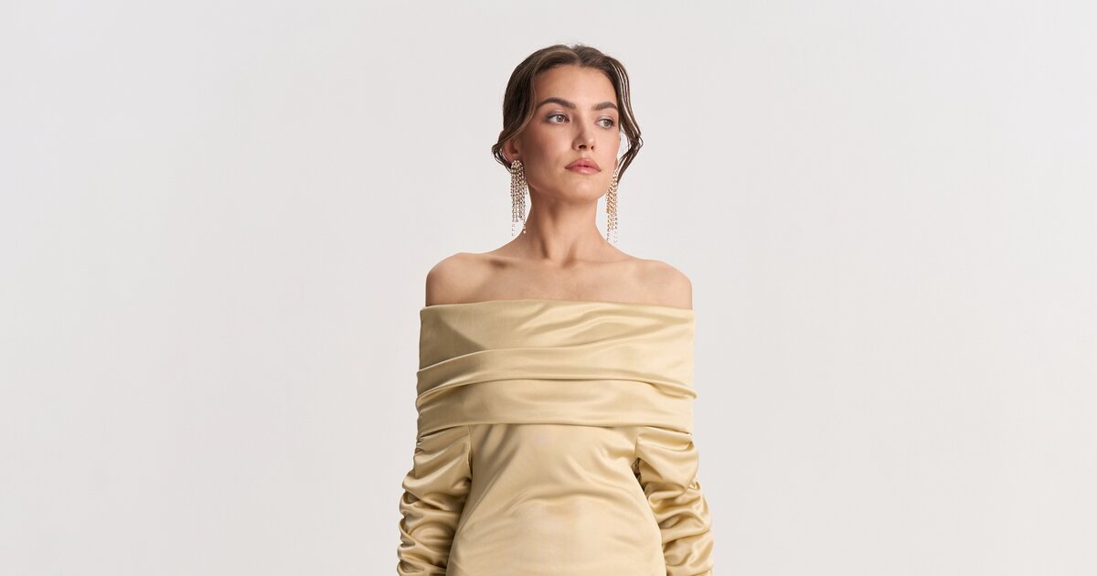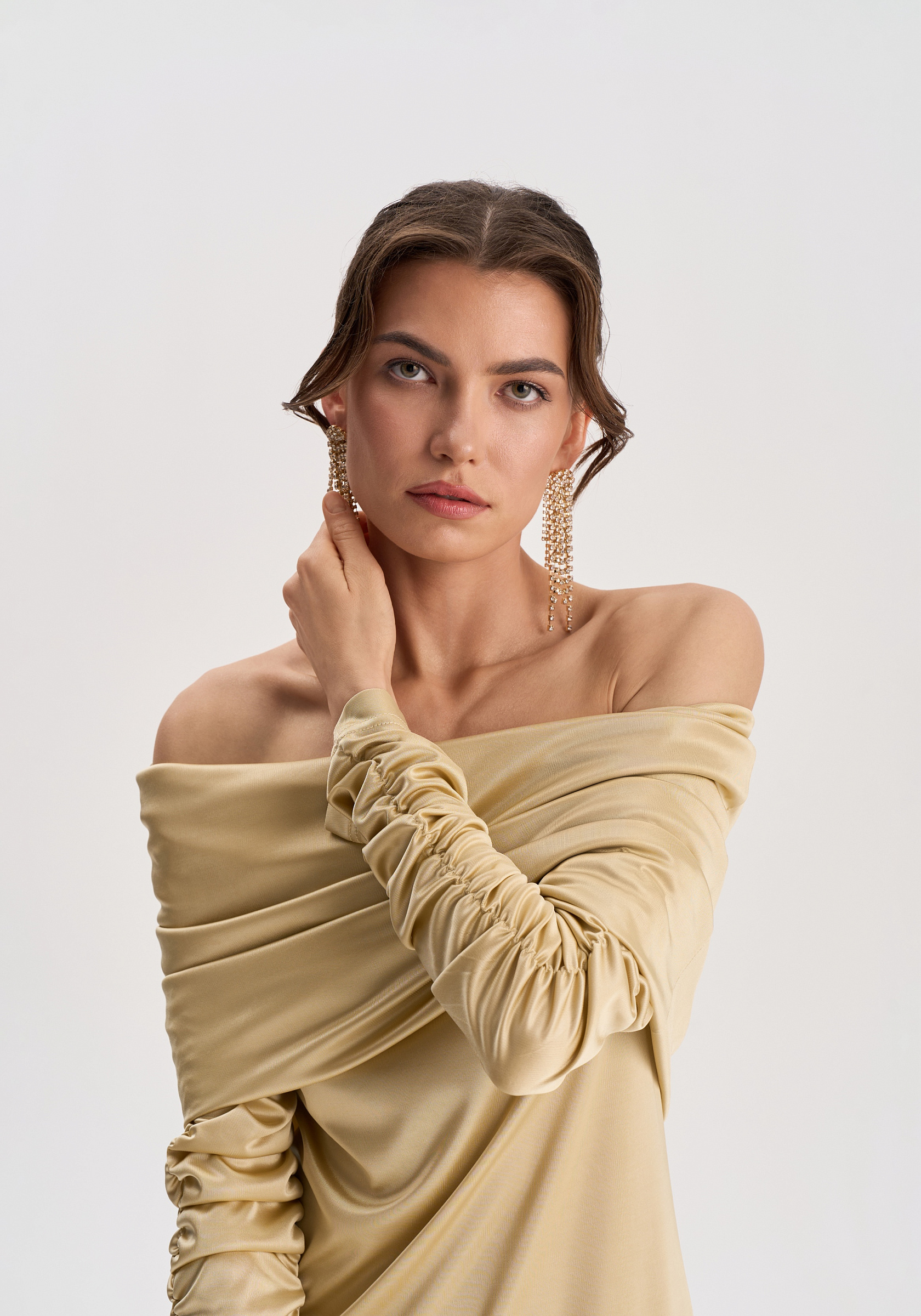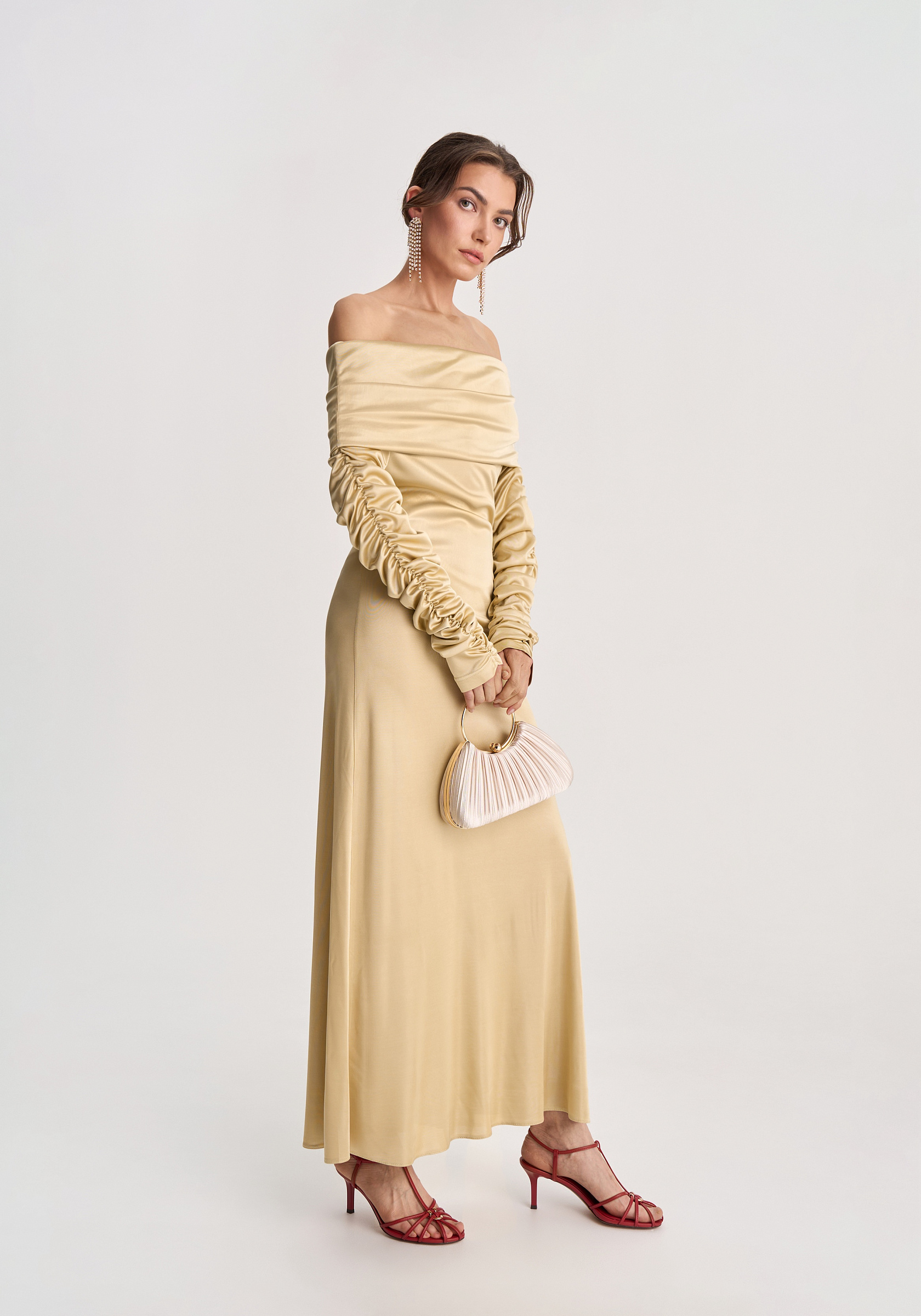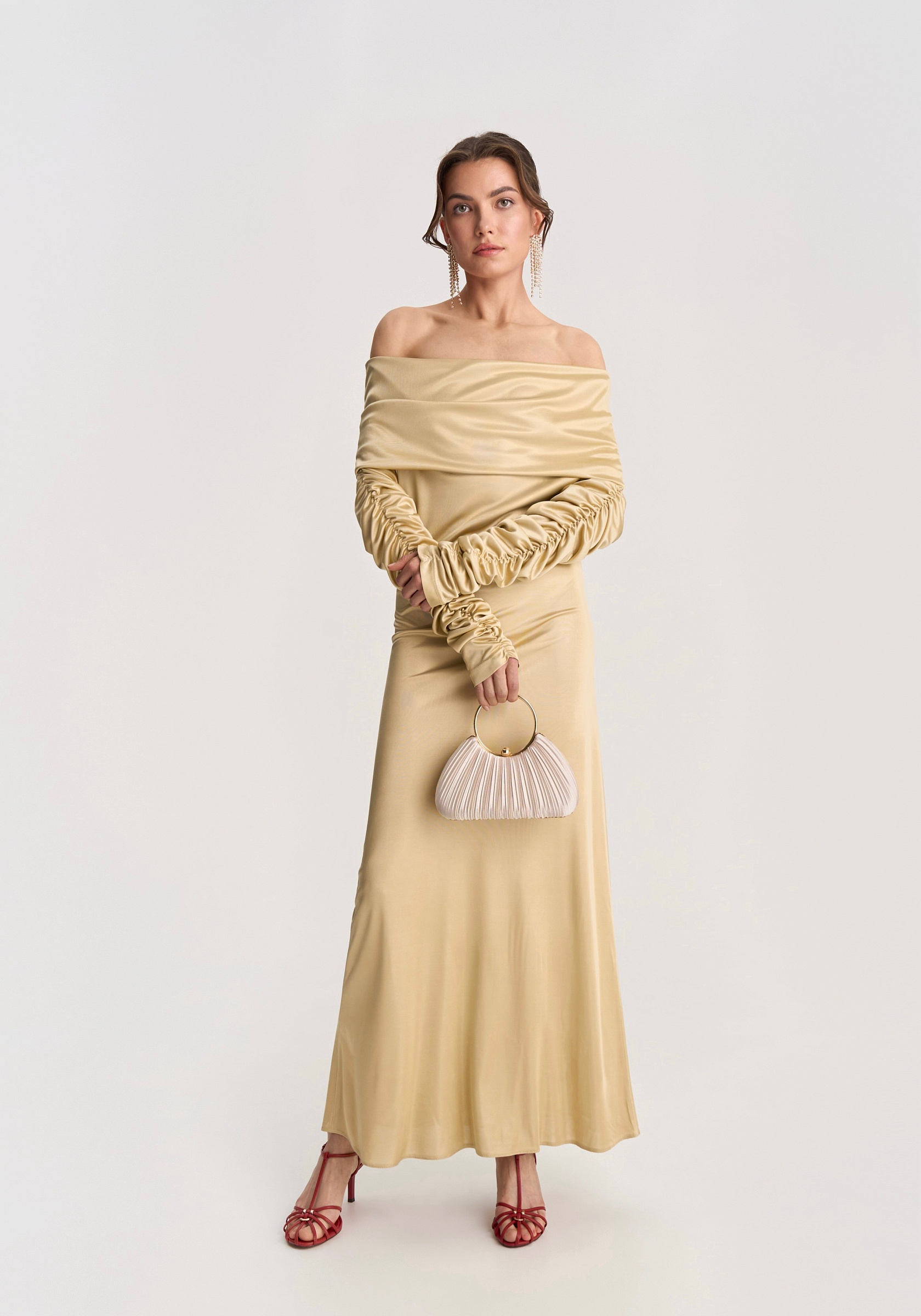 Платье с открытыми плечами и длинным рукавом с драпировкой выполнено из 100% вискозы и создаёт чистый, вытянутый силуэт, мягко подчеркивая линию тела. Ткань обладает естественным шелковистым блеском. Длина макси усиливает элегантность модели, делая её уместной и для вечерних выходов, и для особых дневных событий.Параметры изделия