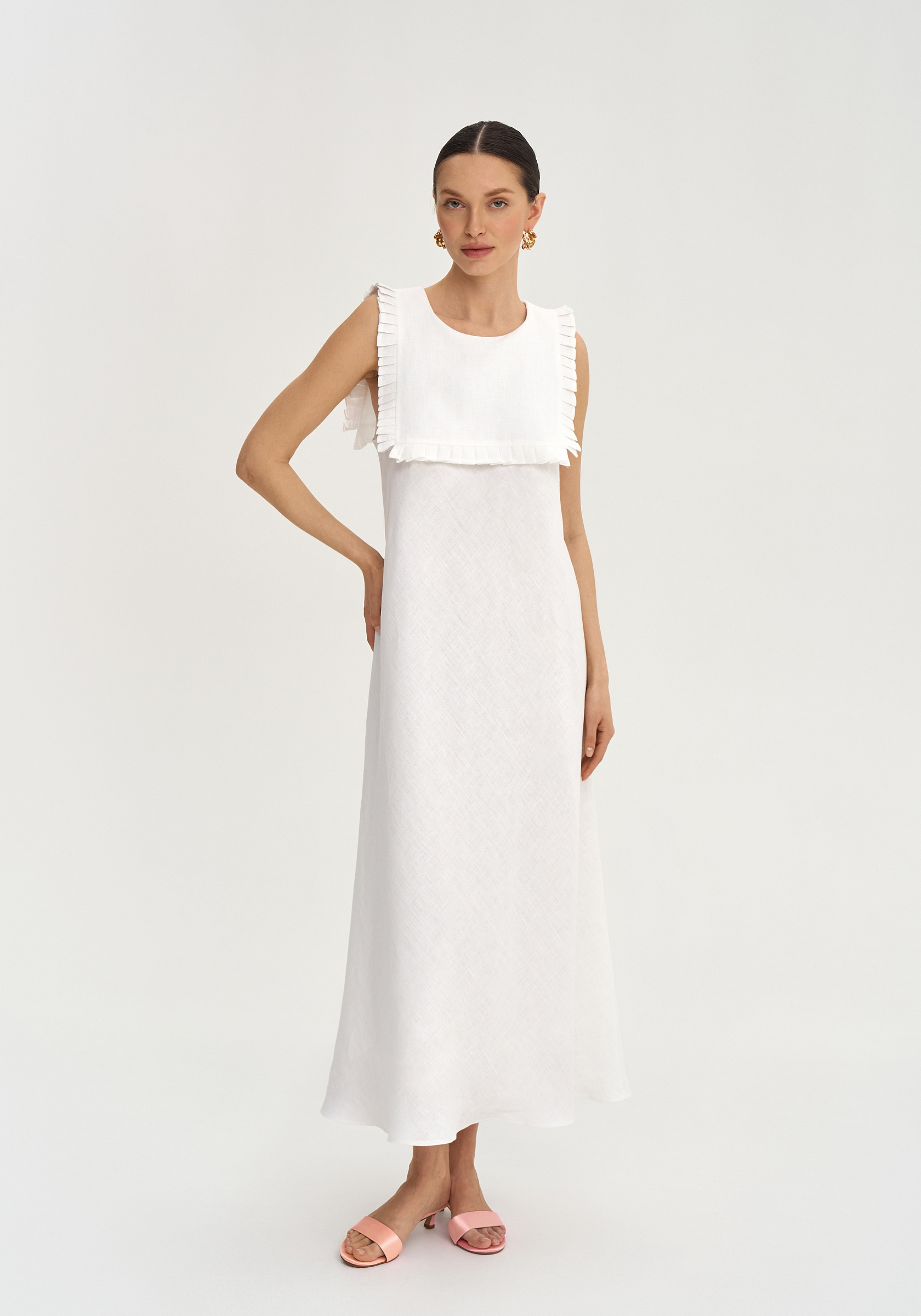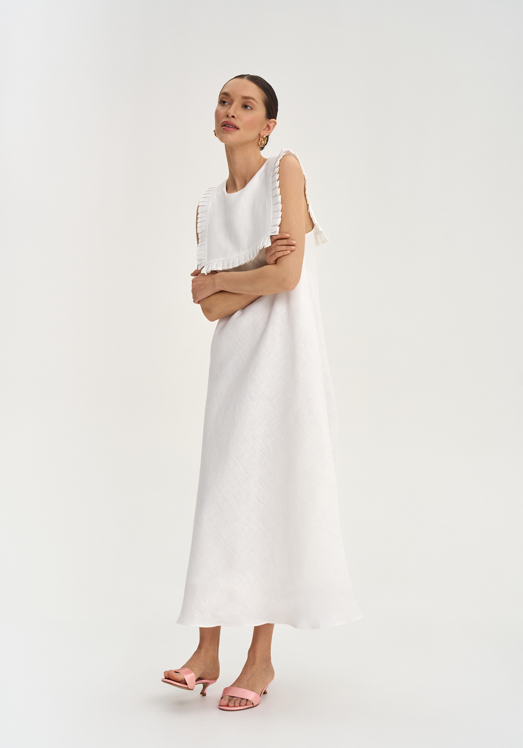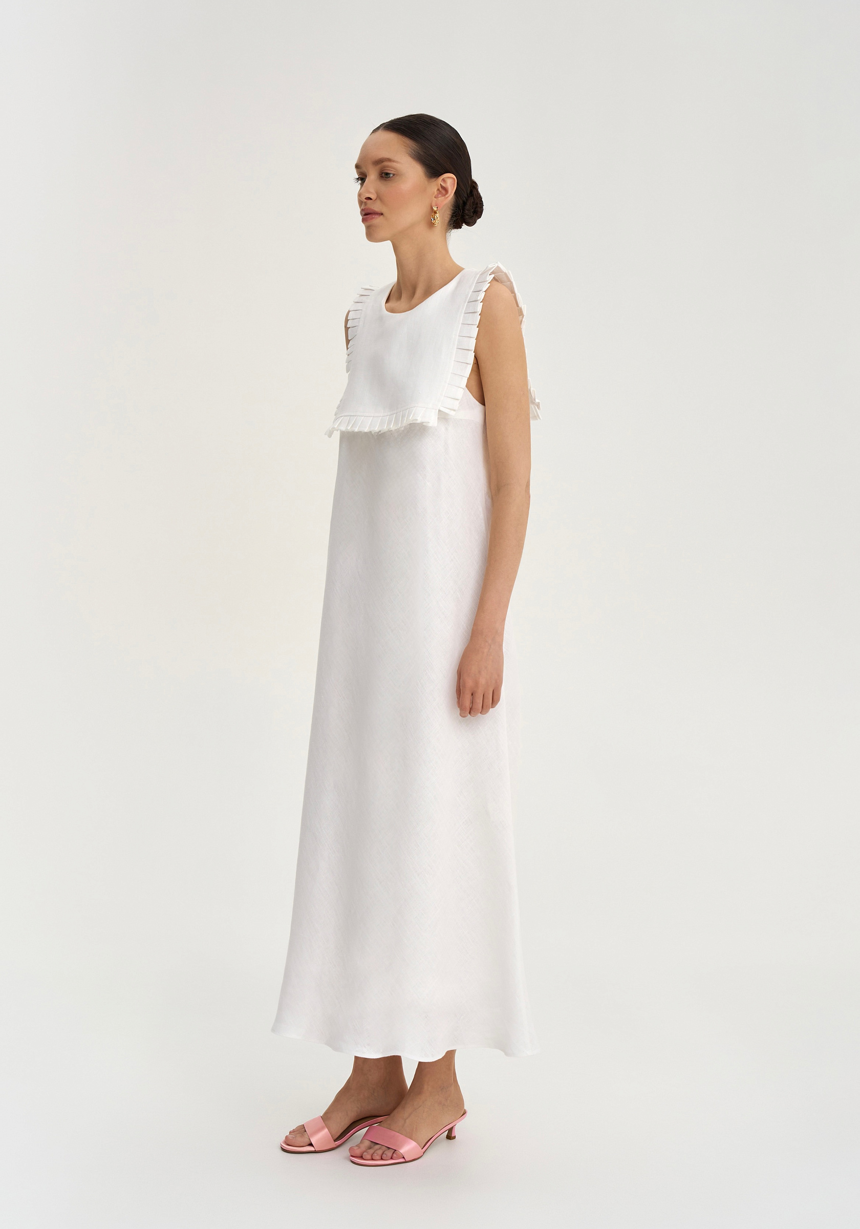 Свободный силуэт, выполненный по косой, мягко струится и создаёт лёгкую форму. Лаконичная линия плеч дополнена декоративным воротничком с рюшей.