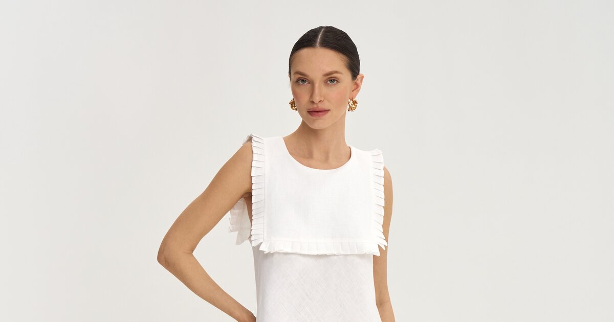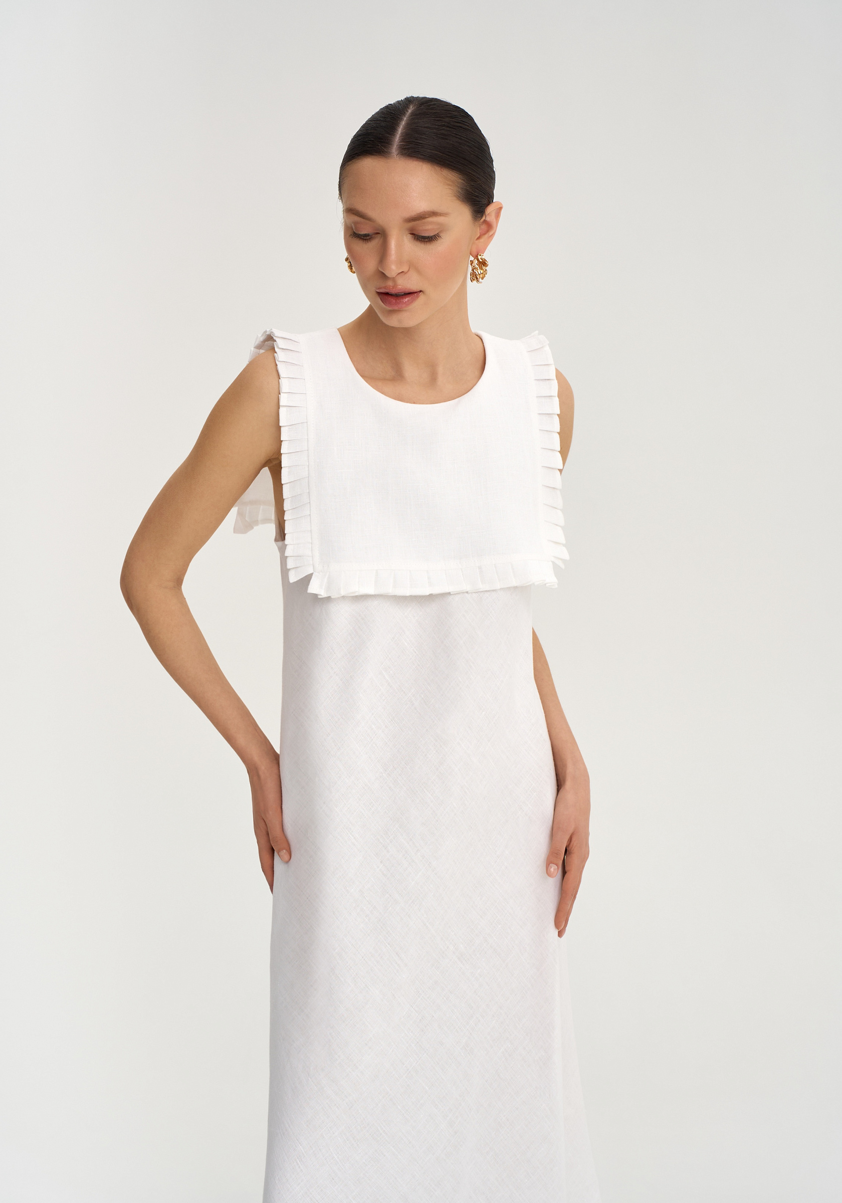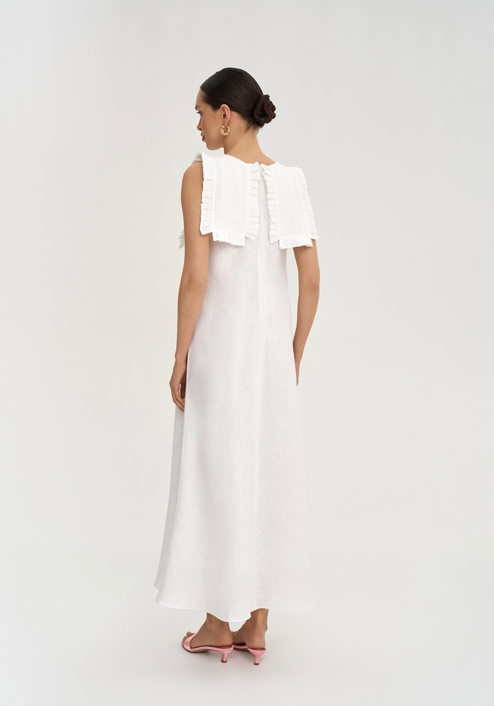 Свободный силуэт, выполненный по косой, мягко струится и создаёт лёгкую форму. Лаконичная линия плеч дополнена декоративным воротничком с рюшей.