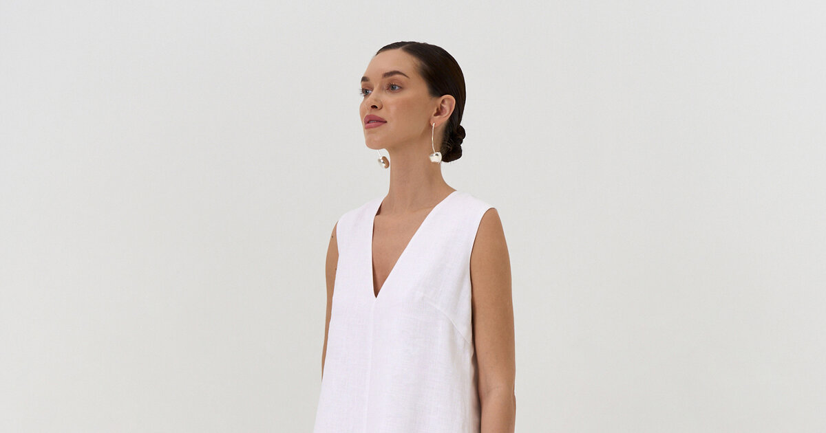 Летнее базовое платье свободного трапециевидного силуэта. Выполнено из умягченного льна. V образная горловина, застёжка на пуговицу. Для лучшей посадки на груди предусмотрены вытачки.