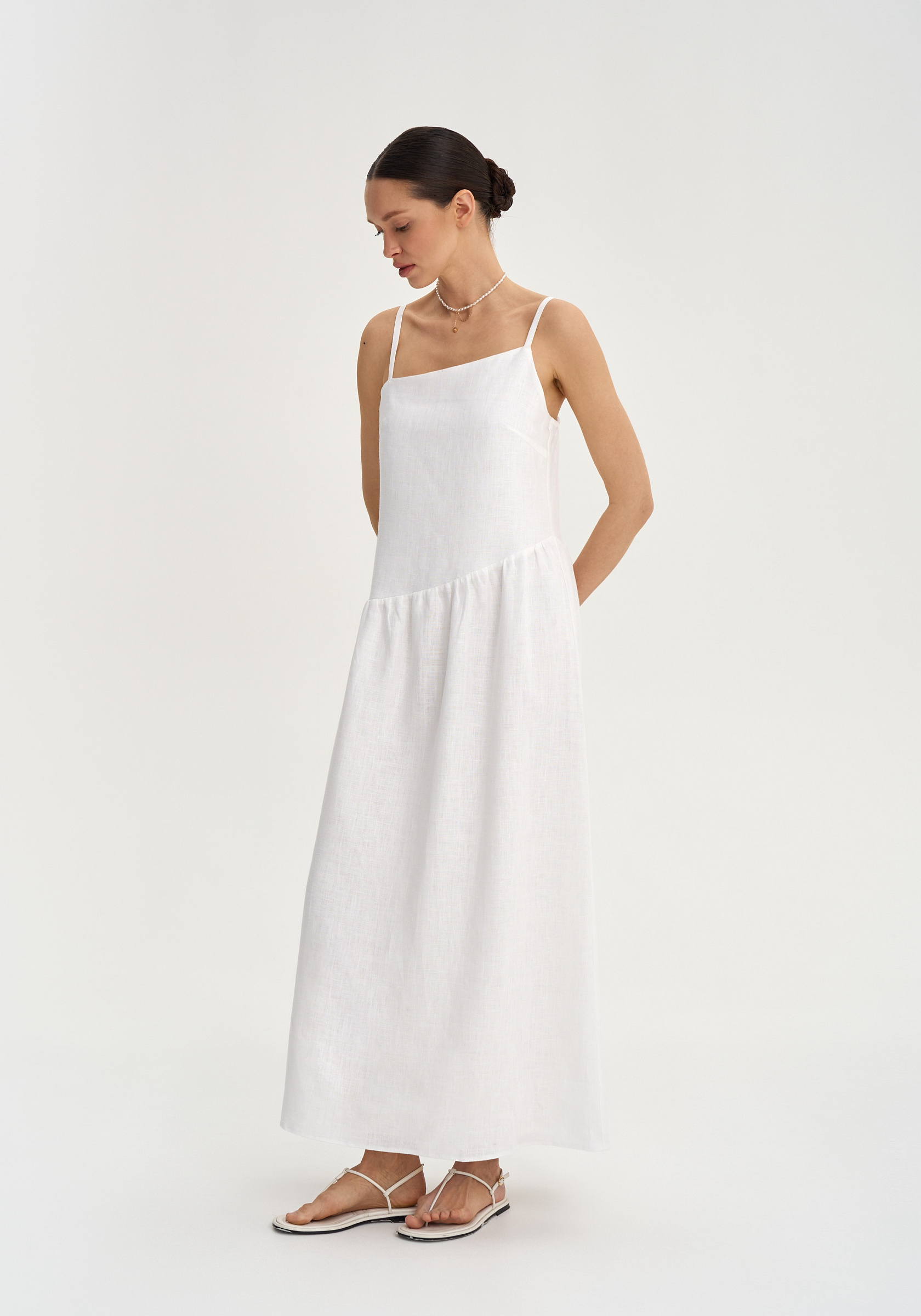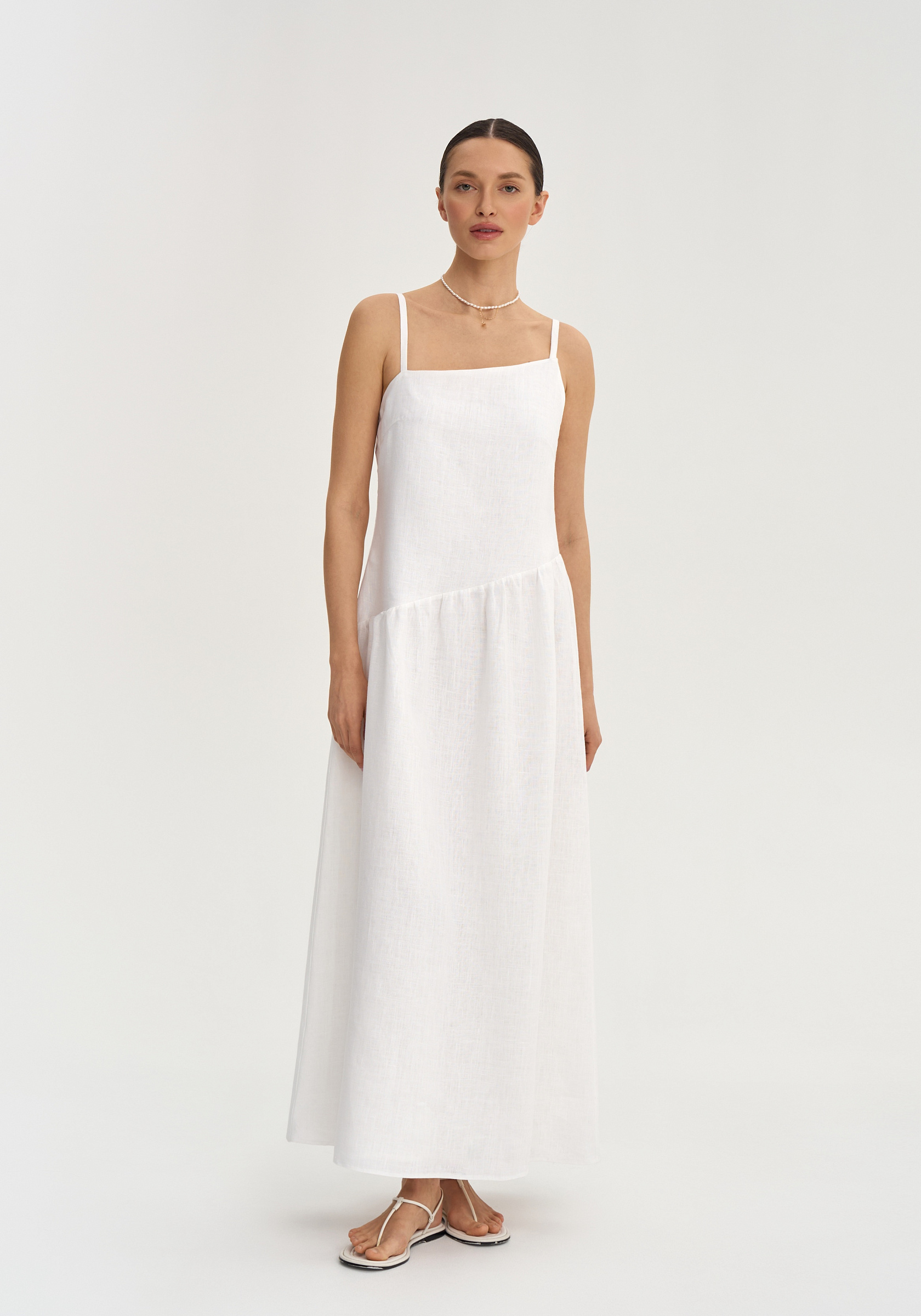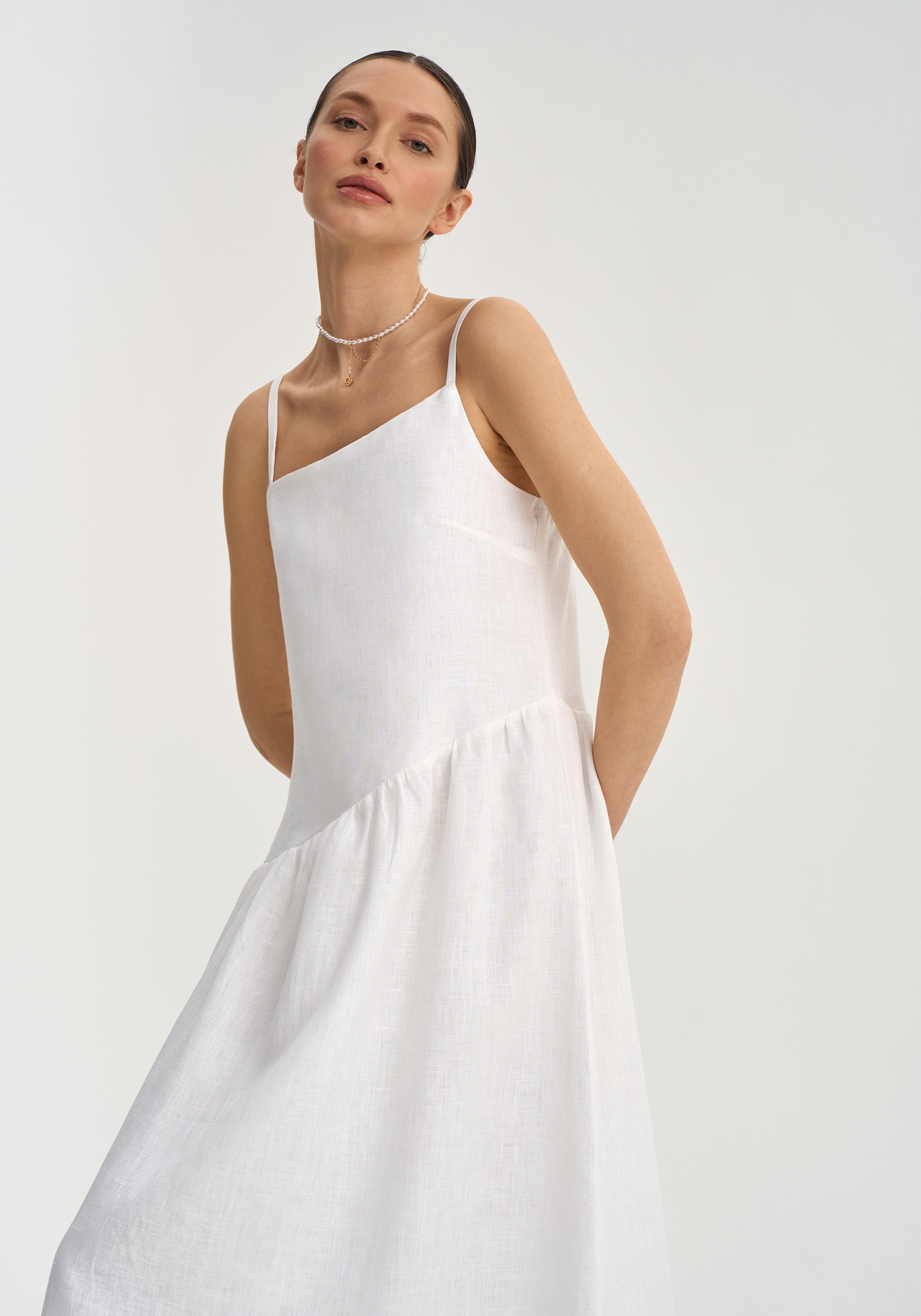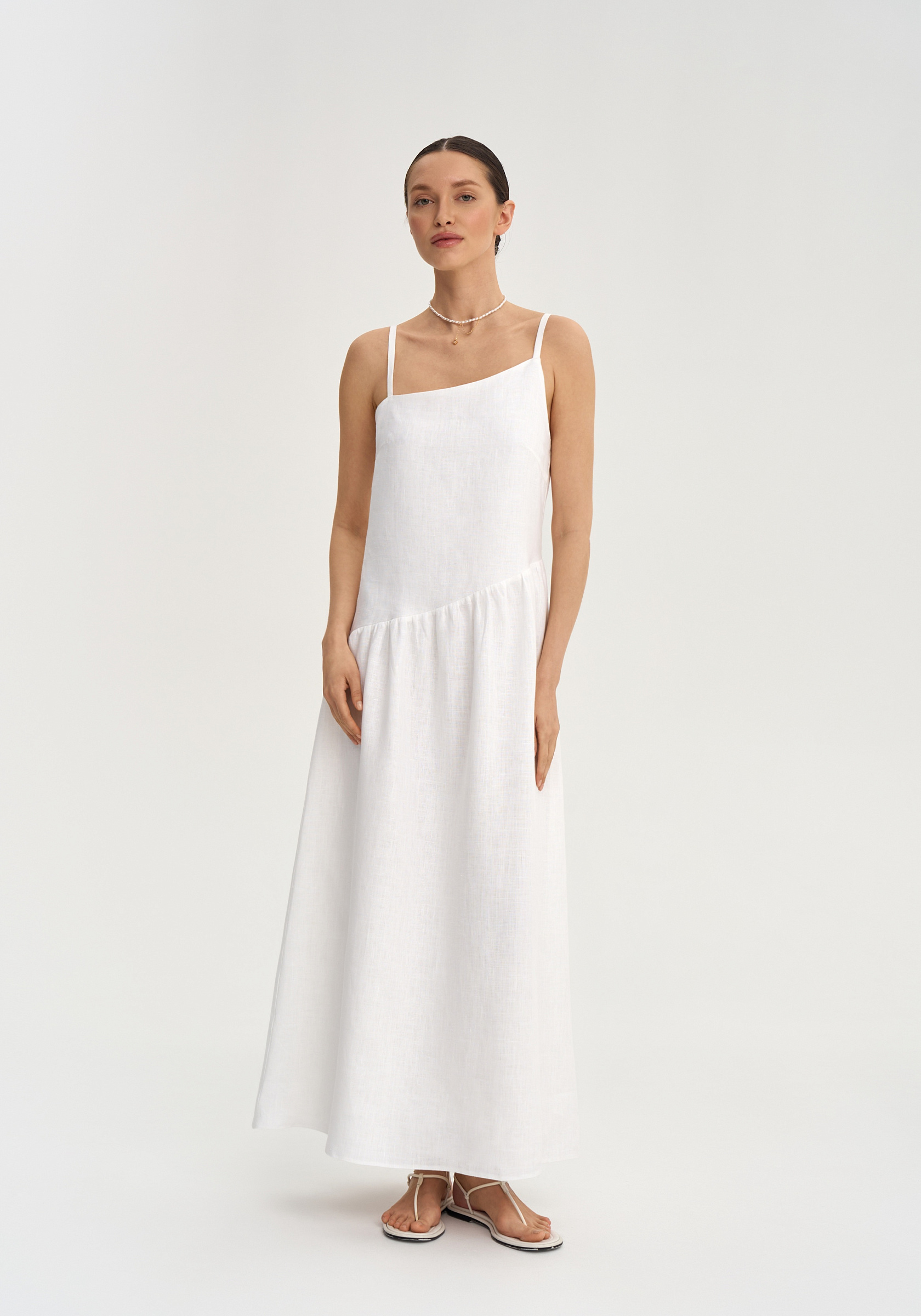 Свободный А-образный силуэт с асимметрично заниженной линией талии создаёт лёгкую и вытянутую форму.