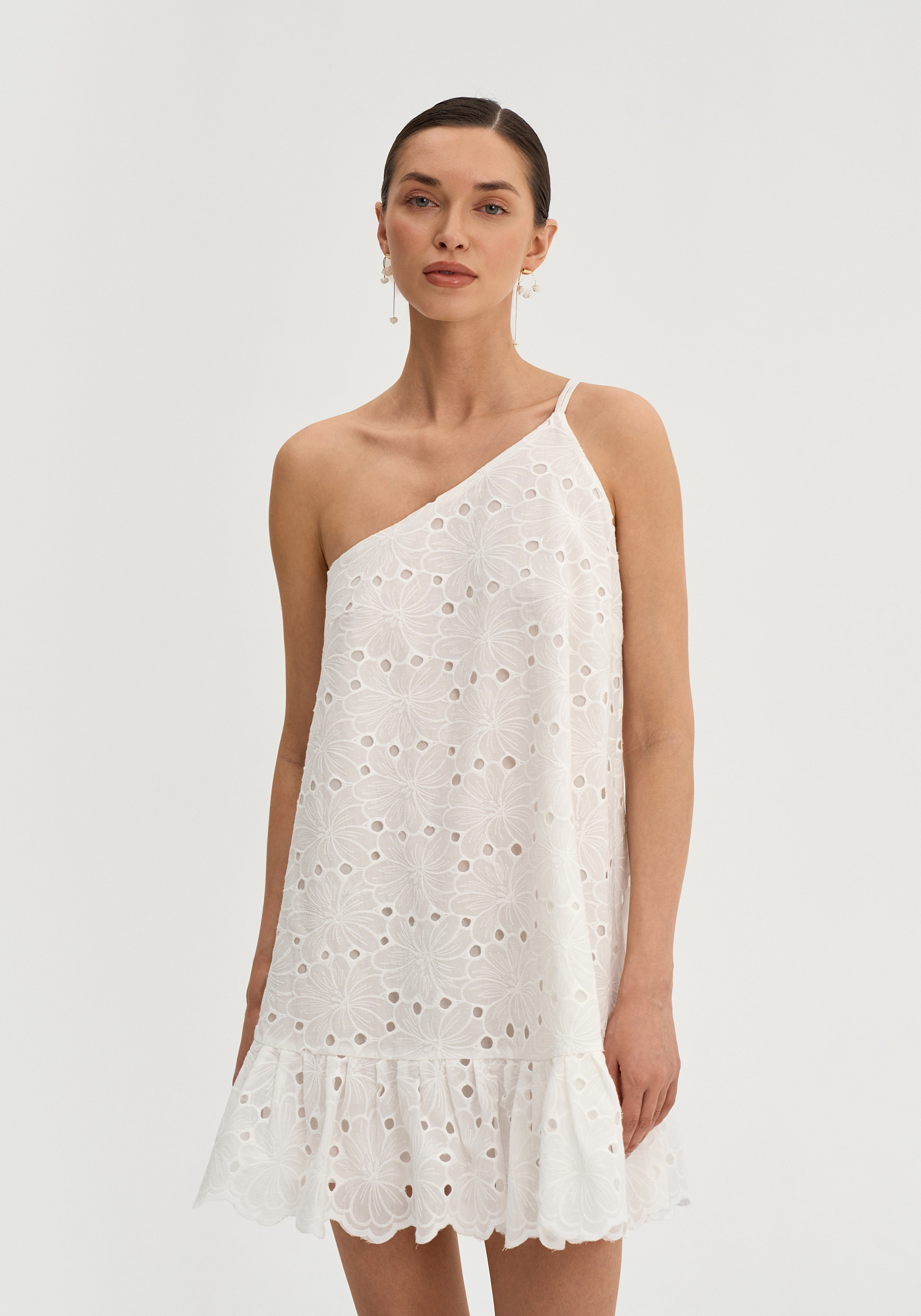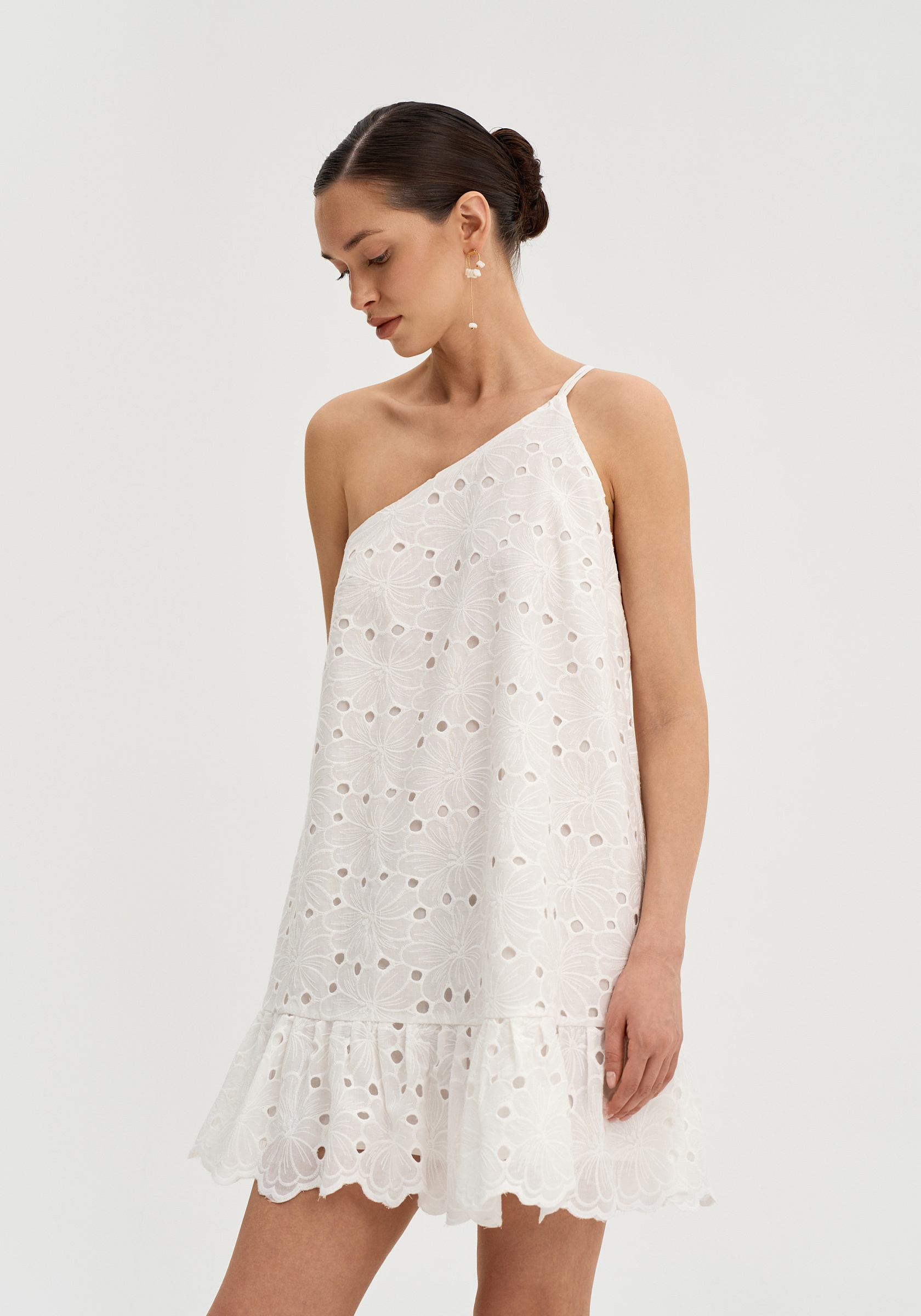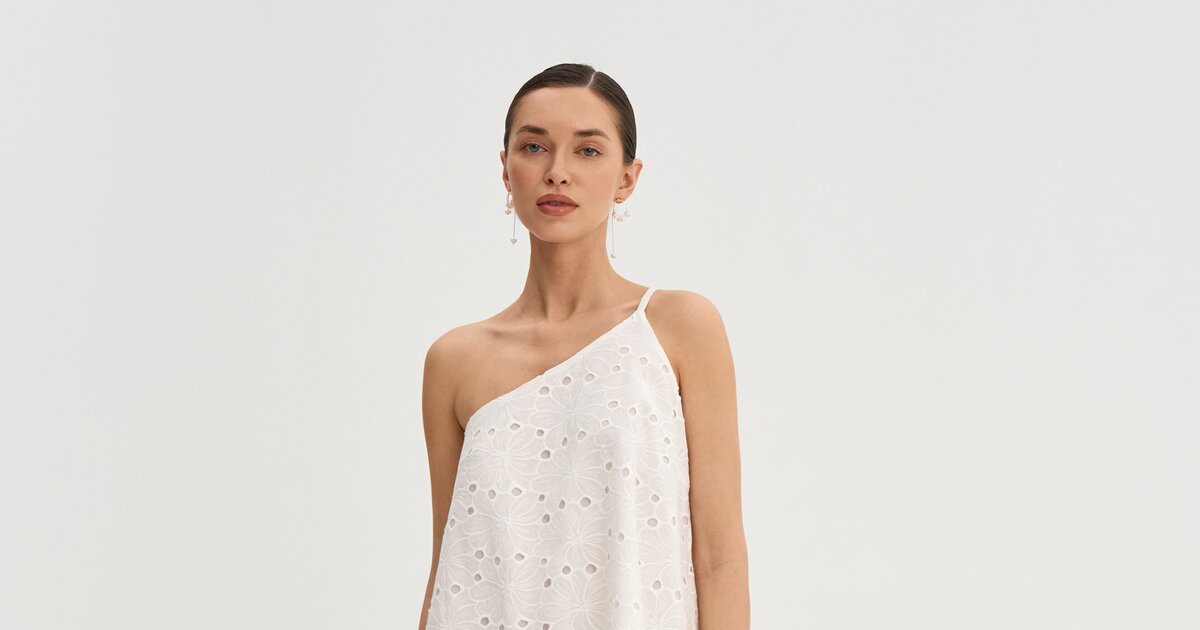 Свободный А-образный силуэт создаёт лёгкую и воздушную форму. Асимметричная линия плеч добавляет выразительный акцент.