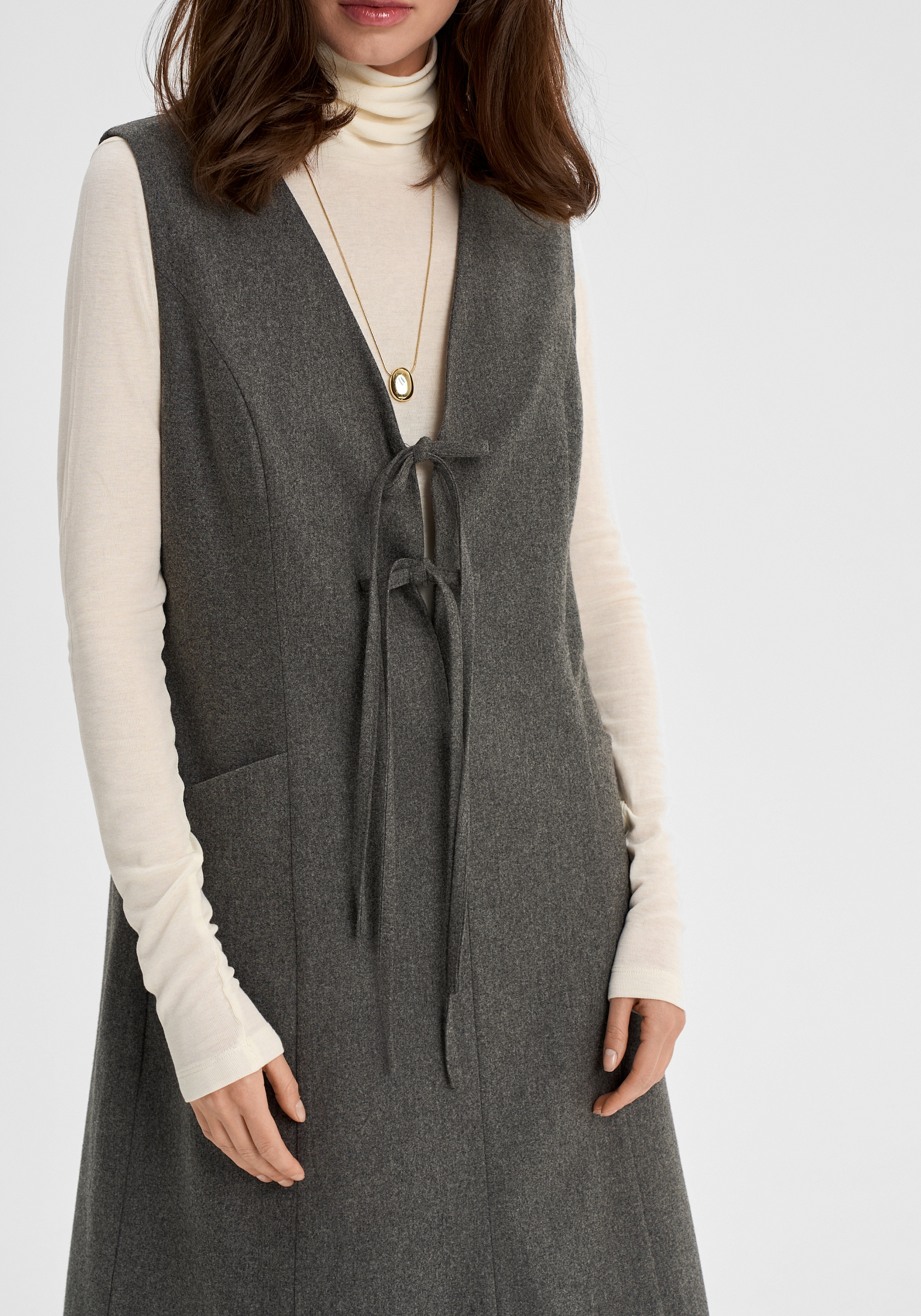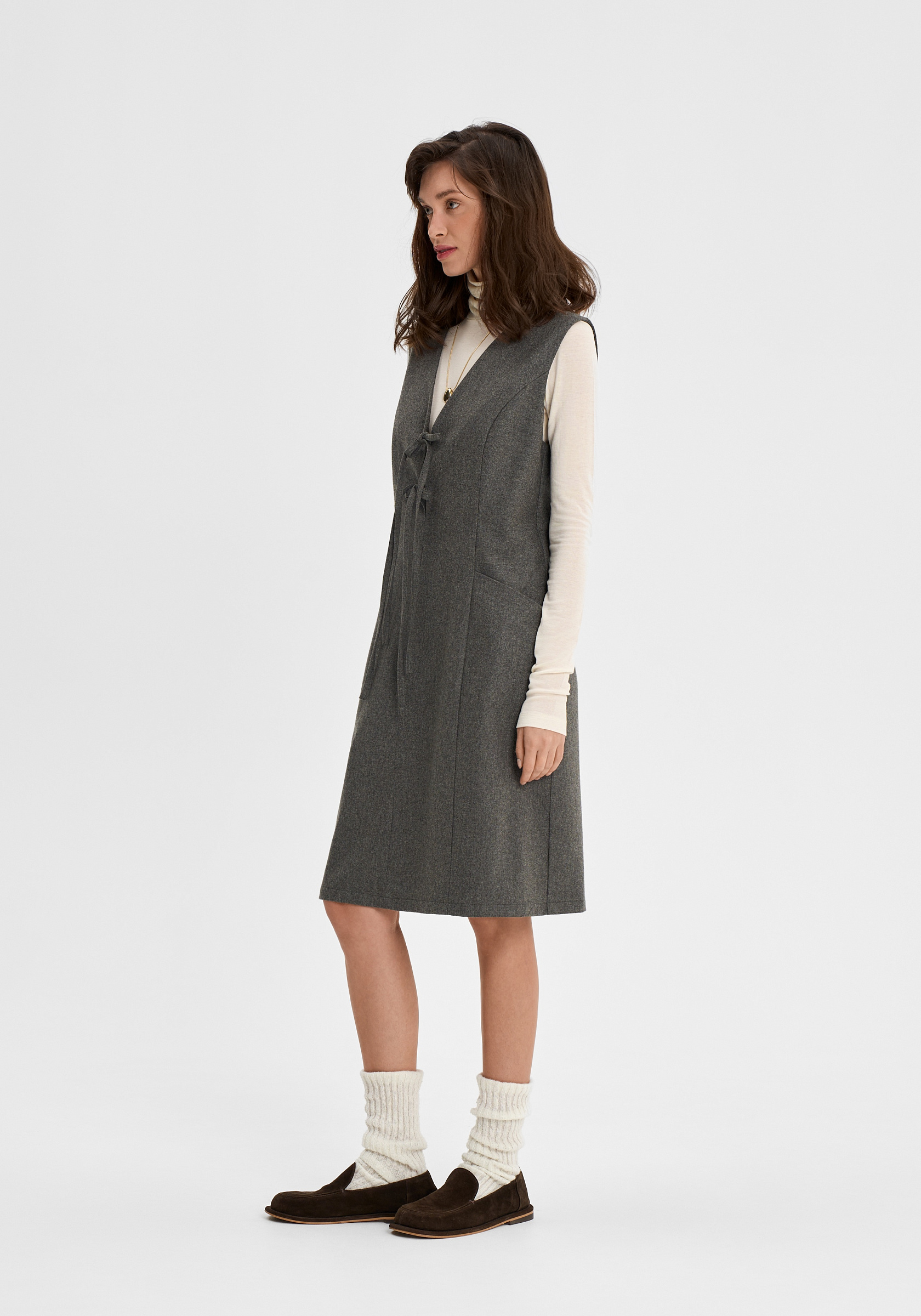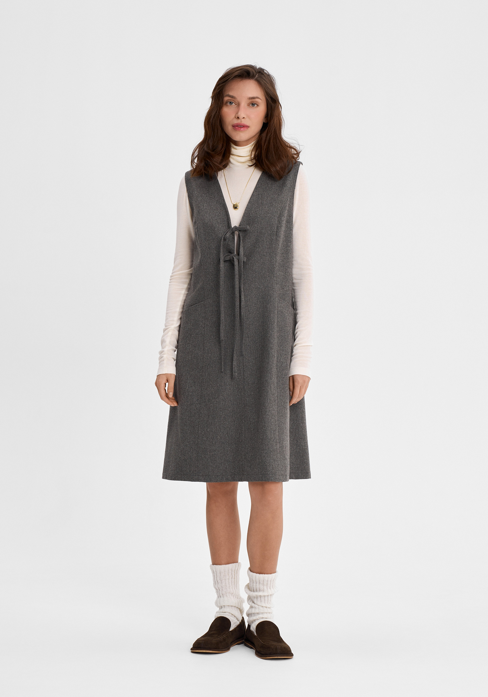 Сарафан из 100% шерсти — воплощение мягкой строгости и продуманного минимализма. Материал с деликатной фактурой приятно ощущается на коже и держит форму, сохраняя лёгкость в движении.V-образный вырез украшен завязками-бантиками, создающими женственный акцент, а карманы в области бёдер добавляют функциональности и подчёркивают непринуждённый характер модели. Этот сарафан — альтернатива привычному платью, уравновешенная, тёплая и универсальная.