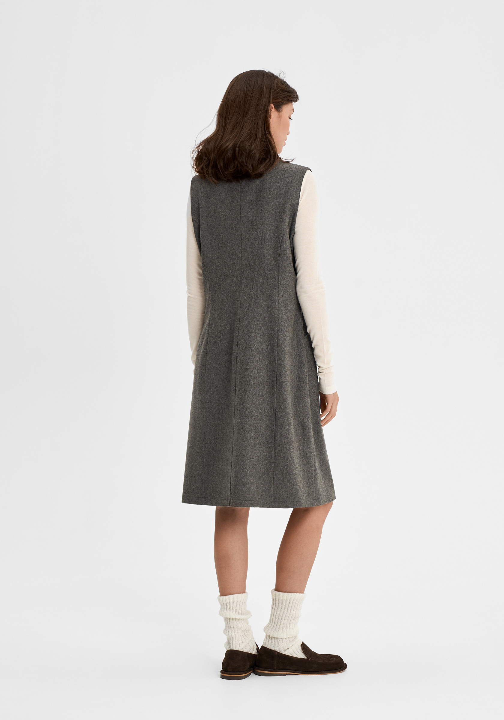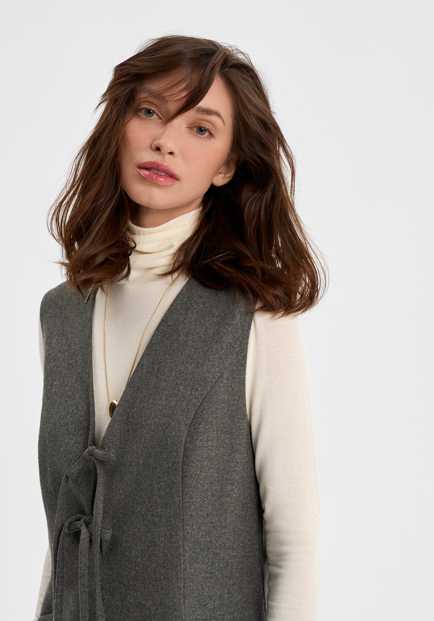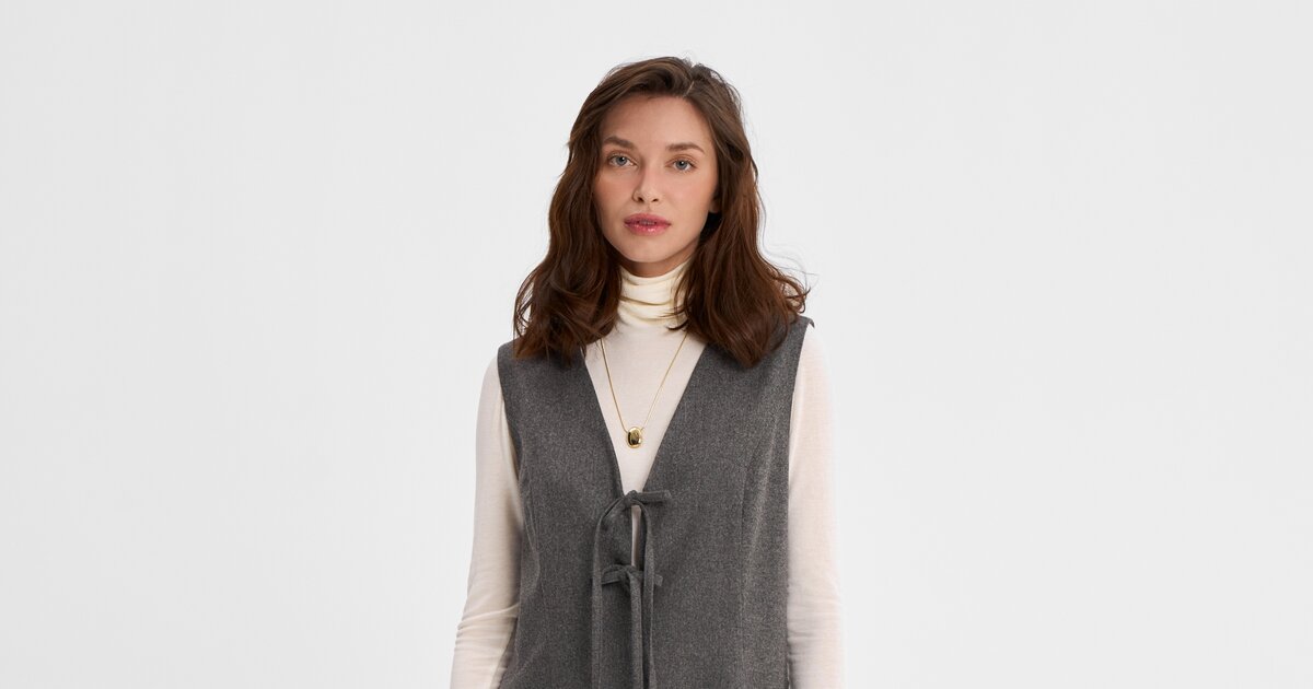 Сарафан из 100% шерсти — воплощение мягкой строгости и продуманного минимализма. Материал с деликатной фактурой приятно ощущается на коже и держит форму, сохраняя лёгкость в движении.V-образный вырез украшен завязками-бантиками, создающими женственный акцент, а карманы в области бёдер добавляют функциональности и подчёркивают непринуждённый характер модели. Этот сарафан — альтернатива привычному платью, уравновешенная, тёплая и универсальная.