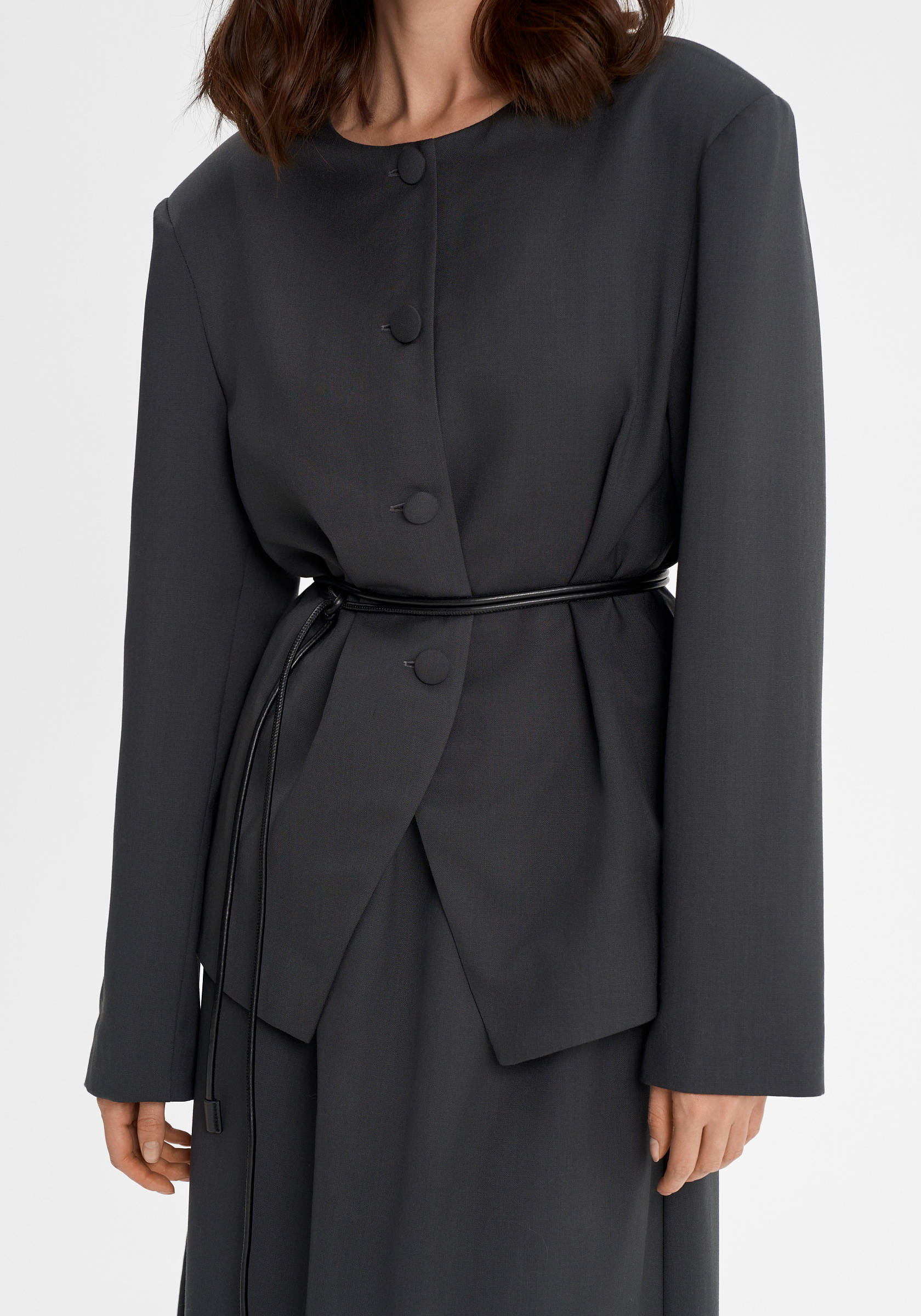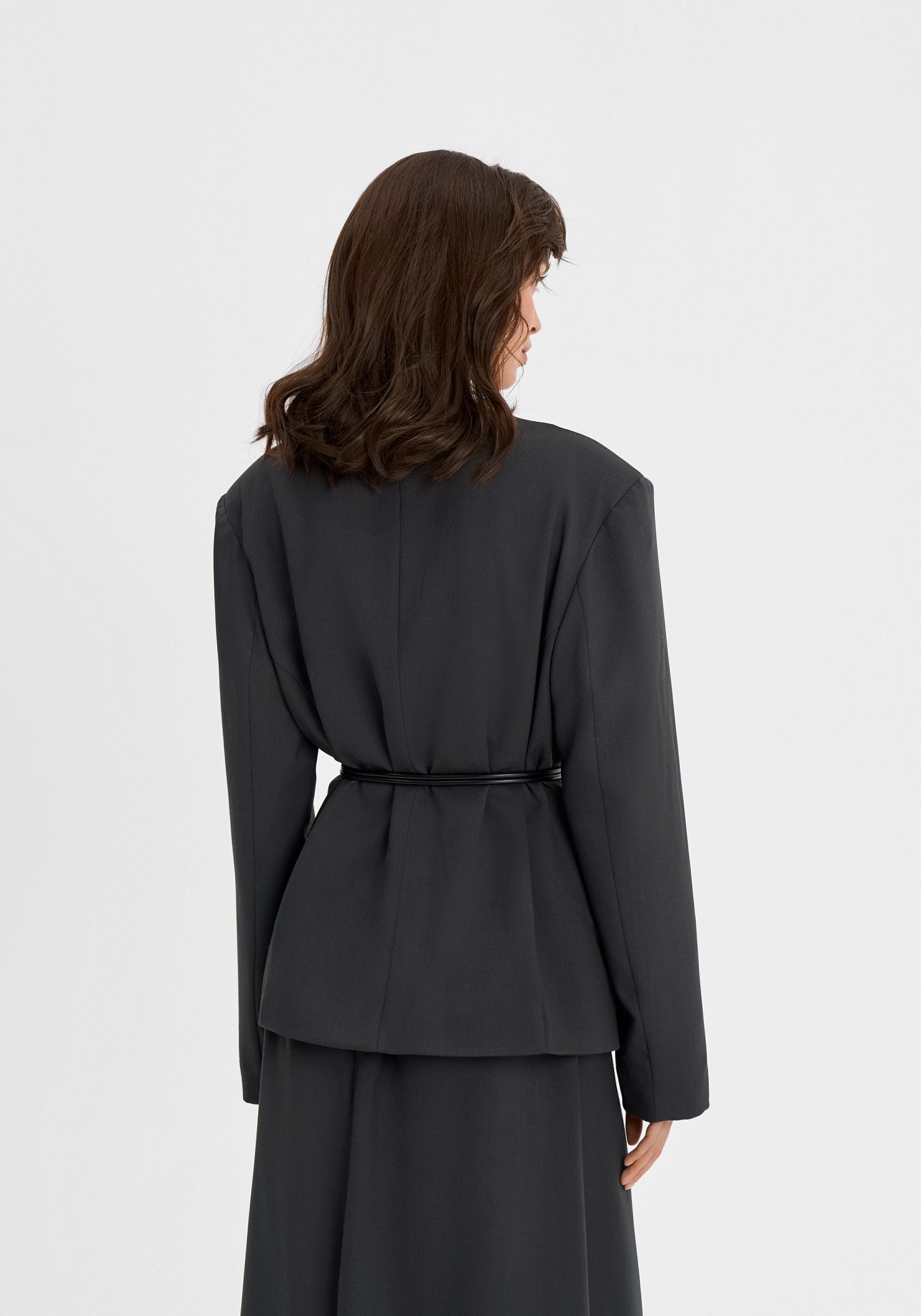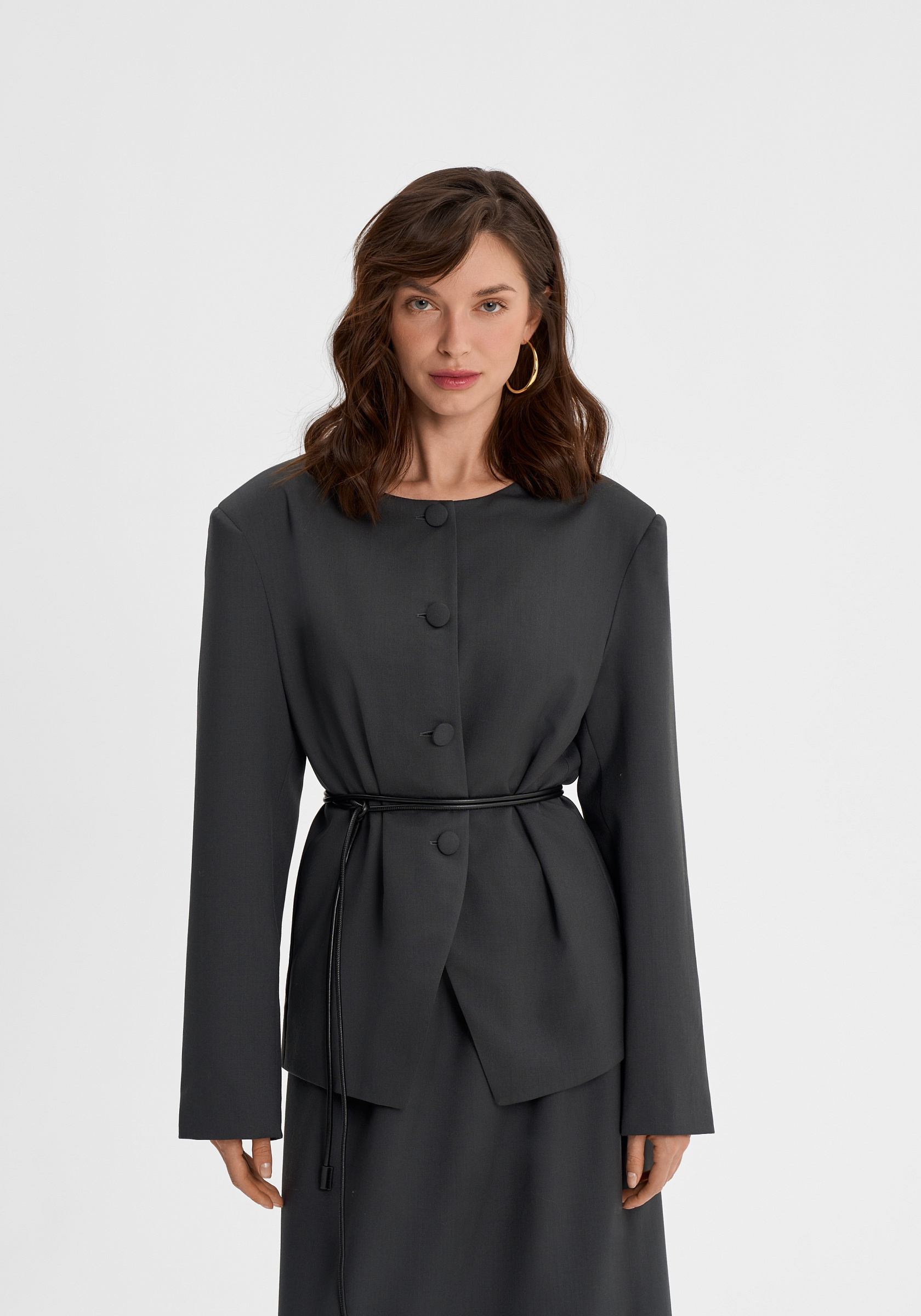 Жакет из мягкой костюмной шерсти — лёгкий и пластичный, с естественным движением ткани и спокойным силуэтом. Полуприлегающая форма подчёркивает пропорции, оставаясь при этом свободной и ненавязчивой.Фактура тонкой шерсти приятна на ощупь и создаёт ощущение уюта, а кожаный ремешок добавляет современный штрих и позволяет менять настроение образа — от расслабленного до собранного.