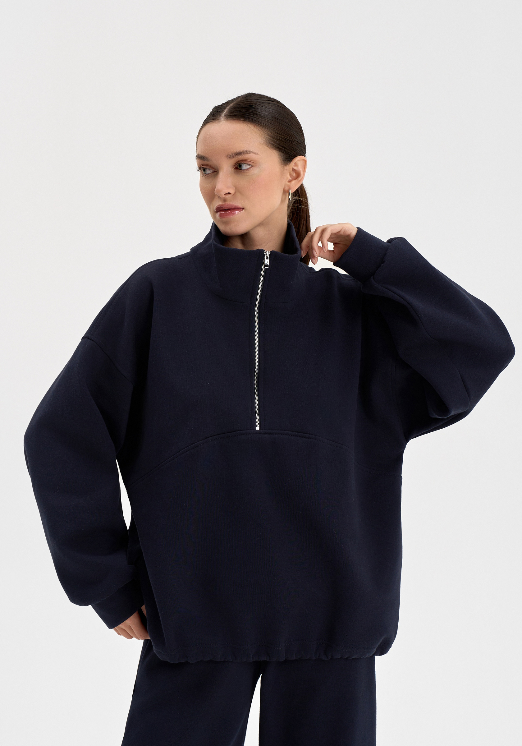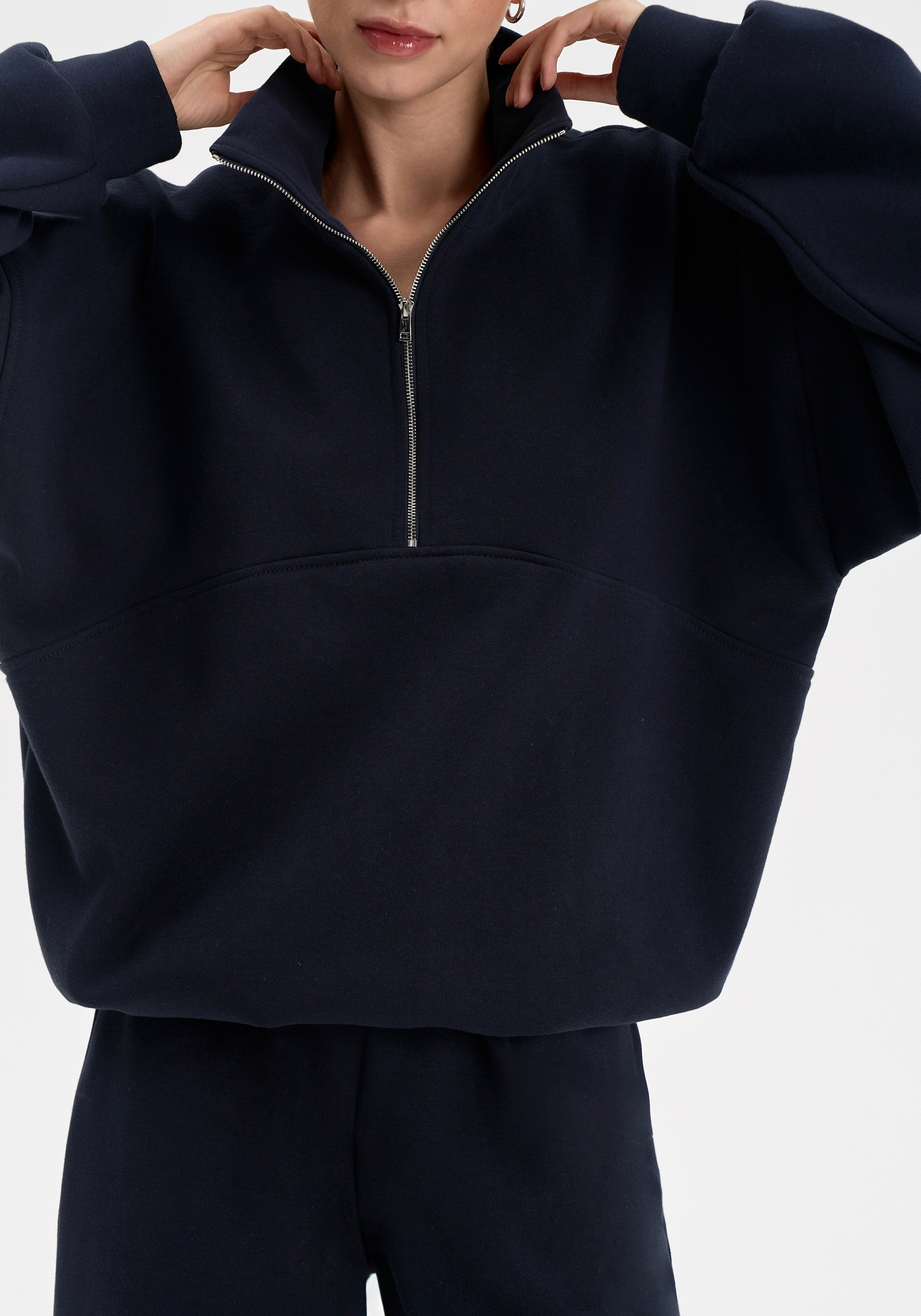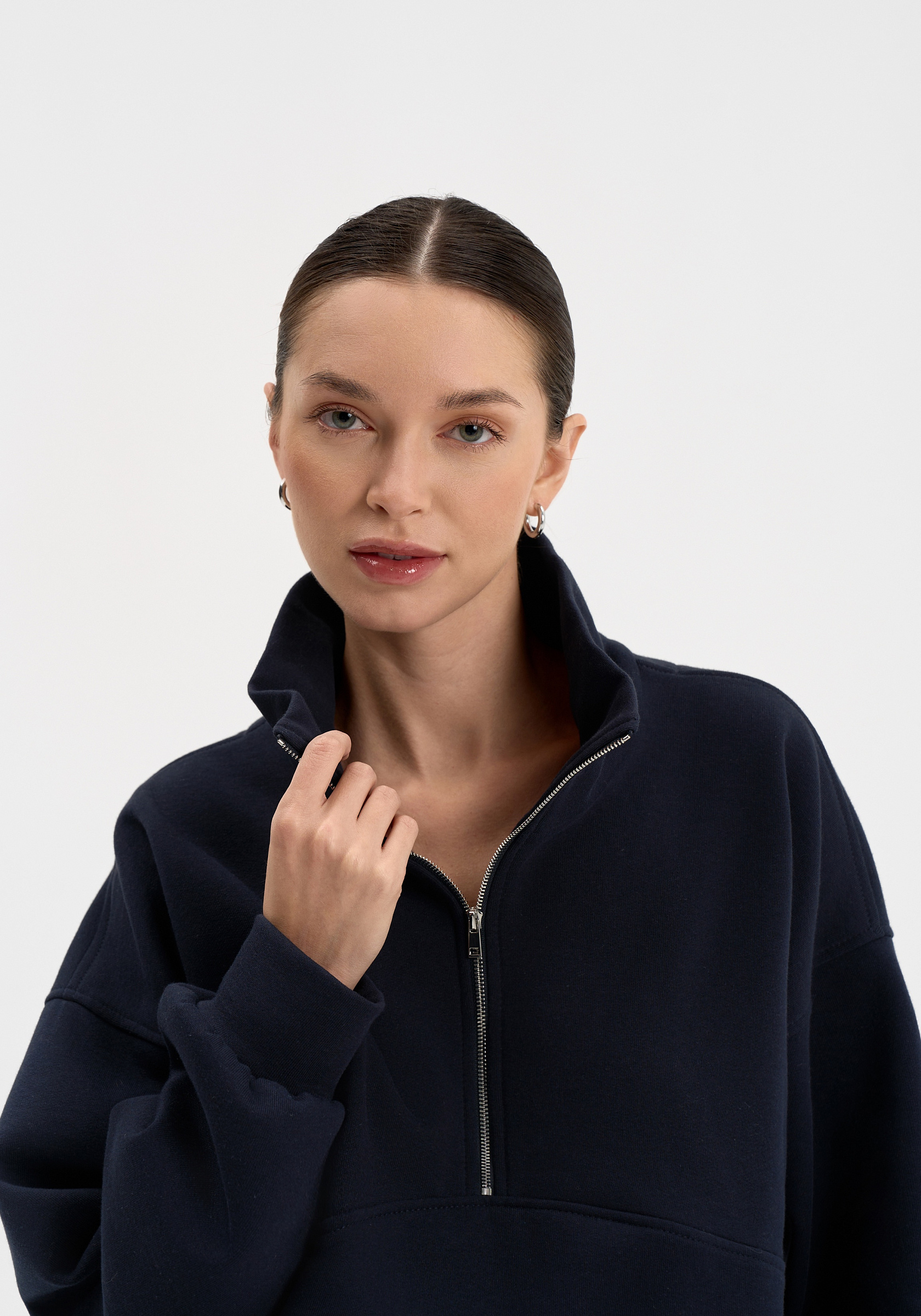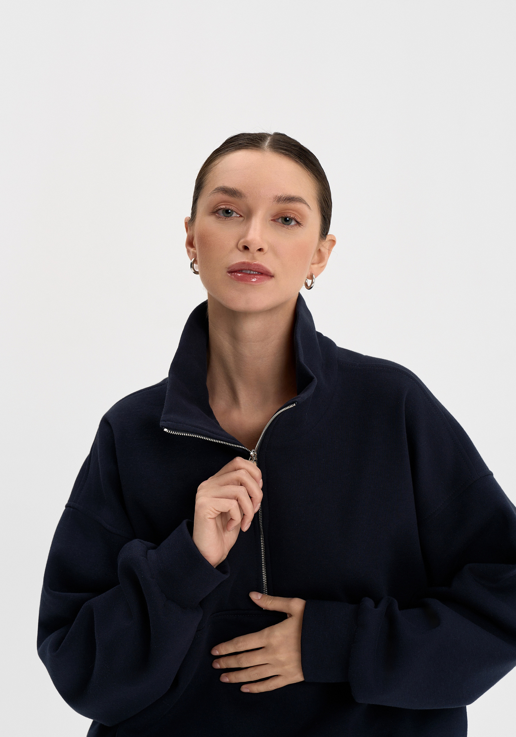 Свободный свитшот на молнии из хлопкового футера с начёсом. Мягкий, тёплый и уютный, с лаконичной отделочной строчкой на груди и вышивкой на спине. Воротник-стойка и мягкая посадка создают сбалансированный силуэт в духе повседневного минимализма.Параметры изделия