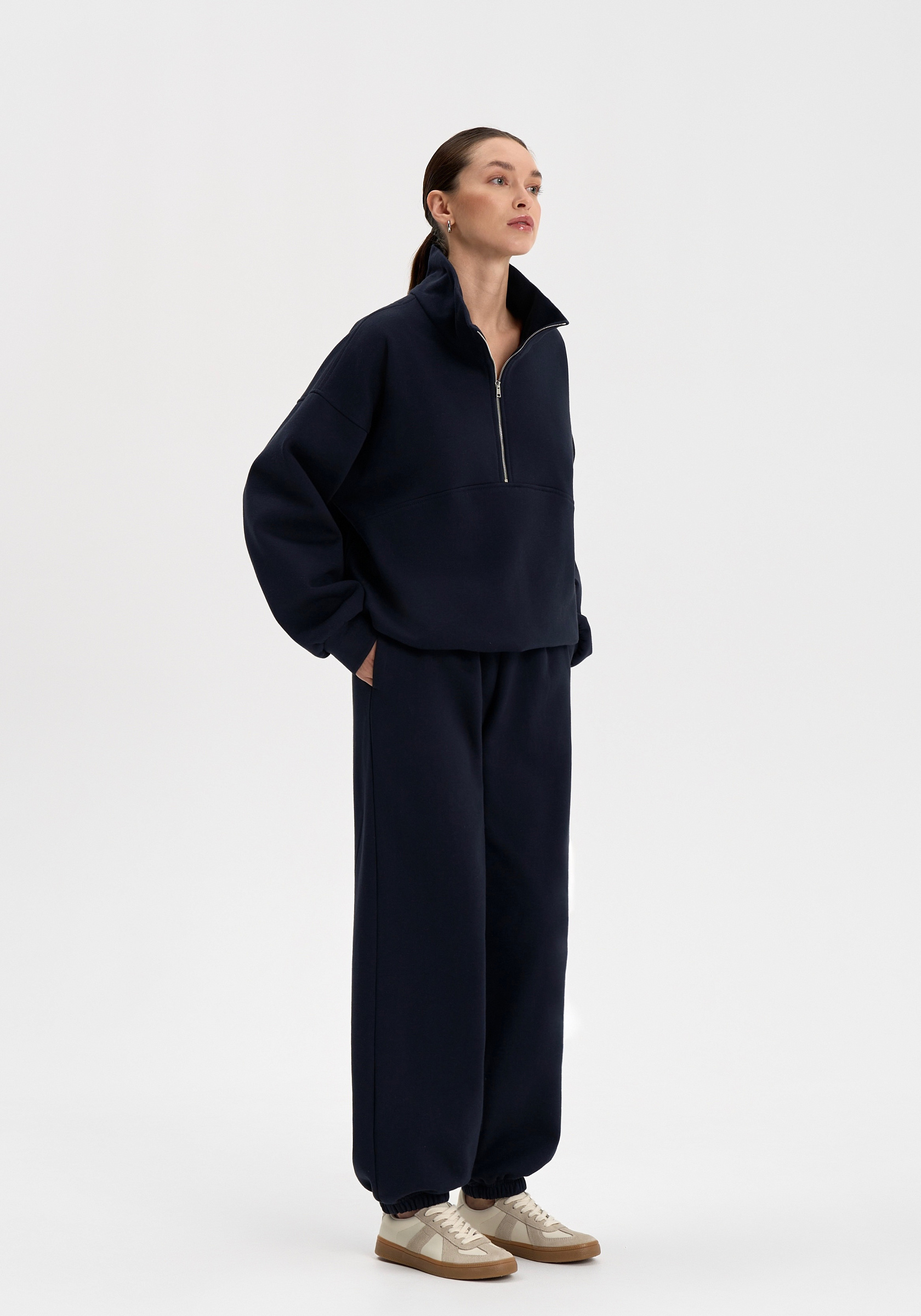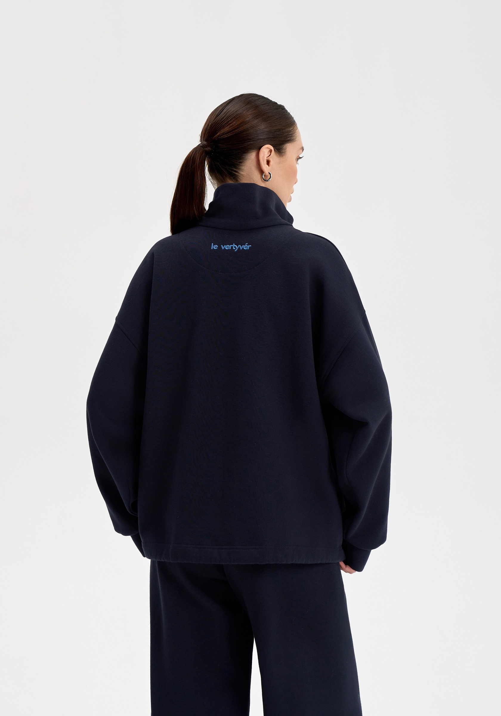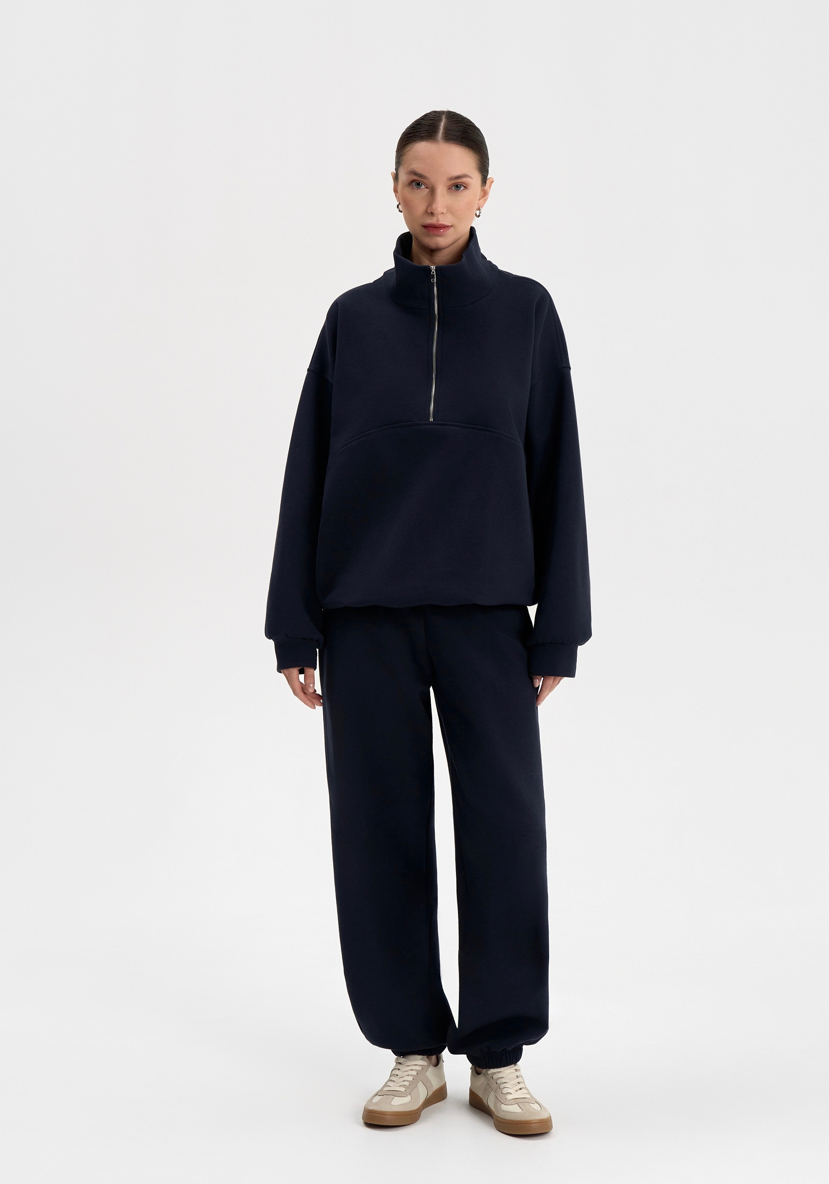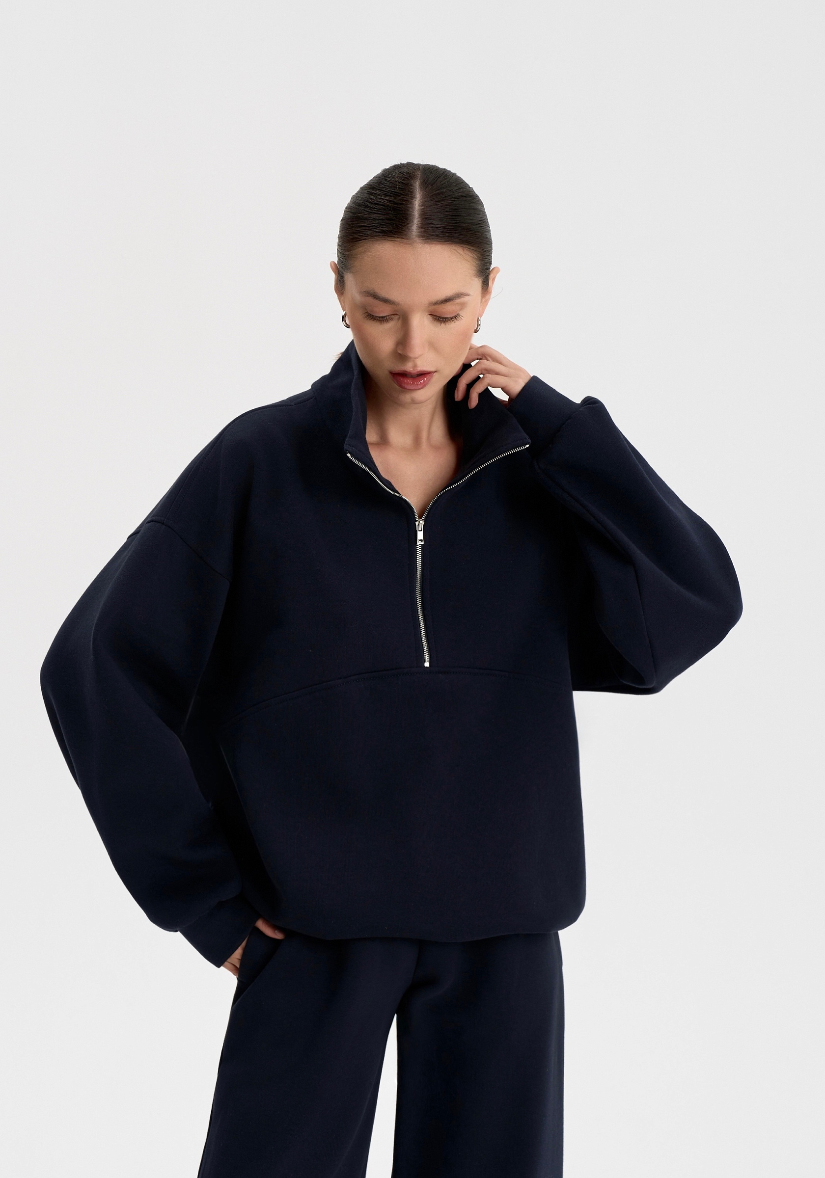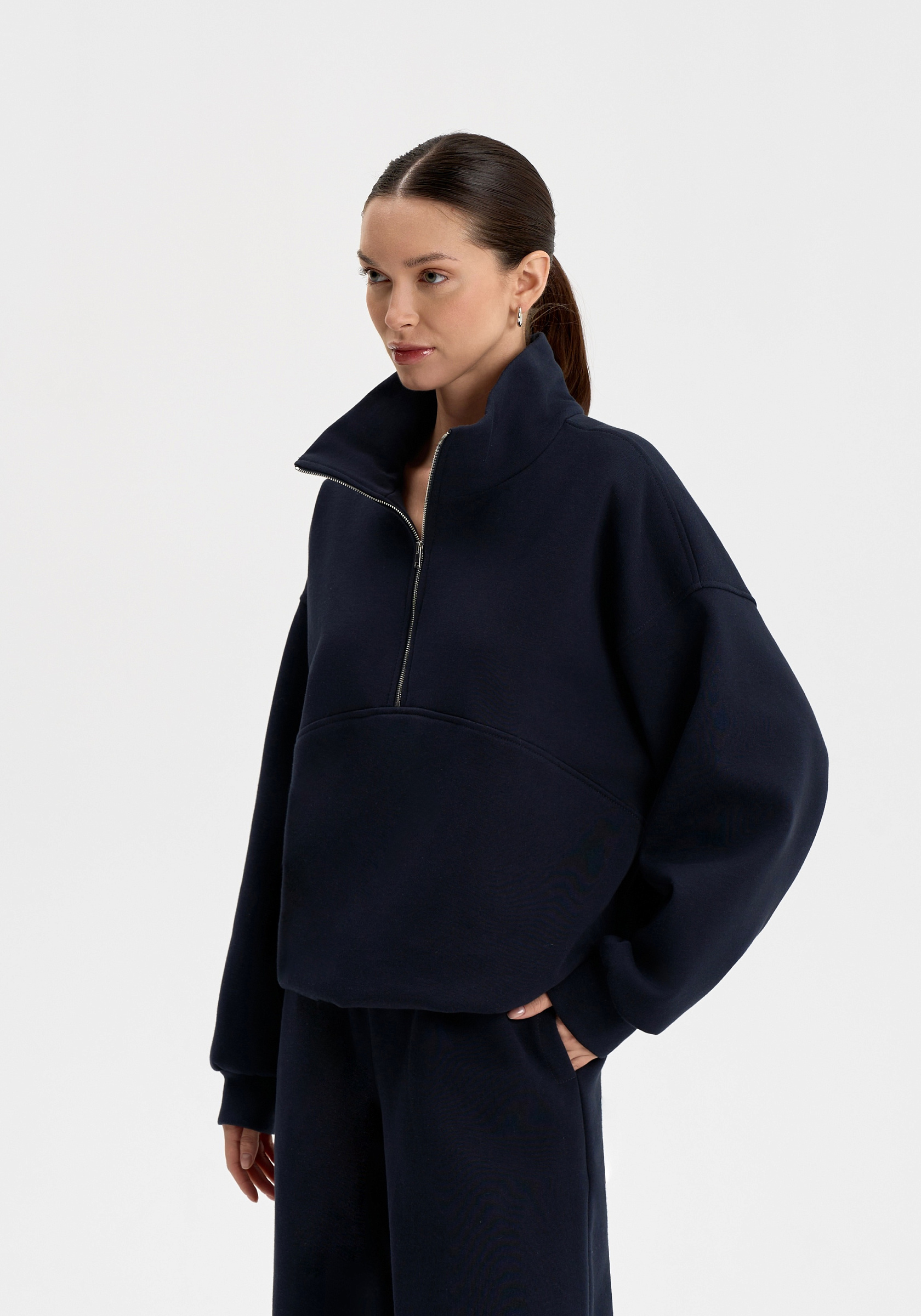 Свободный свитшот на молнии из хлопкового футера с начёсом. Мягкий, тёплый и уютный, с лаконичной отделочной строчкой на груди и вышивкой на спине. Воротник-стойка и мягкая посадка создают сбалансированный силуэт в духе повседневного минимализма.Параметры изделия