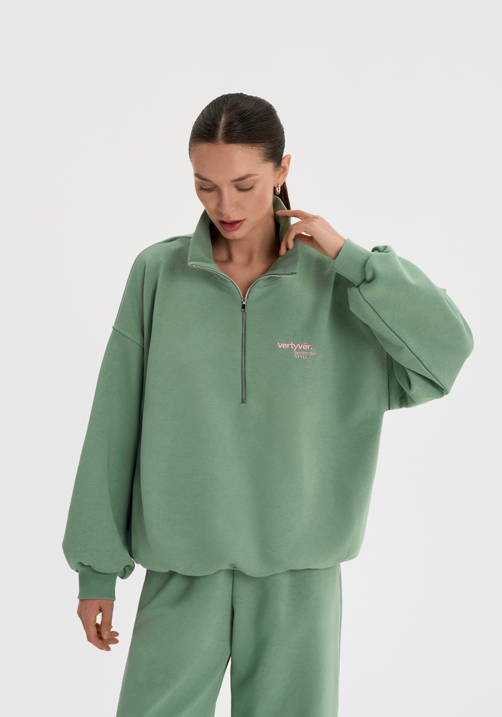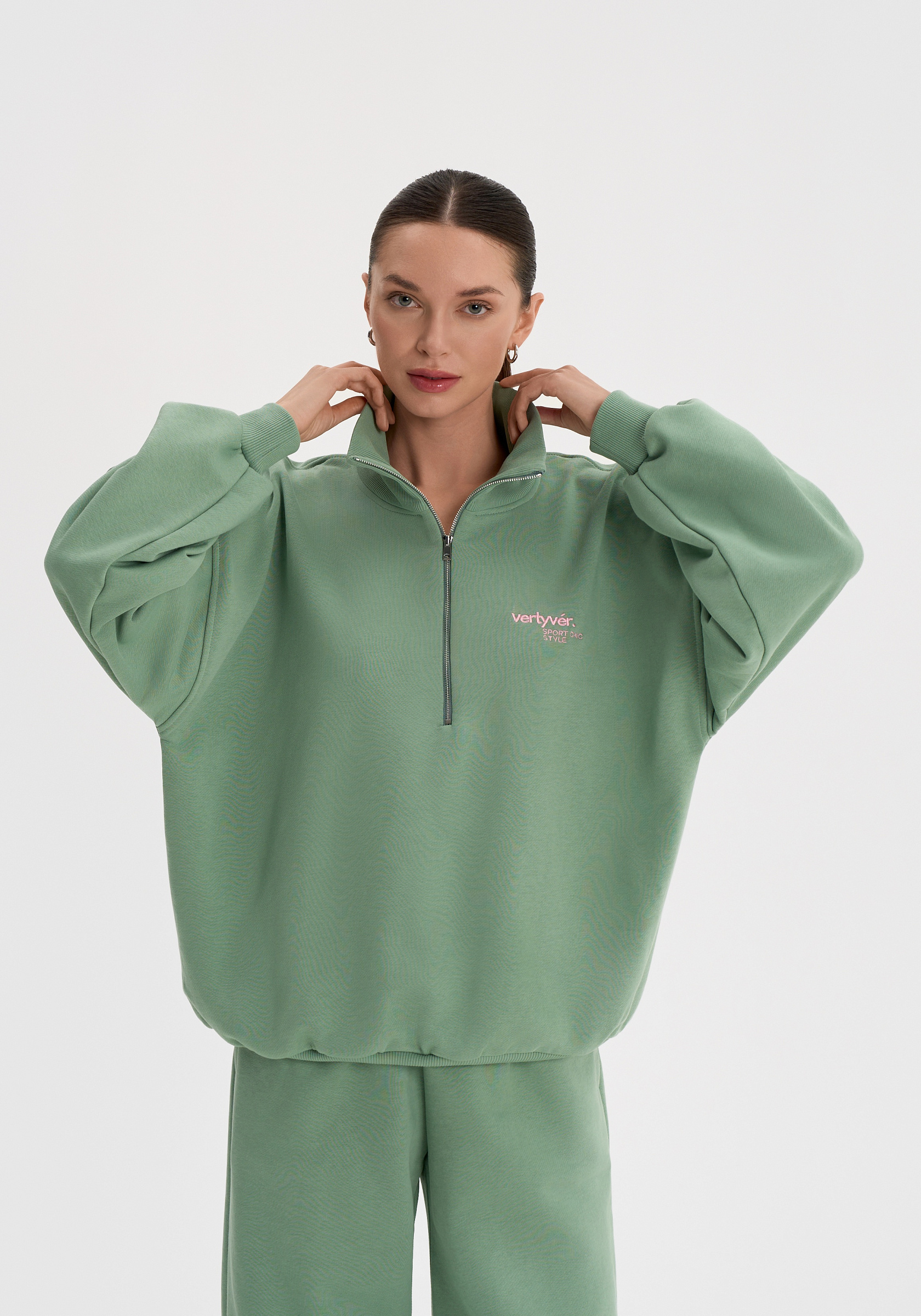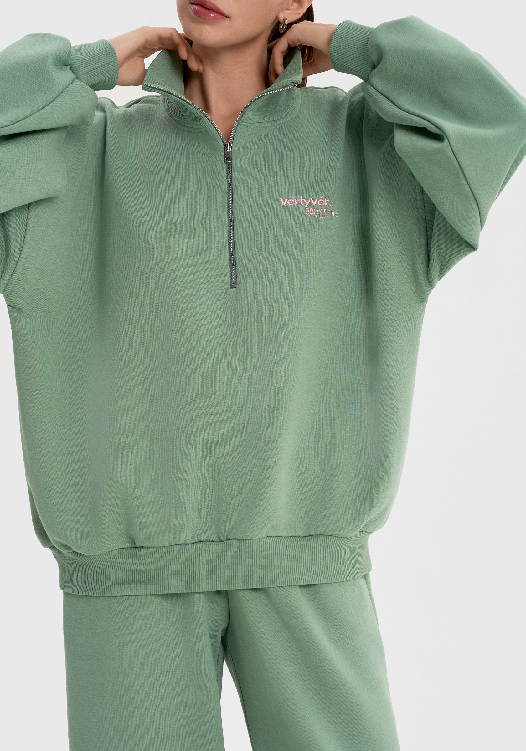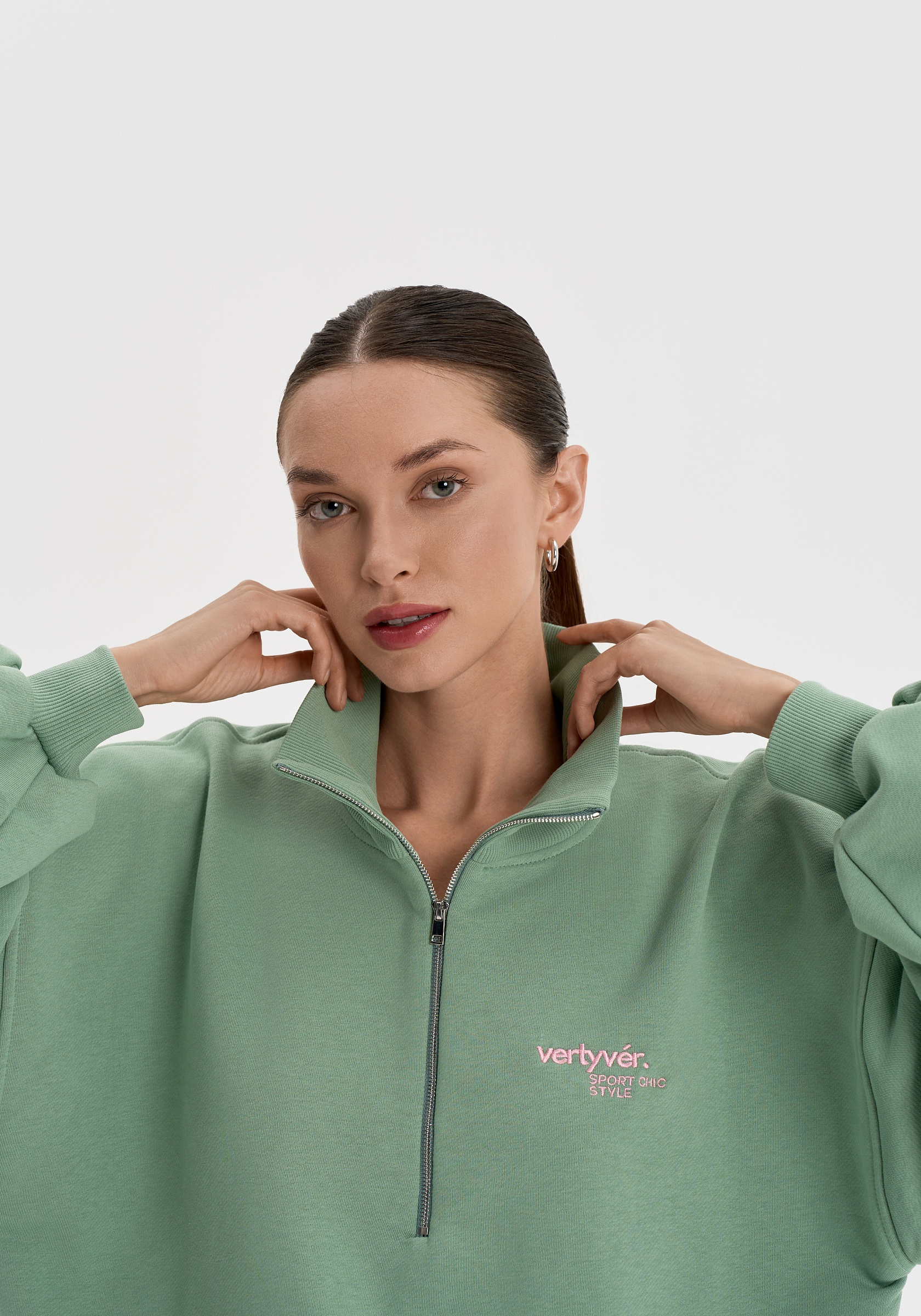 Свободный свитшот на молнии из хлопкового футера без начёса. Модель с воротником-стойкой и лаконичной вышивкой на груди сочетает комфорт и чистоту линий. Мягкая фактура и спущенная линия плеча создают расслабленный, но собранный силуэт.Параметры изделия