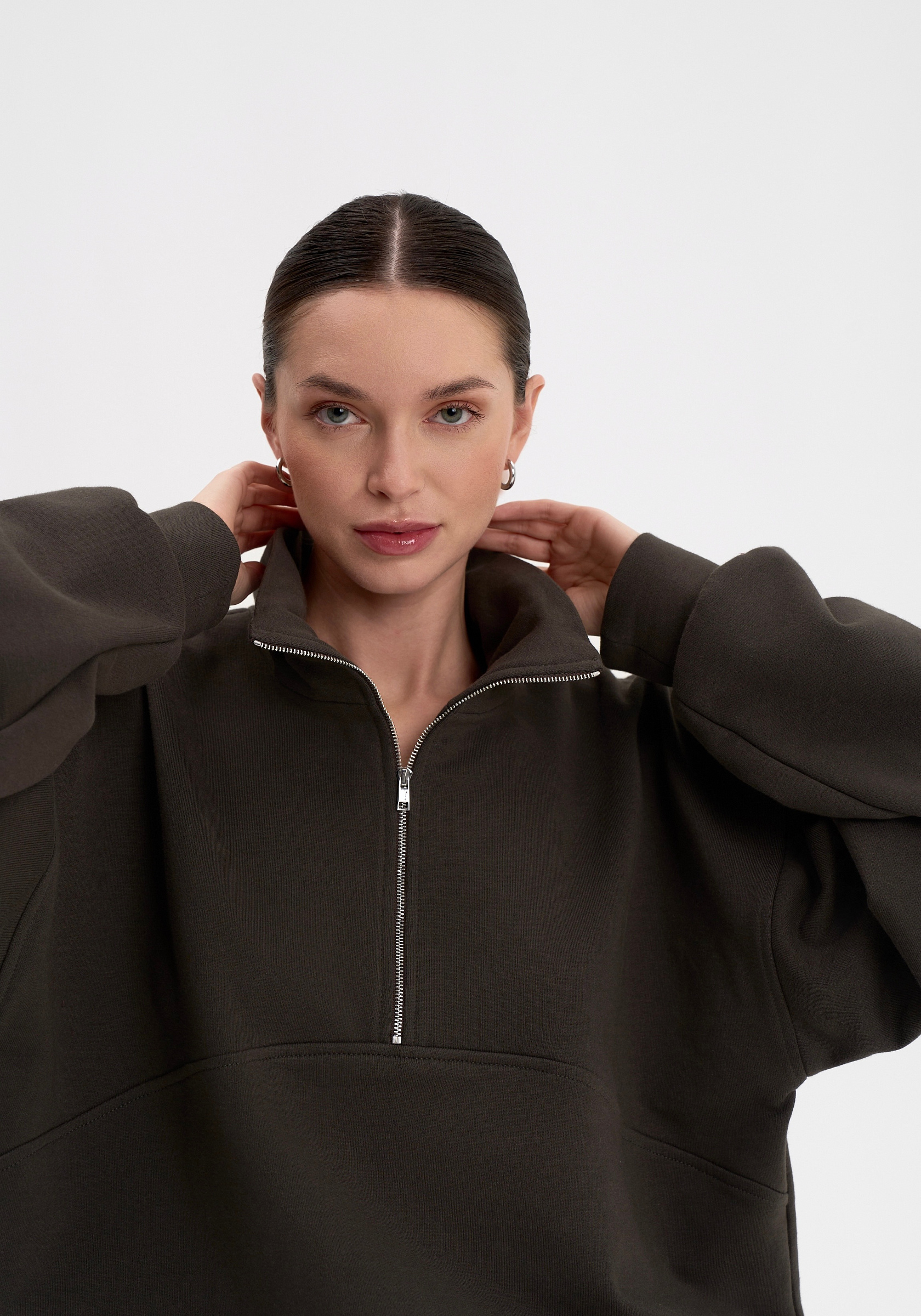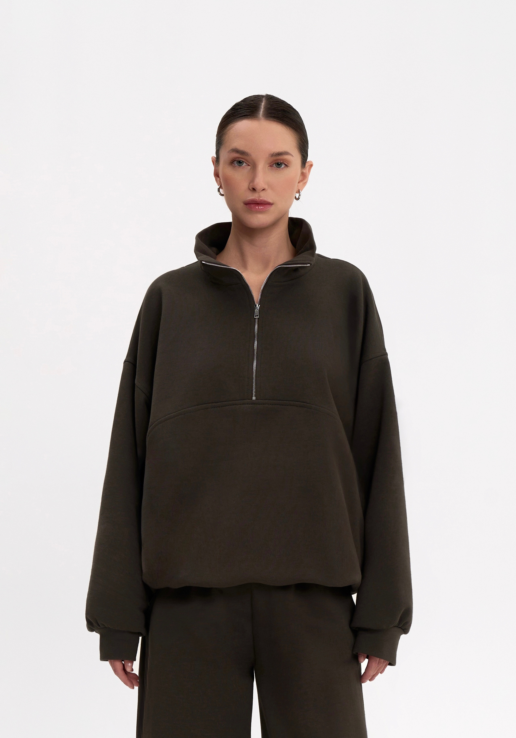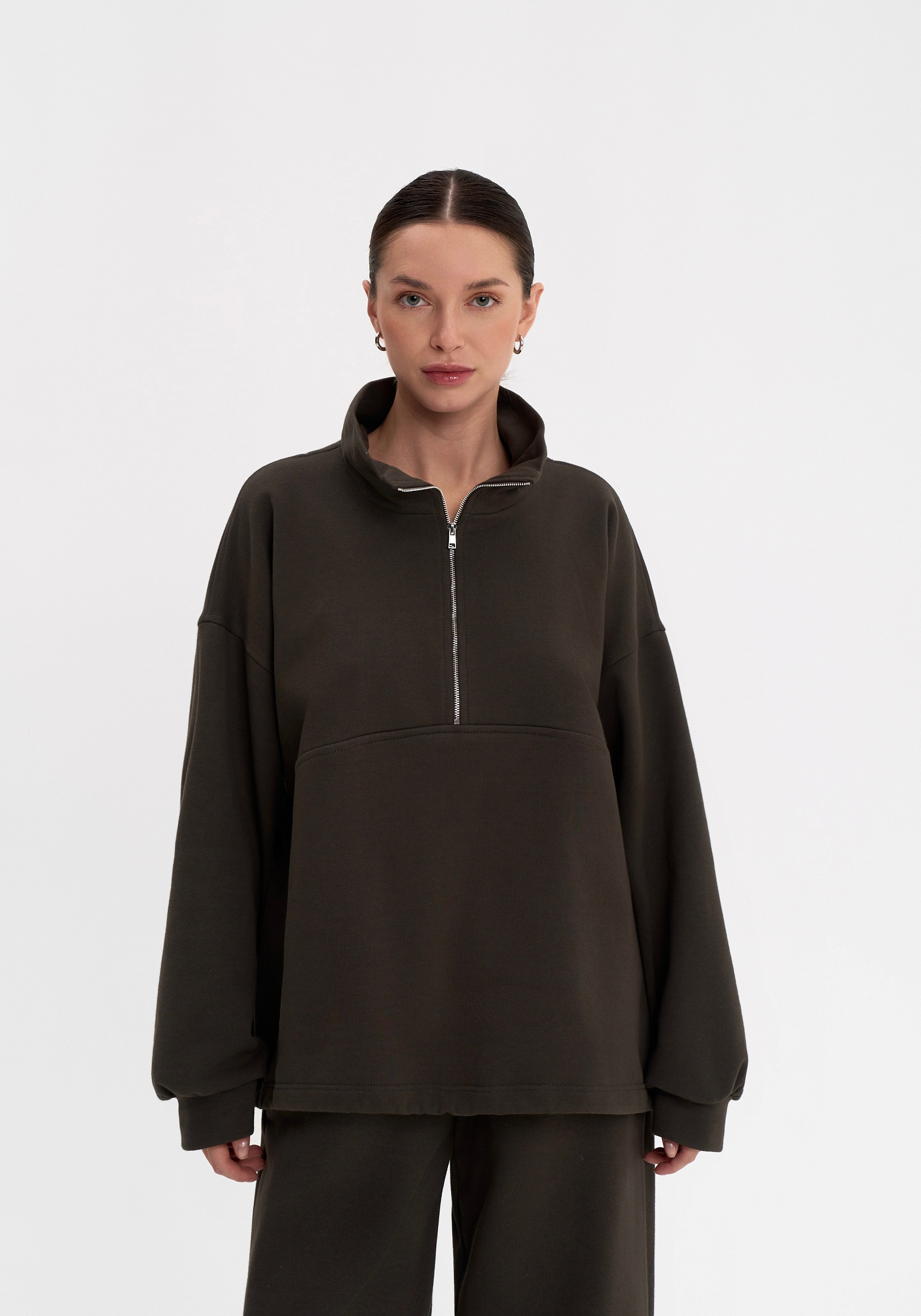 Свободный свитшот на молнии из хлопкового футера с начёсом. Мягкий, тёплый и уютный, с лаконичной отделочной строчкой на груди и вышивкой на спине. Воротник-стойка и мягкая посадка создают сбалансированный силуэт в духе повседневного минимализма.Параметры изделия