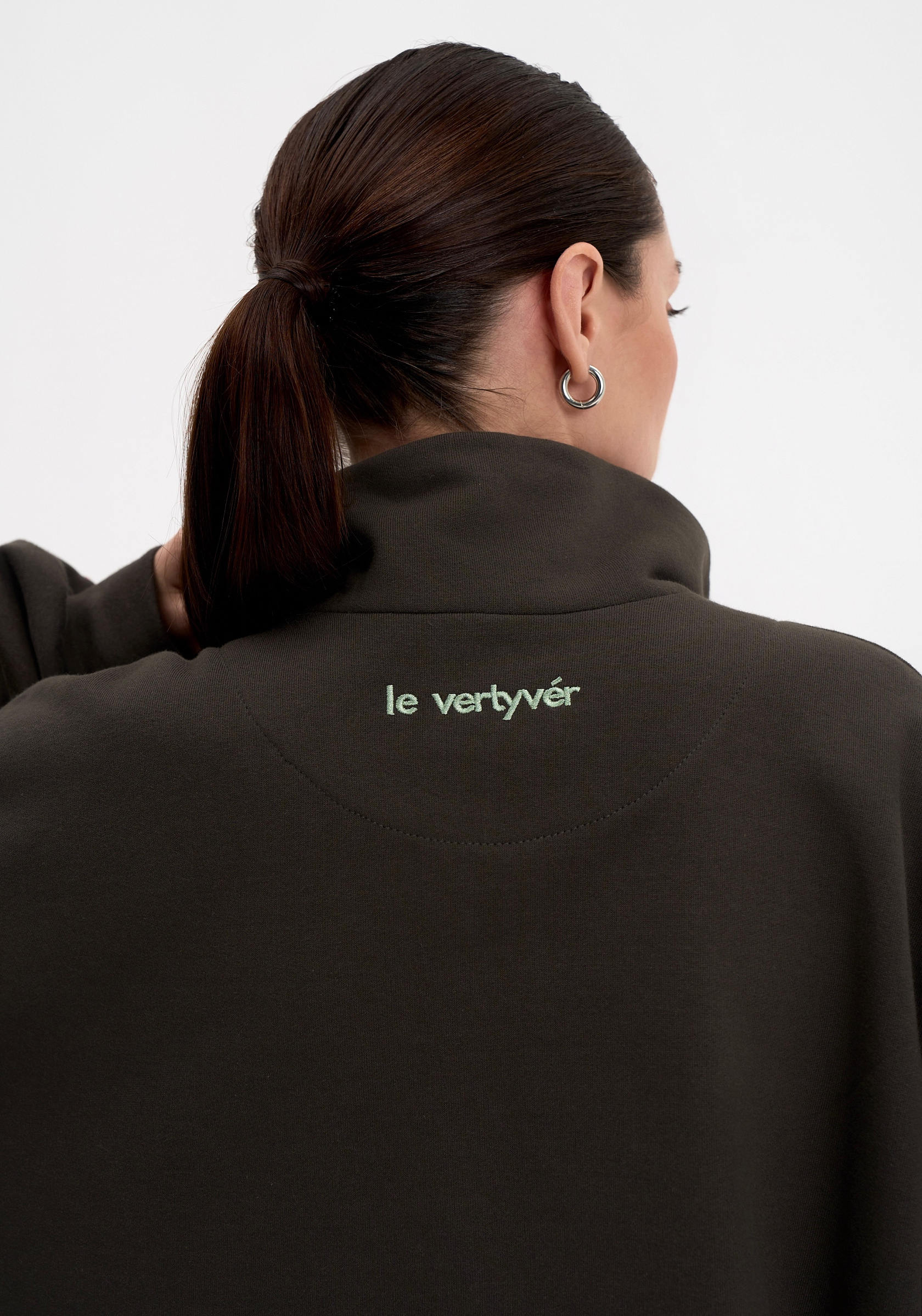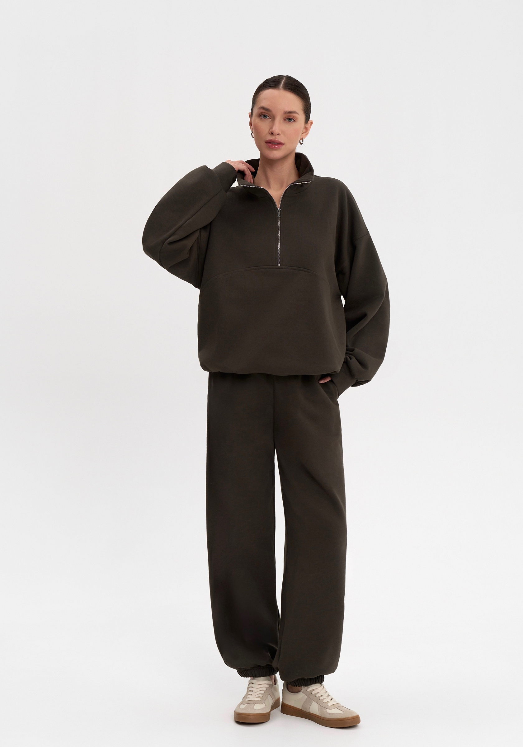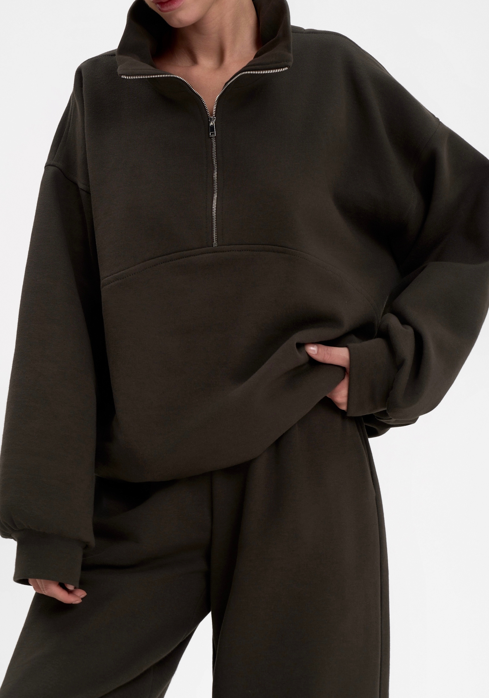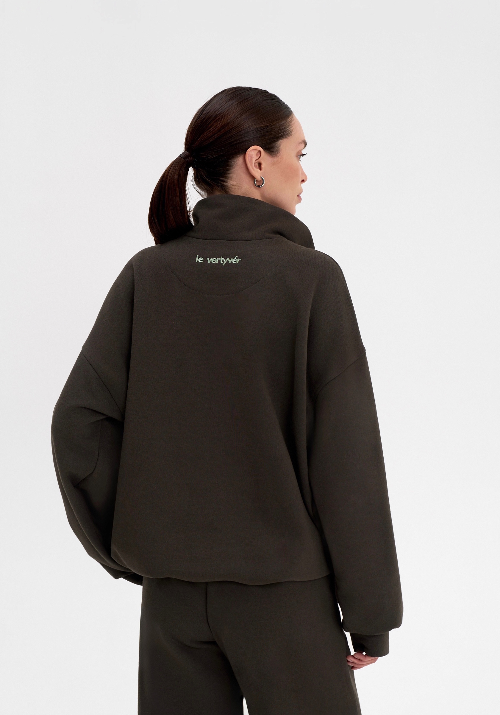 Свободный свитшот на молнии из хлопкового футера с начёсом. Мягкий, тёплый и уютный, с лаконичной отделочной строчкой на груди и вышивкой на спине. Воротник-стойка и мягкая посадка создают сбалансированный силуэт в духе повседневного минимализма.Параметры изделия