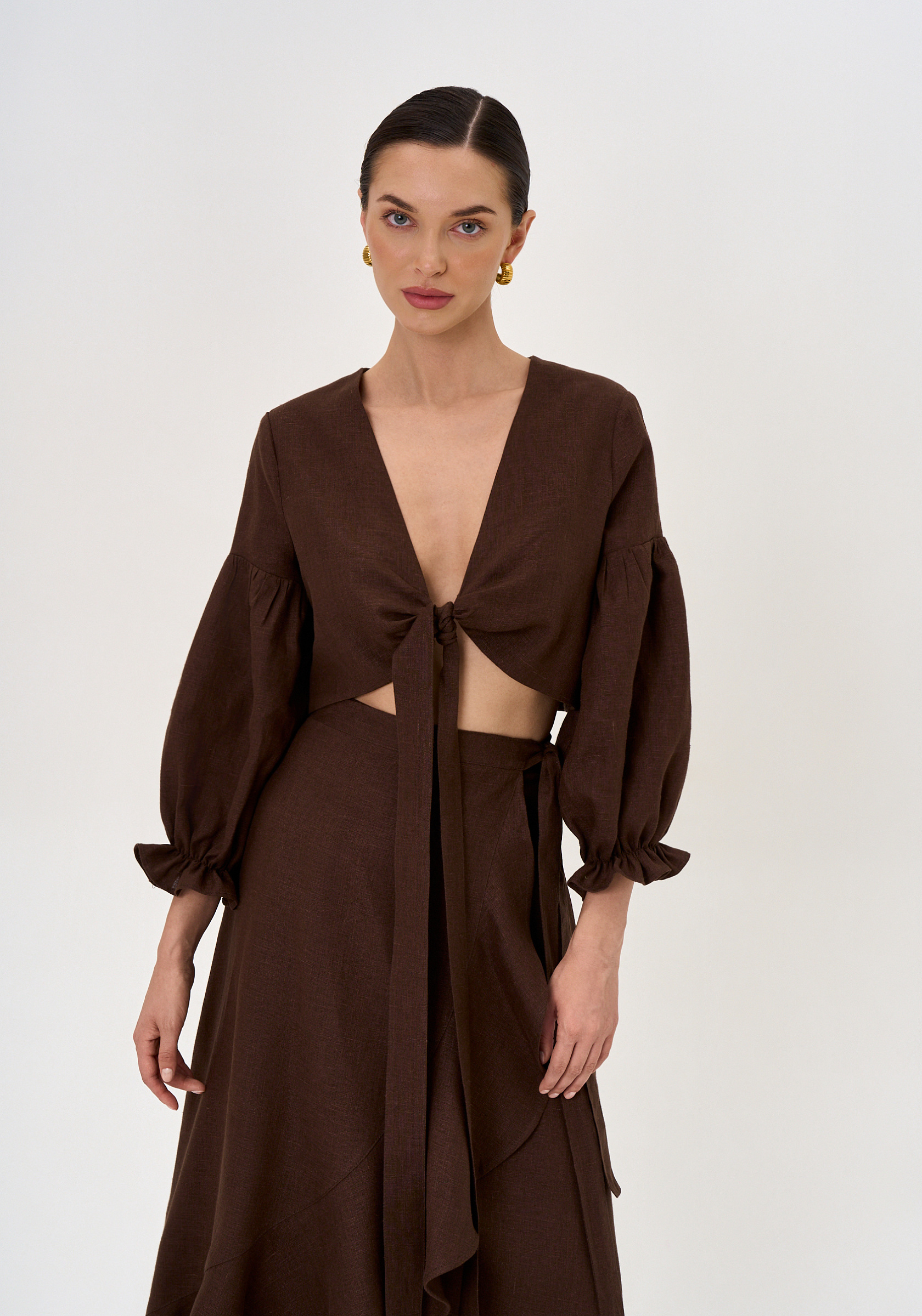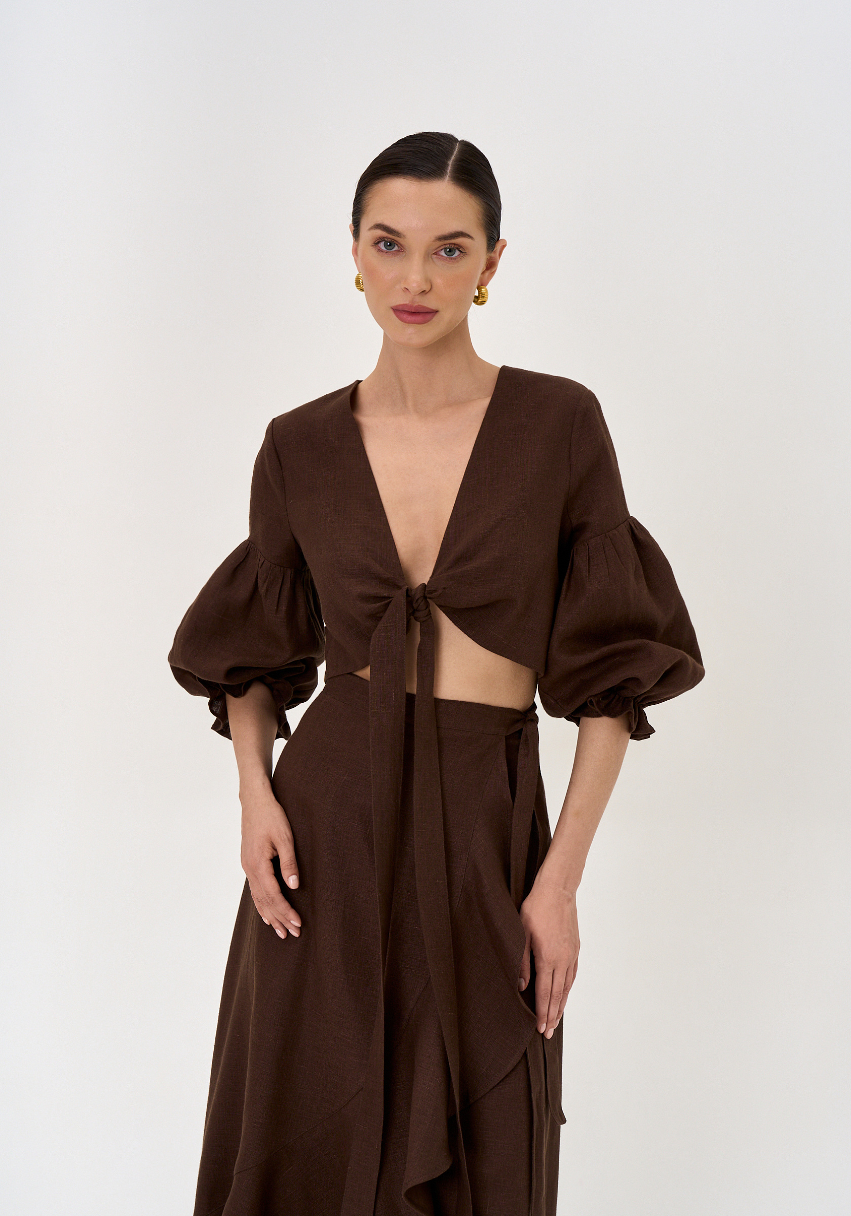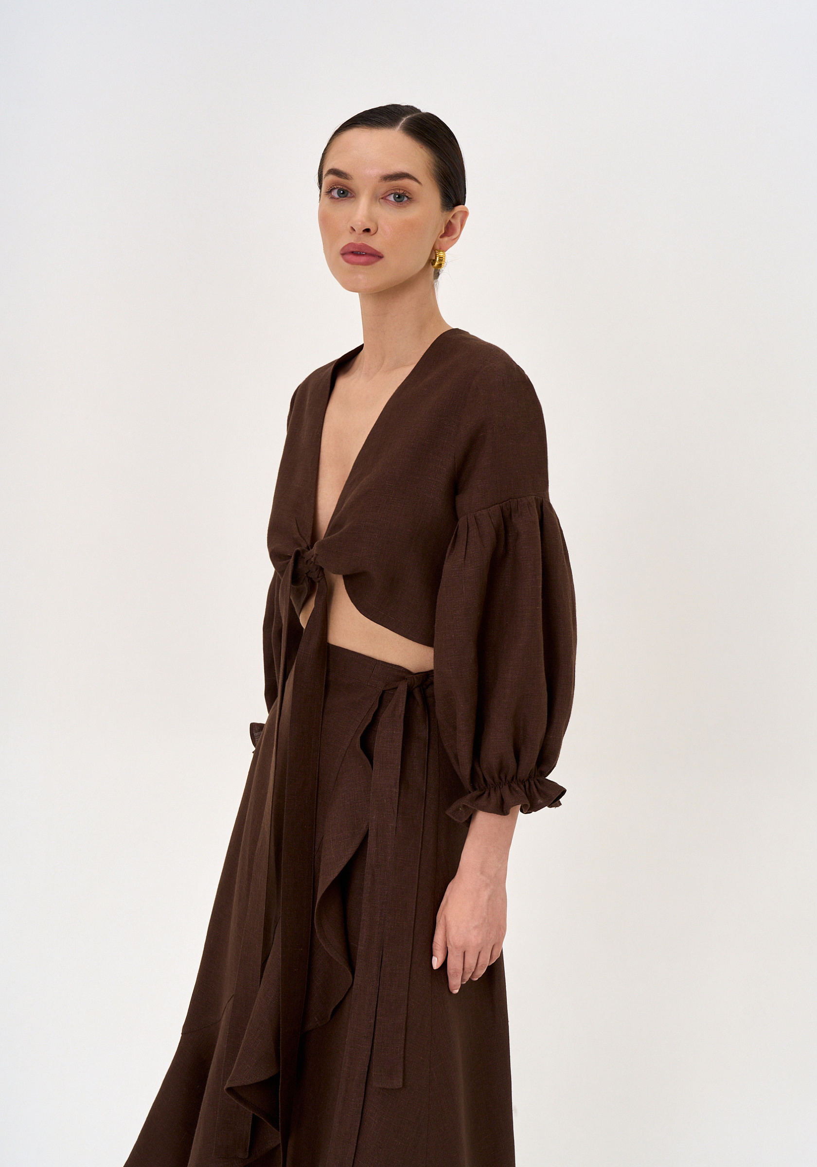 Блузка на завязке из умягченного льна, незаменима для создания нежных и женственных образов. Объёмный рукав-фонарик собран снизу резинкой, создавая рюшку. Благодаря резинке вы можете изменить длину рукава и форму, убрав рюши внутрь. Полочки и спинка выполнены из двойной ткани, что исключает просвет и придает изделию форму. Сочетайте блузку с льняной юбкой из нашей коллекции или любимыми джинсами, брюками и юбками из вашего гардероба. Параметры изделия