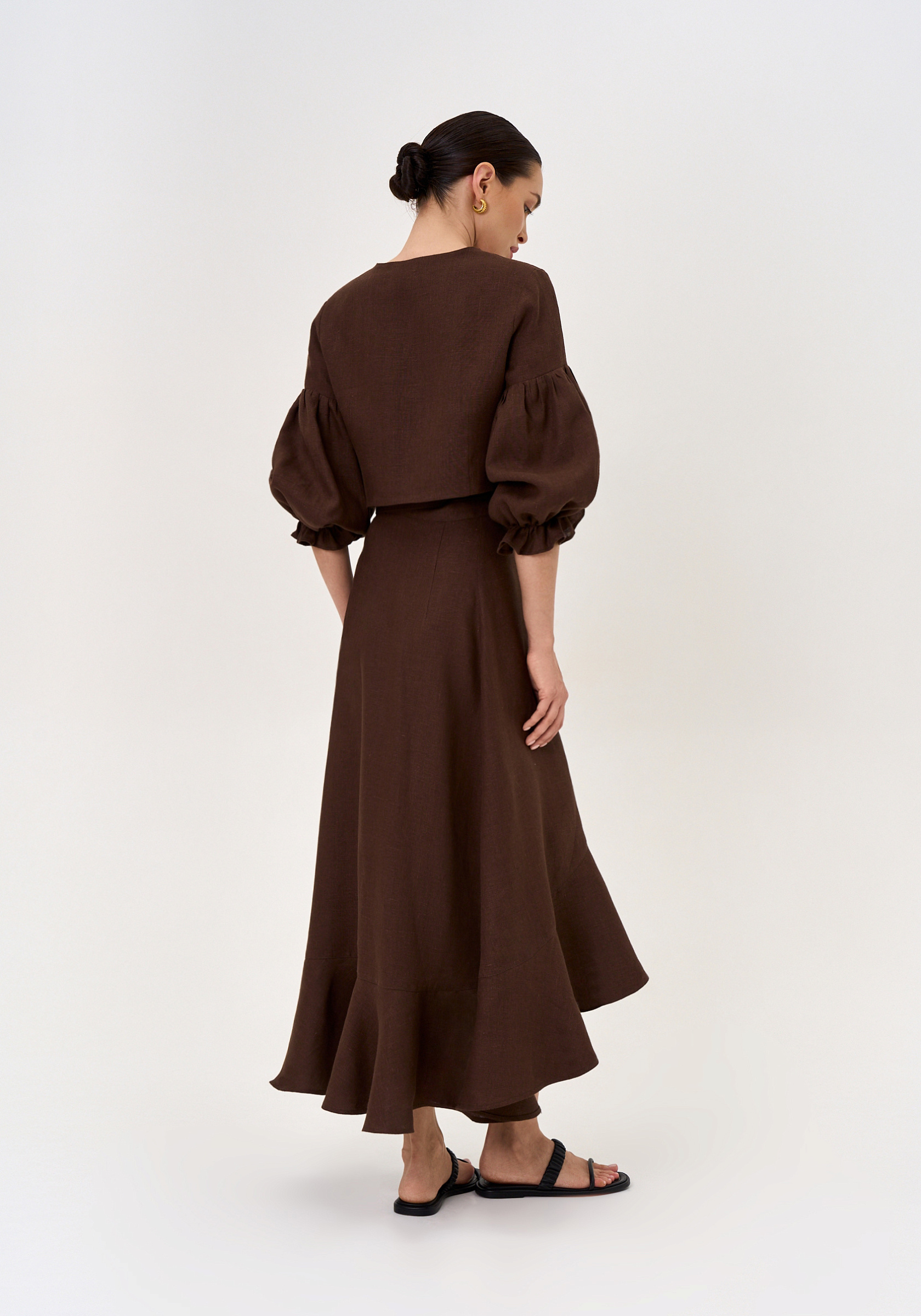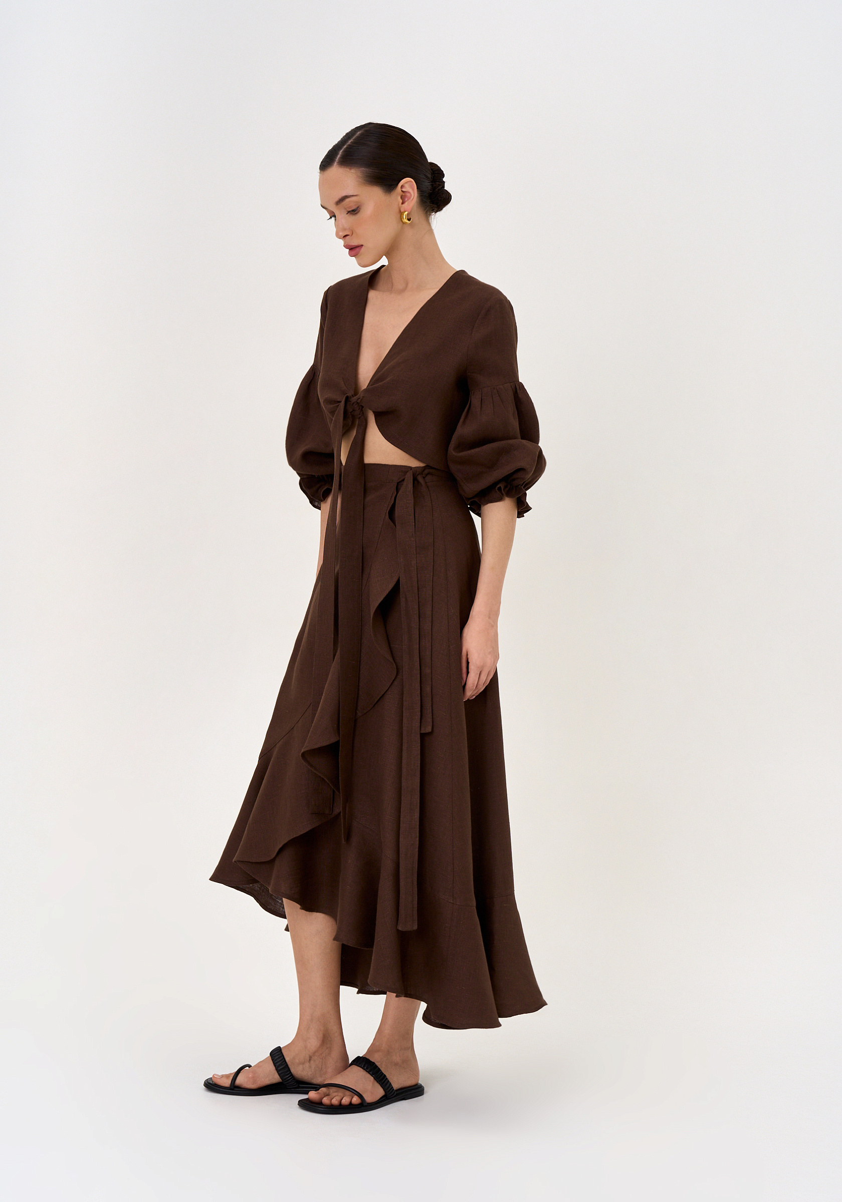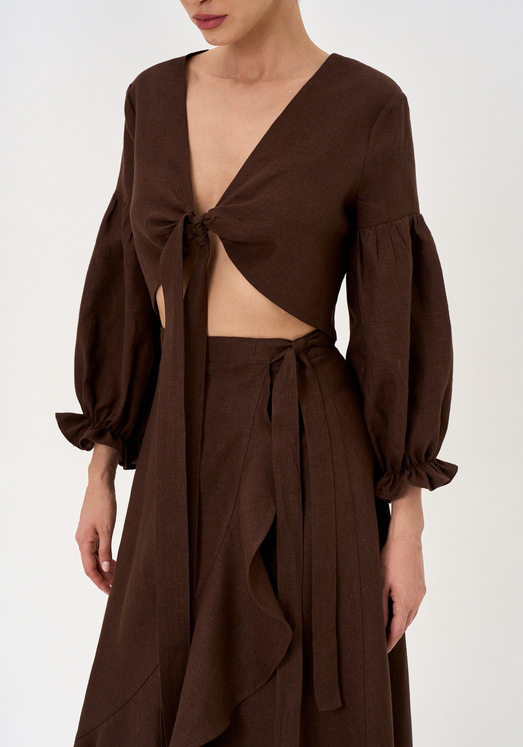 Блузка на завязке из умягченного льна, незаменима для создания нежных и женственных образов. Объёмный рукав-фонарик собран снизу резинкой, создавая рюшку. Благодаря резинке вы можете изменить длину рукава и форму, убрав рюши внутрь. Полочки и спинка выполнены из двойной ткани, что исключает просвет и придает изделию форму. Сочетайте блузку с льняной юбкой из нашей коллекции или любимыми джинсами, брюками и юбками из вашего гардероба. Параметры изделия