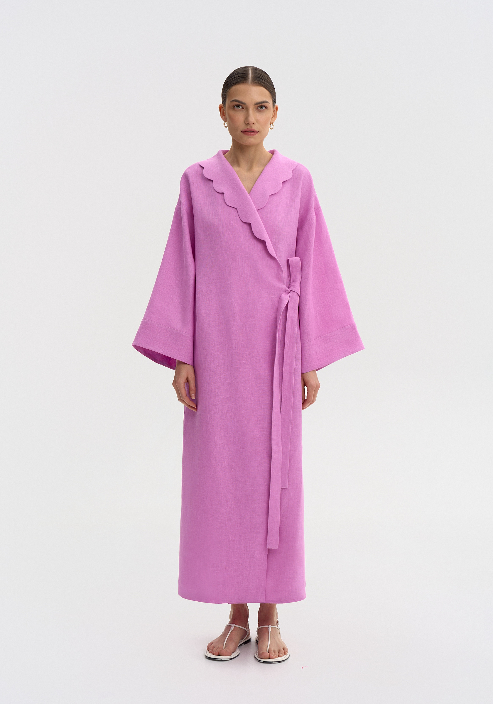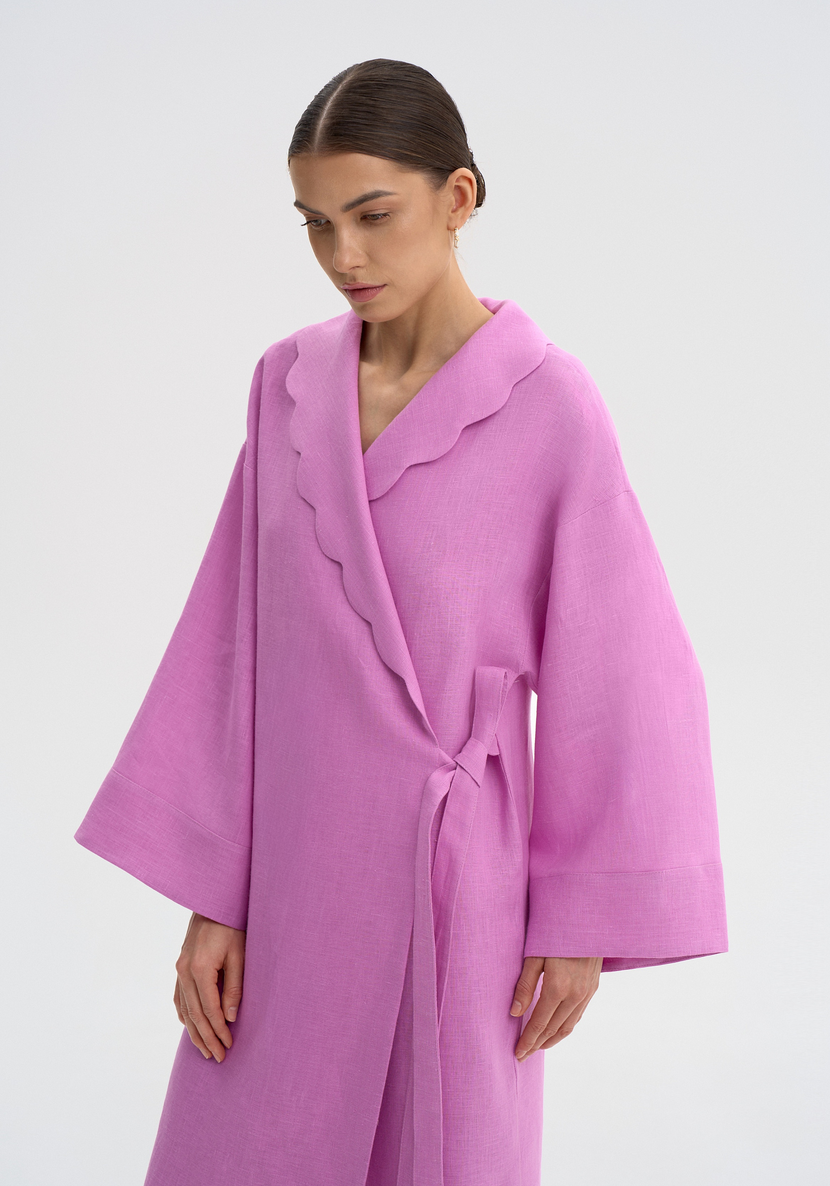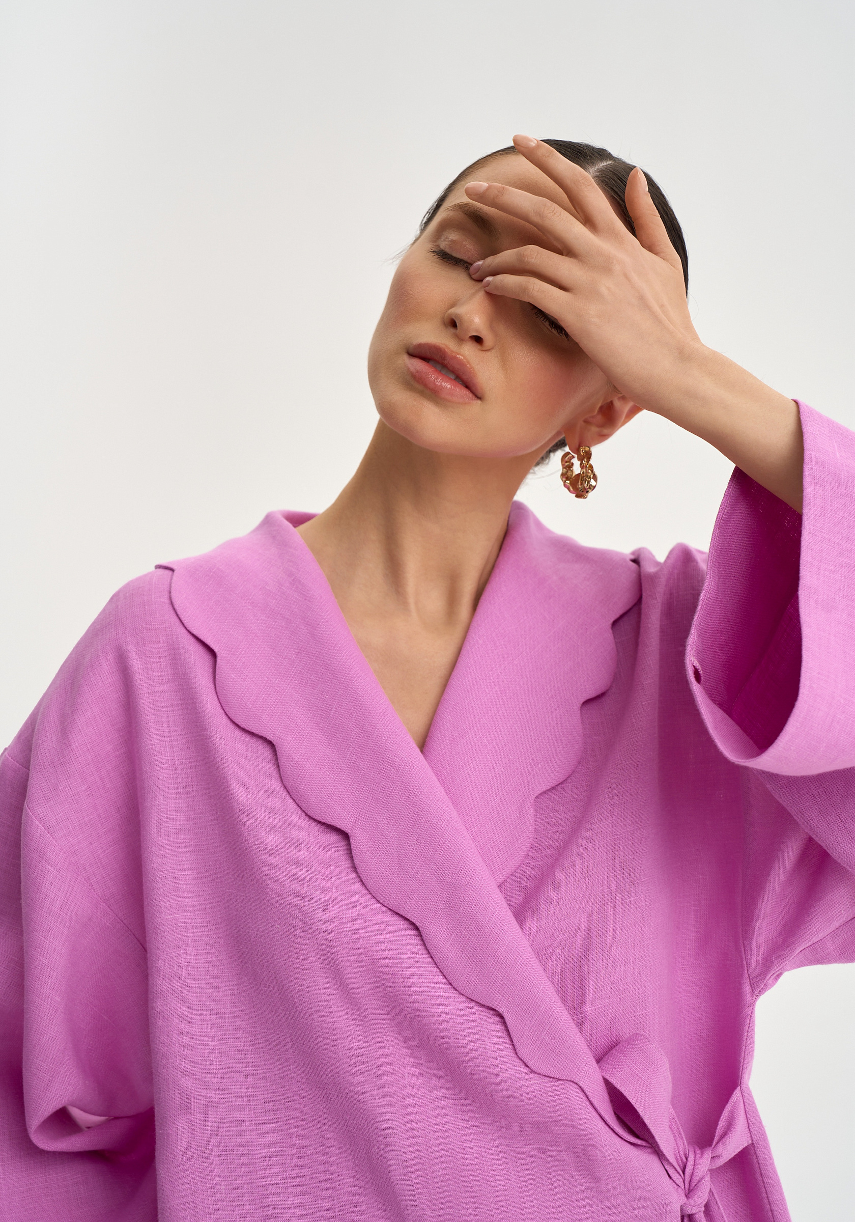Мягкий умягчённый лён с естественной фактурой — дышащий и комфортный в тёплый сезон. Свободный крой со спущенной линией плеча и широкими рукавами создаёт лёгкий, пластичный силуэт