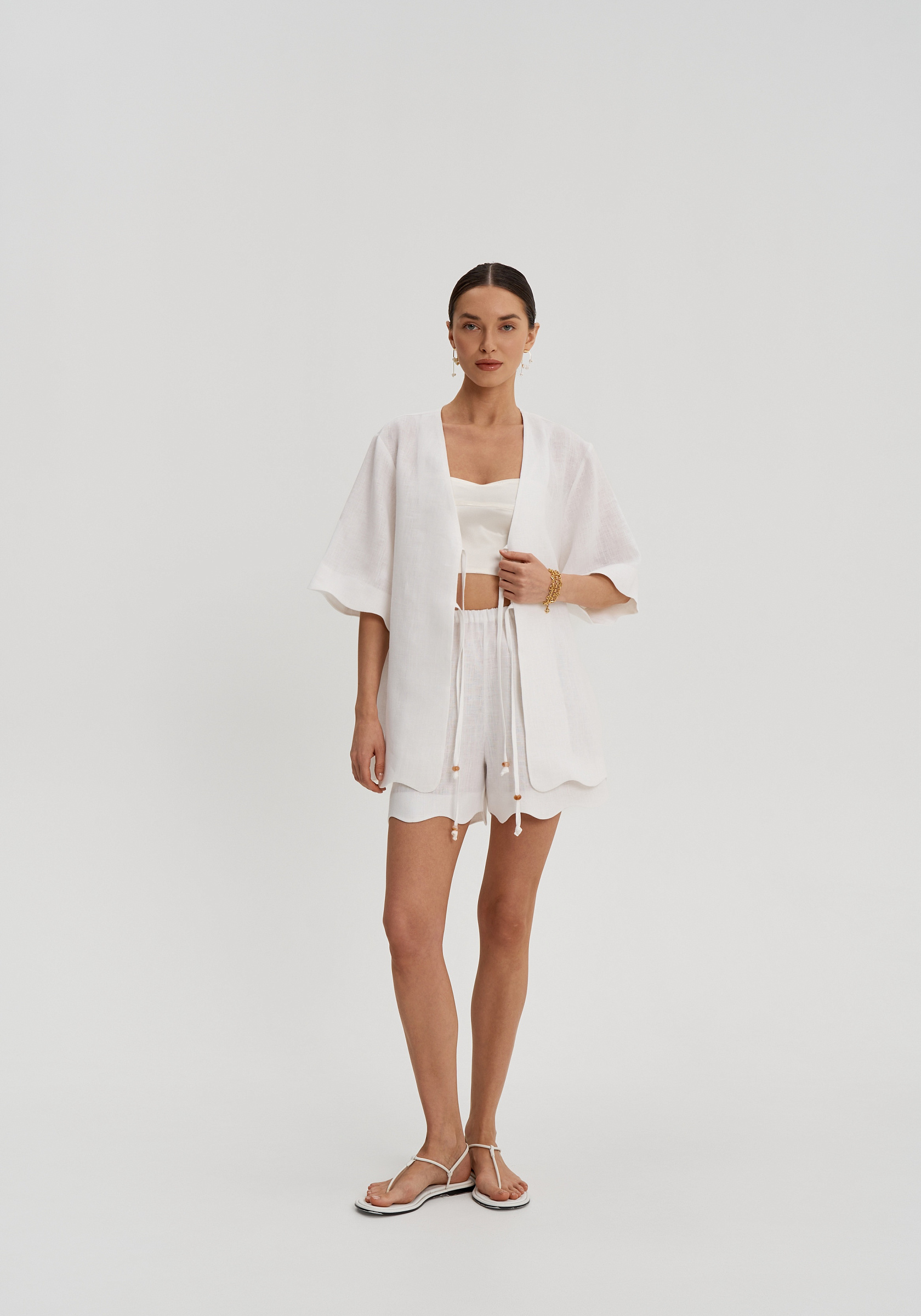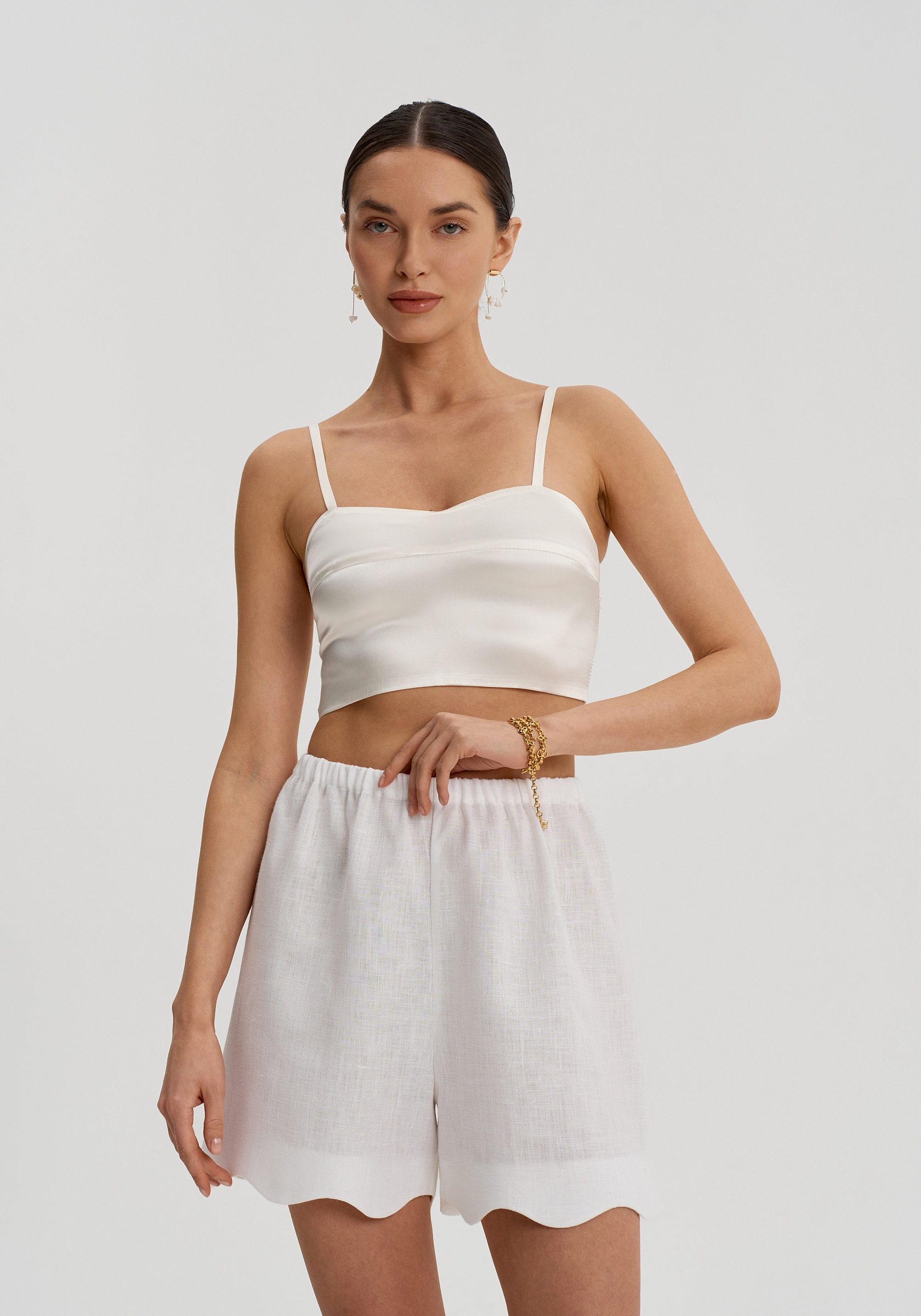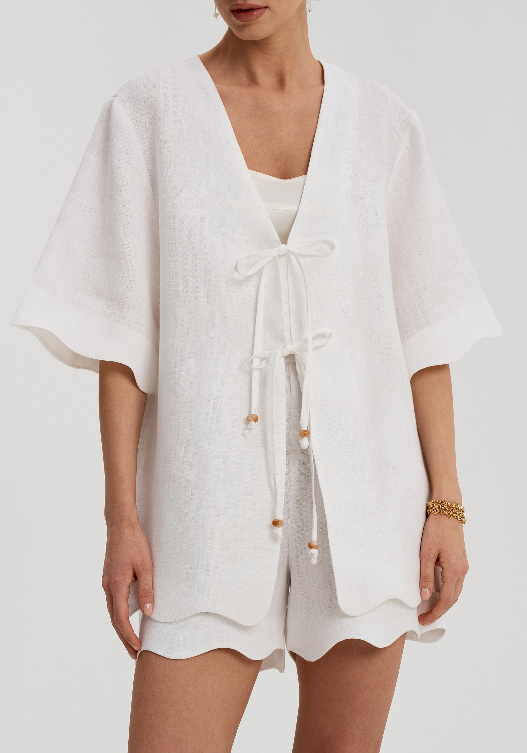Декоративная волна по низу добавляет модели деликатный акцент и делает силуэт более мягким. Шорты легко сочетаются с рубашками, топами и жакетами изо льна, собираясь в цельный и спокойный комплект.