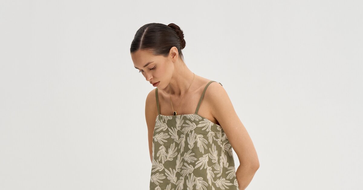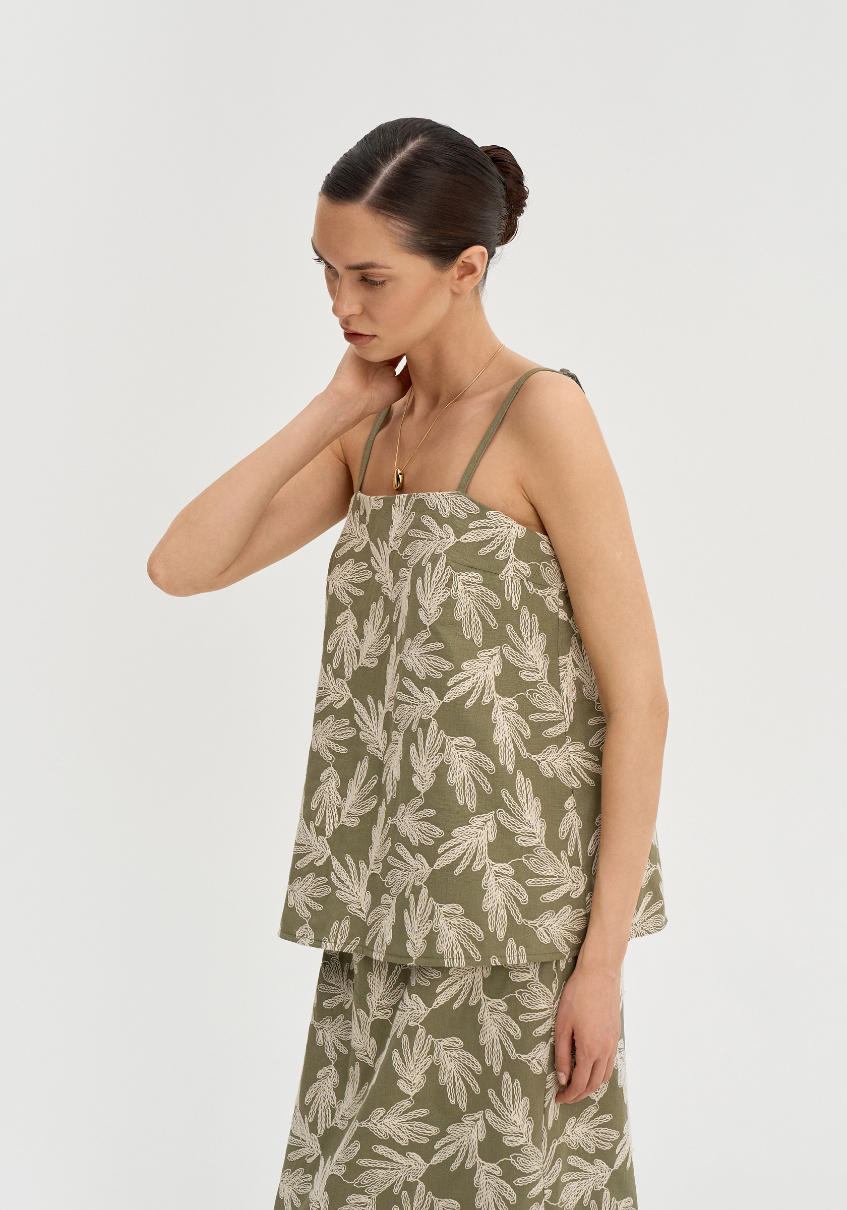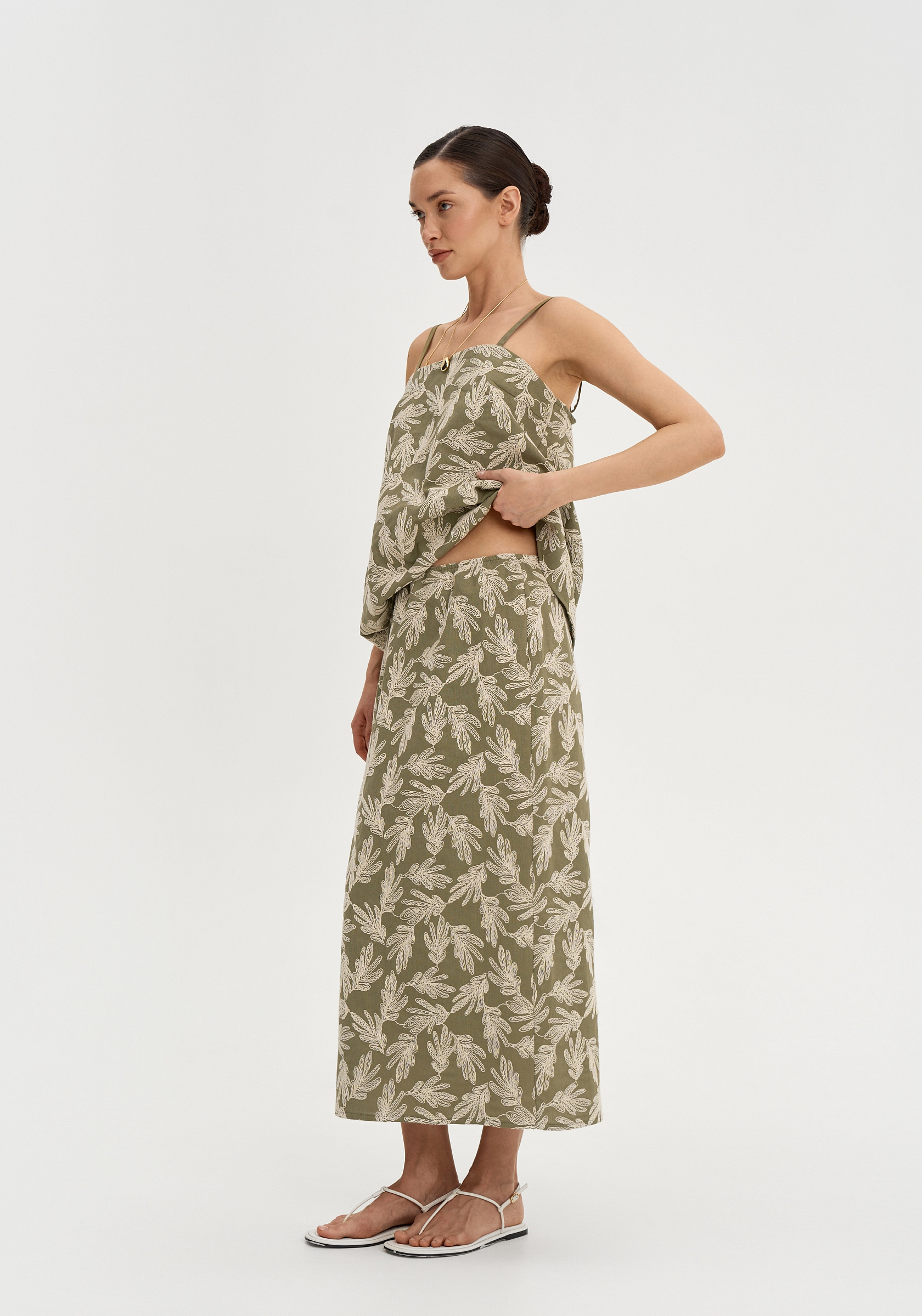 Сзади — разрез для свободы движения. Натуральный лён с фактурной вышивкой делает модель лёгкой и выразительной.