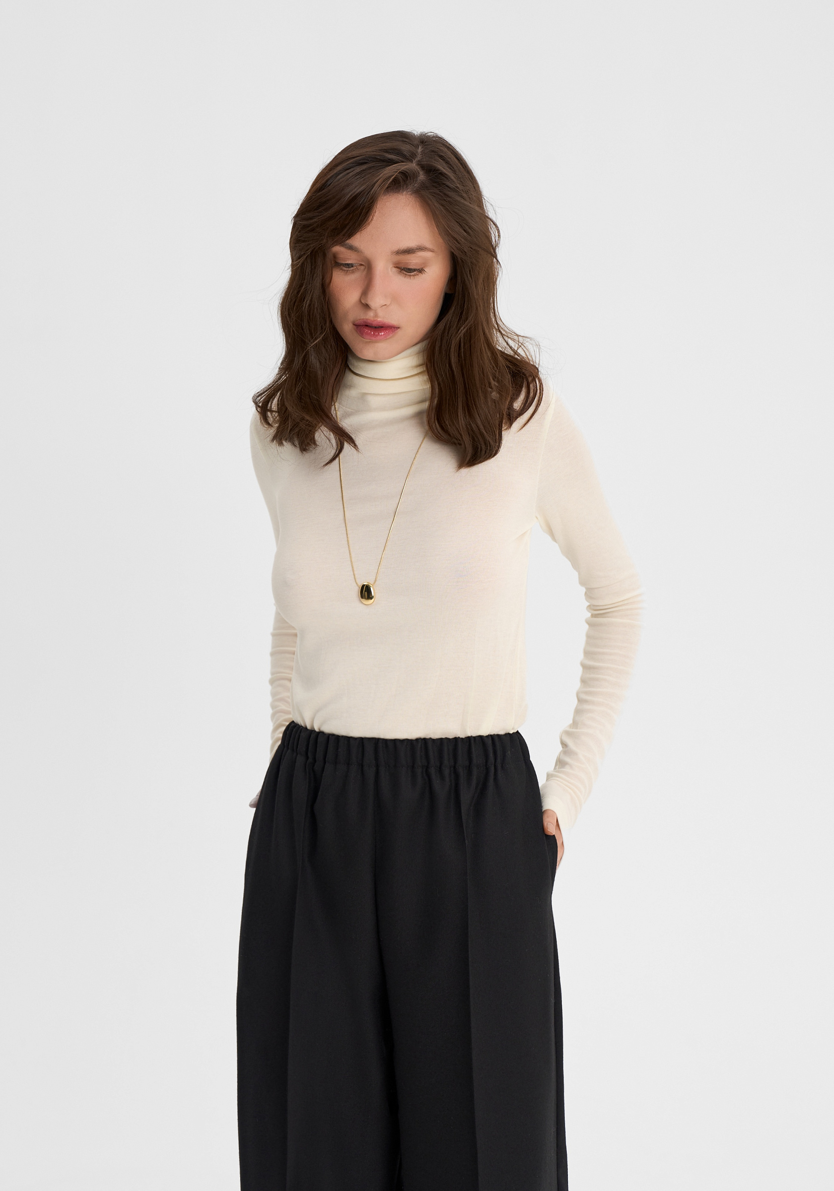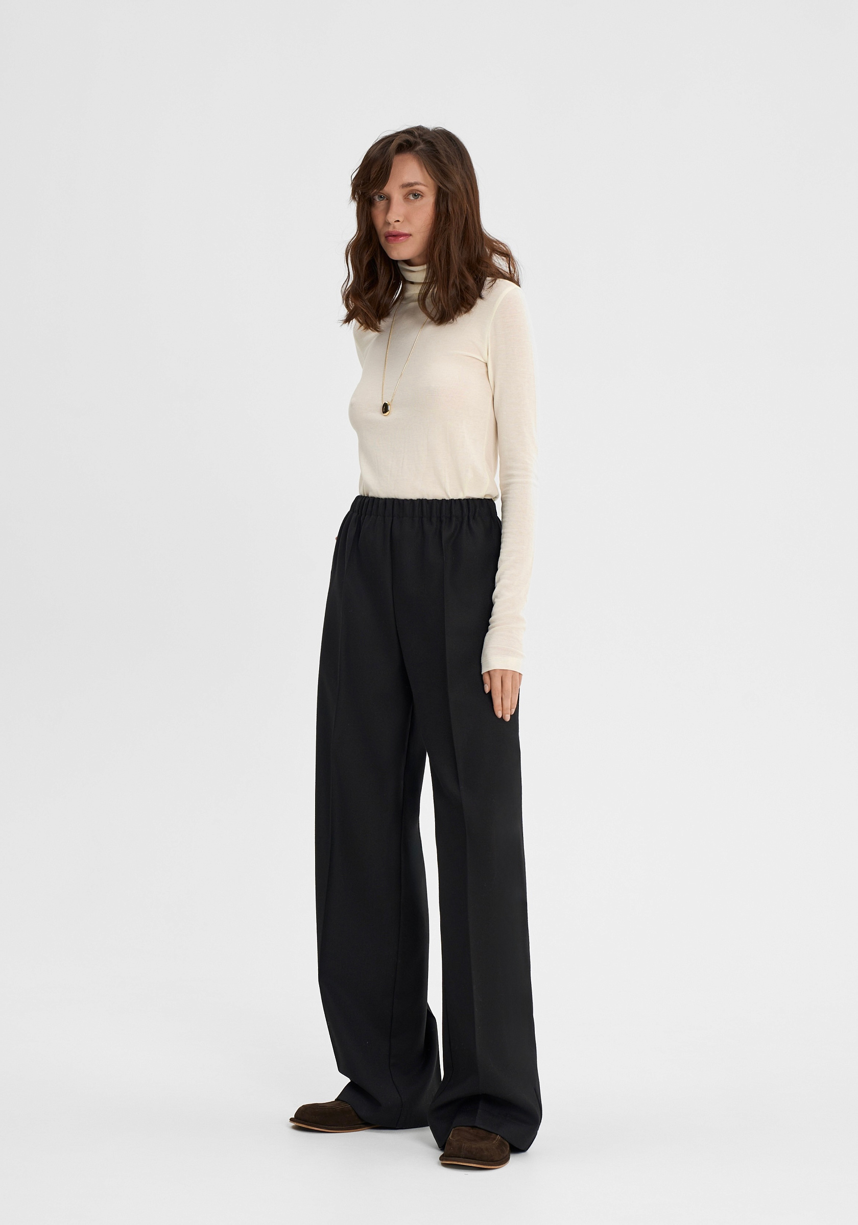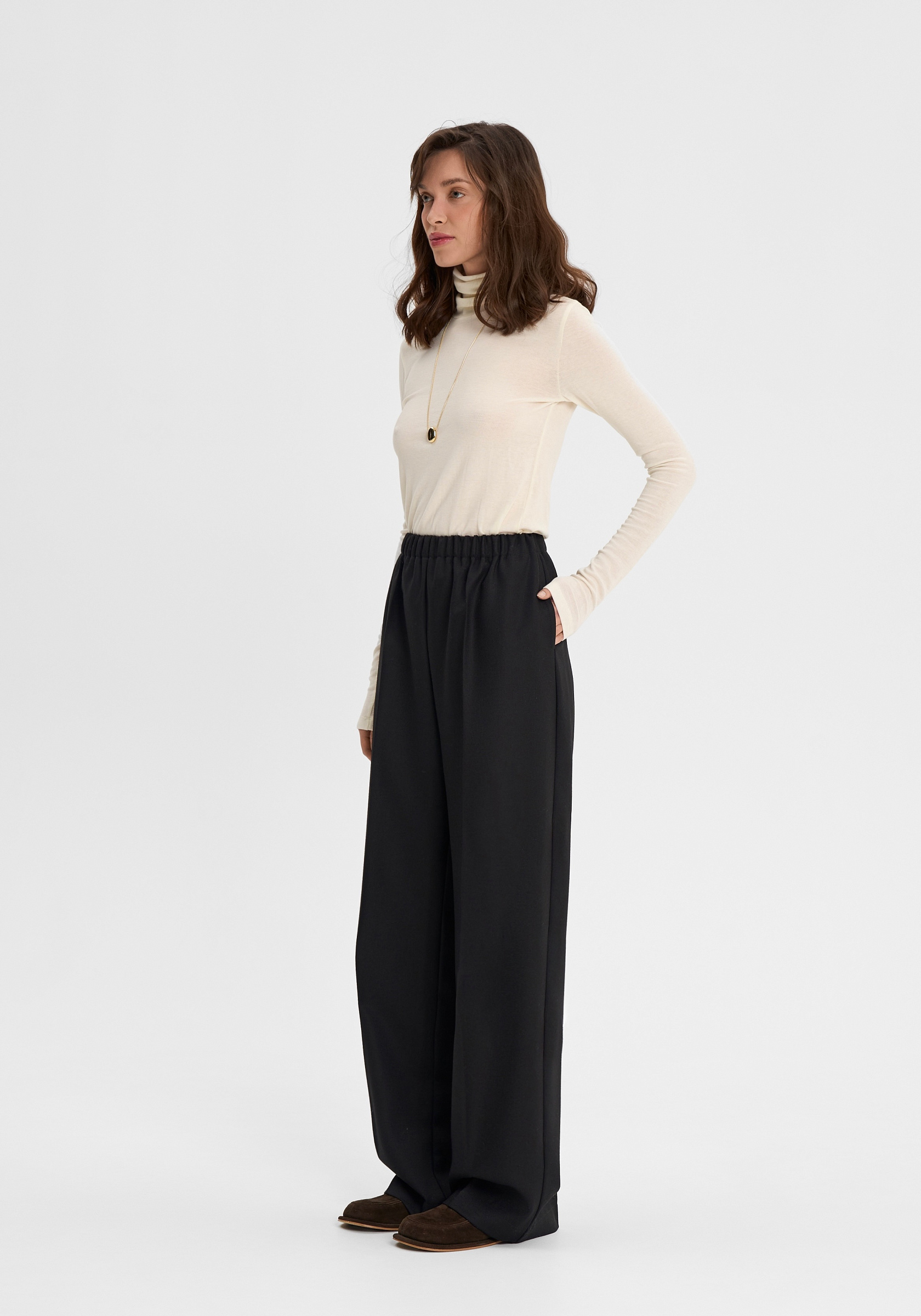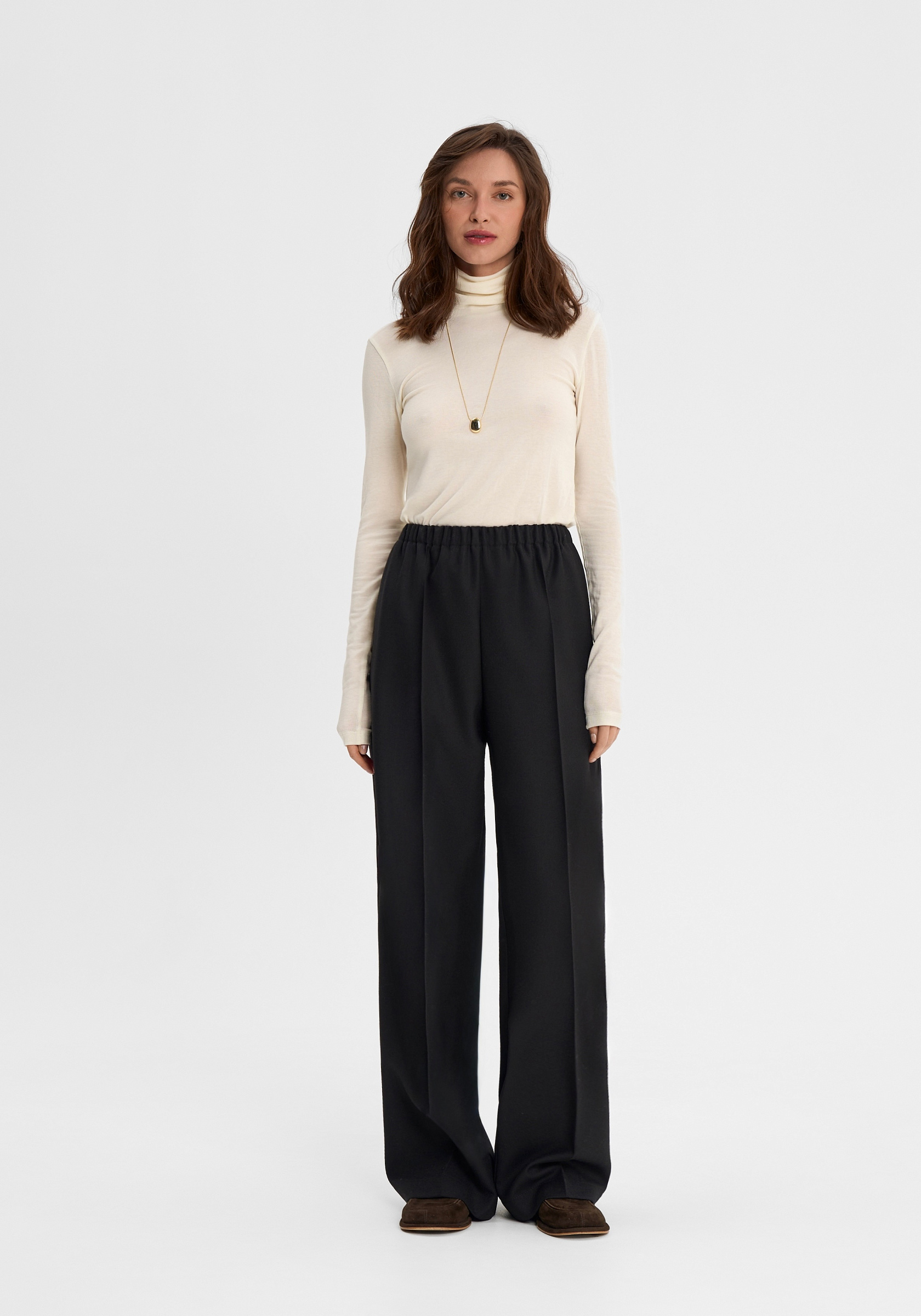Брюки из 100% шерсти со свободным силуэтом и поясом на резинке. Плавная линия и лёгкая драпировка подчёркивают естественную текучесть ткани.Шерсть средней плотности держит форму, оставаясь при этом мягкой и комфортной. Универсальная модель, которая одинаково хорошо смотрится в расслабленных образах и в сочетании с жакетом или рубашкой.