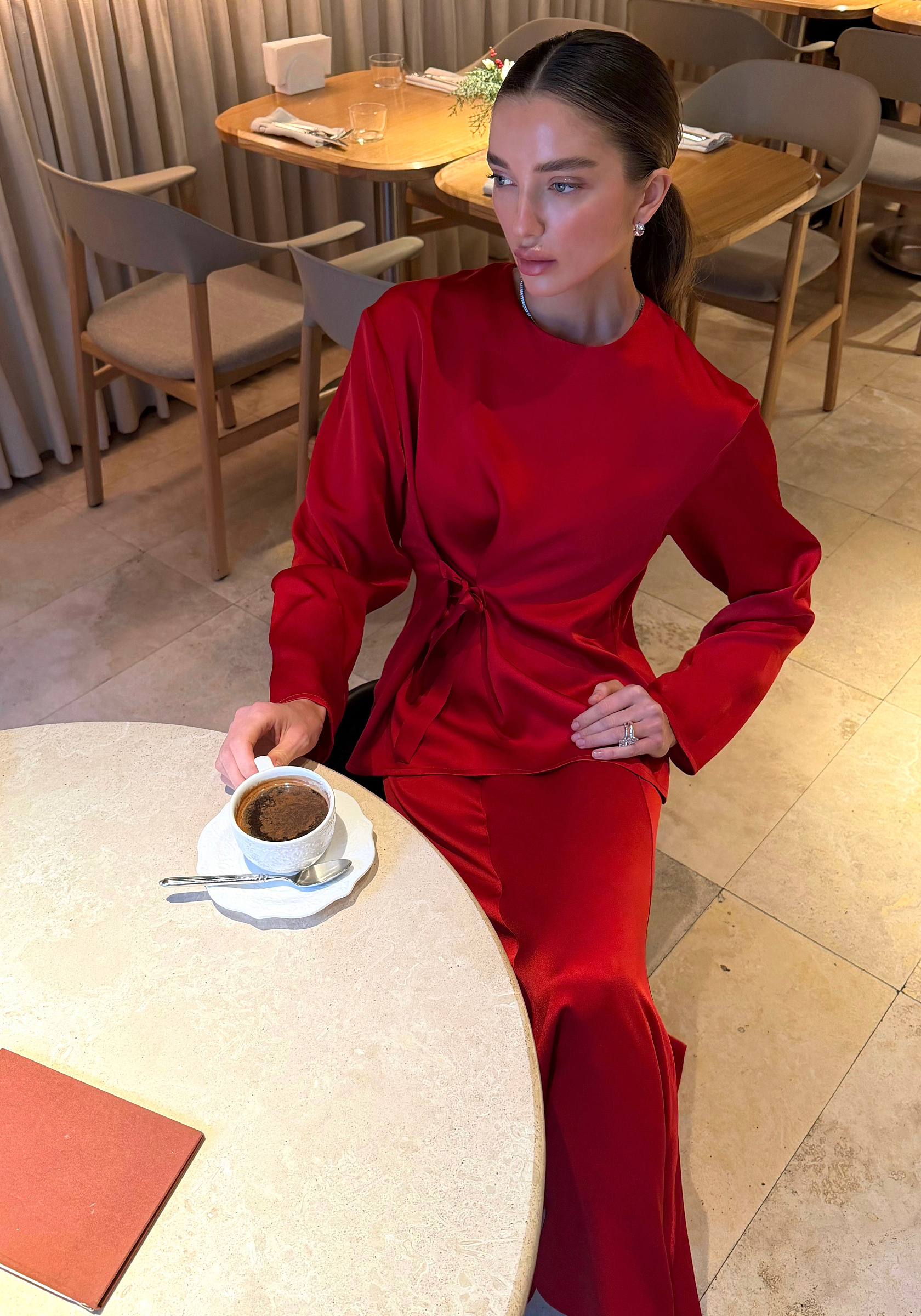 Блуза из 100% итальянской вискозы — воплощение сдержанной пластики. Мягкая линия плеча и пояс, который можно завязать свободно или подчеркнуть талию, создают естественный силуэт без усилий. Фактура ткани матовая и живая, с лёгким природным блеском, который раскрывается в движении.Эта вещь универсальна: она может звучать строго в сочетании с юбкой или расслабленно — с широкими брюками. Натуральная шерсть дарит комфорт и тепло, сохраняя ощущение лёгкости.