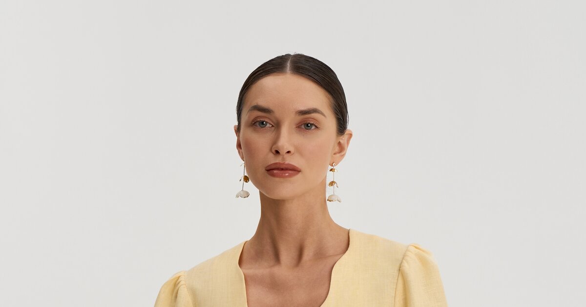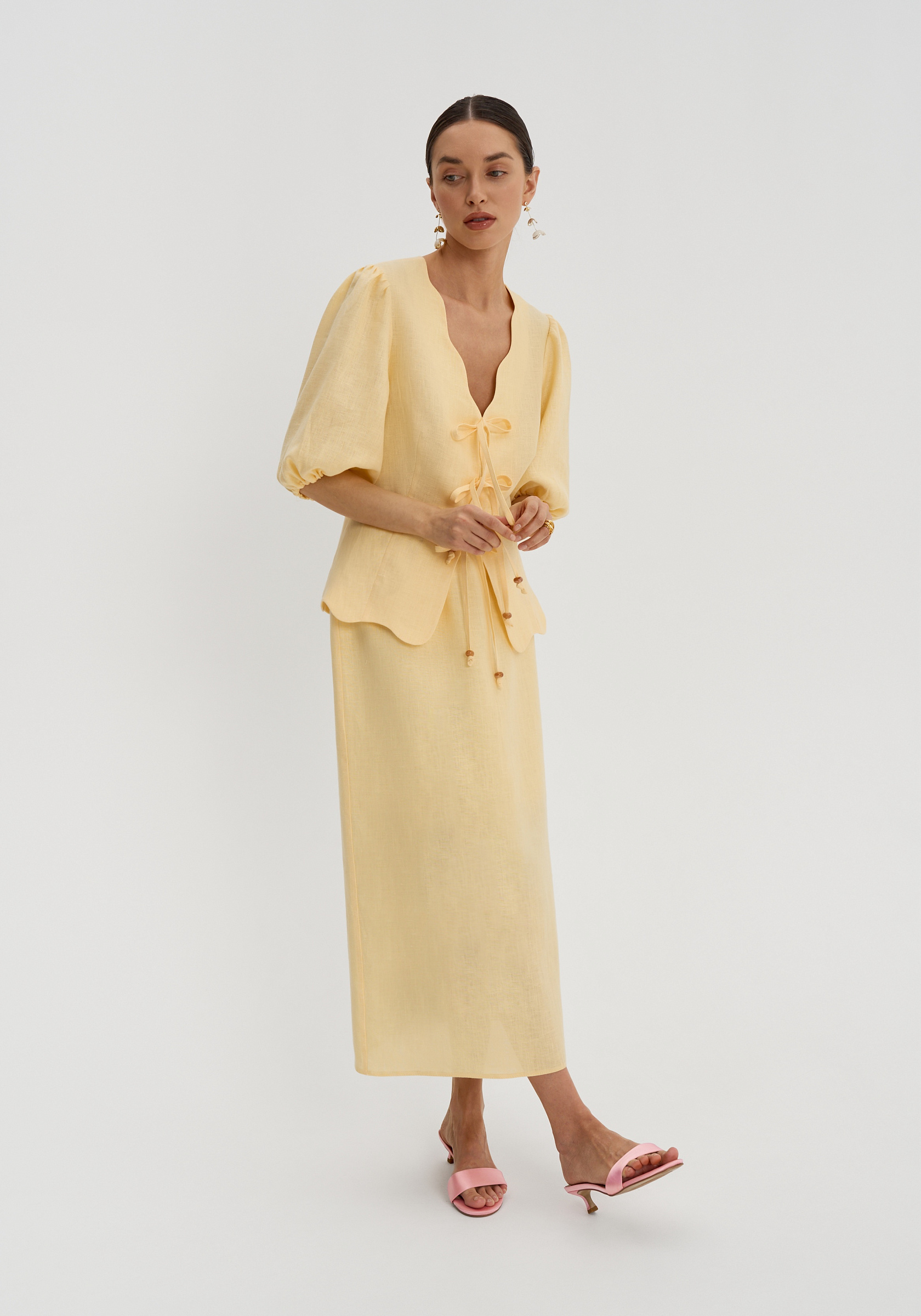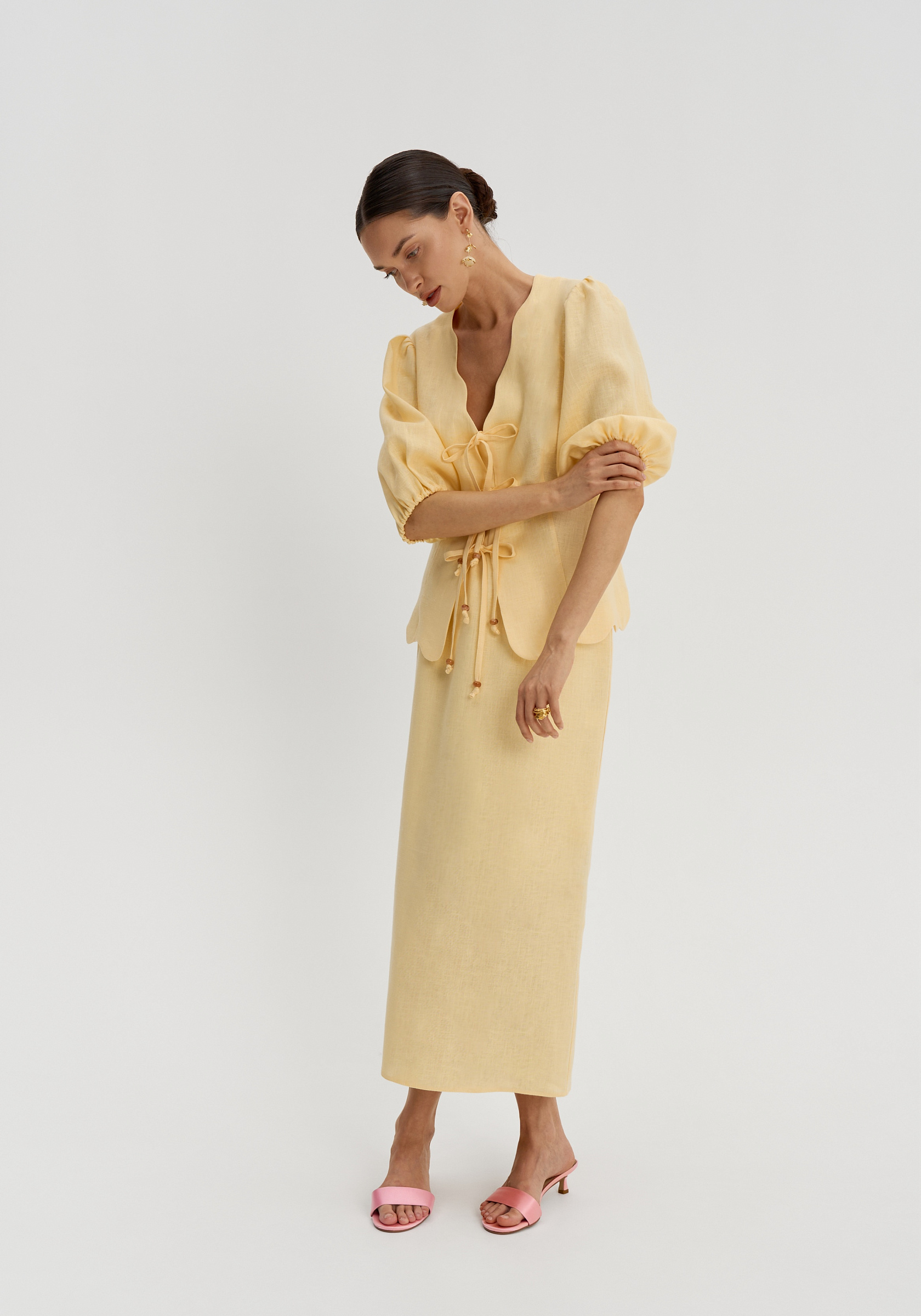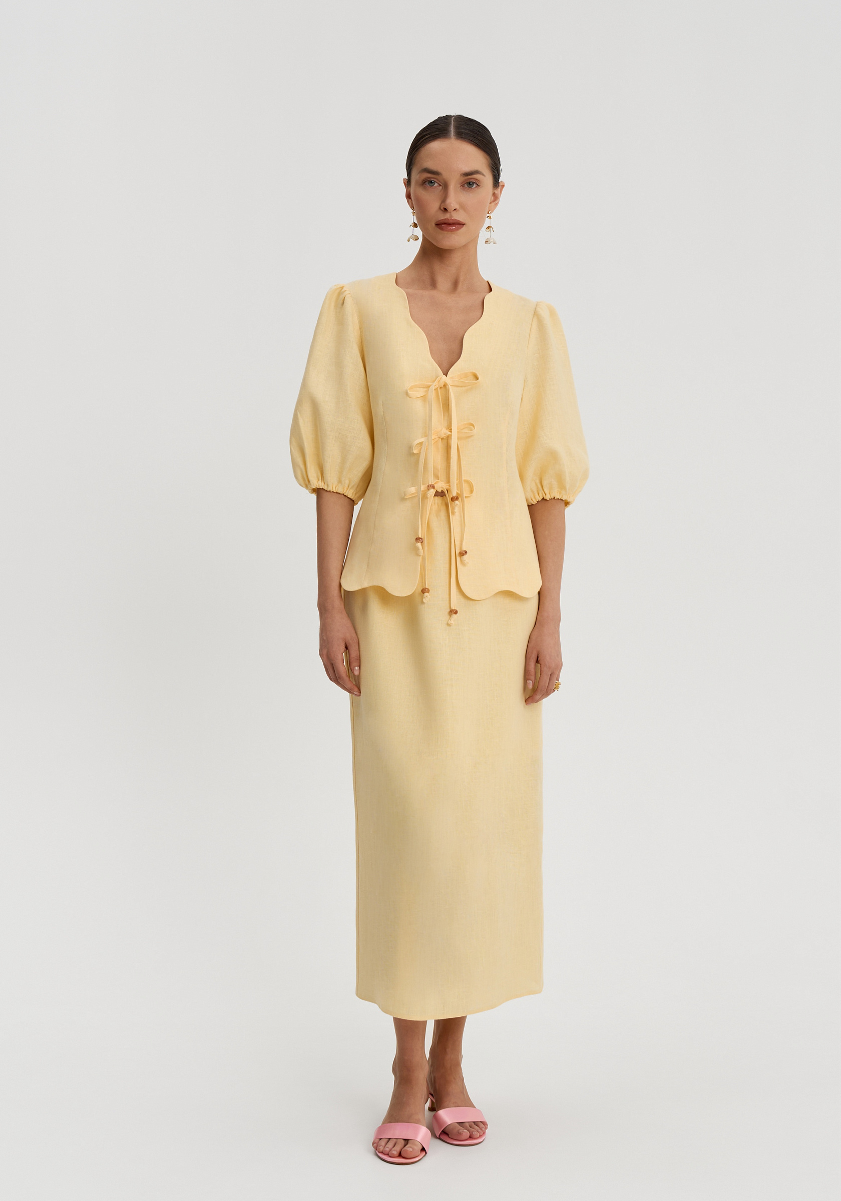 Рукава-фонарики собраны на резинку, низ изделия — фигурный. Натуральный лён лёгкий, дышащий и комфортный в тёплый сезон.