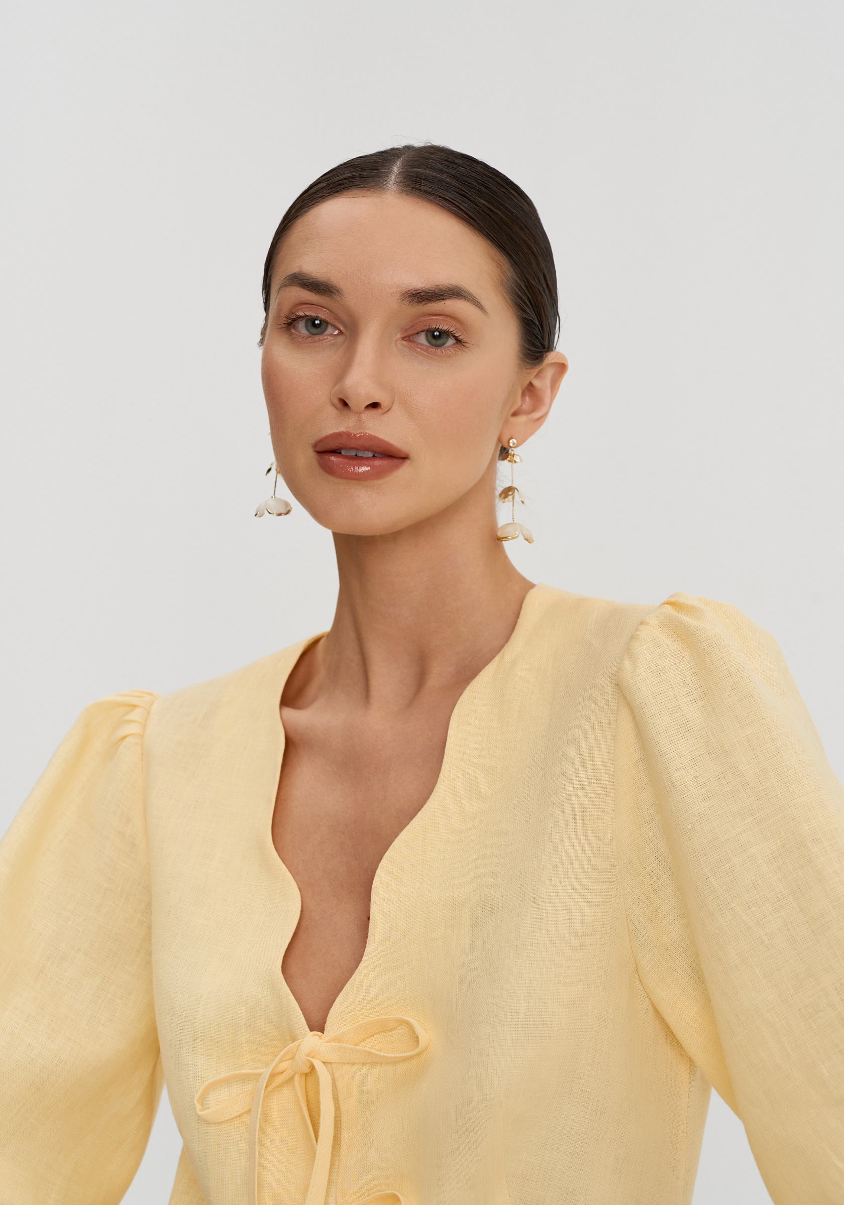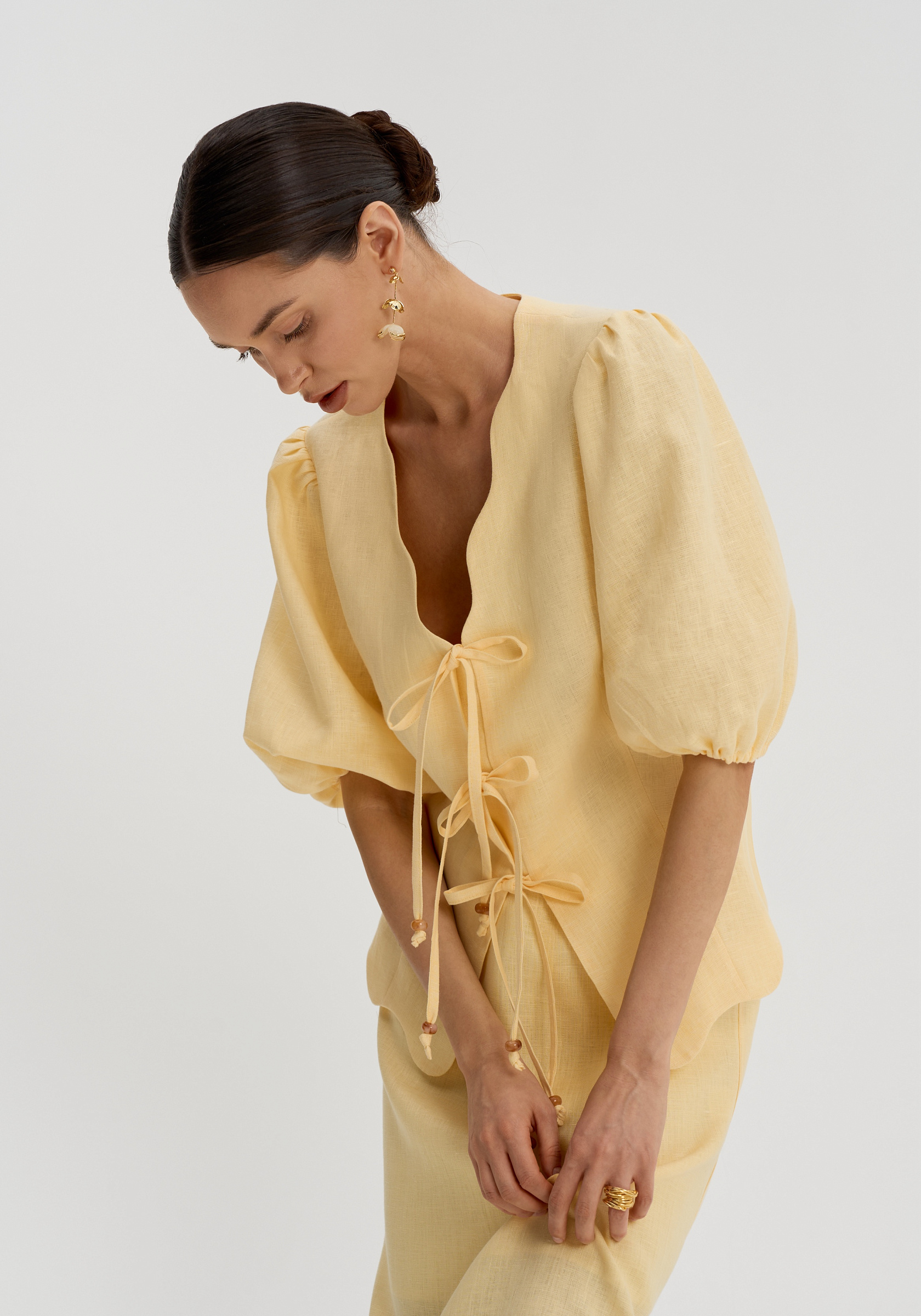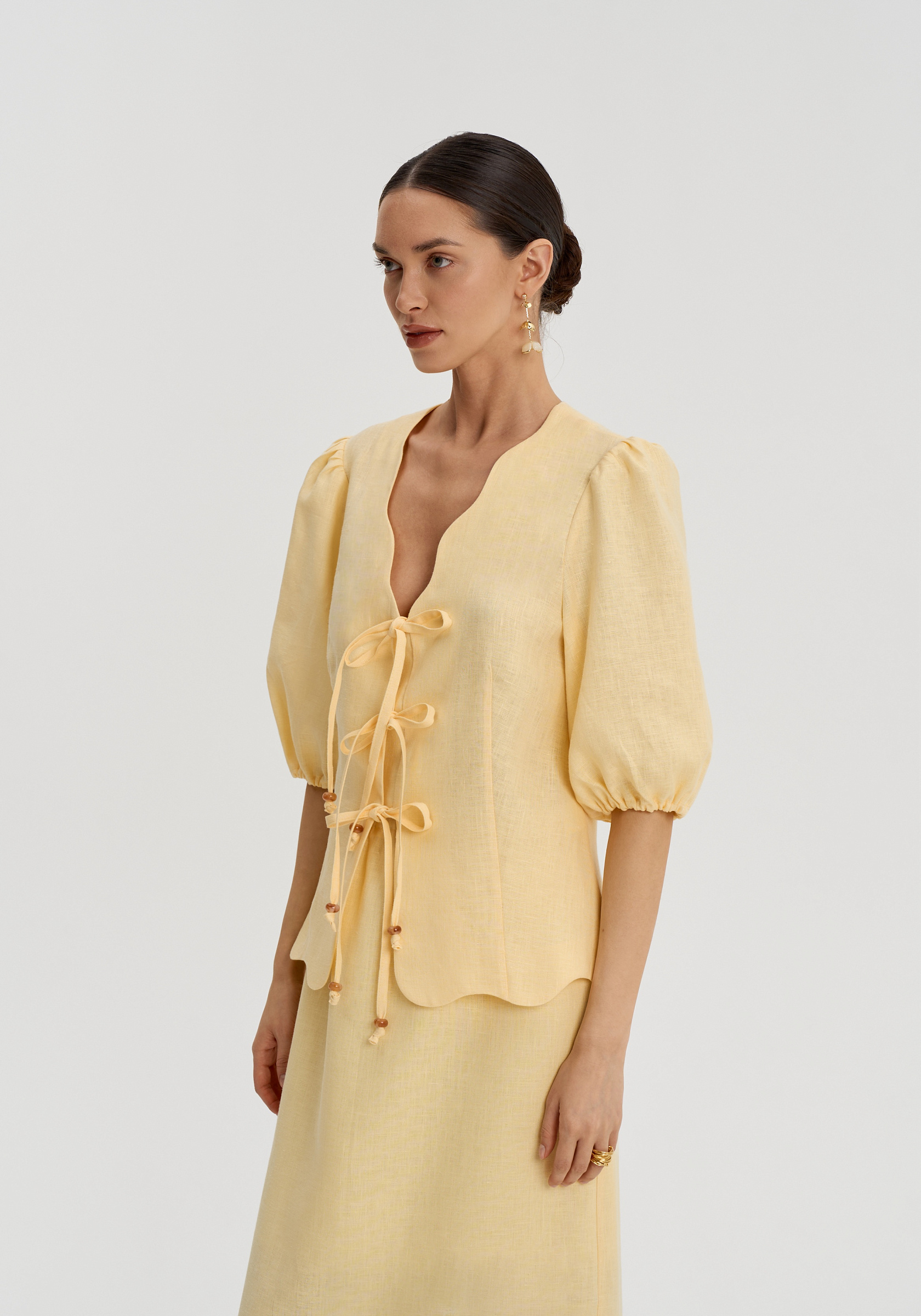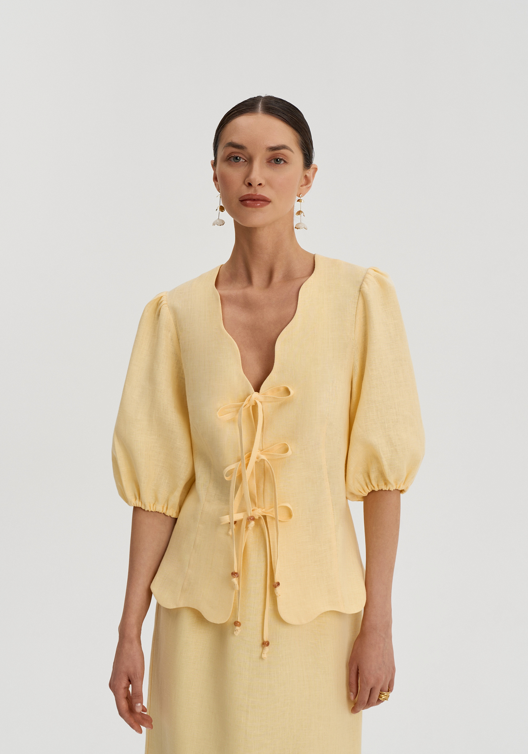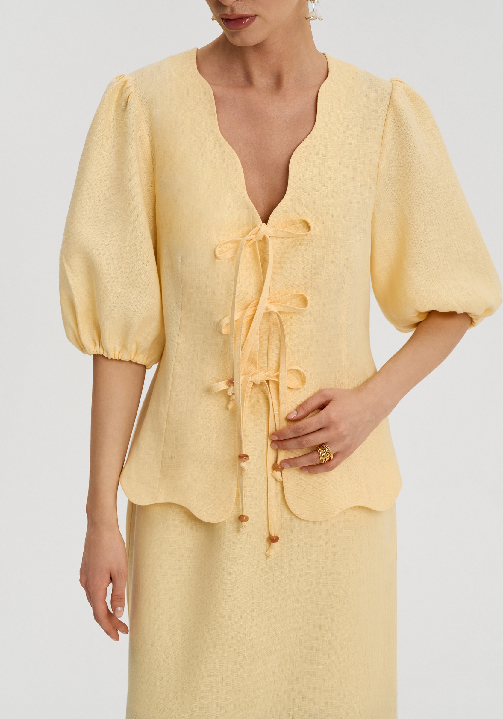 Полуприлегающий силуэт с фигурной горловиной и мягким объёмом в плечах. Застёжка на банты дополнена внутренним клапаном, который делает посадку аккуратной.