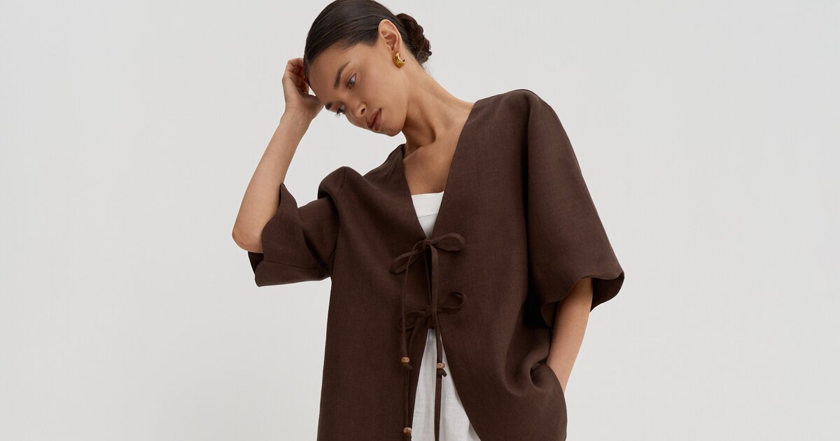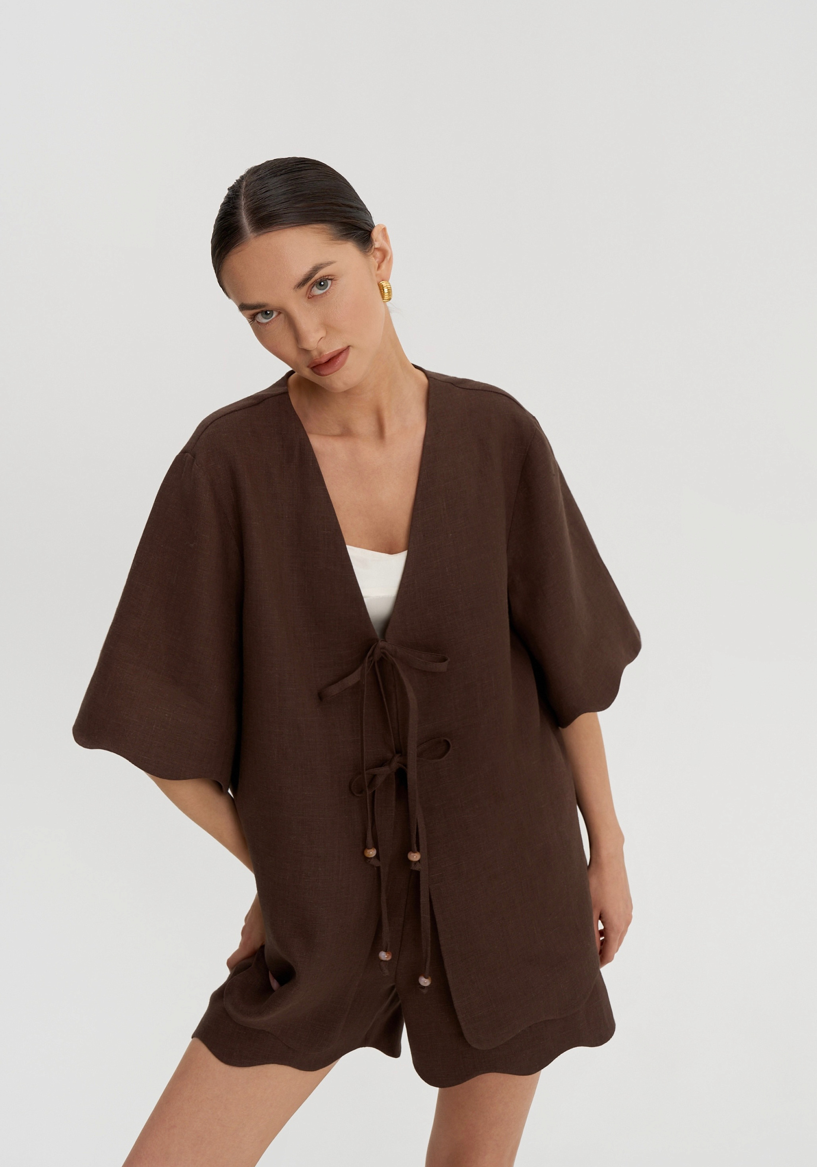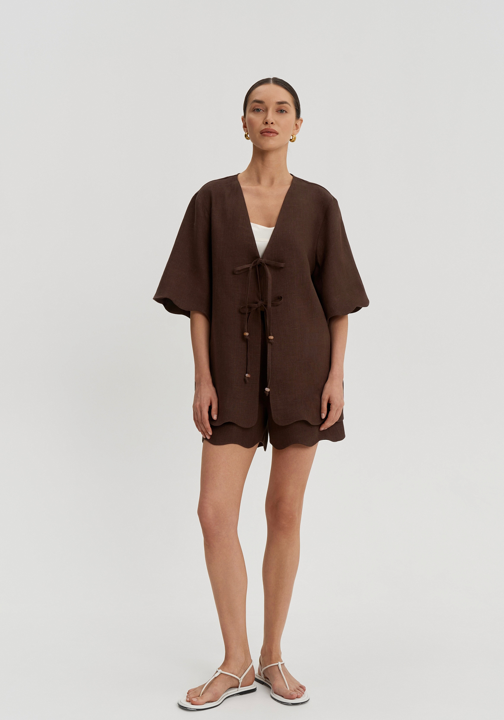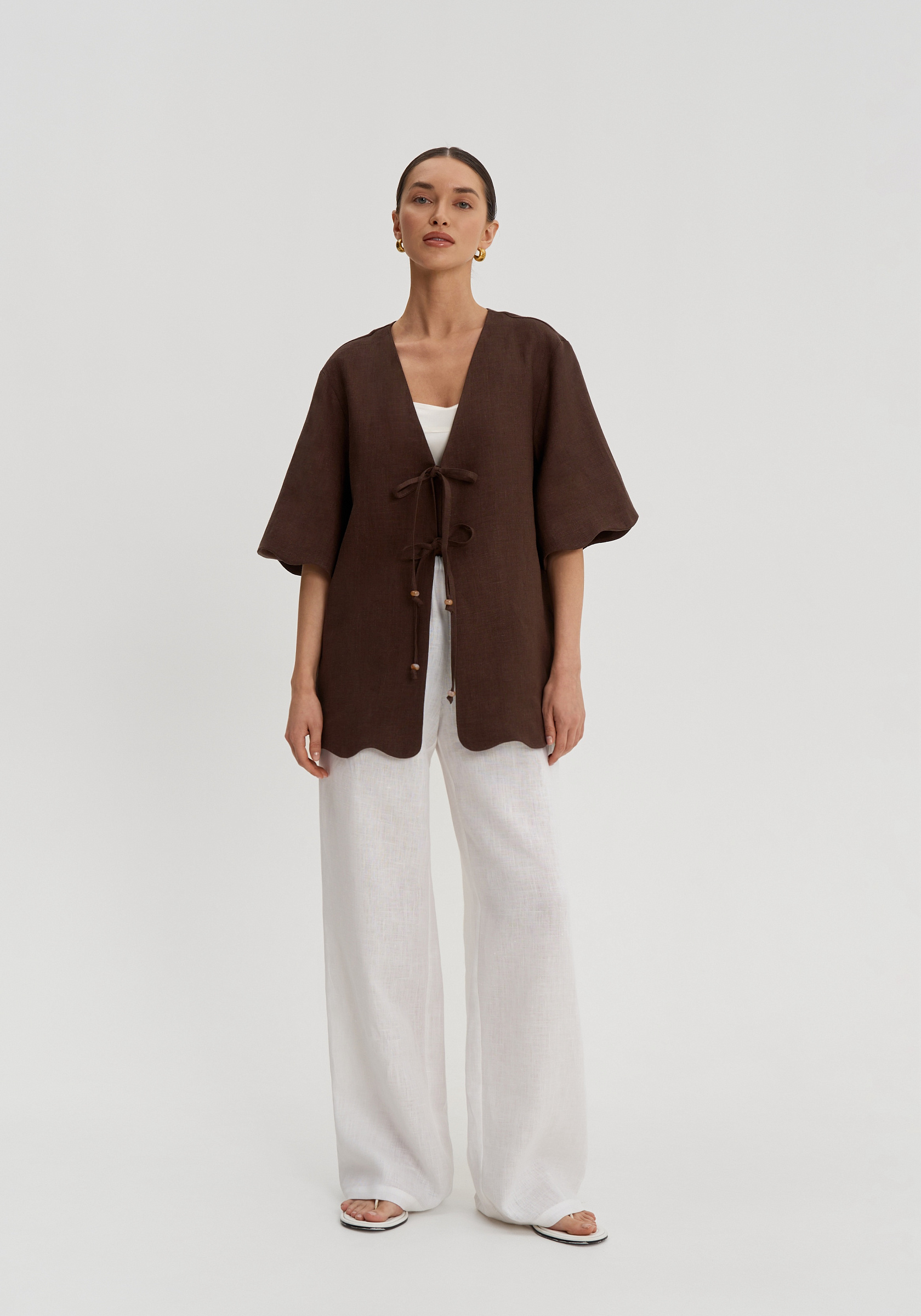 Короткие свободные рукава и декоративная волна по низу придают рубашке мягкость. Она легко вписывается в летний гардероб и сочетается с шортами, брюками или юбками изо льна в тон.