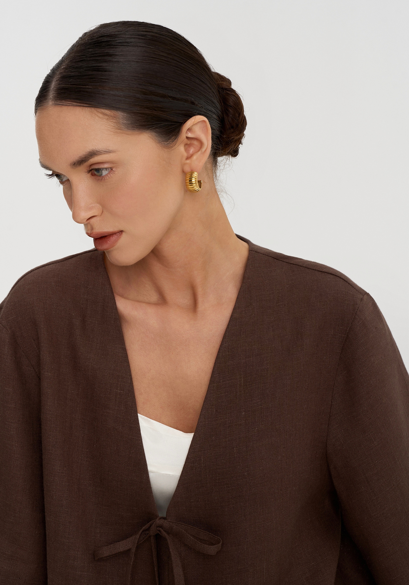 Лаконичная рубашка из 100% льна — легкого, дышащего и комфортного в теплый сезон материала. Свободный прямой крой мягко ложится по фигуре, а глубокая V-образная горловина визуально вытягивает силуэт.