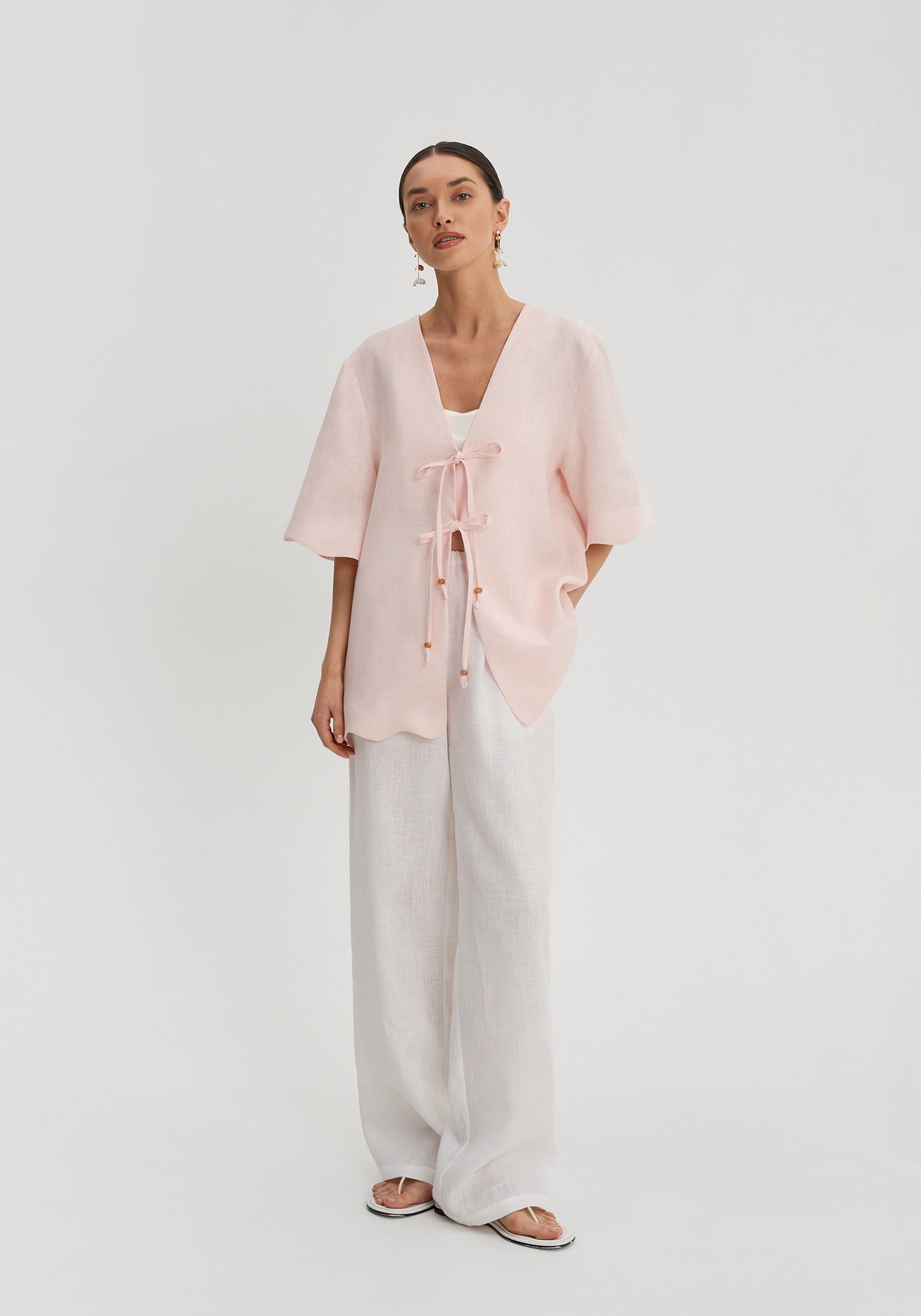Лаконичная рубашка из 100% льна — легкого, дышащего и комфортного в теплый сезон материала. Свободный прямой крой мягко ложится по фигуре, а глубокая V-образная горловина визуально вытягивает силуэт.