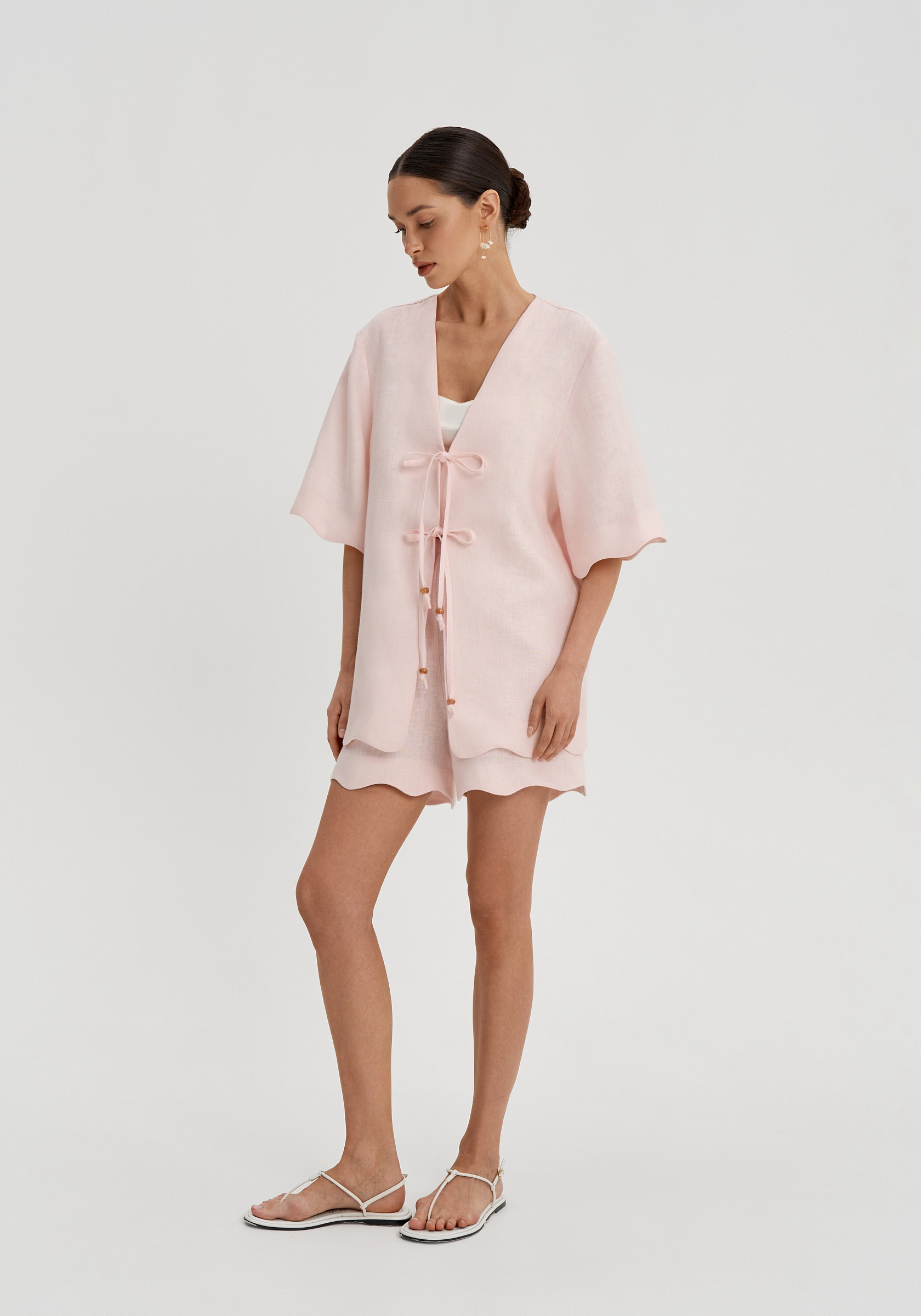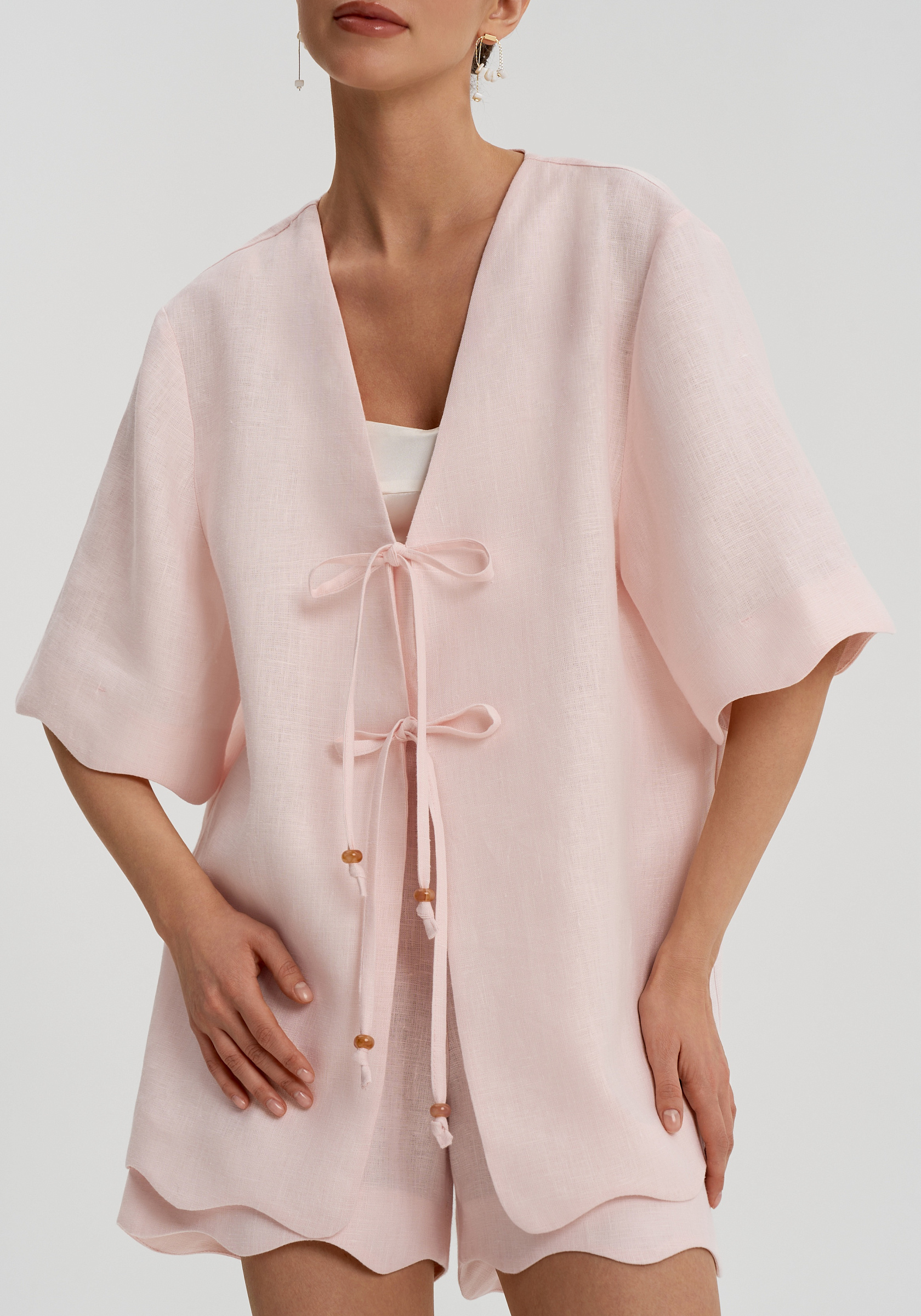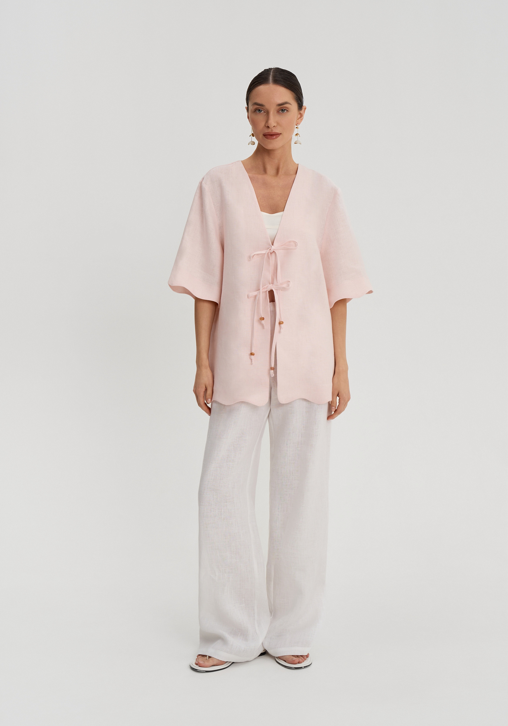 Короткие свободные рукава и декоративная волна по низу придают рубашке мягкость. Она легко вписывается в летний гардероб и сочетается с шортами, брюками или юбками изо льна в тон.