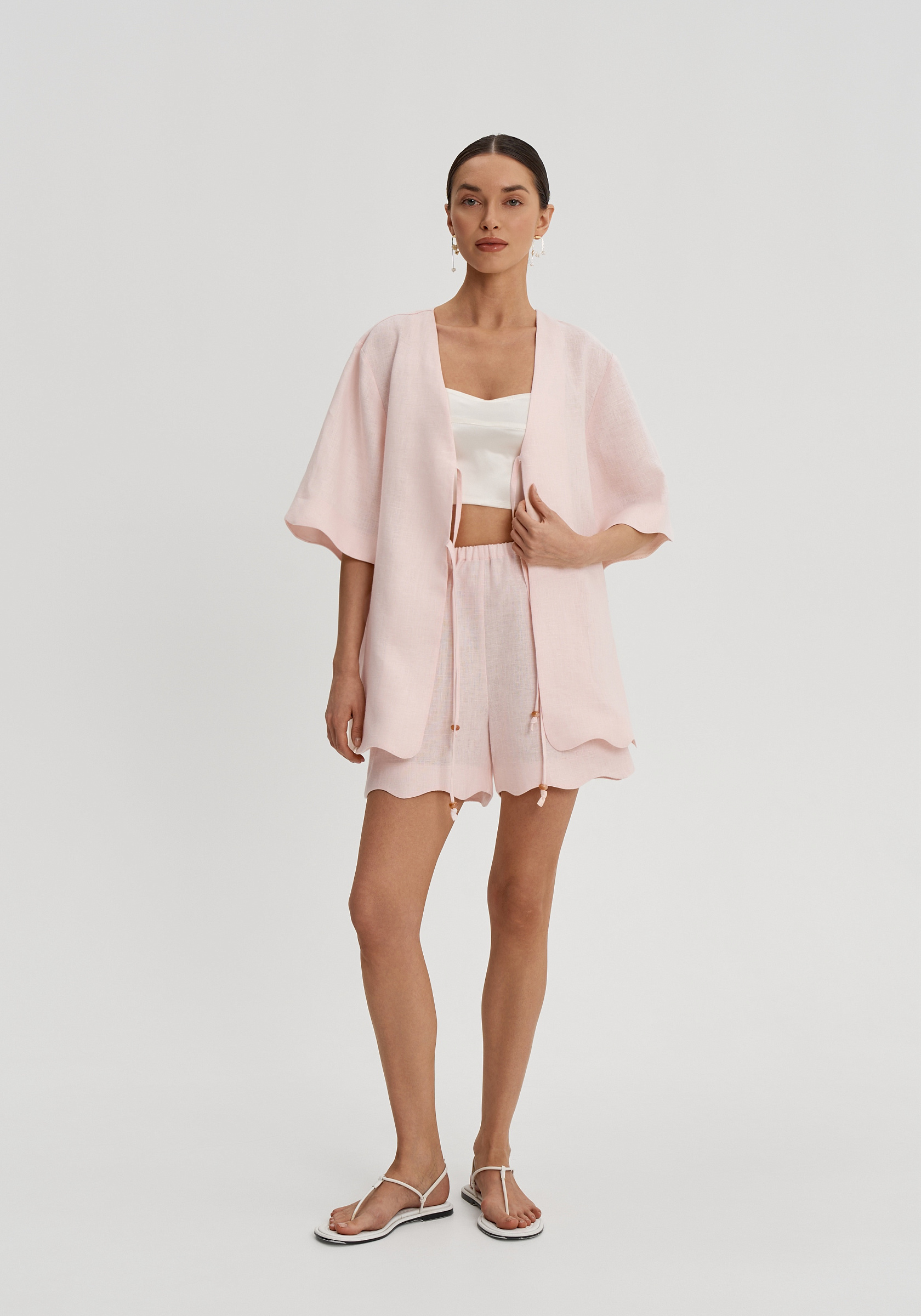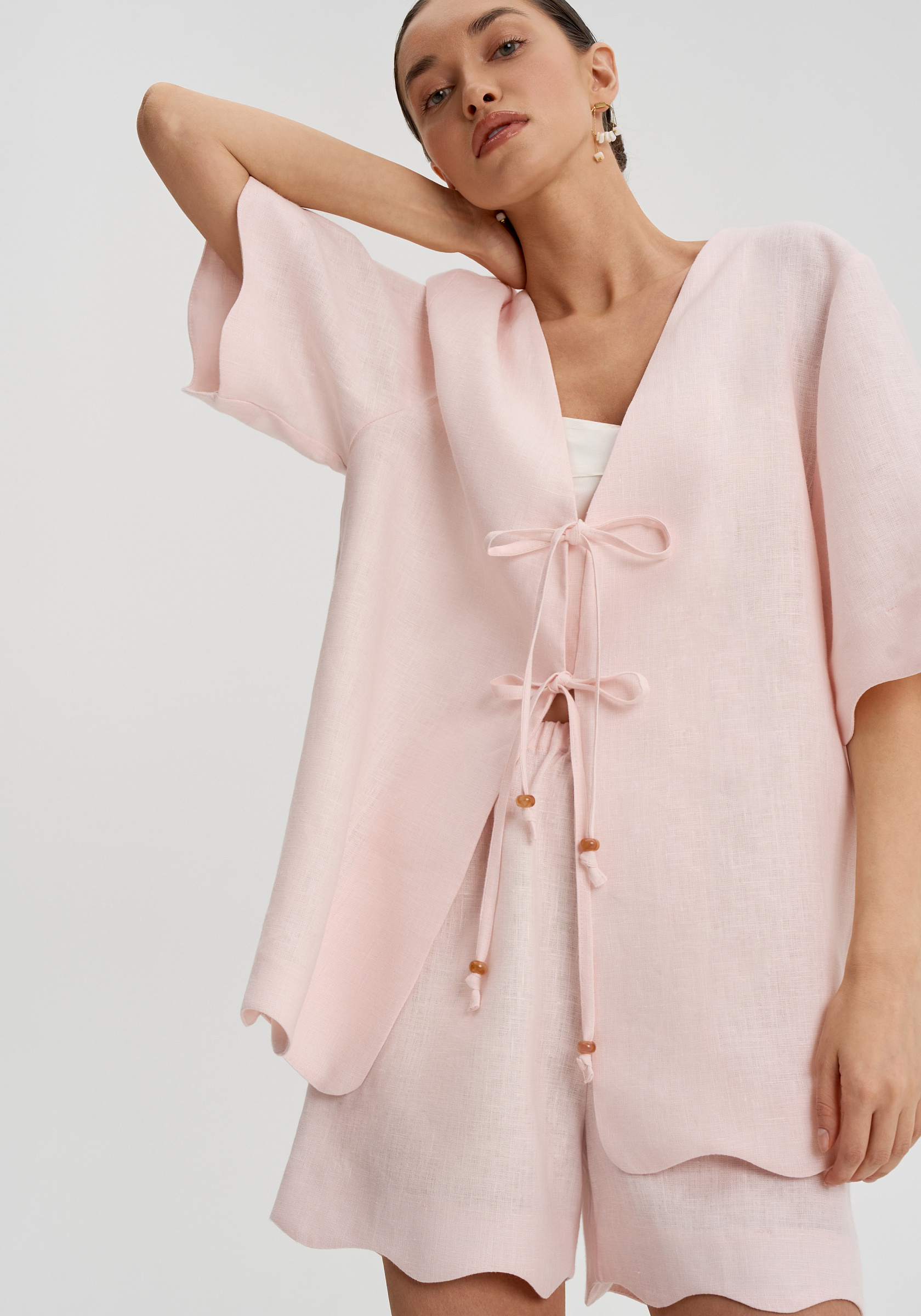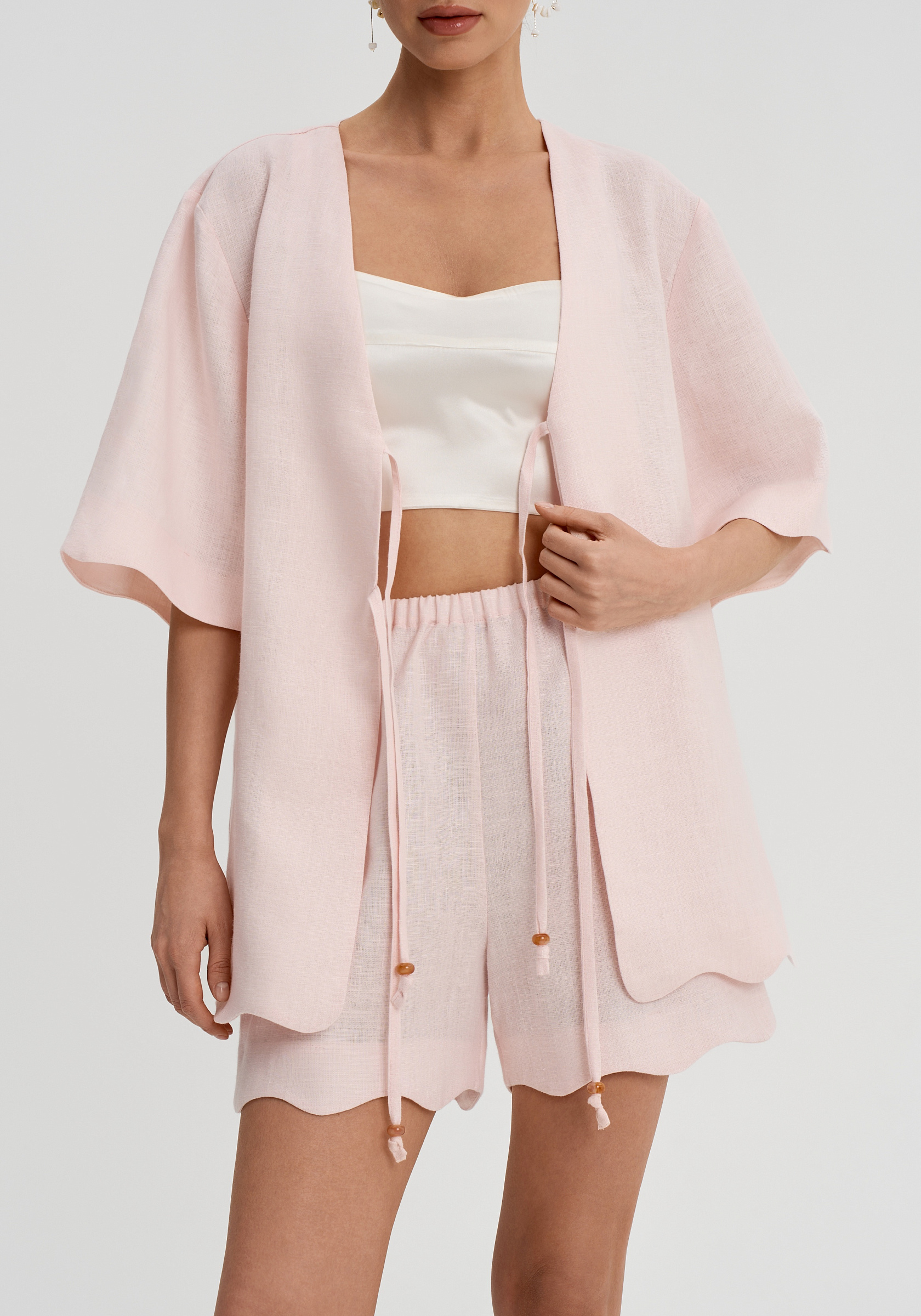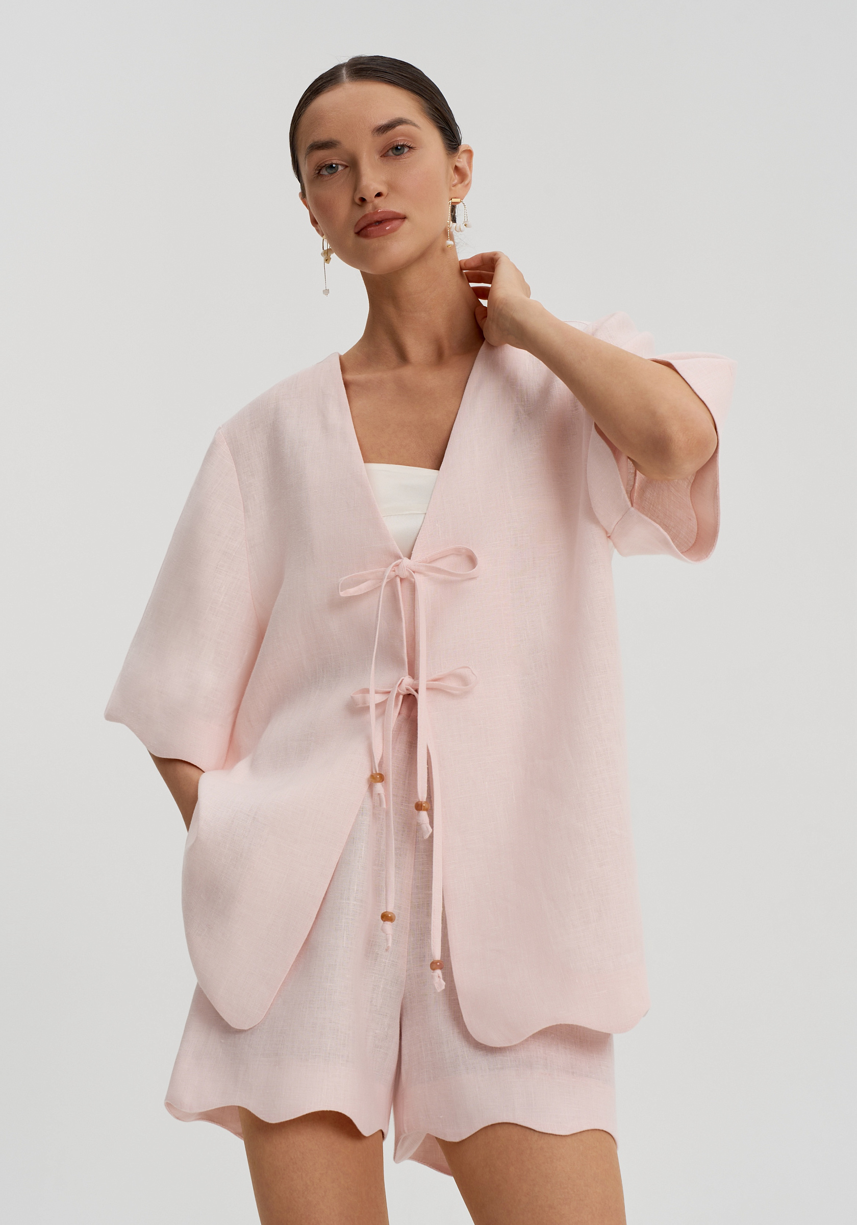 Короткие свободные рукава и декоративная волна по низу придают рубашке мягкость. Она легко вписывается в летний гардероб и сочетается с шортами, брюками или юбками изо льна в тон.
