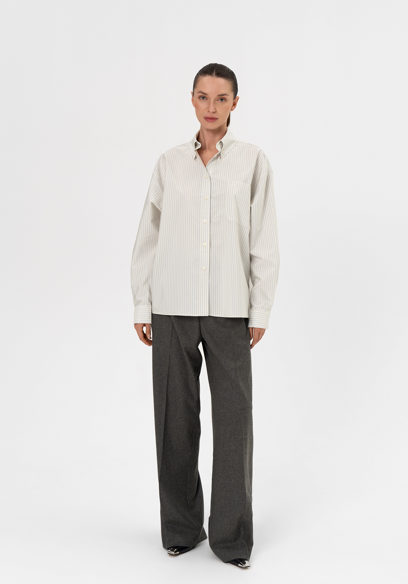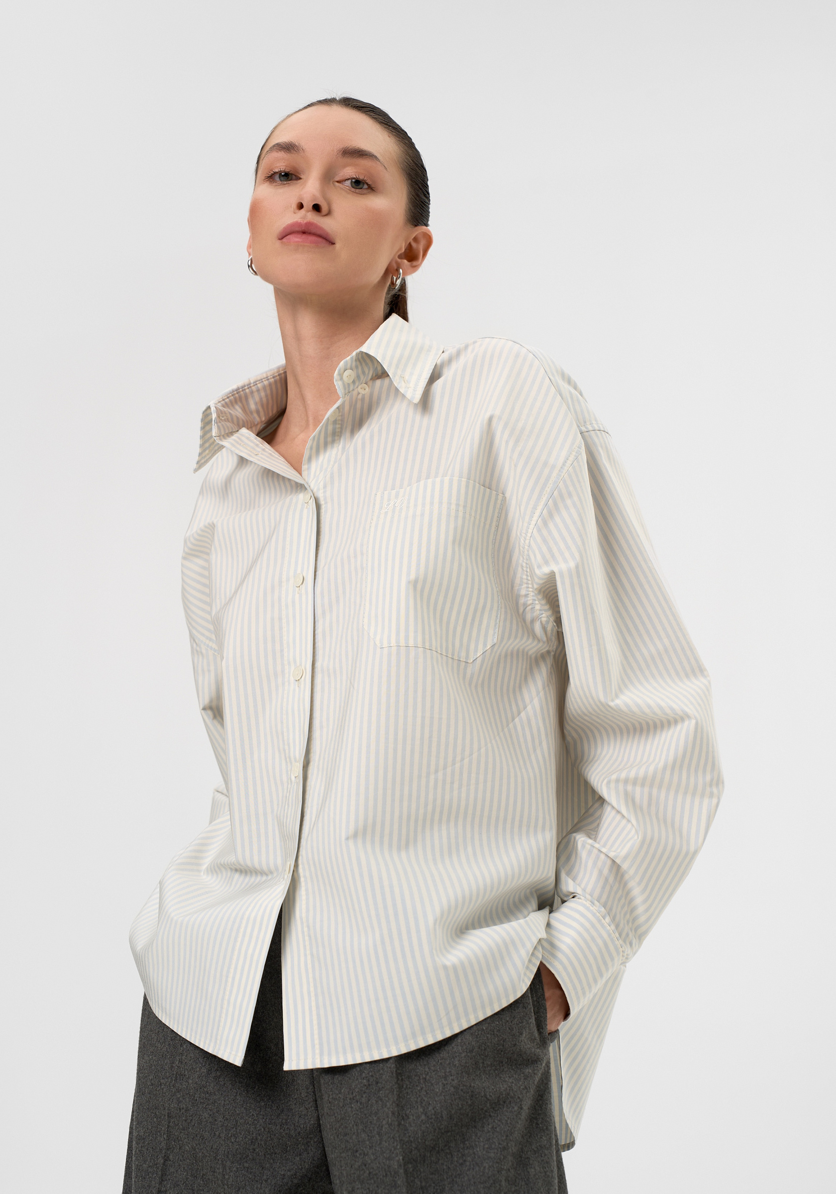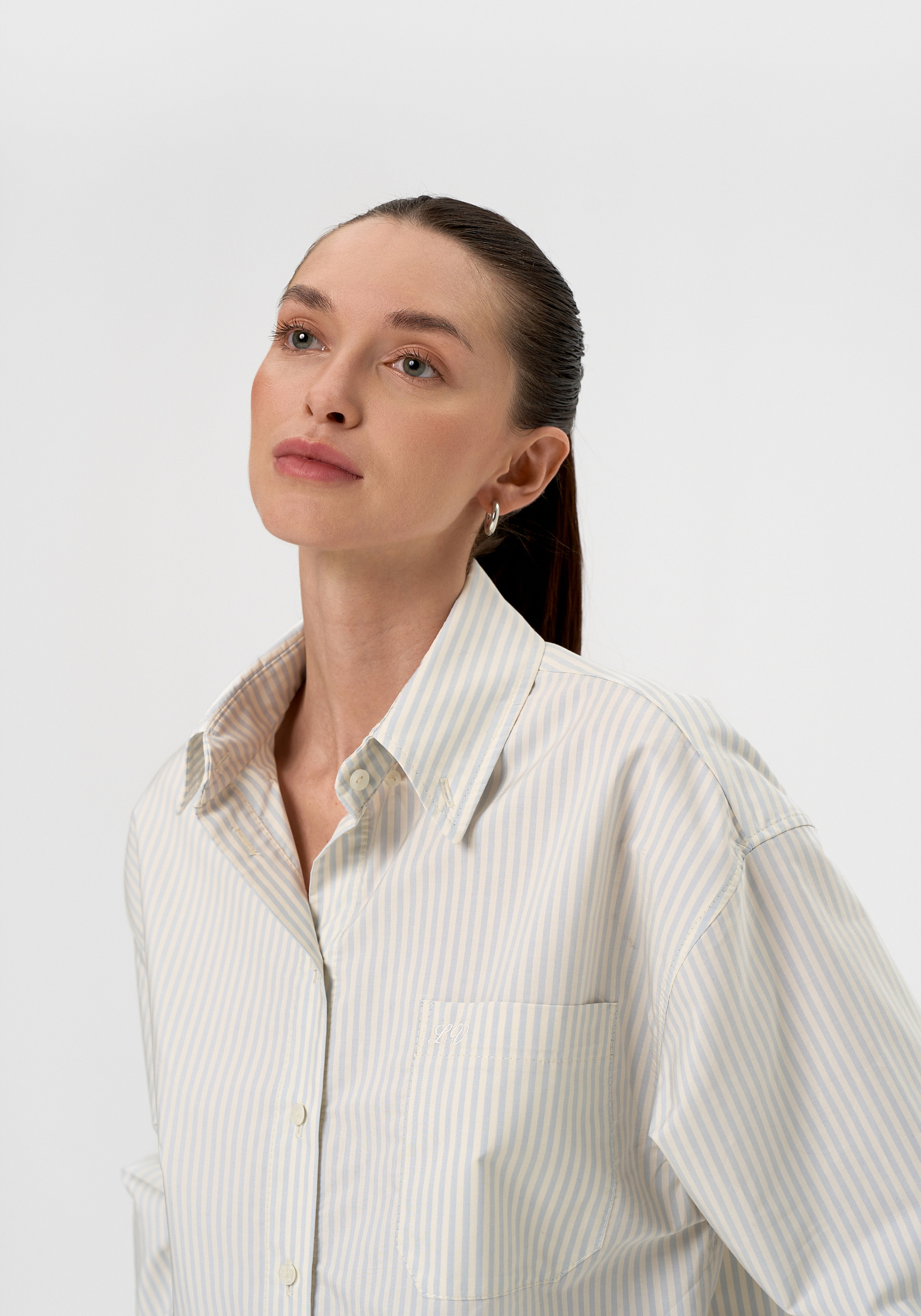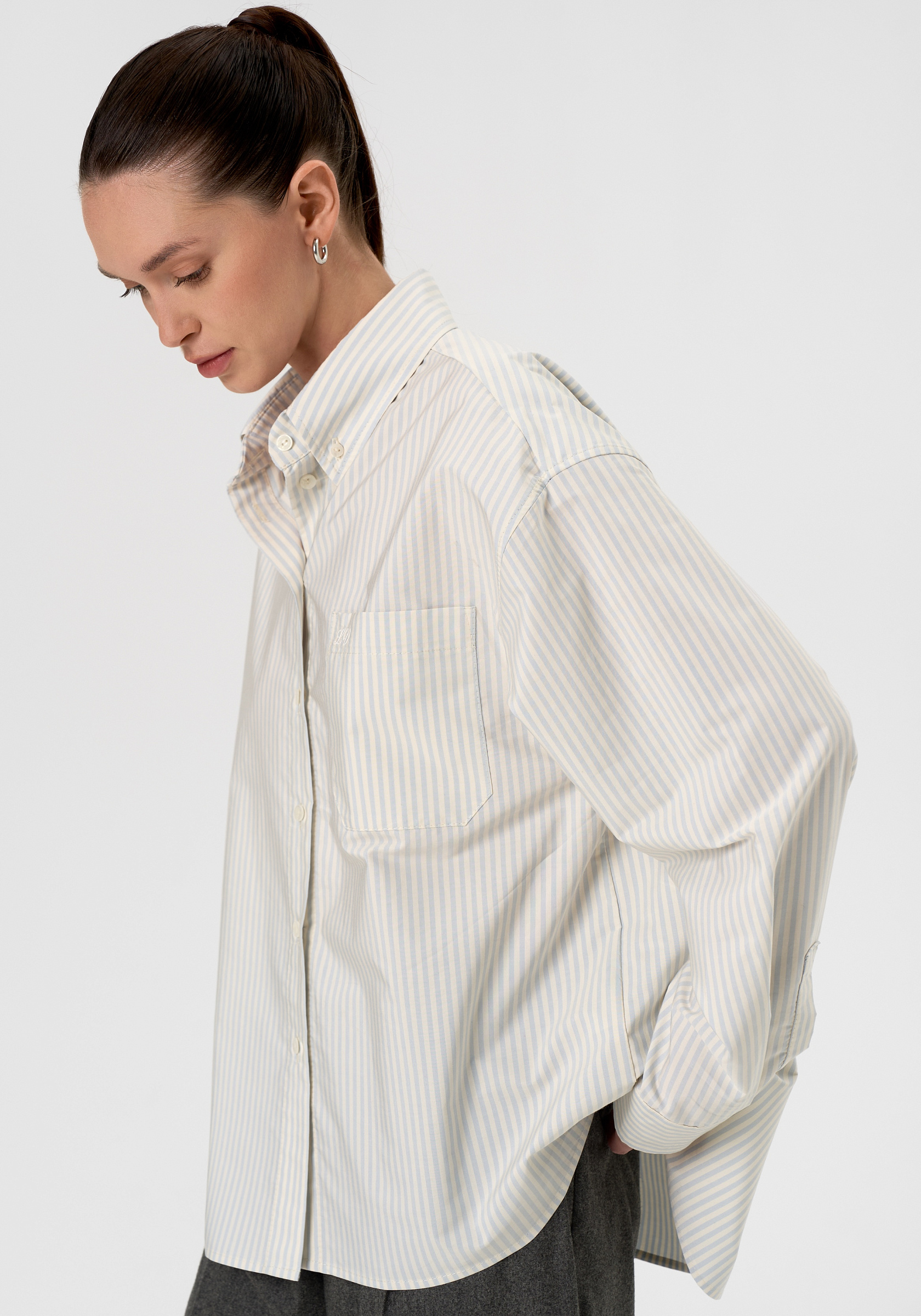 Оверсайз рубашка из итальянского хлопка — лаконичная классика в современном прочтении. Свободный силуэт и мягкая линия плеча создают расслабленный, но собранный образ. Классический воротник-стойка и аккуратная полоска подчёркивают утончённость формы, а накладной карман добавляет лёгкий акцент.Рубашка выполнена из итальянской хлопковой ткани, приятной к телу и хорошо держащей форму. Универсальная база для повседневных и деловых сочетаний.