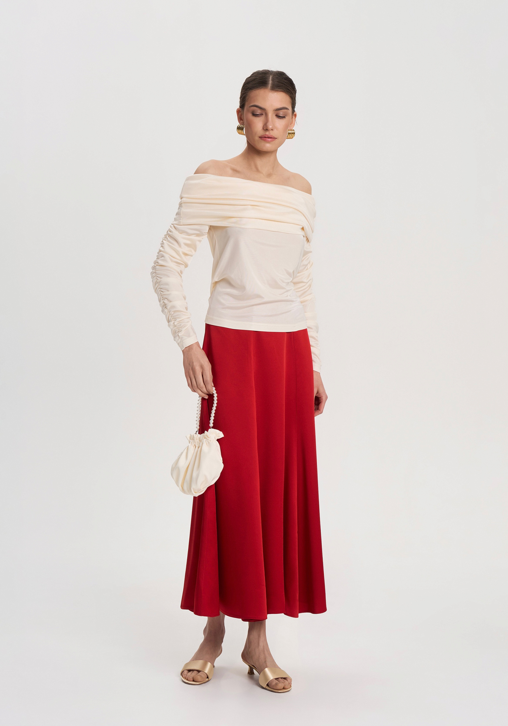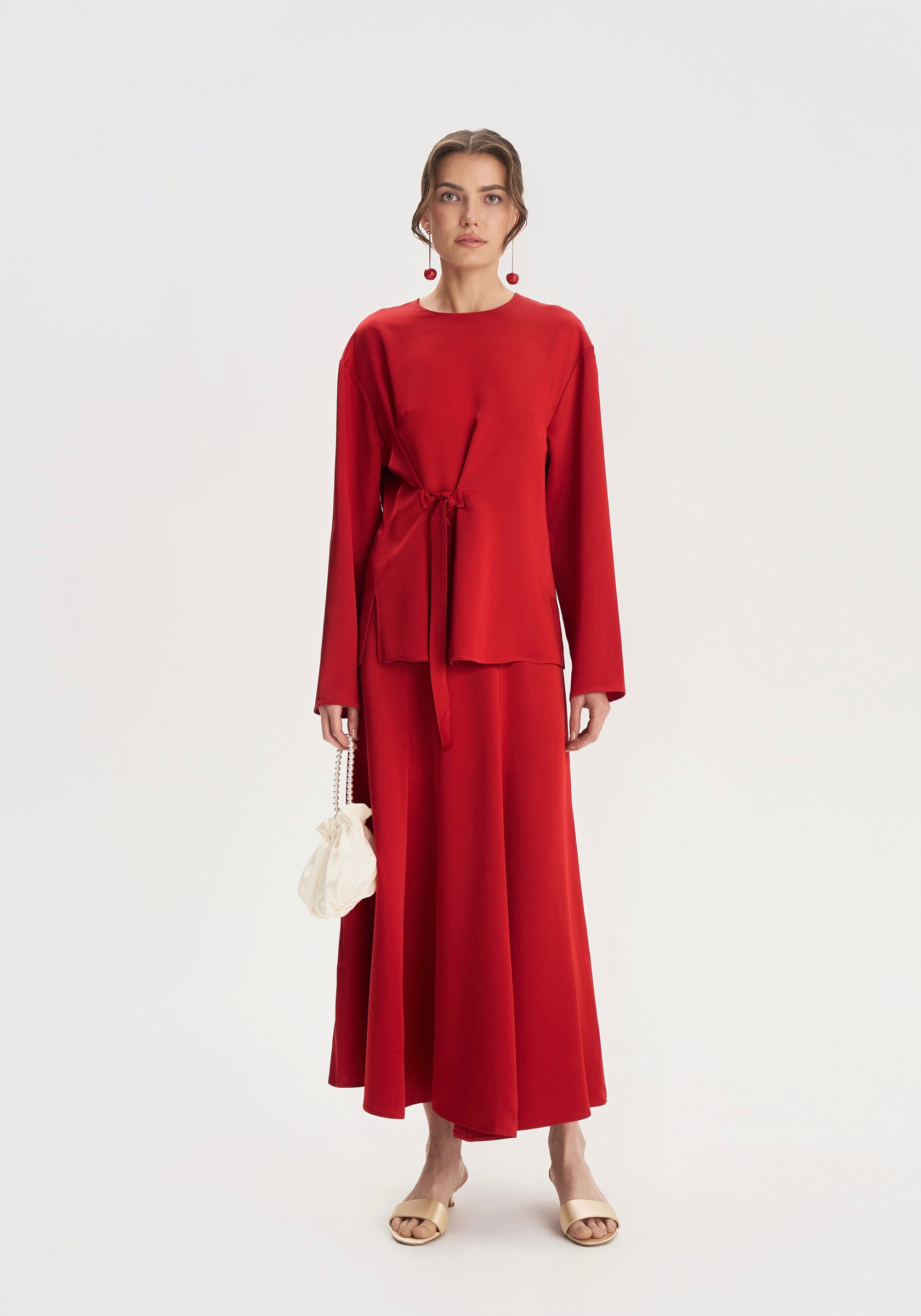 Юбка-годе из 100% итальянской вискозы — лаконичная и выразительная. Юбка мягко раскрывается к низу и красиво движется при ходьбе. Матовая фактура вискозы подчёркивает насыщенный красный оттенок и придаёт образу глубину.Юбка легко комбинируется с жакетами, рубашками и трикотажем — акцентная, но универсальная основа сезонного гардероба.