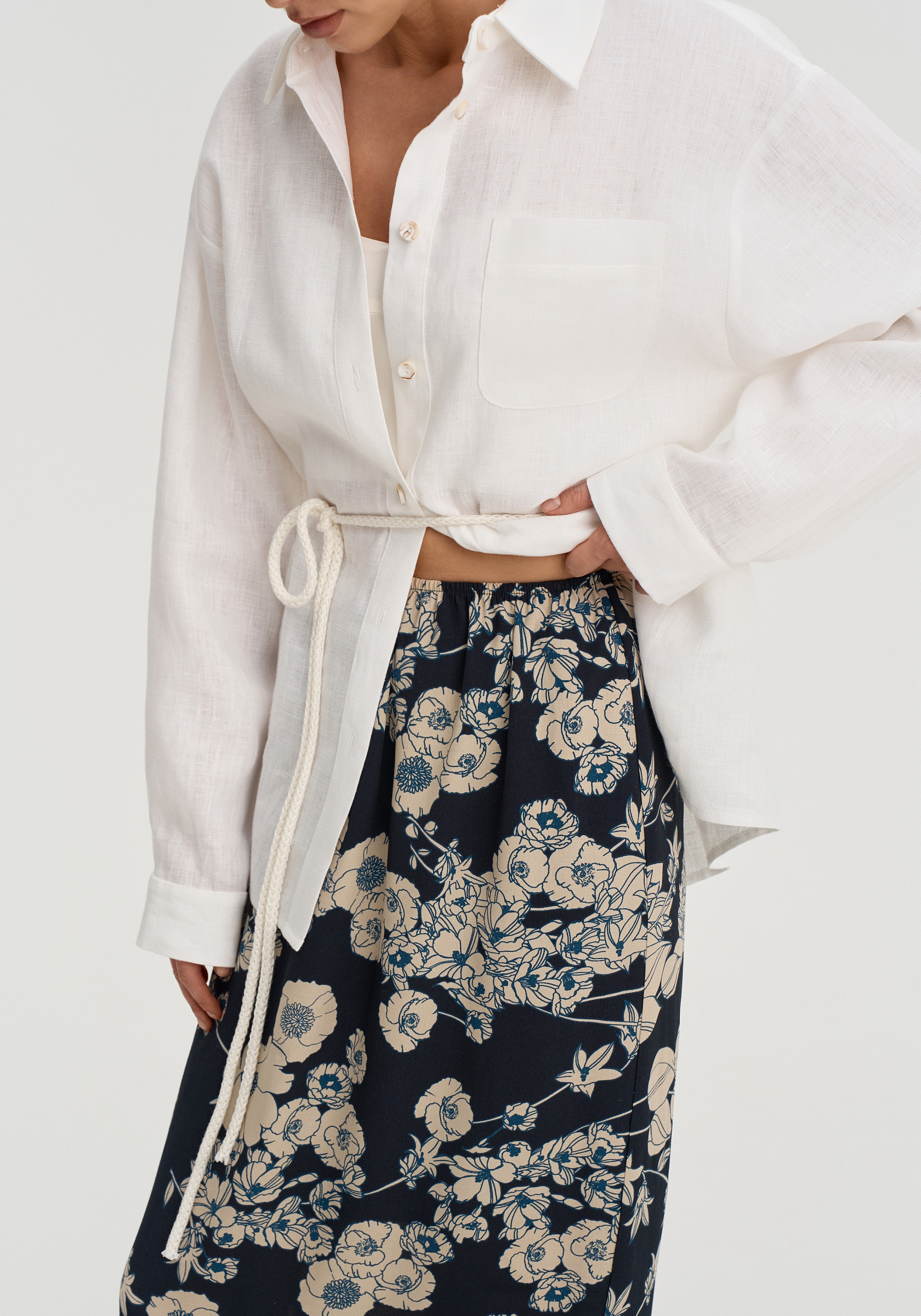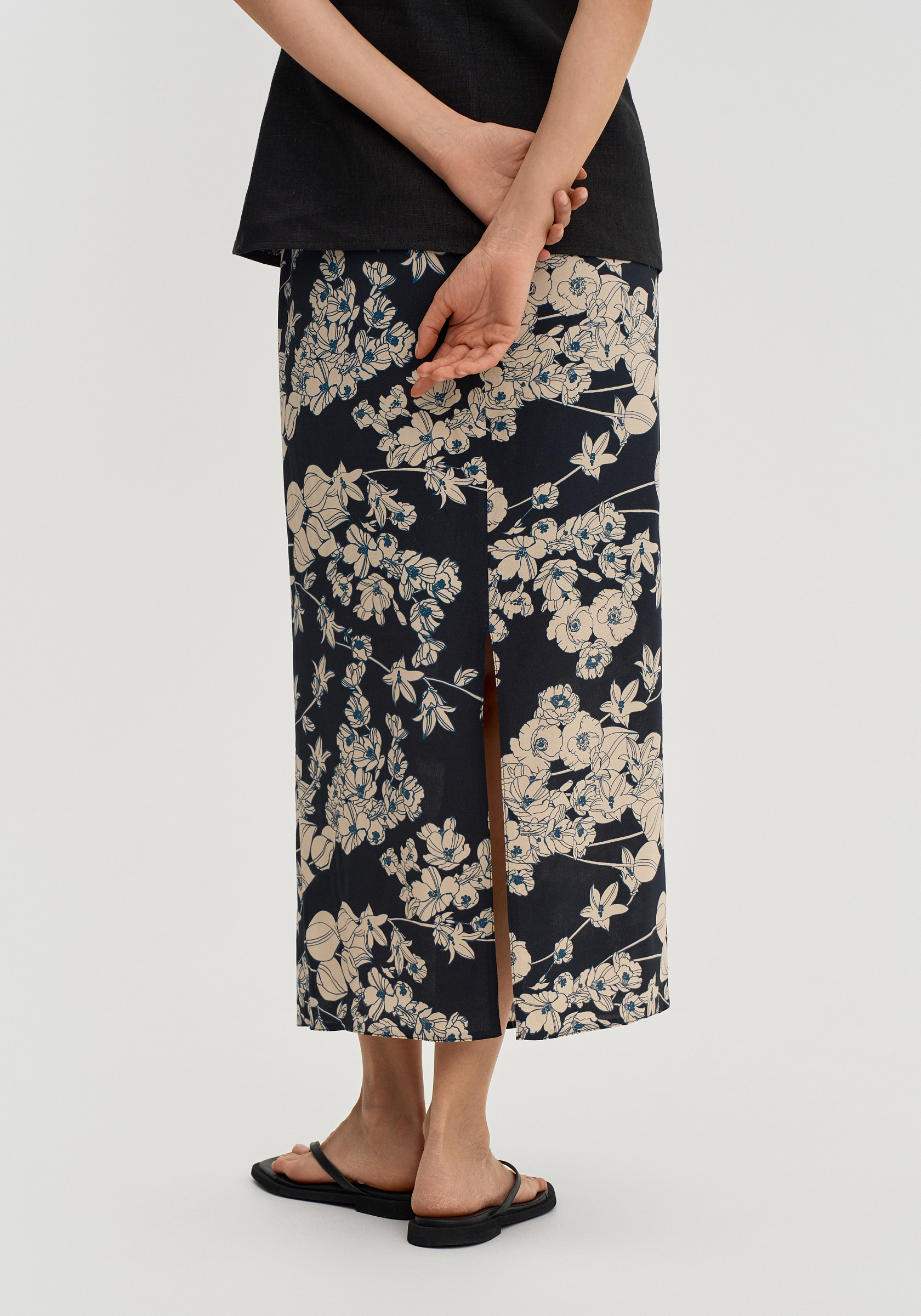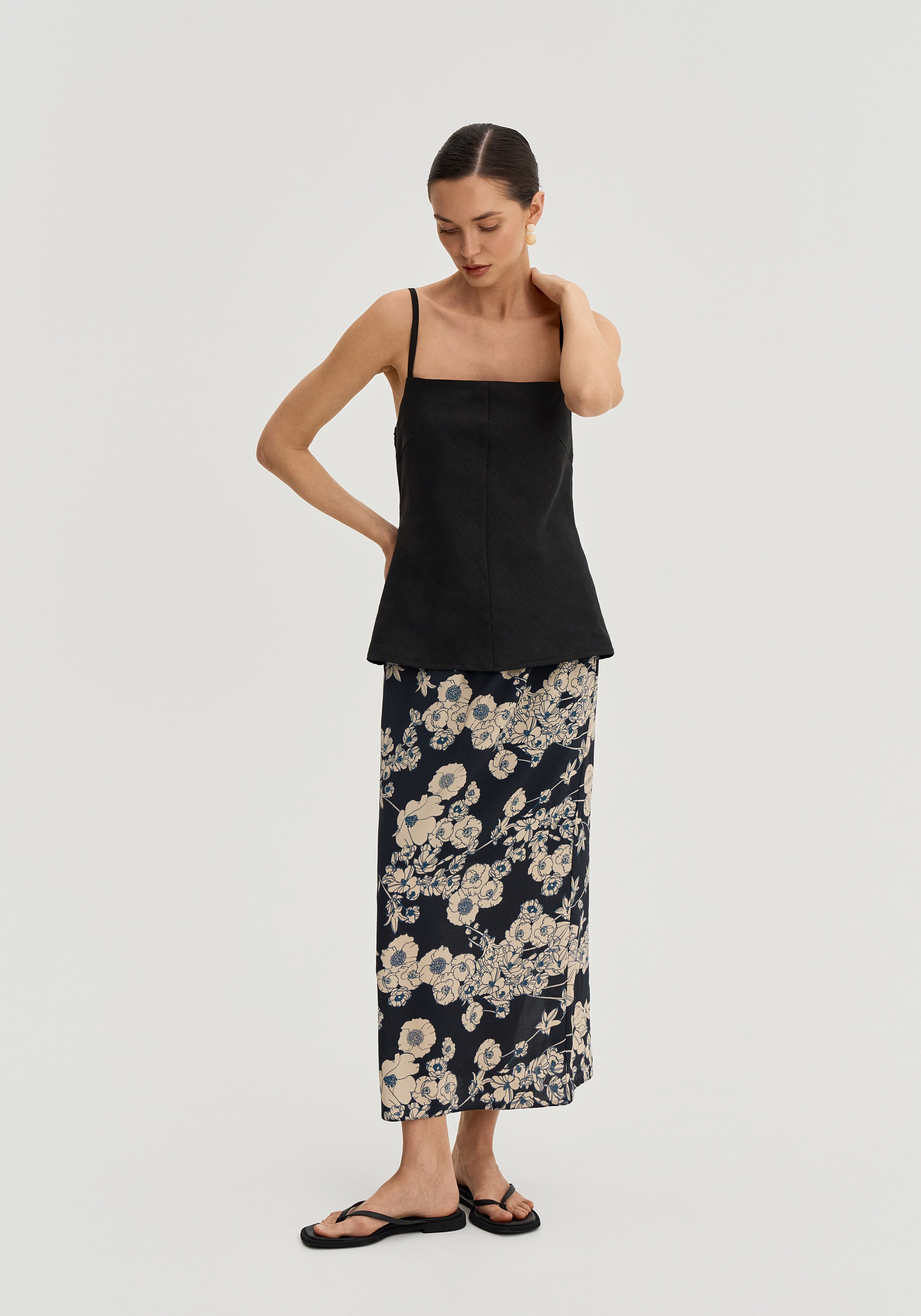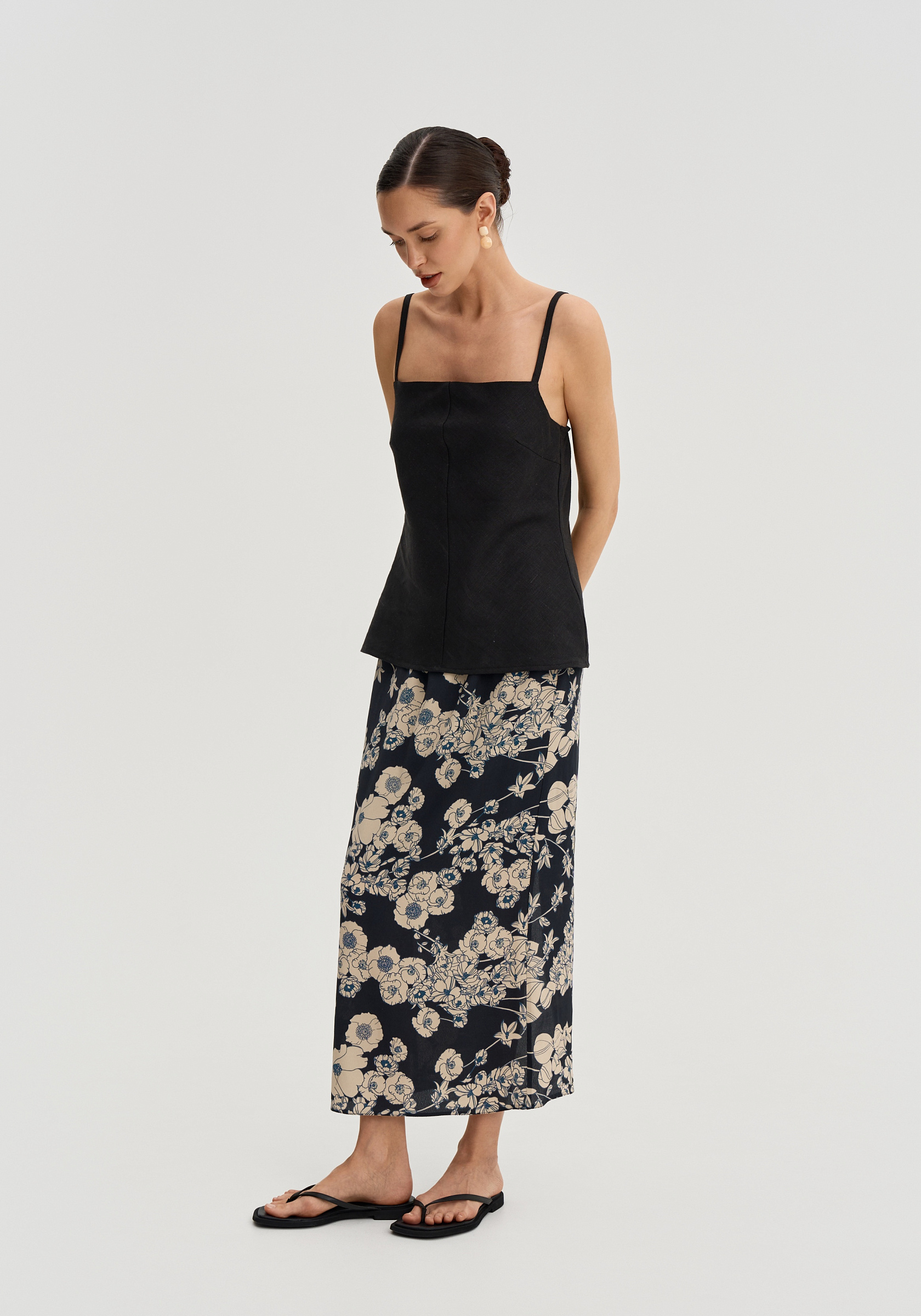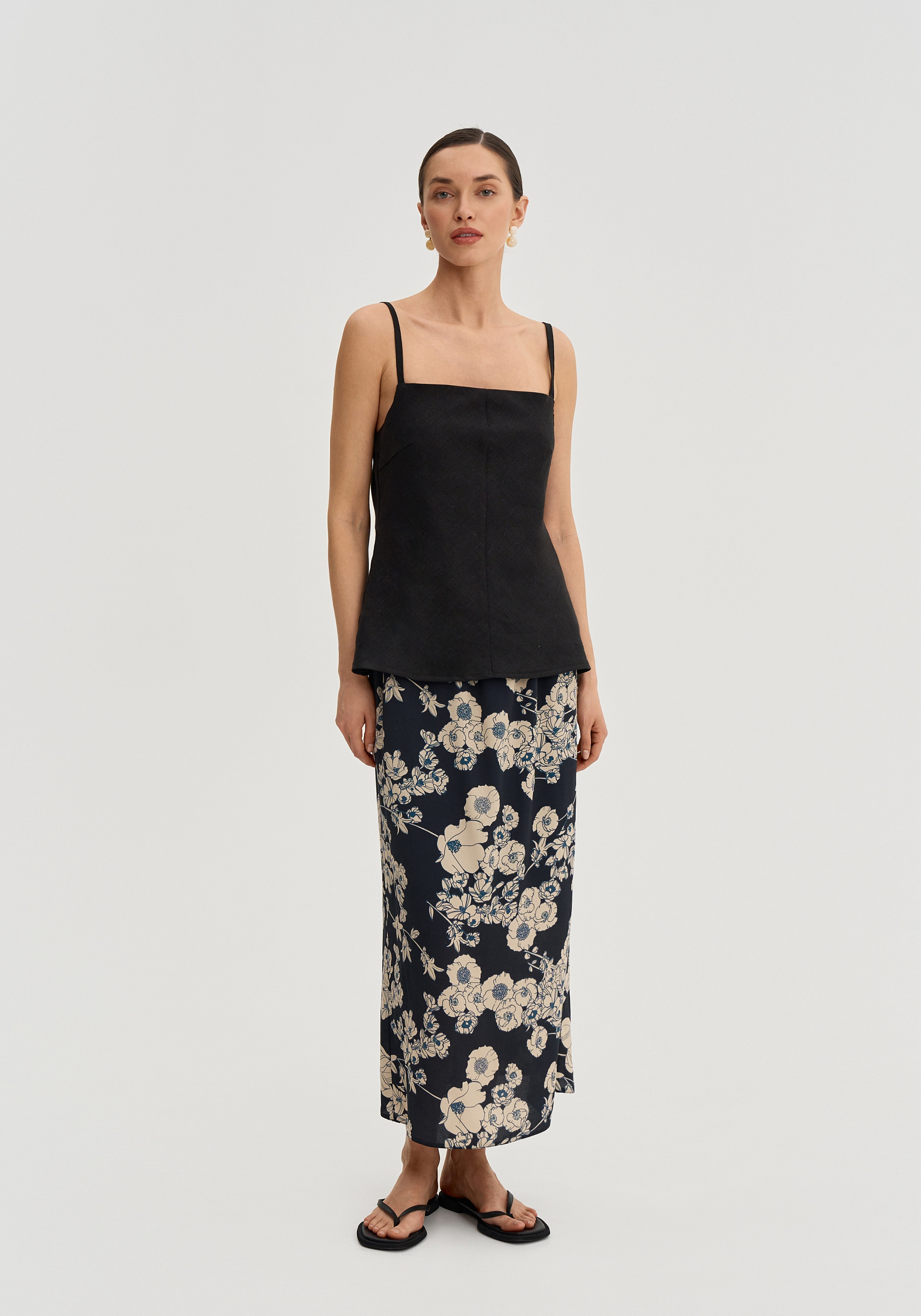 Цветочный принт делает юбку более выразительной, поэтому она хорошо сочетается с однотонными топами, майками и тонким трикотажем.