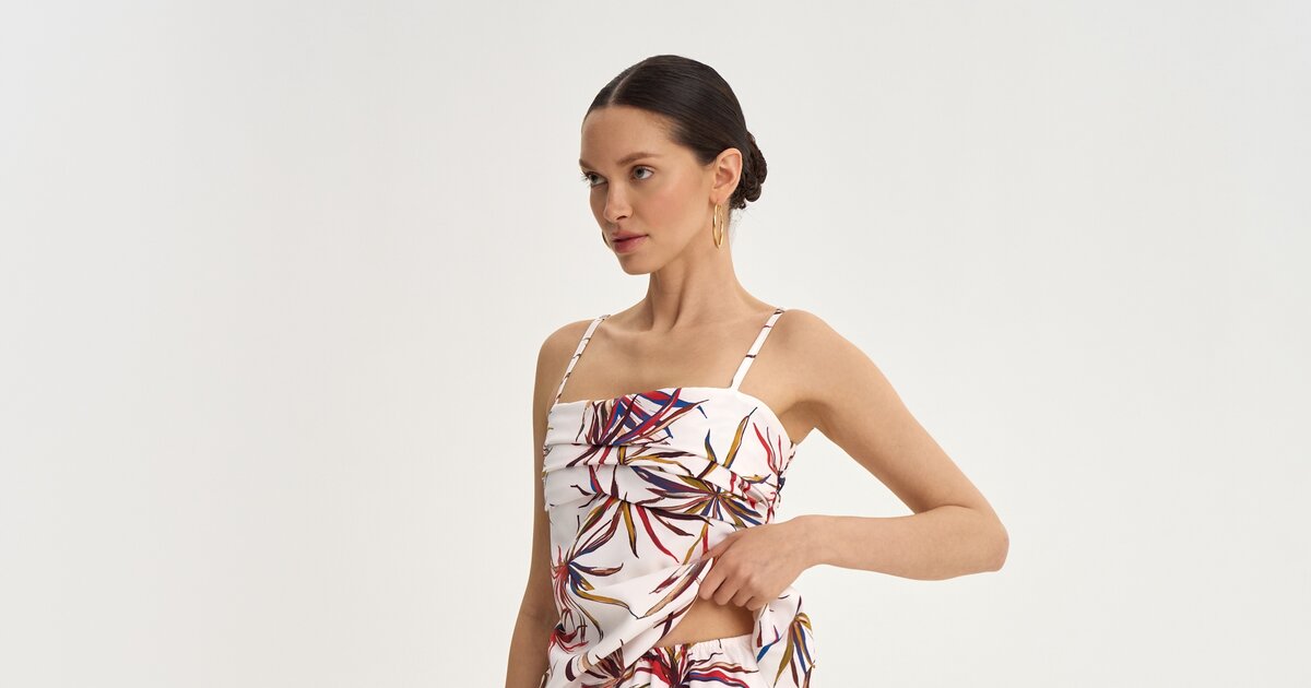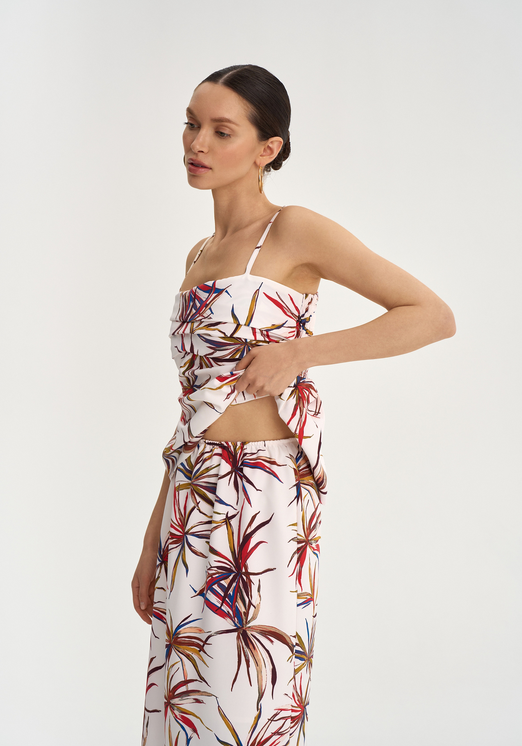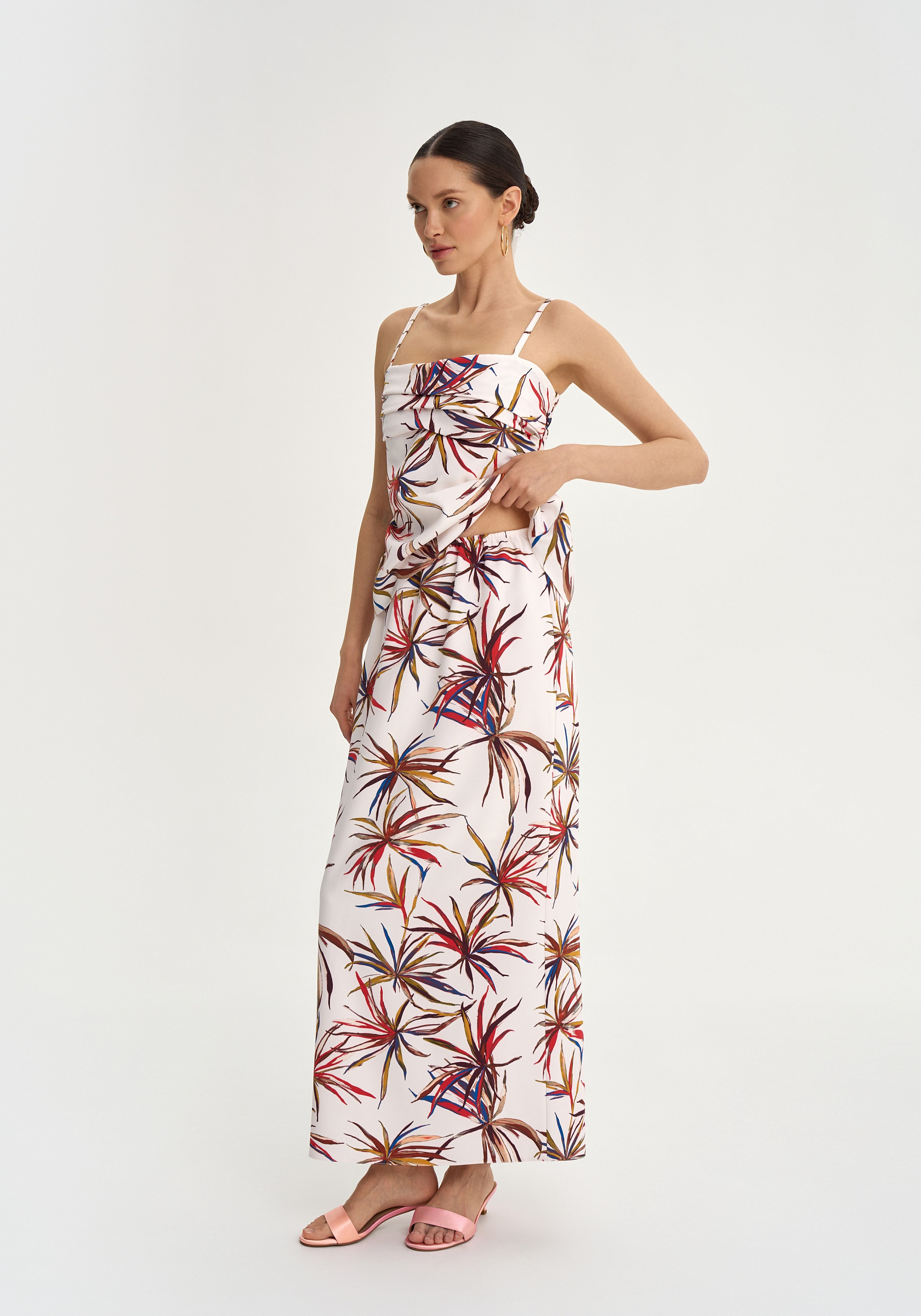Активный принт делает юбку акцентной, поэтому она хорошо сочетается с однотонным верхом или топом из комплекта.