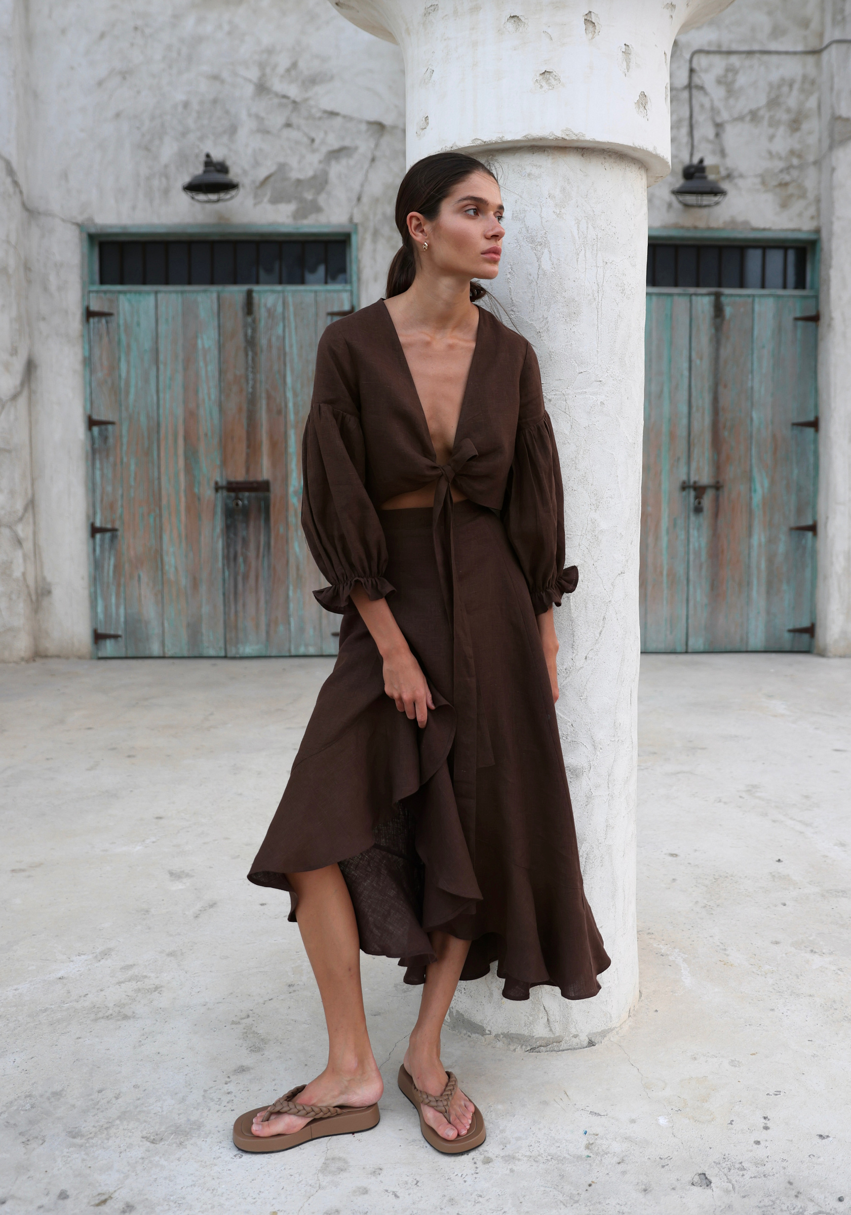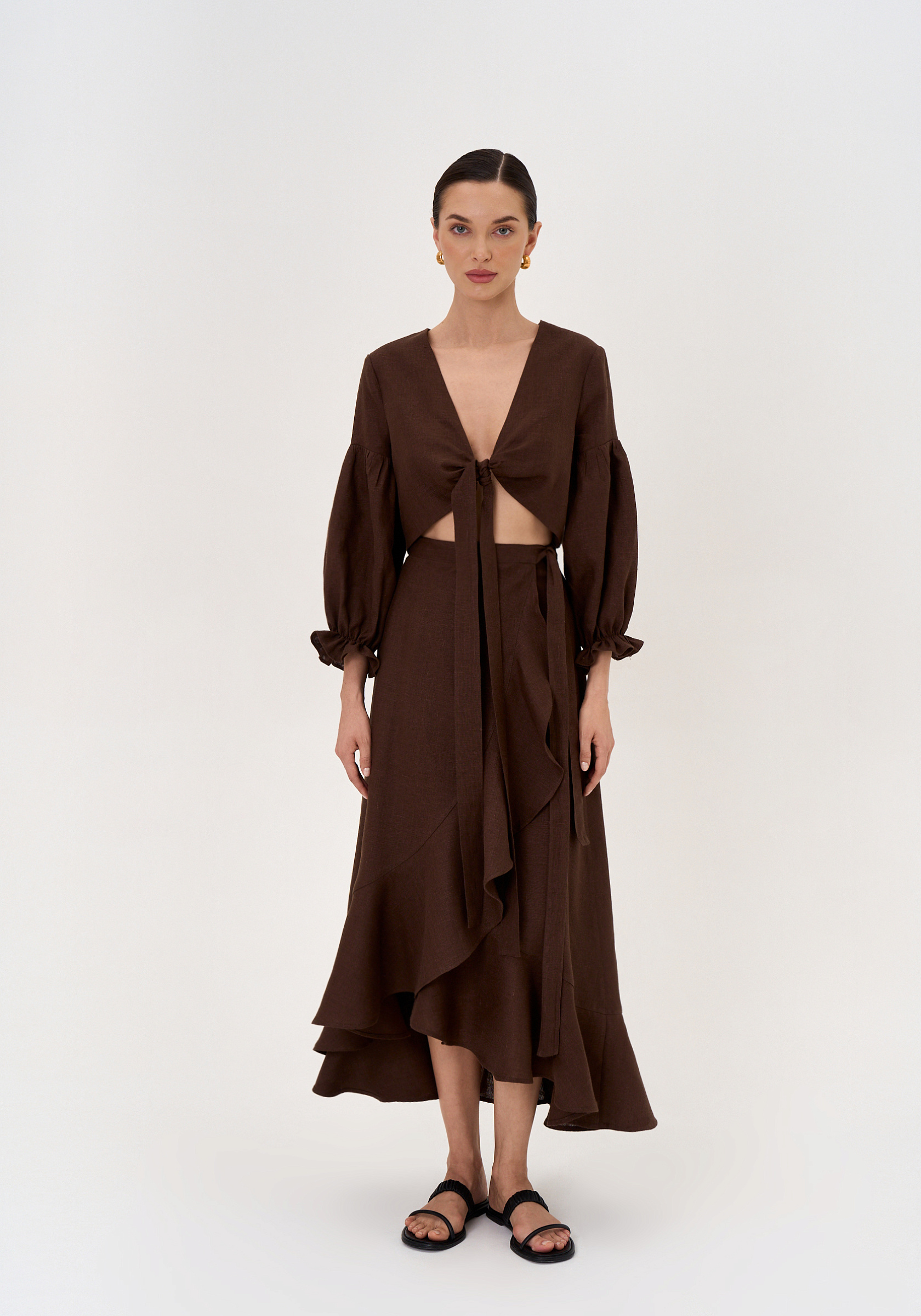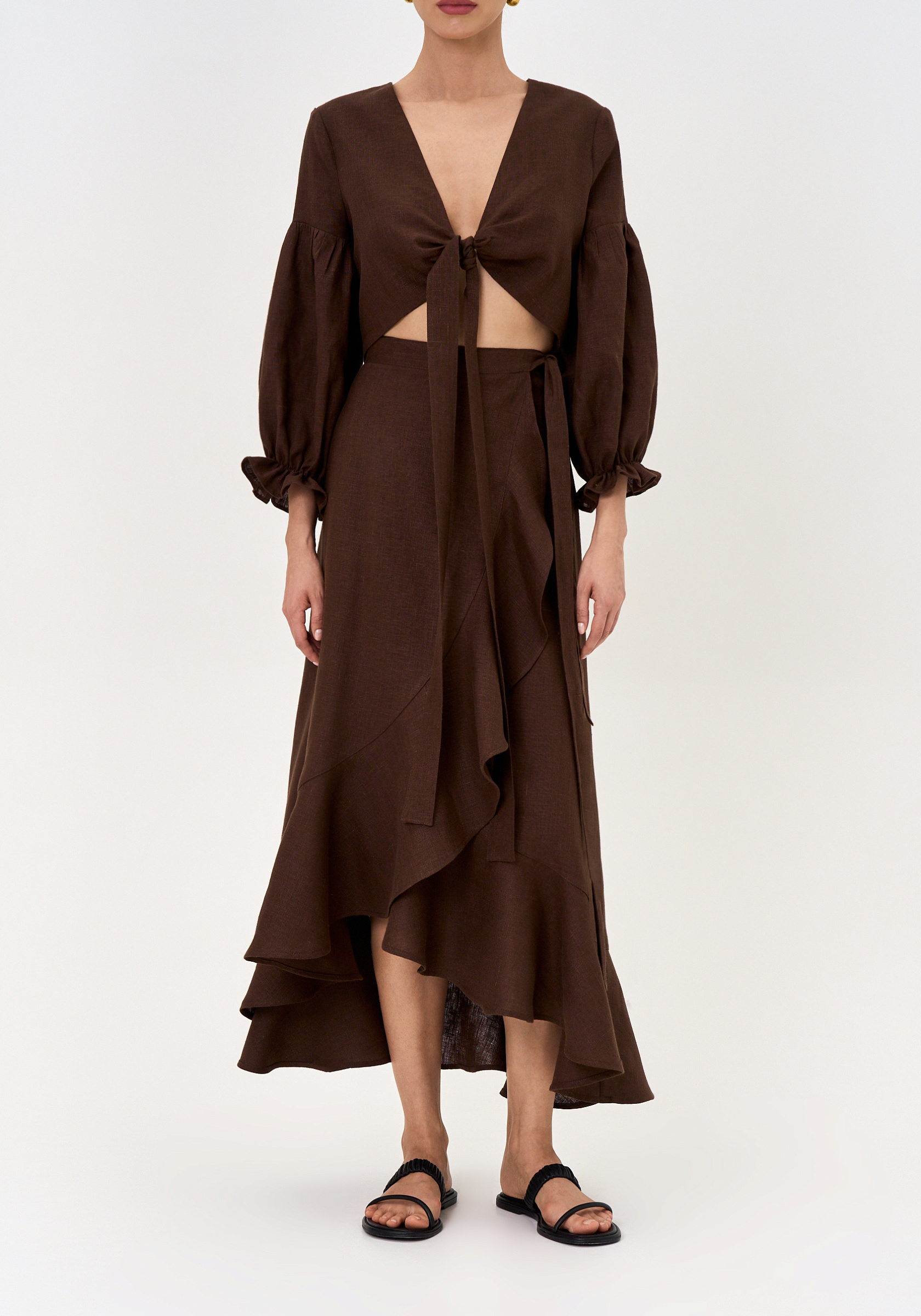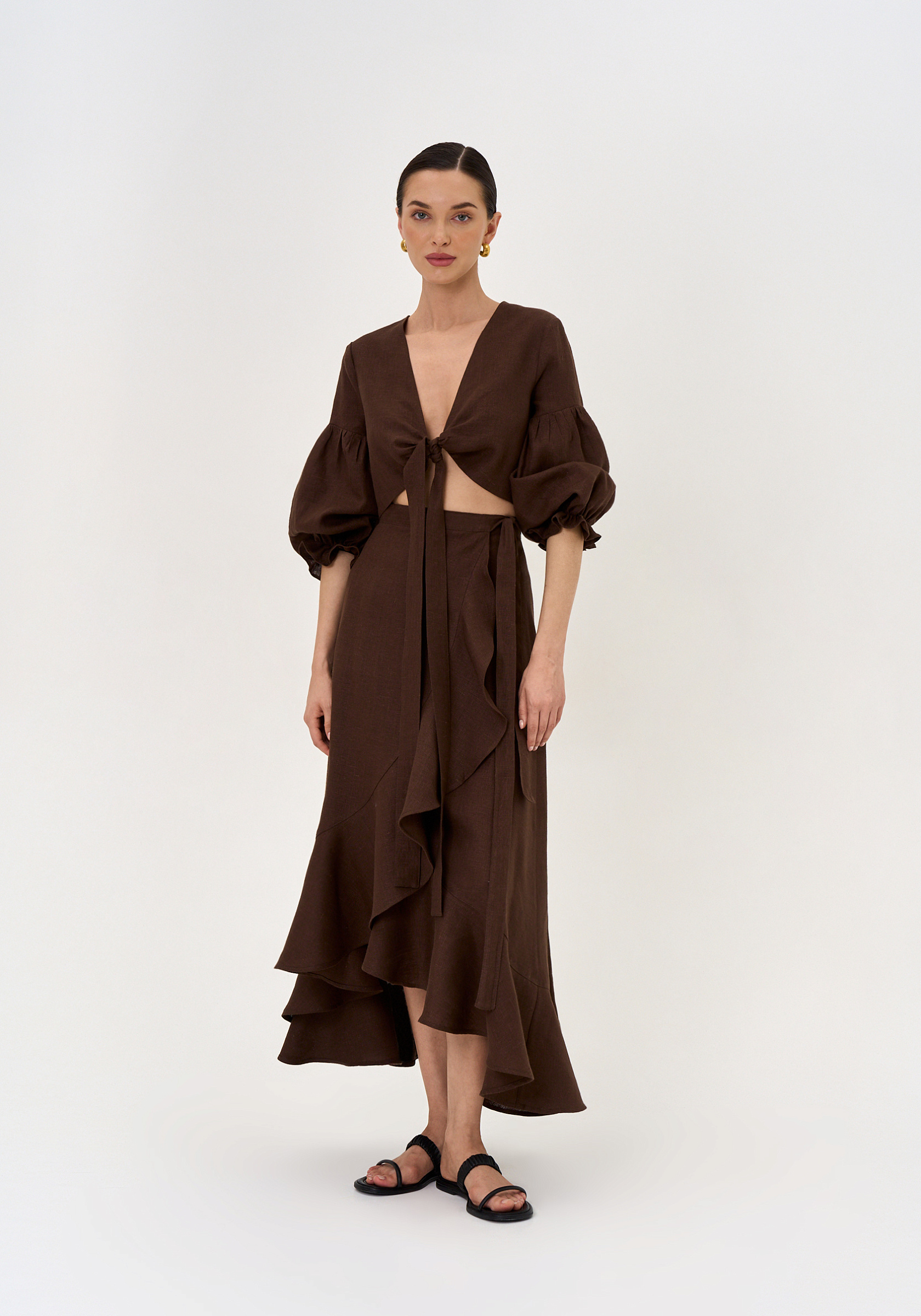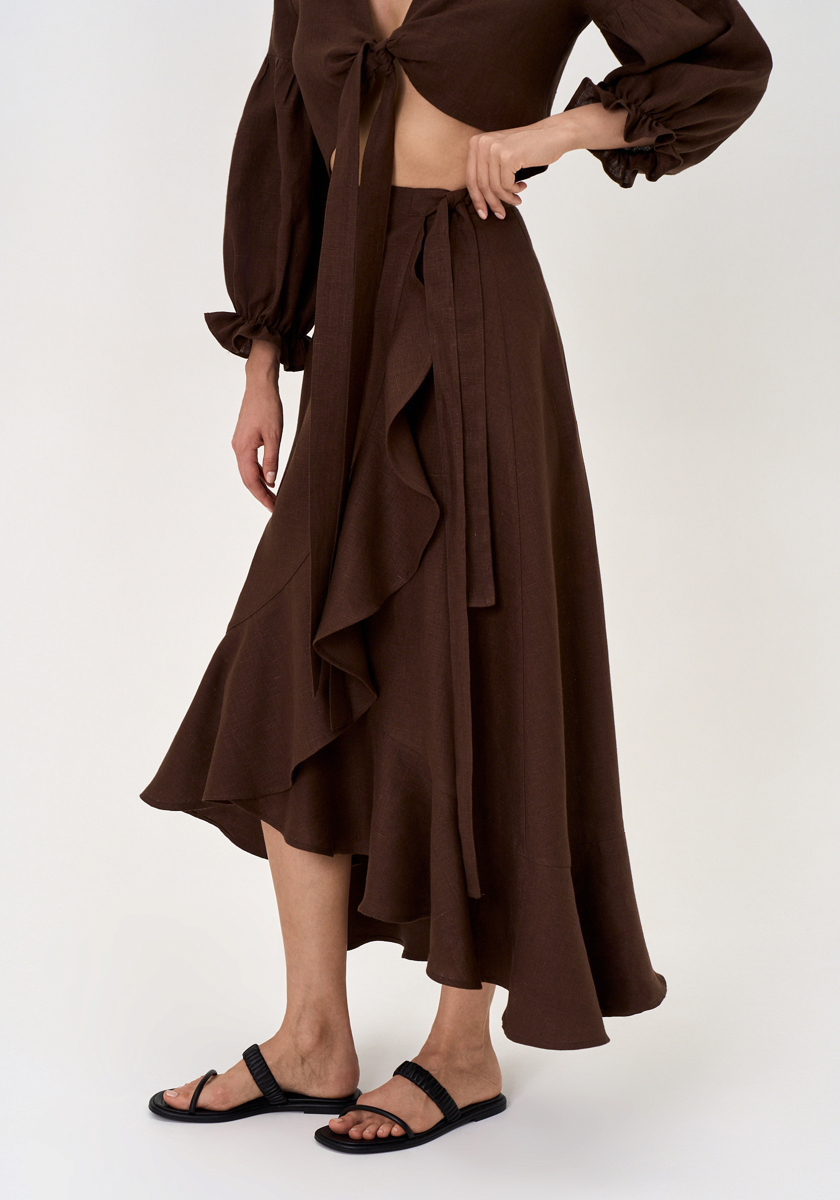 Юбка на запах из умягченного льна. С отделкой воланами по краю. Задаёт игривое и летнее настроение. Сочетайте юбку с льняной блузкой из нашей коллекции и носите комплектом или вещами вашего гардероба. Параметры изделия