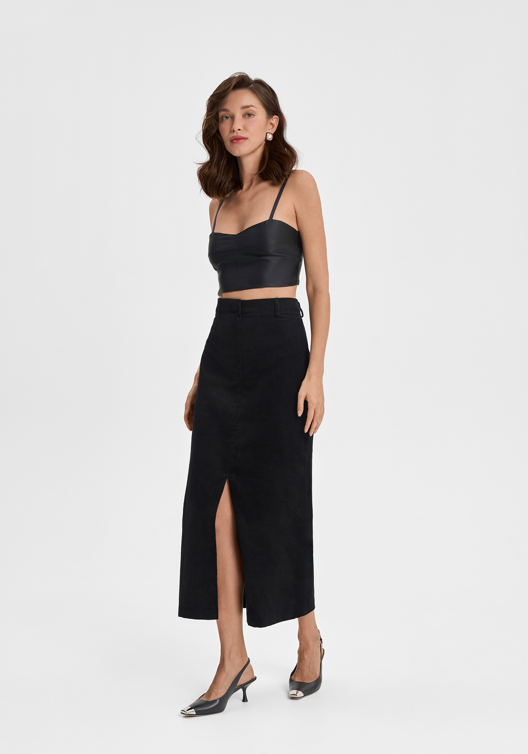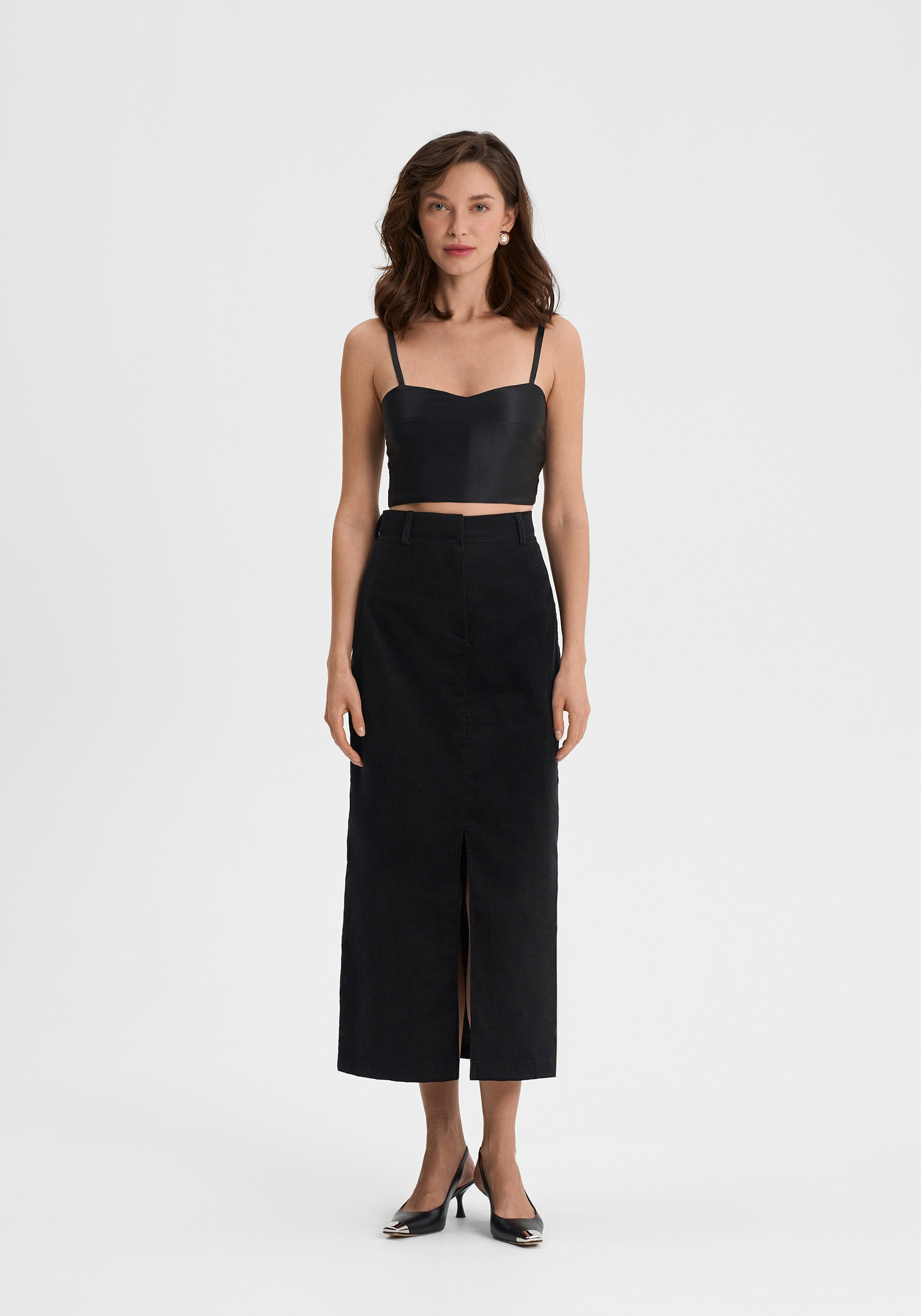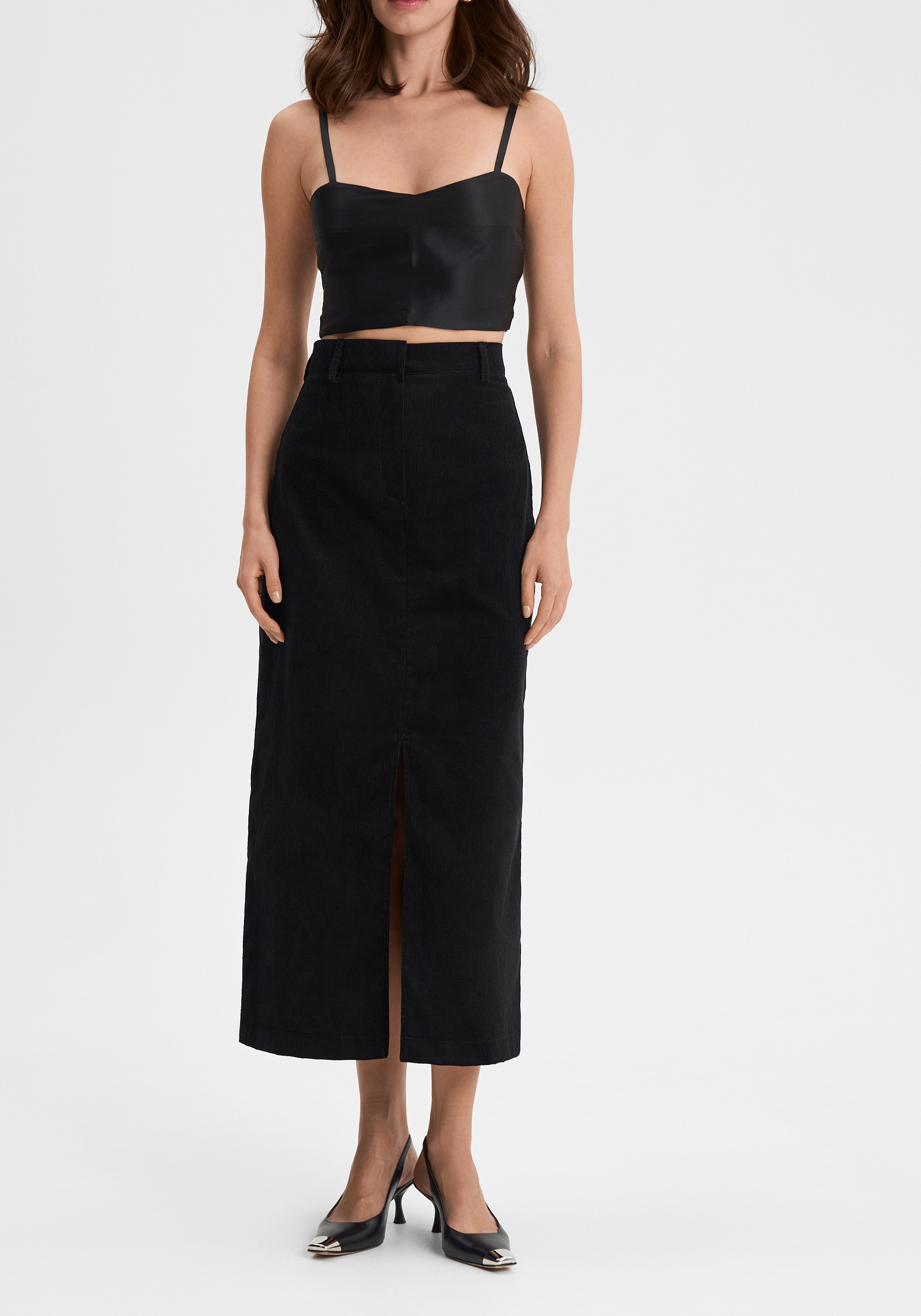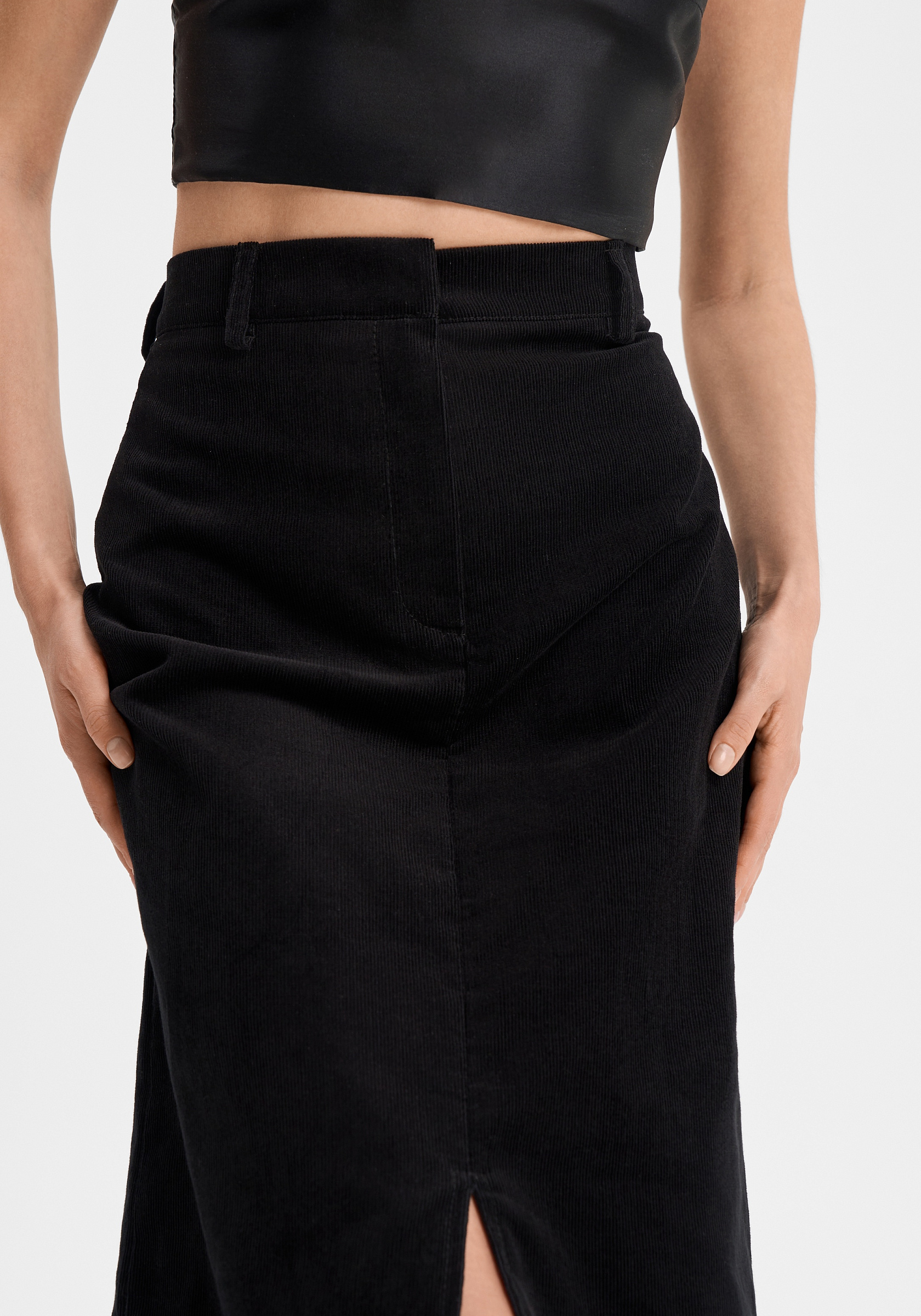 Юбка из 100% хлопкового вельвета — лаконичная и выразительная. Прямой силуэт с аккуратным разрезом спереди подчёркивает чистоту линии и мягкую структуру ткани. Модель выполнена без подклада, застёгивается на молнию и внутренний крючок, что сохраняет минимализм и аккуратность посадки.Фактура вельвета придаёт образу глубину и тактильную насыщенность, а плотный хлопок держит форму, оставаясь комфортным в движении. Универсальная длина миди делает юбку уместной как в повседневных, так и в более собранных сочетаниях.