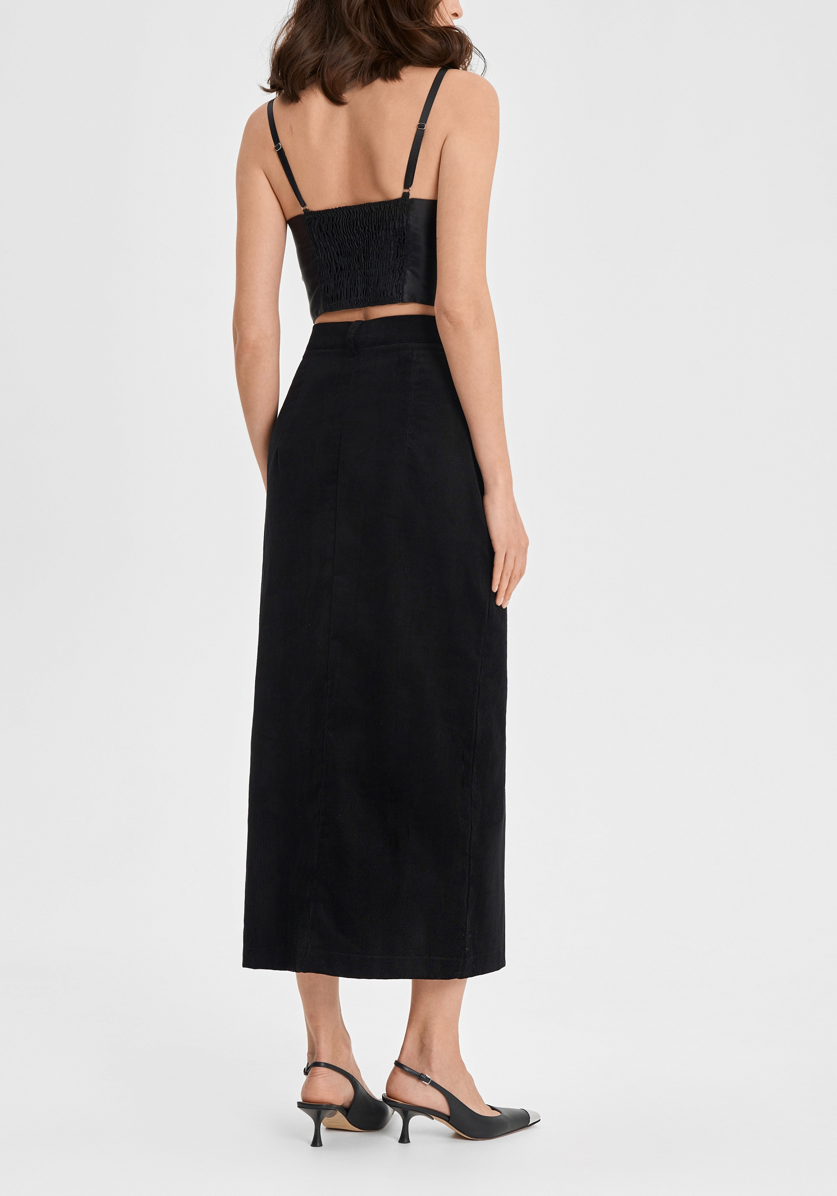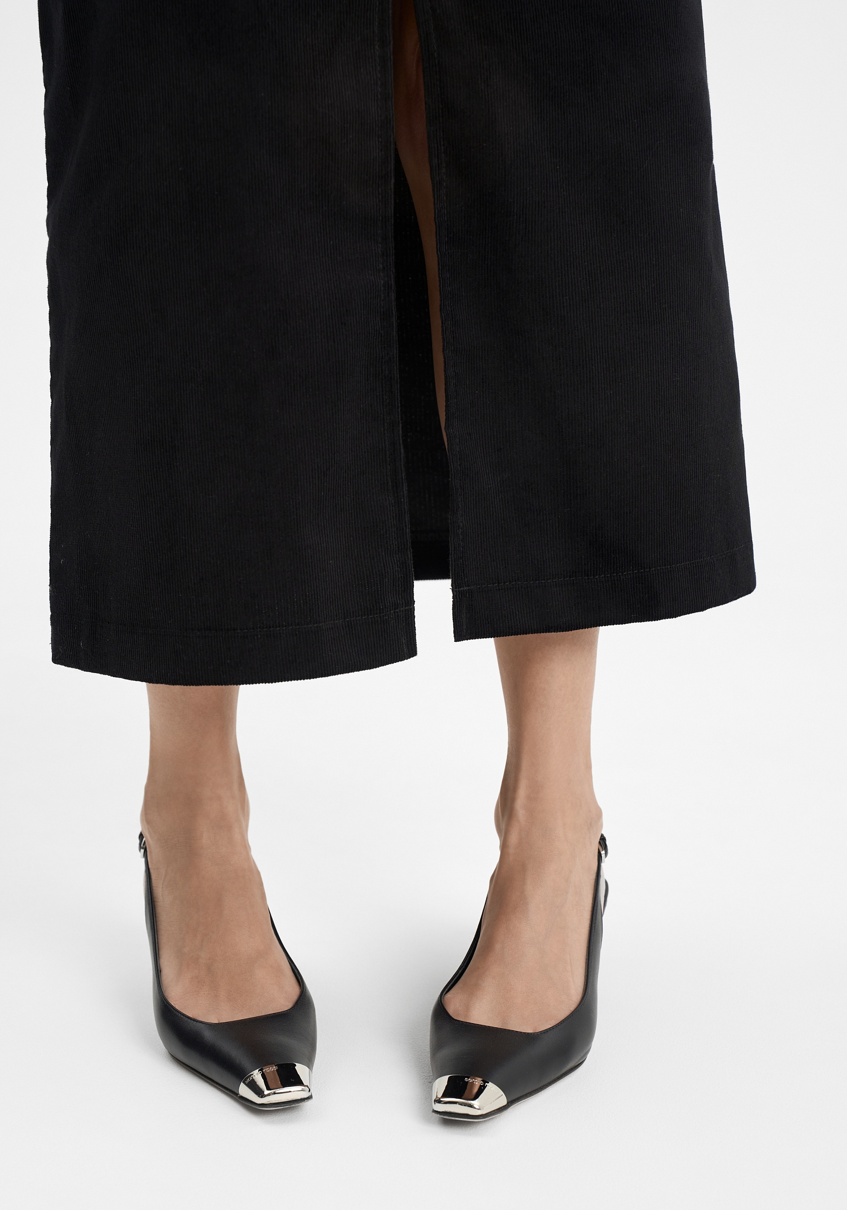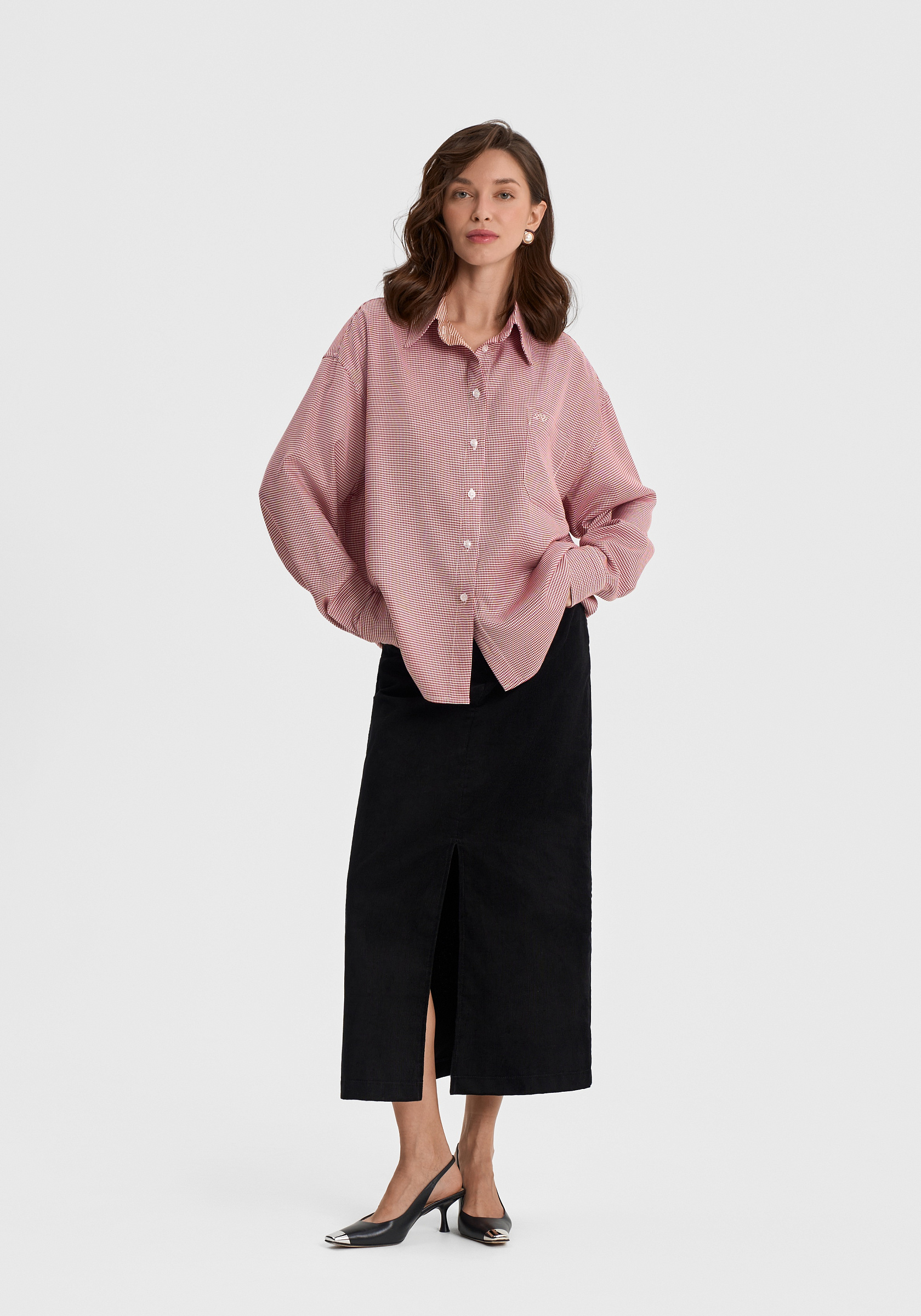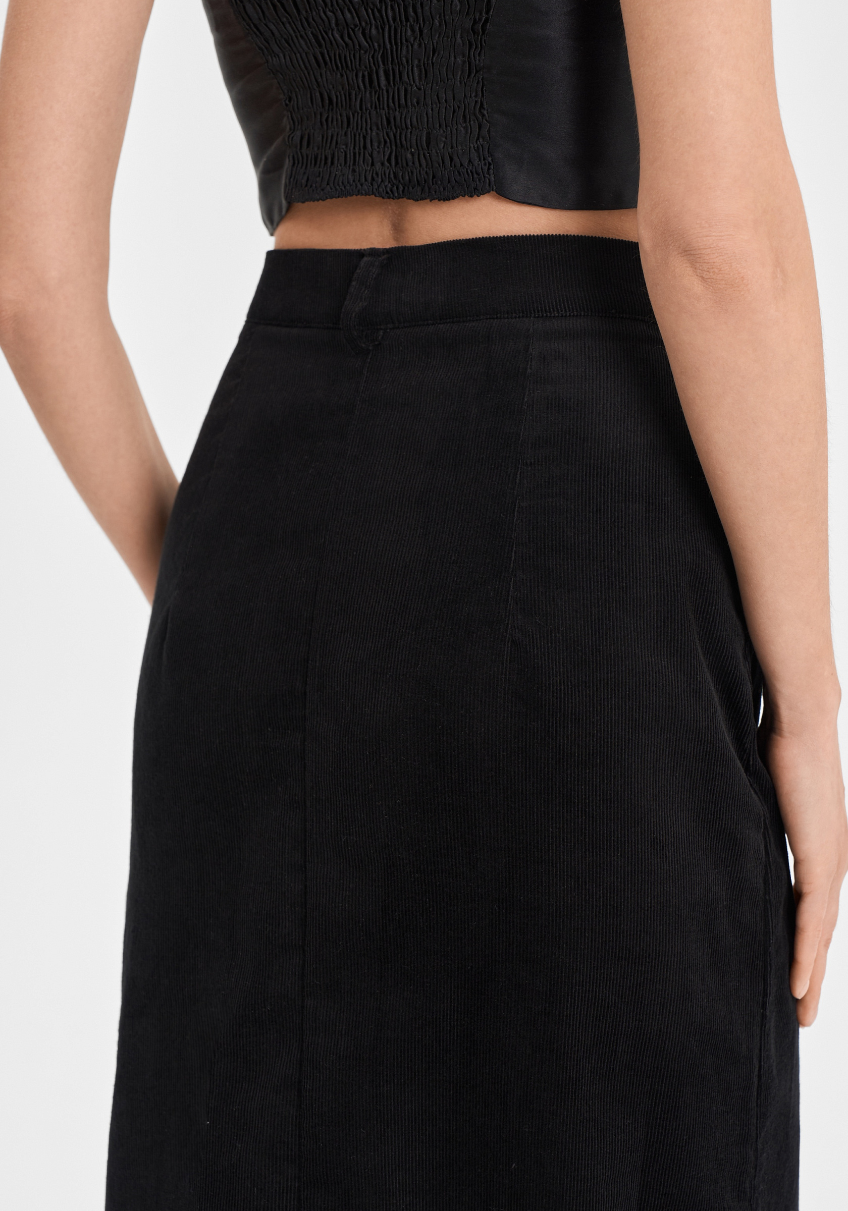 Юбка из 100% хлопкового вельвета — лаконичная и выразительная. Прямой силуэт с аккуратным разрезом спереди подчёркивает чистоту линии и мягкую структуру ткани. Модель выполнена без подклада, застёгивается на молнию и внутренний крючок, что сохраняет минимализм и аккуратность посадки.Фактура вельвета придаёт образу глубину и тактильную насыщенность, а плотный хлопок держит форму, оставаясь комфортным в движении. Универсальная длина миди делает юбку уместной как в повседневных, так и в более собранных сочетаниях.