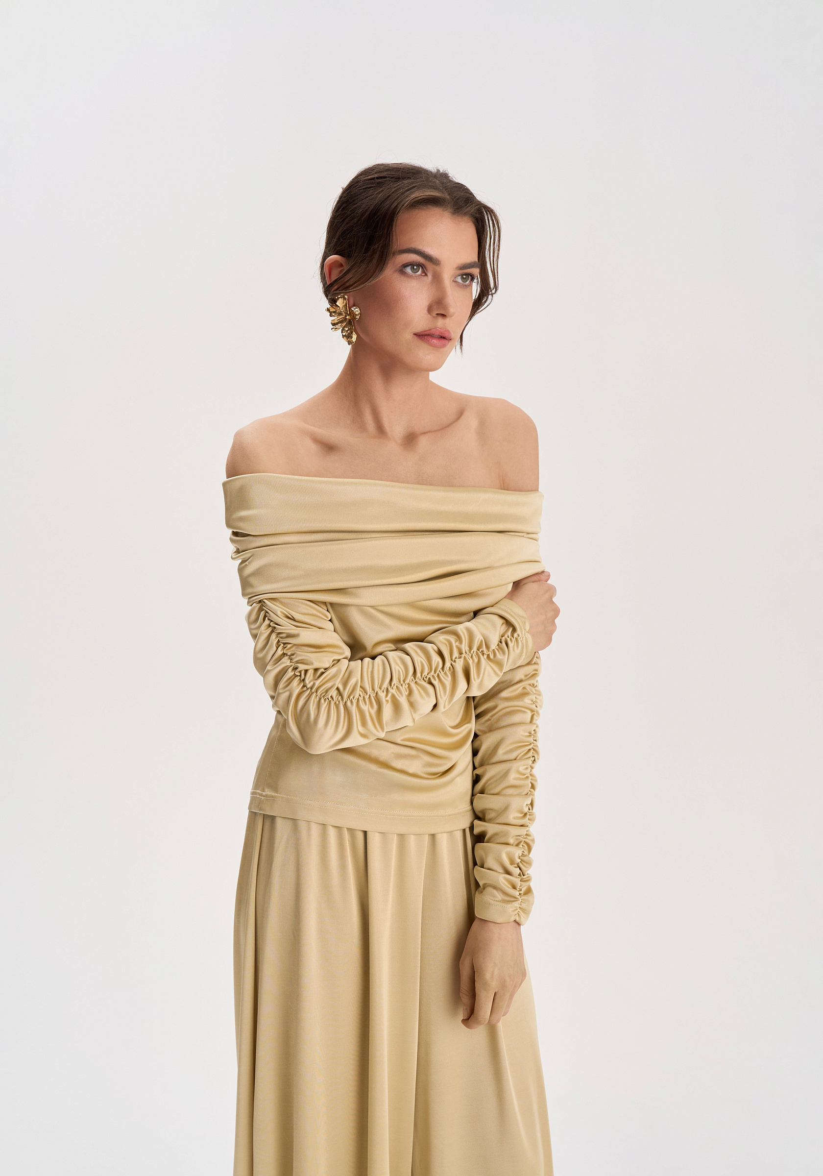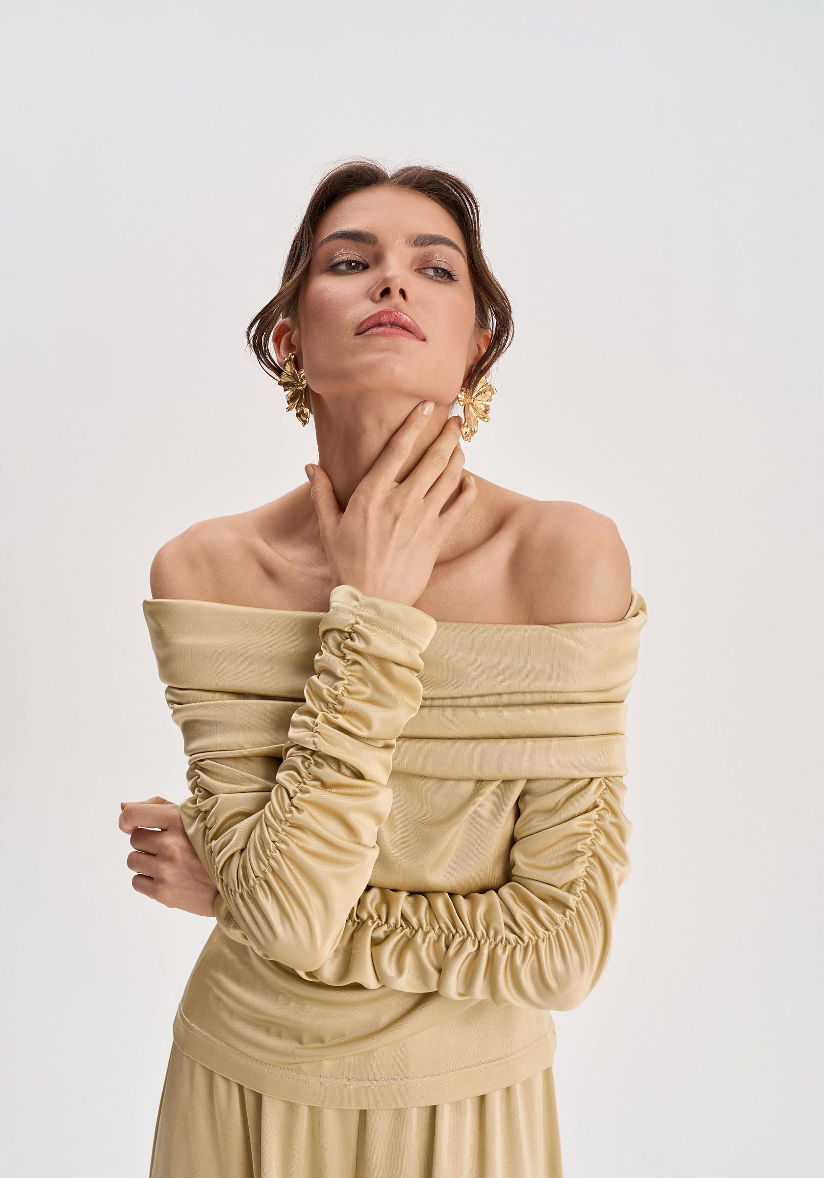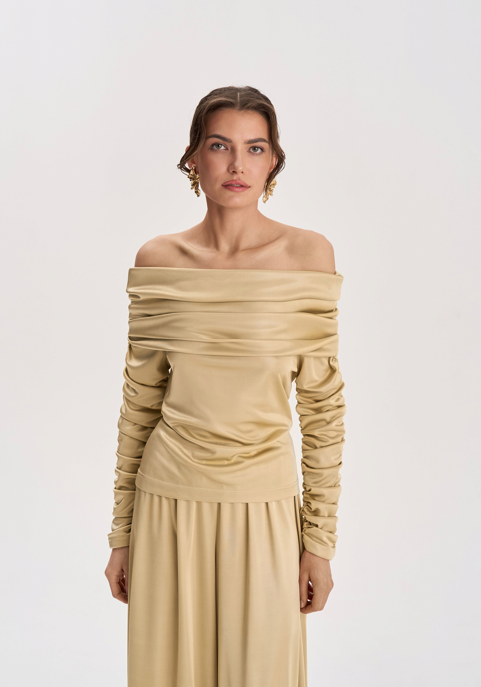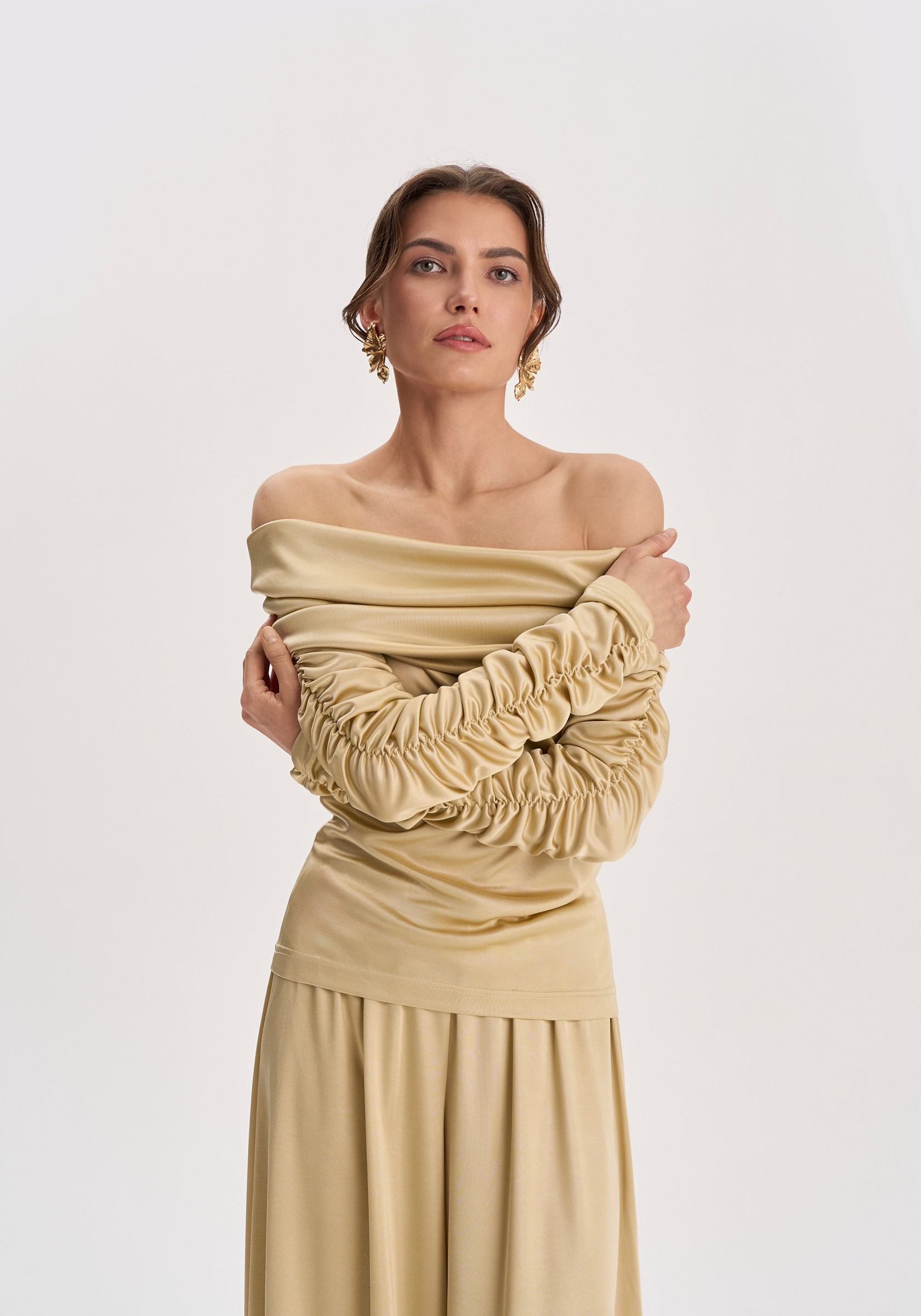 Джемпер с открытыми плечами: прилегающий силуэт, длинный рукав с драпировкой. Выполнен из мягчайшего шерстяного трикотажа, дышащего и сохраняющего тепло. Параметры изделия