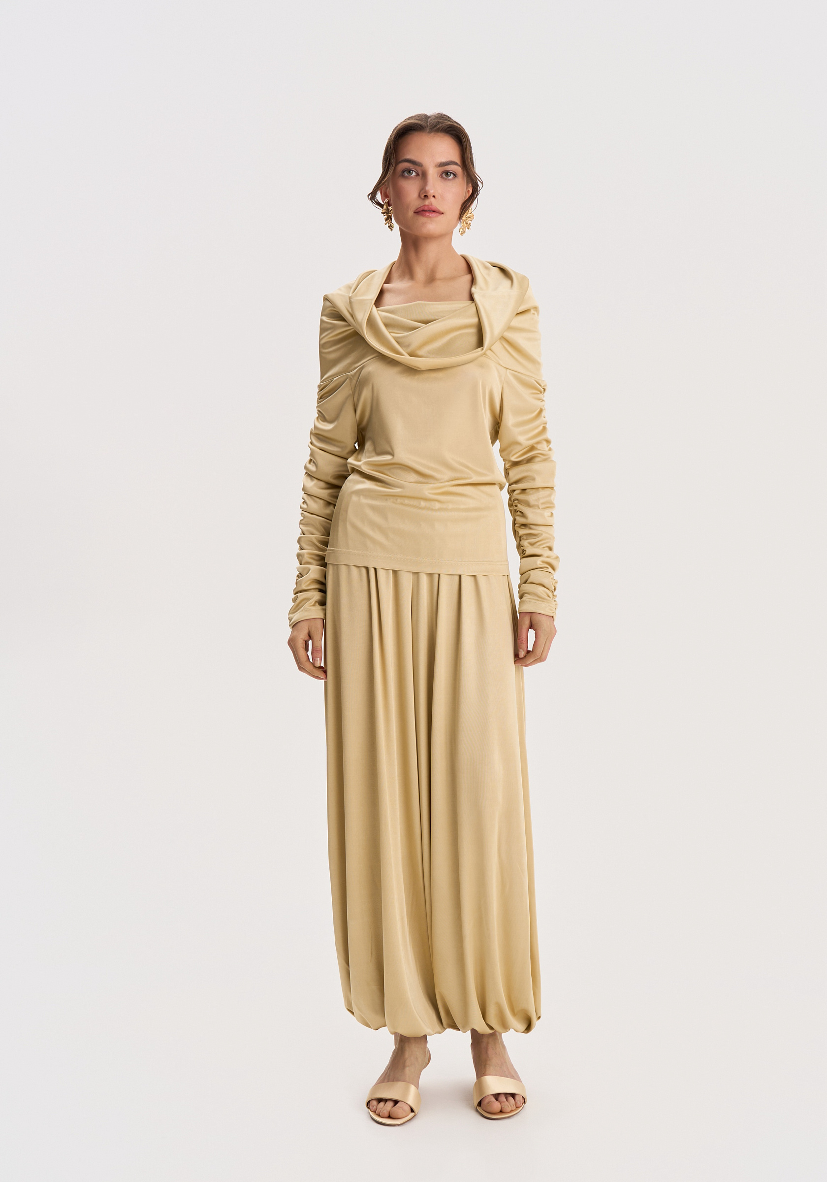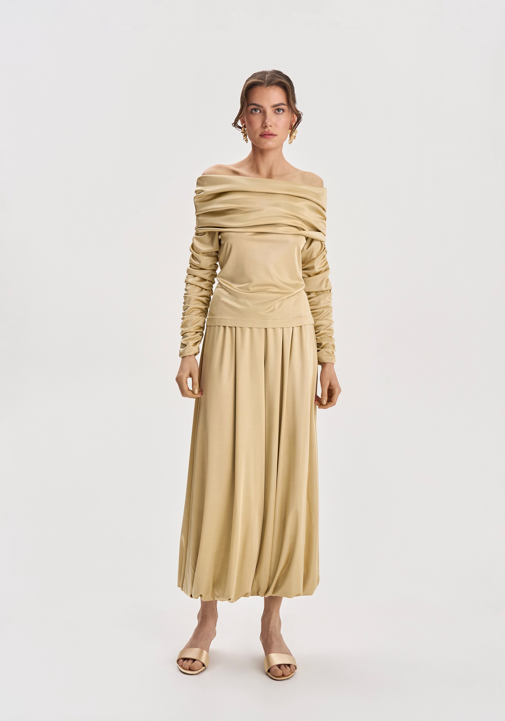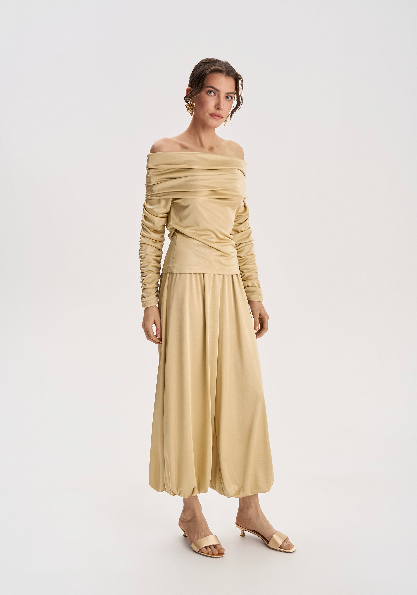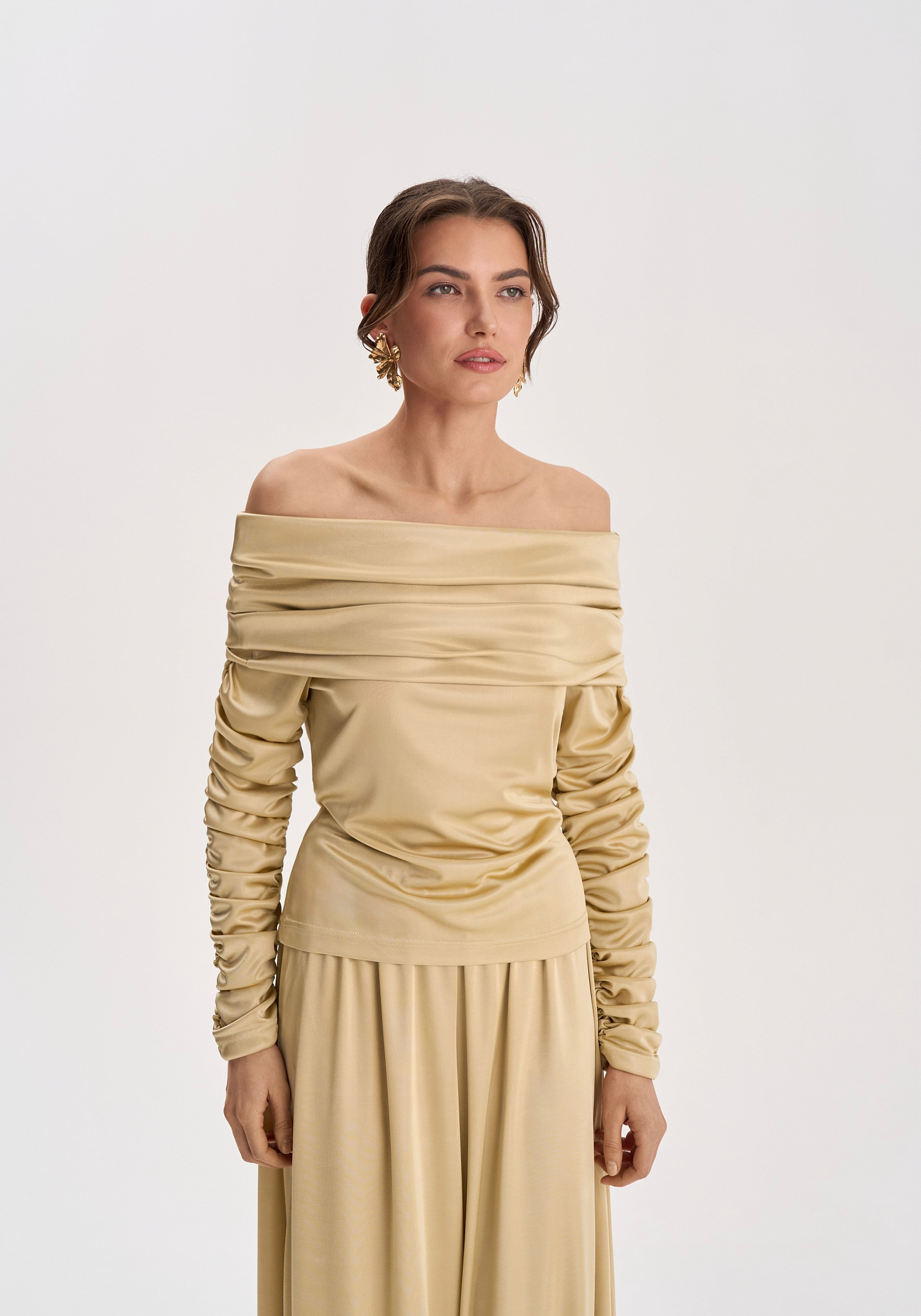 Джемпер с открытыми плечами: прилегающий силуэт, длинный рукав с драпировкой. Выполнен из мягчайшего шерстяного трикотажа, дышащего и сохраняющего тепло. Параметры изделия