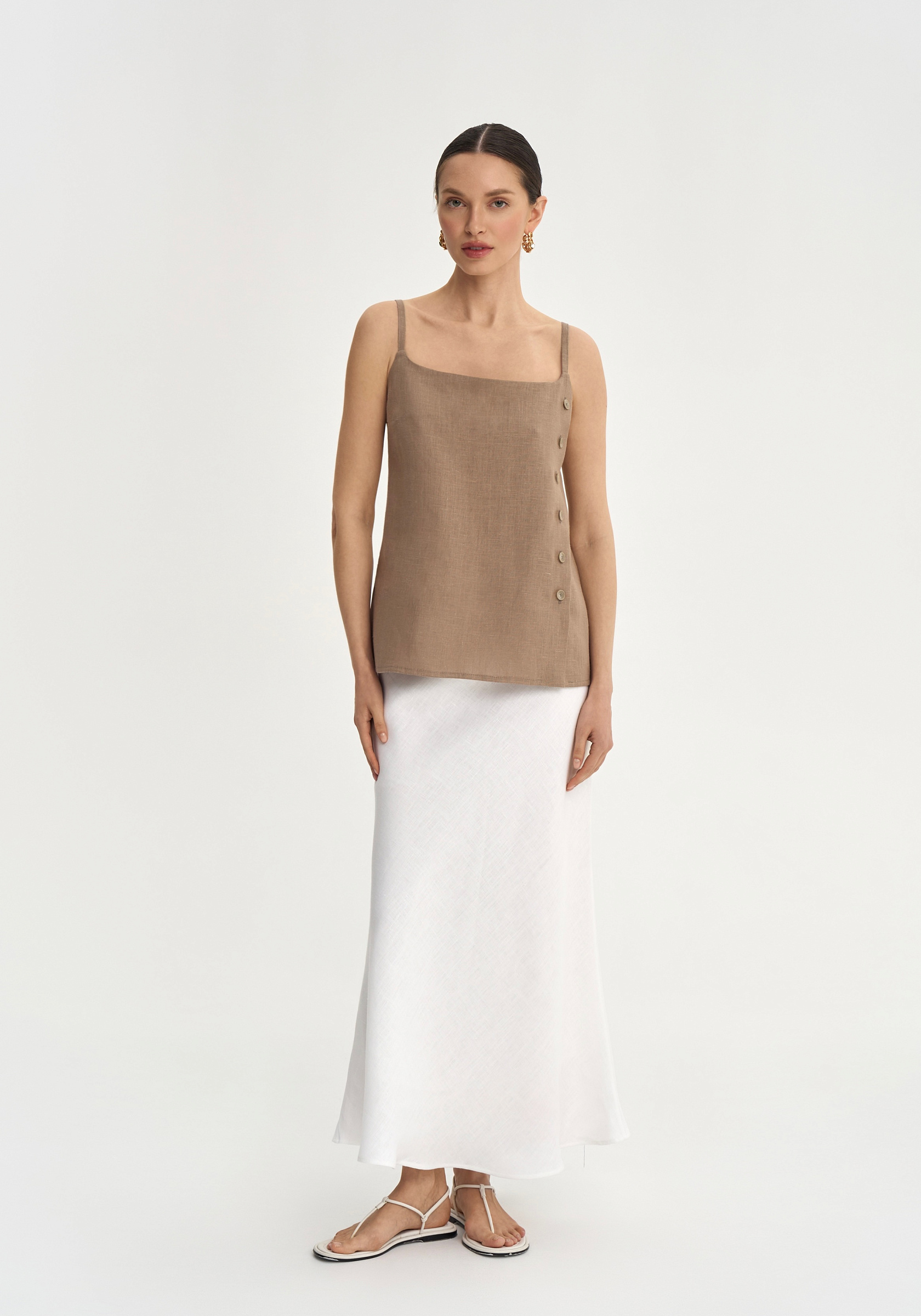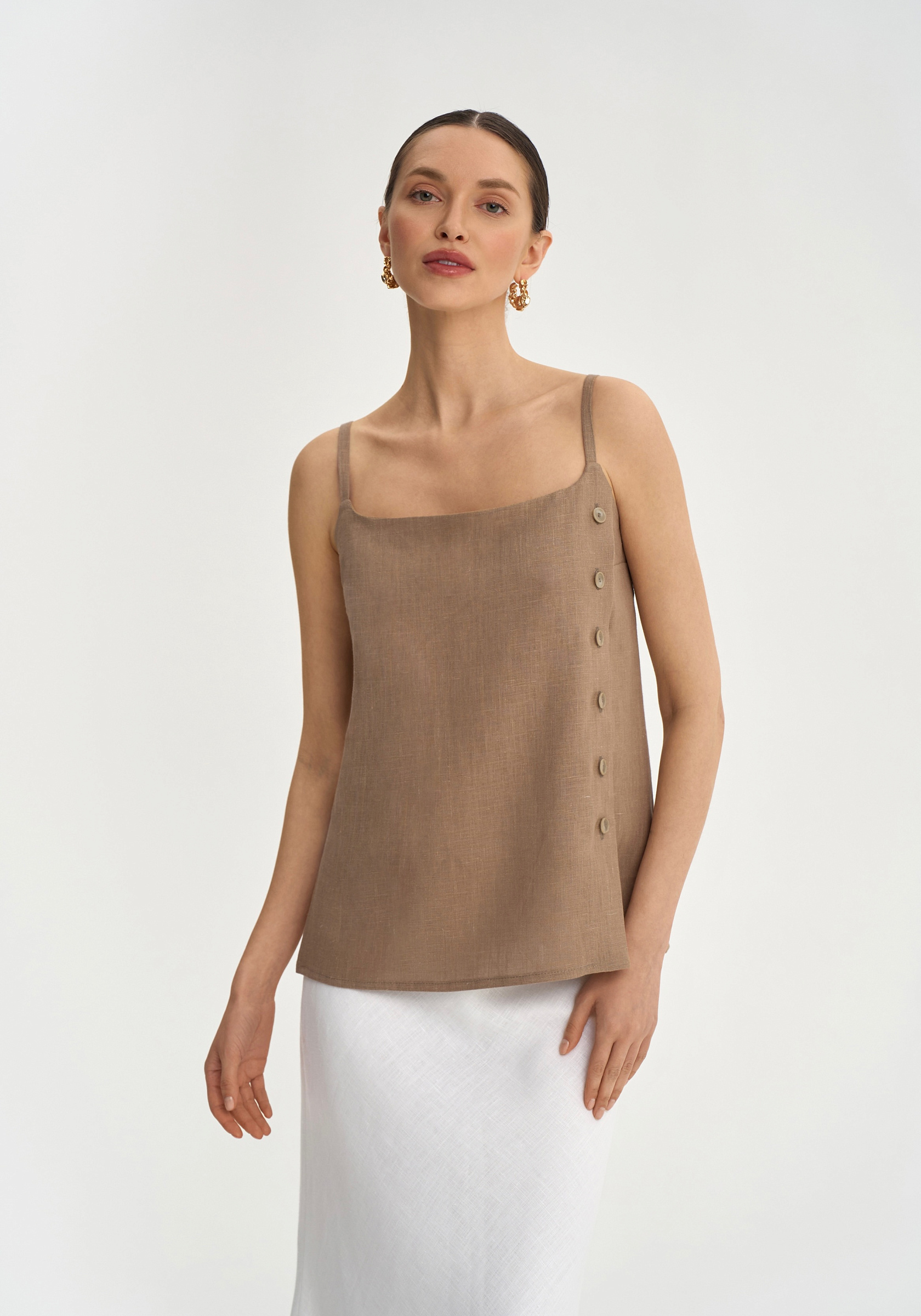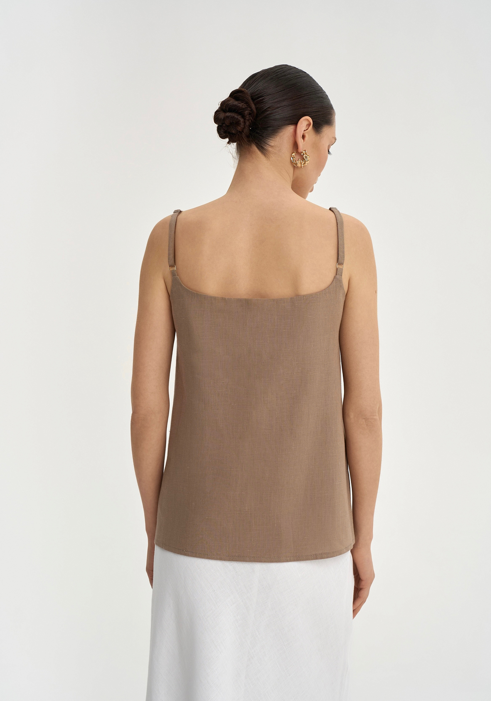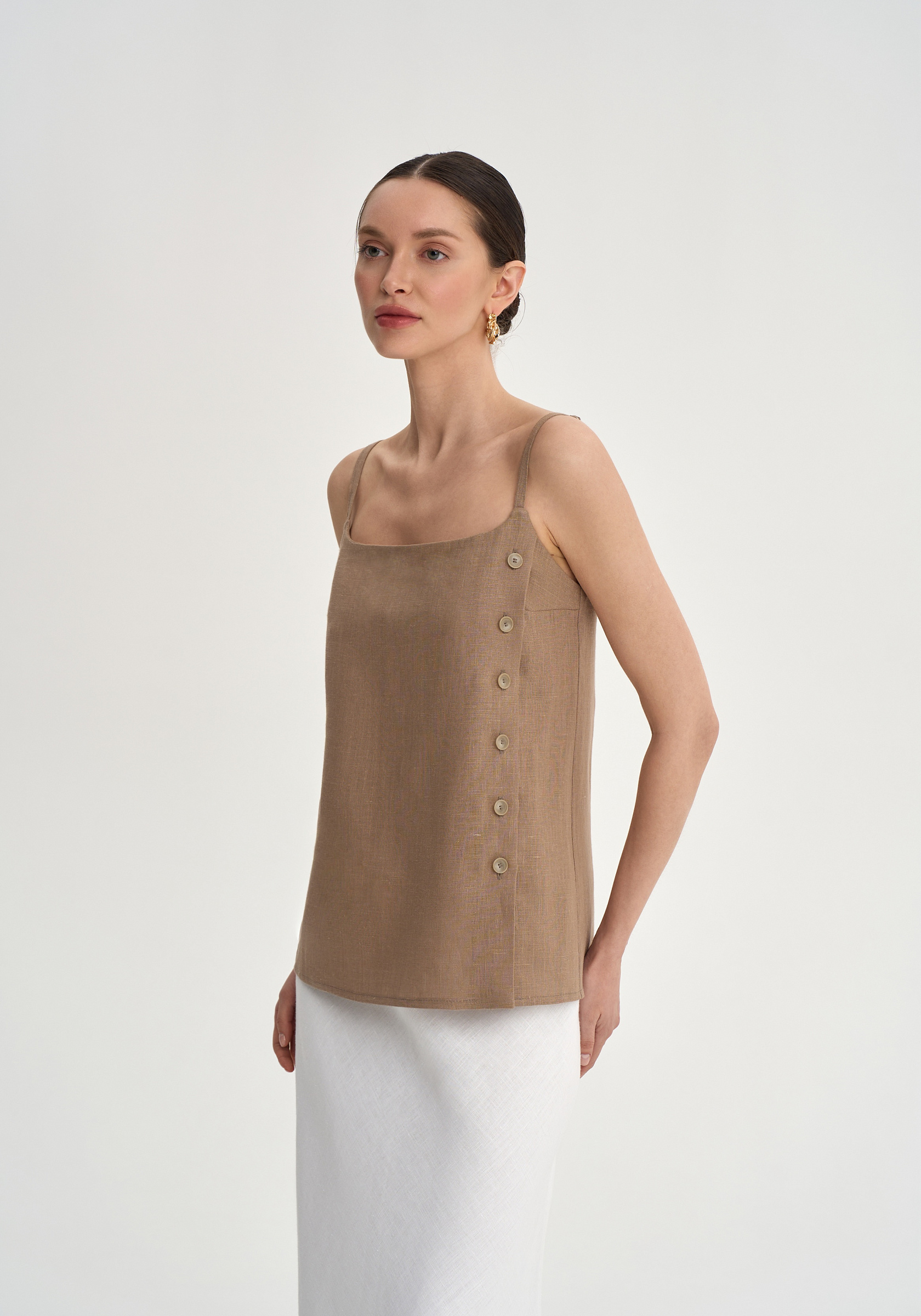 Топ из 100% умягченного льна прямого силуэта. Тонкие регулируемые бретели и открытая линия плеч делают модель легкой и лаконичной.