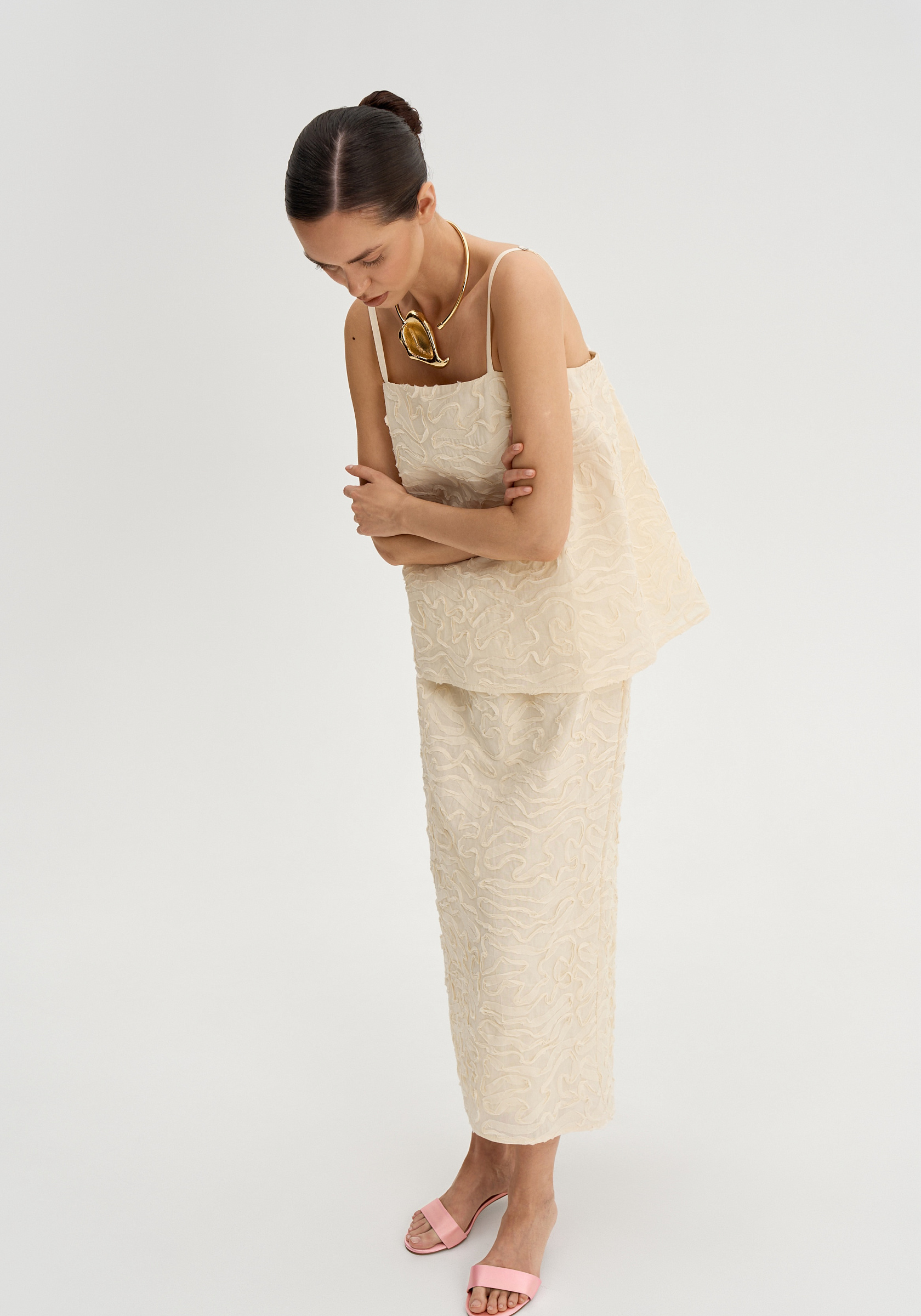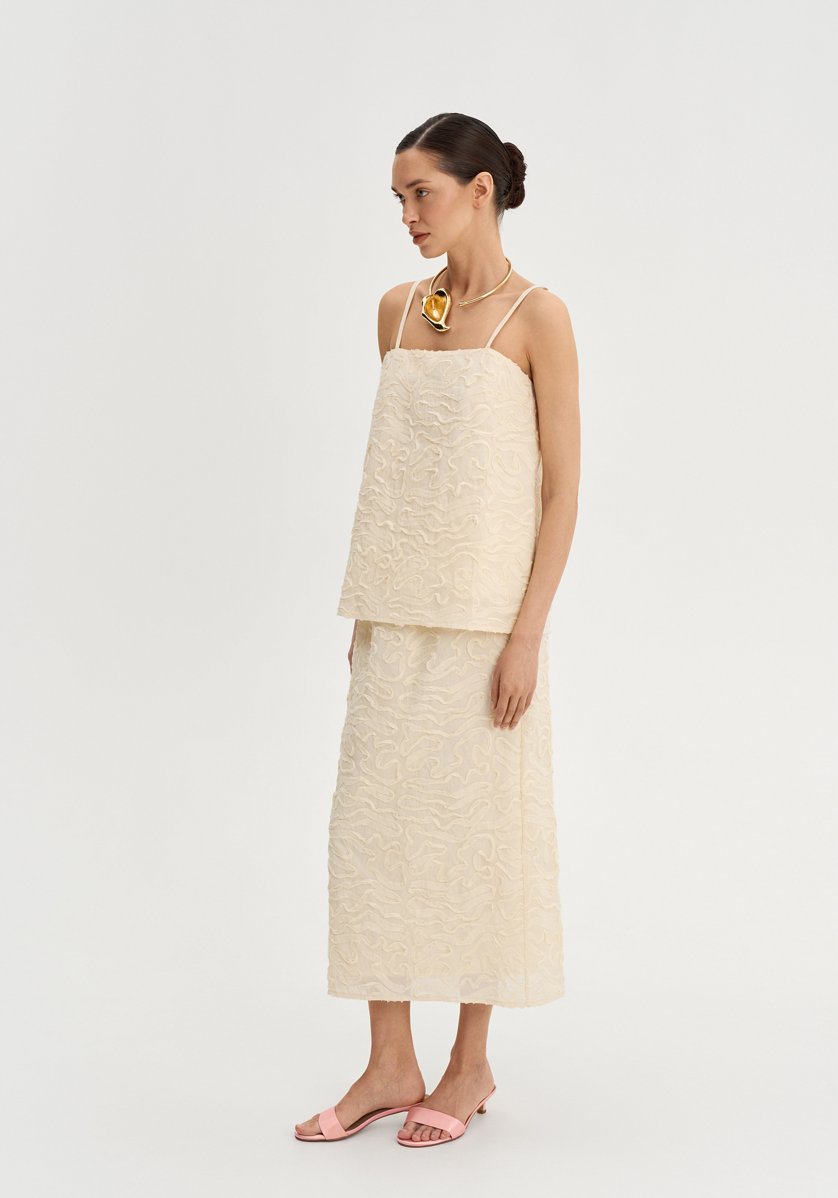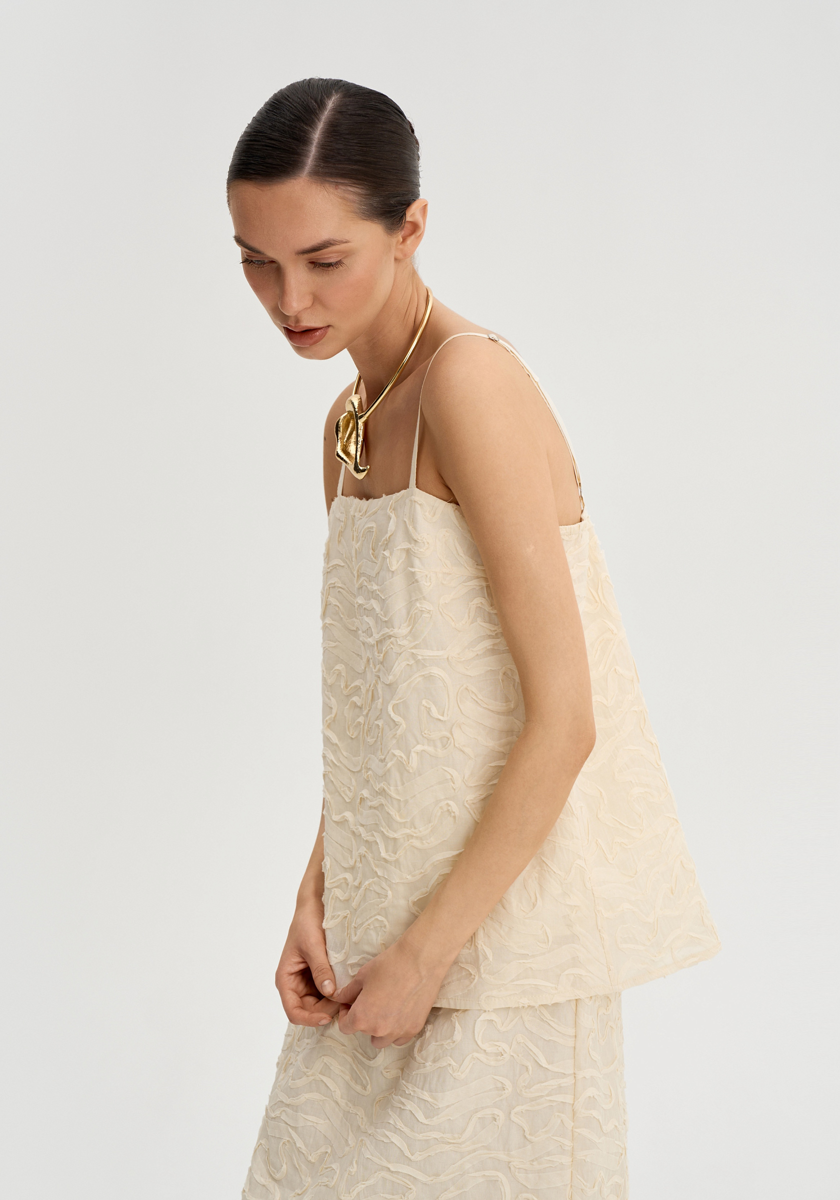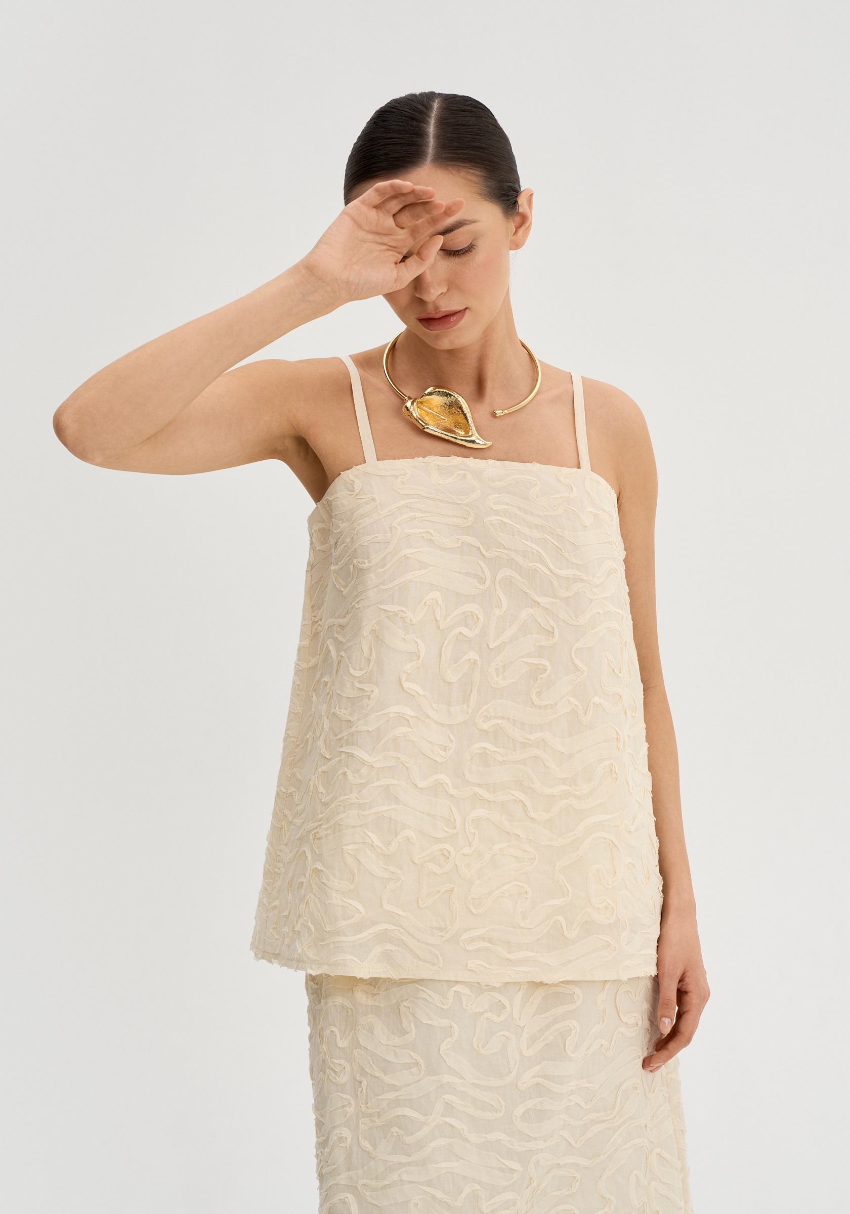 Трапециевидный силуэт мягко отходит от тела и создает легкое, воздушное движение. Тонкие регулируемые бретели подчеркивают хрупкость линии плеч, а открытая зона декольте делает образ более нежным и утонченным.