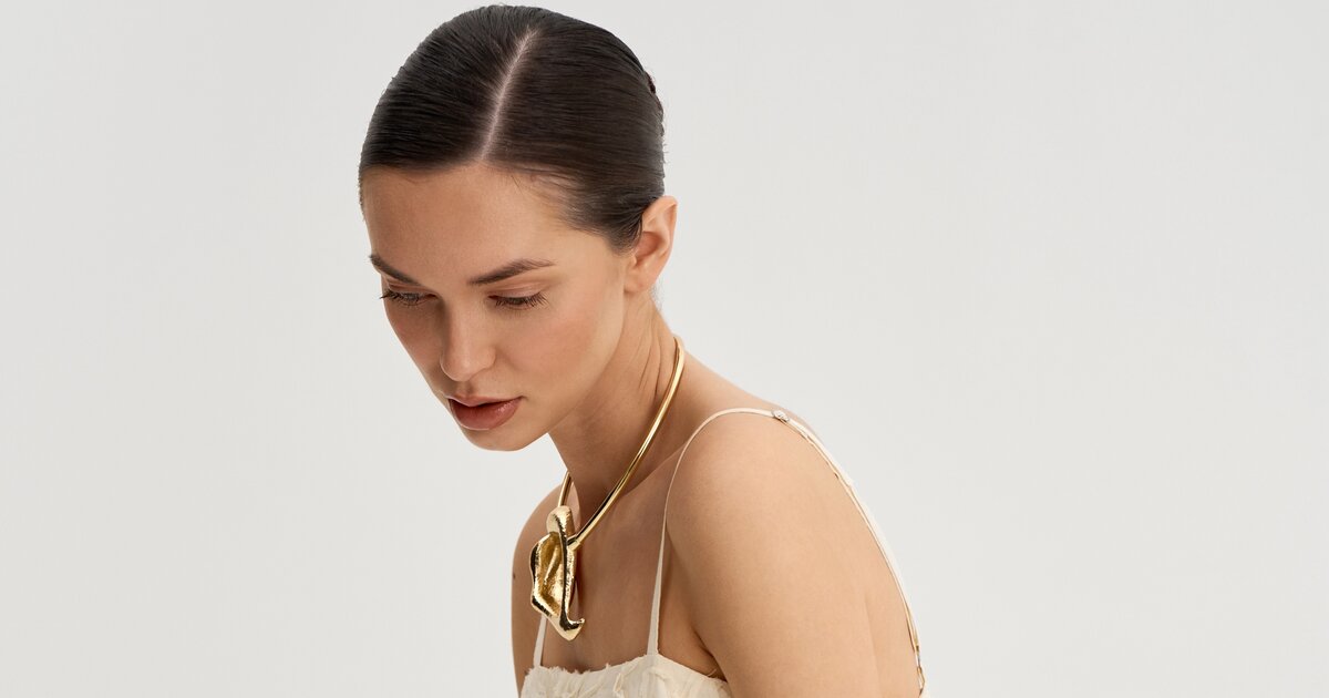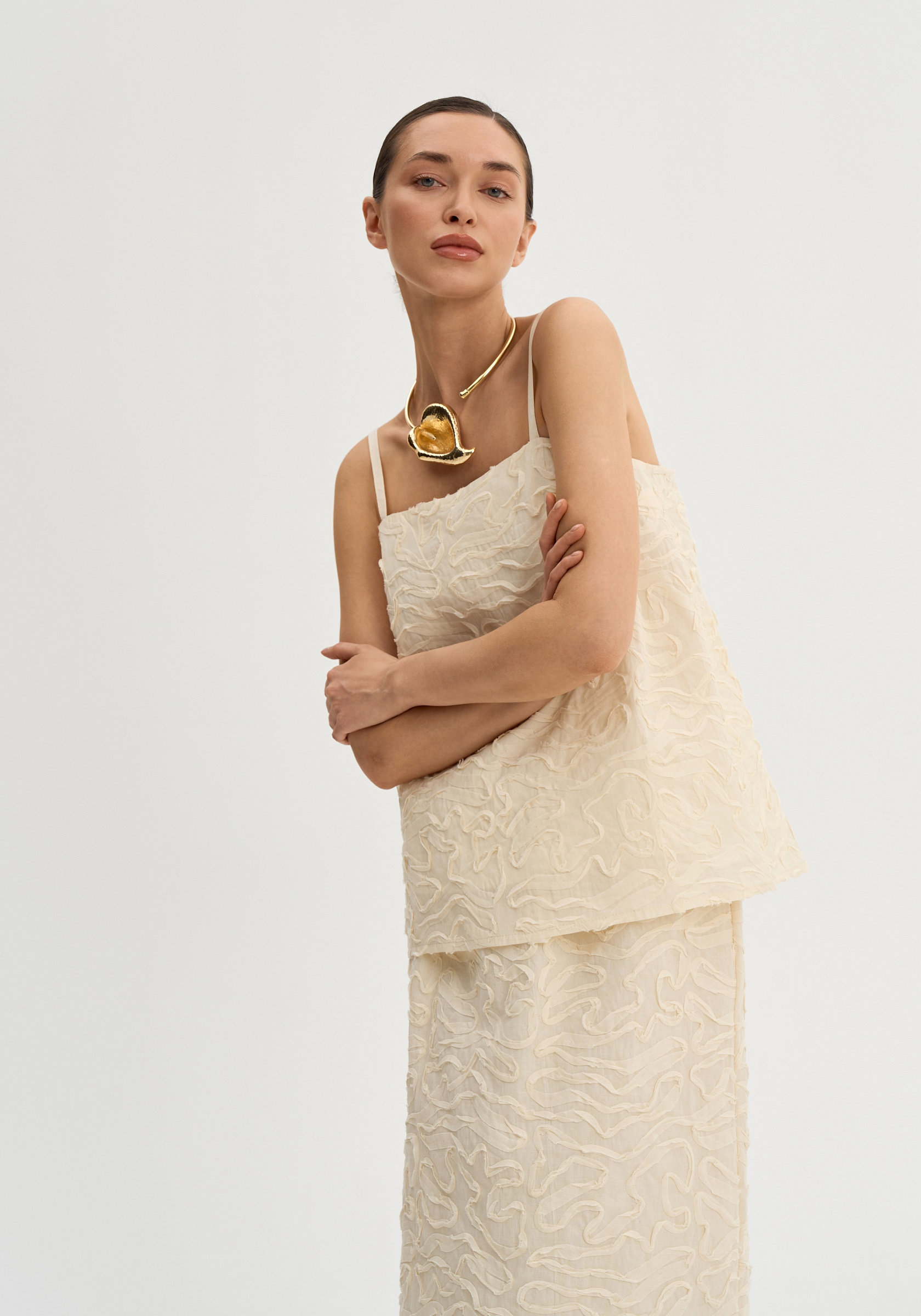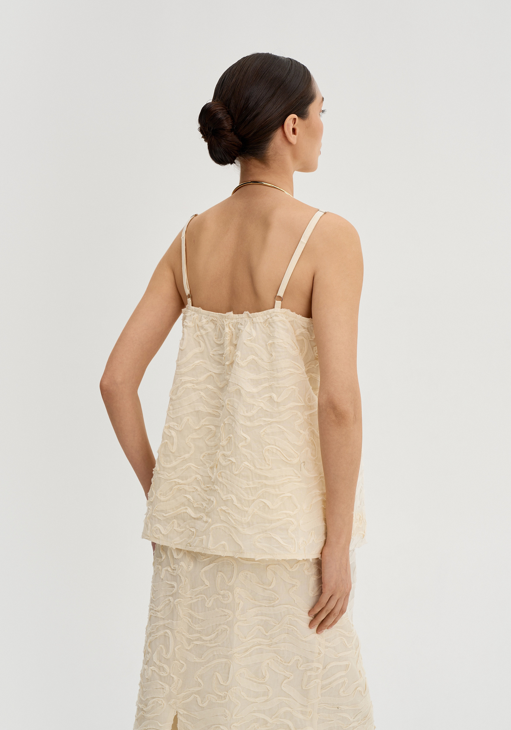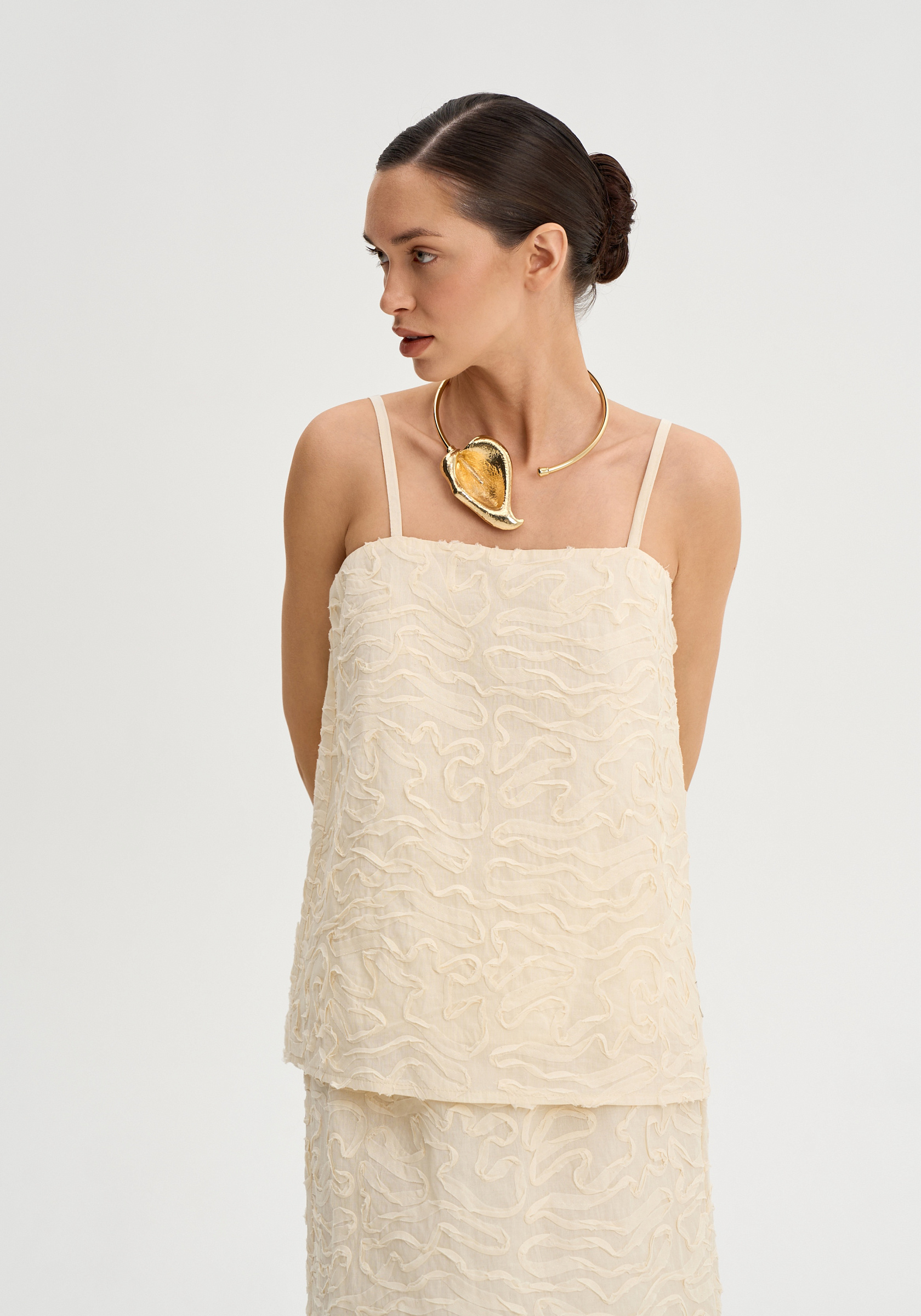 Трапециевидный силуэт мягко отходит от тела и создает легкое, воздушное движение. Тонкие регулируемые бретели подчеркивают хрупкость линии плеч, а открытая зона декольте делает образ более нежным и утонченным.