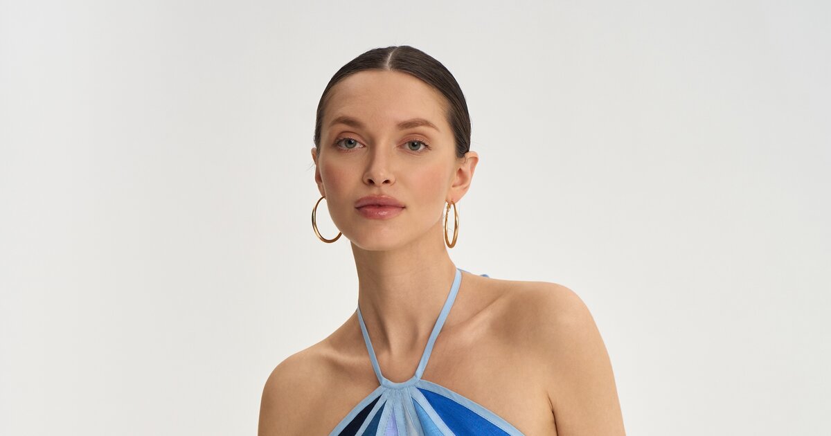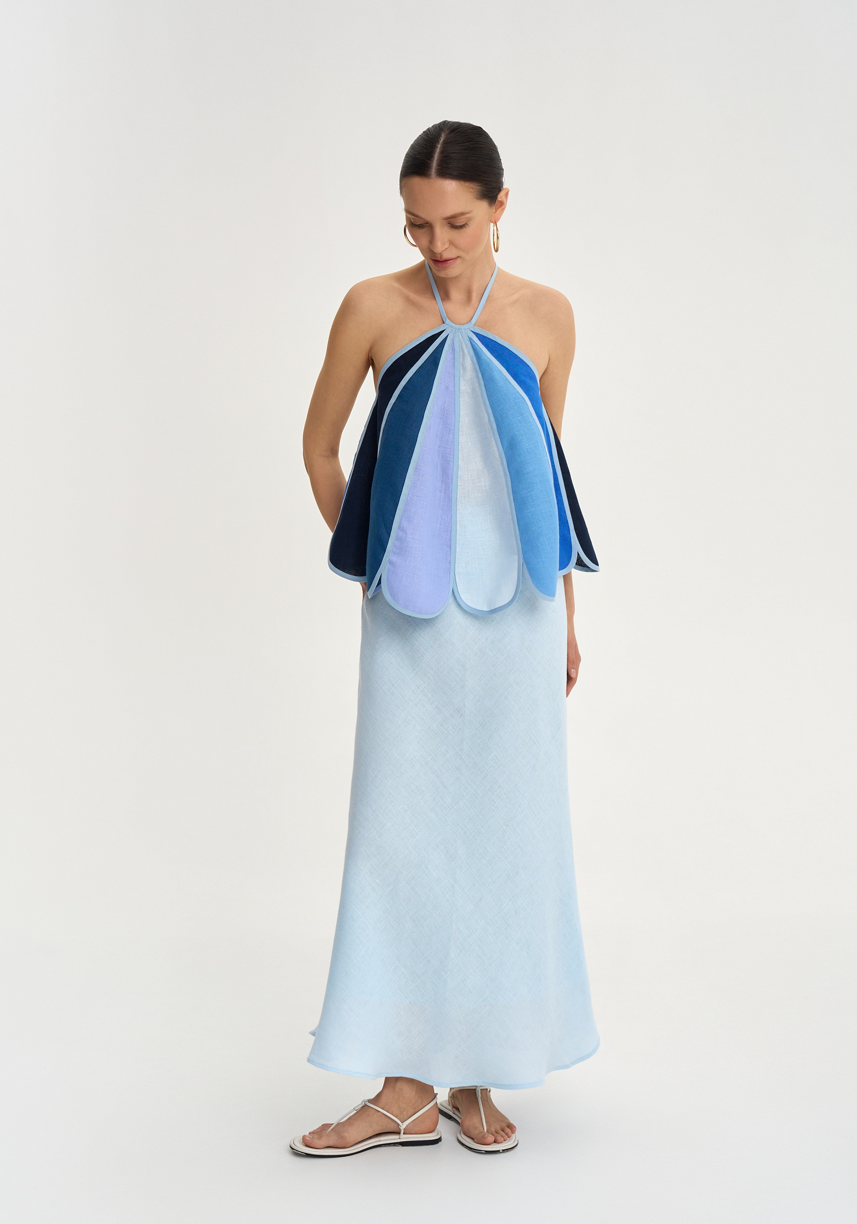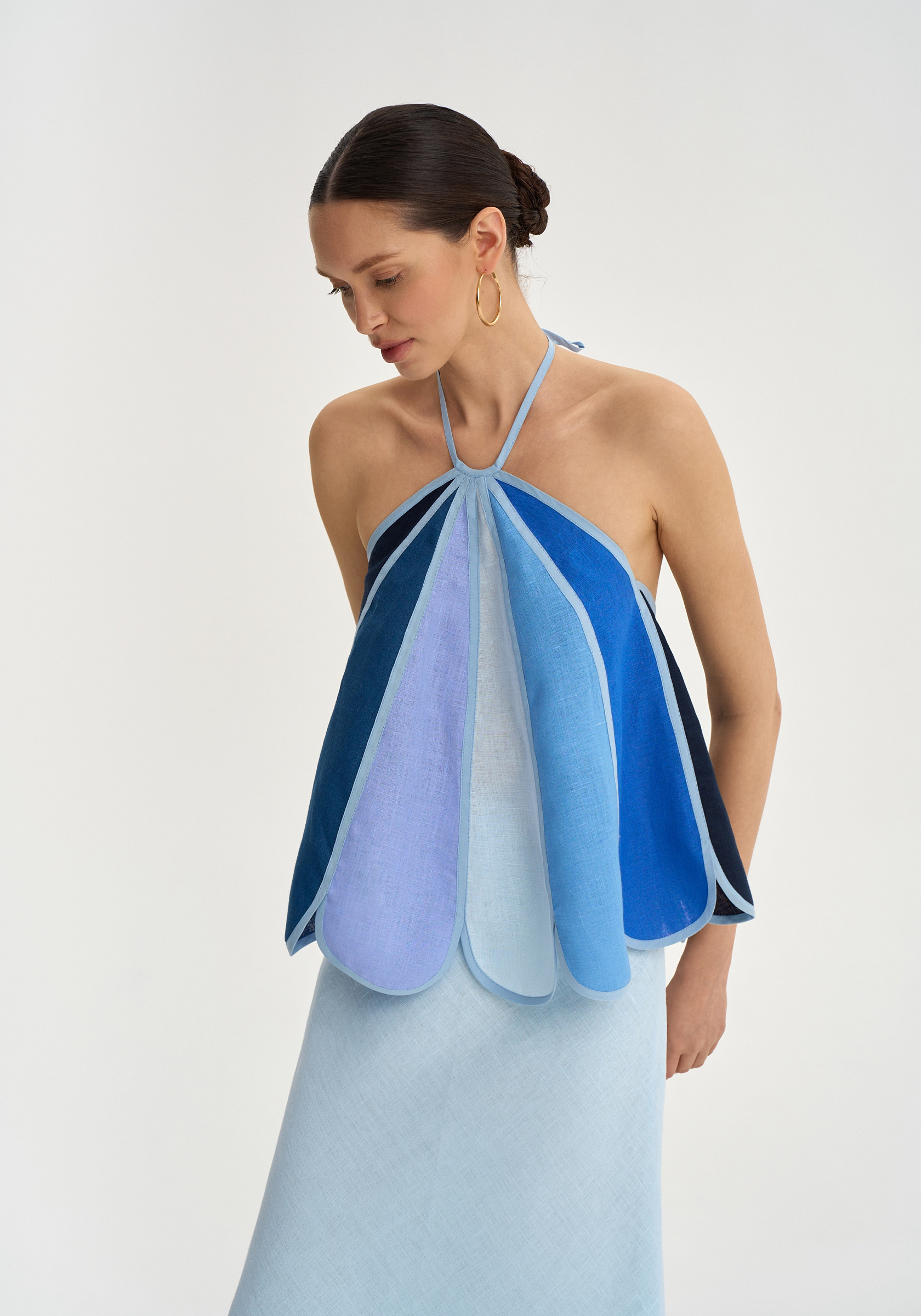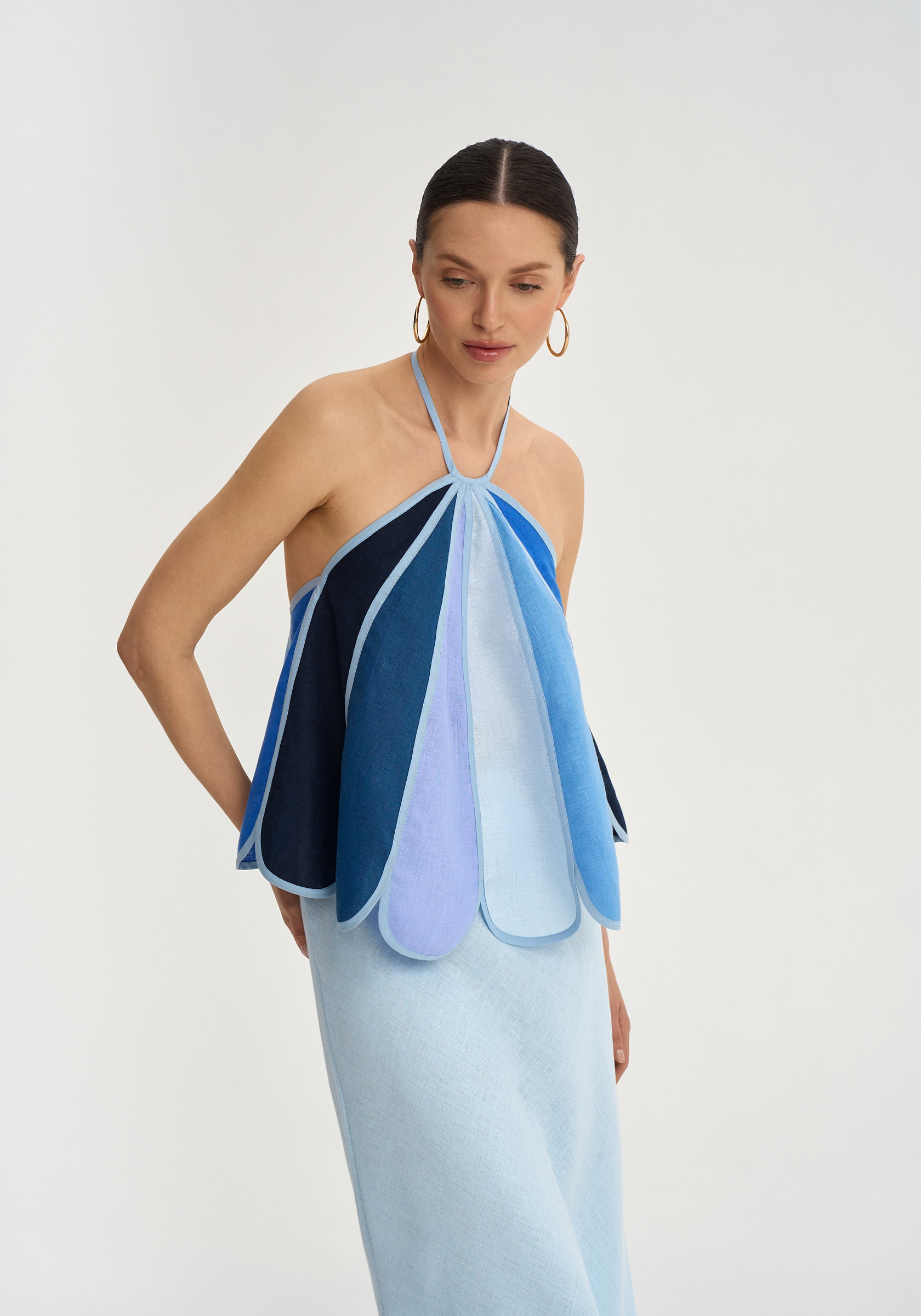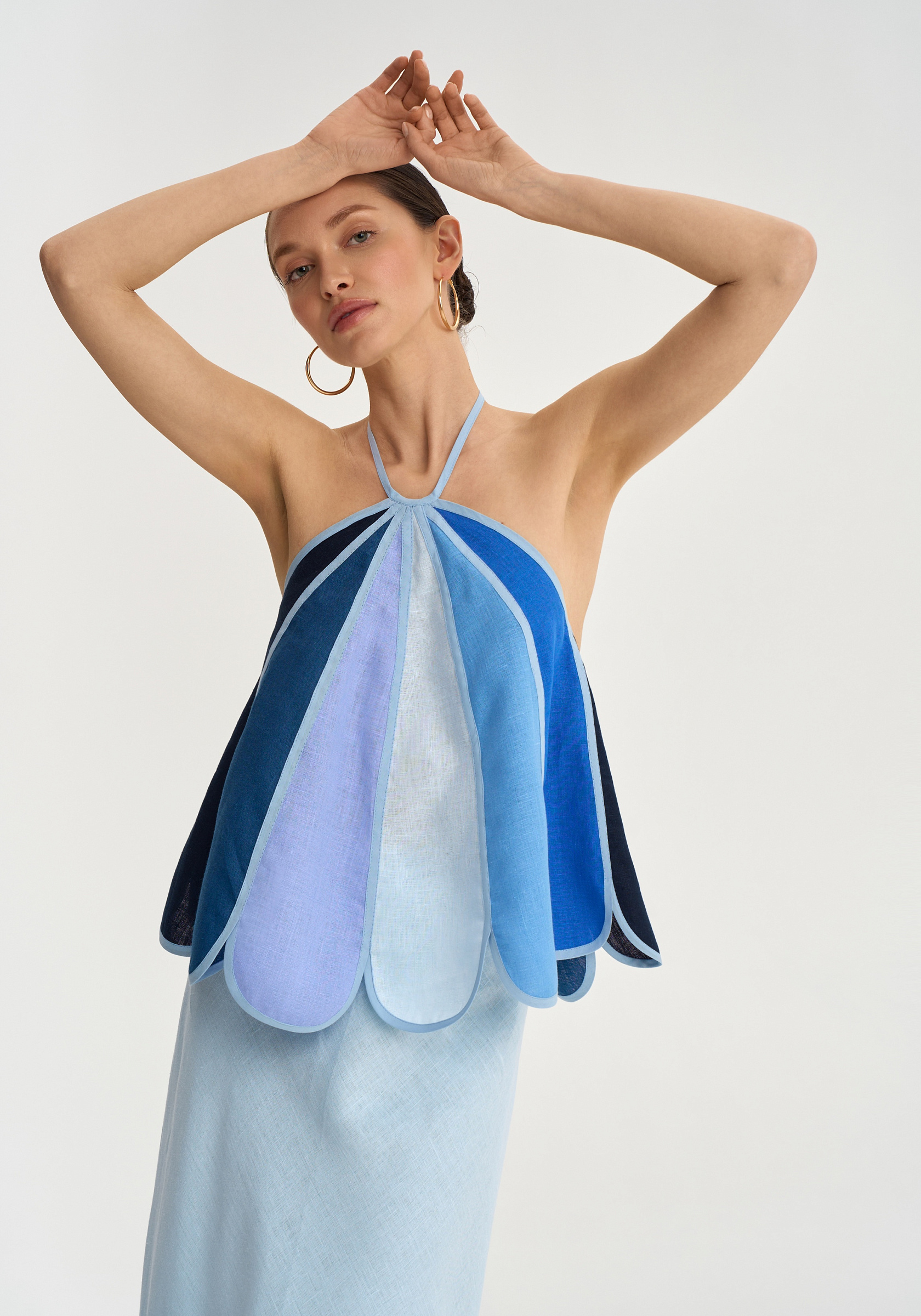 Изделие фиксируется завязками на шее, сохраняя чистоту линии спины и подчеркивая необычную форму модели. Такой топ не требует сложной стилизации и легко становится центральным элементом летнего гардероба.